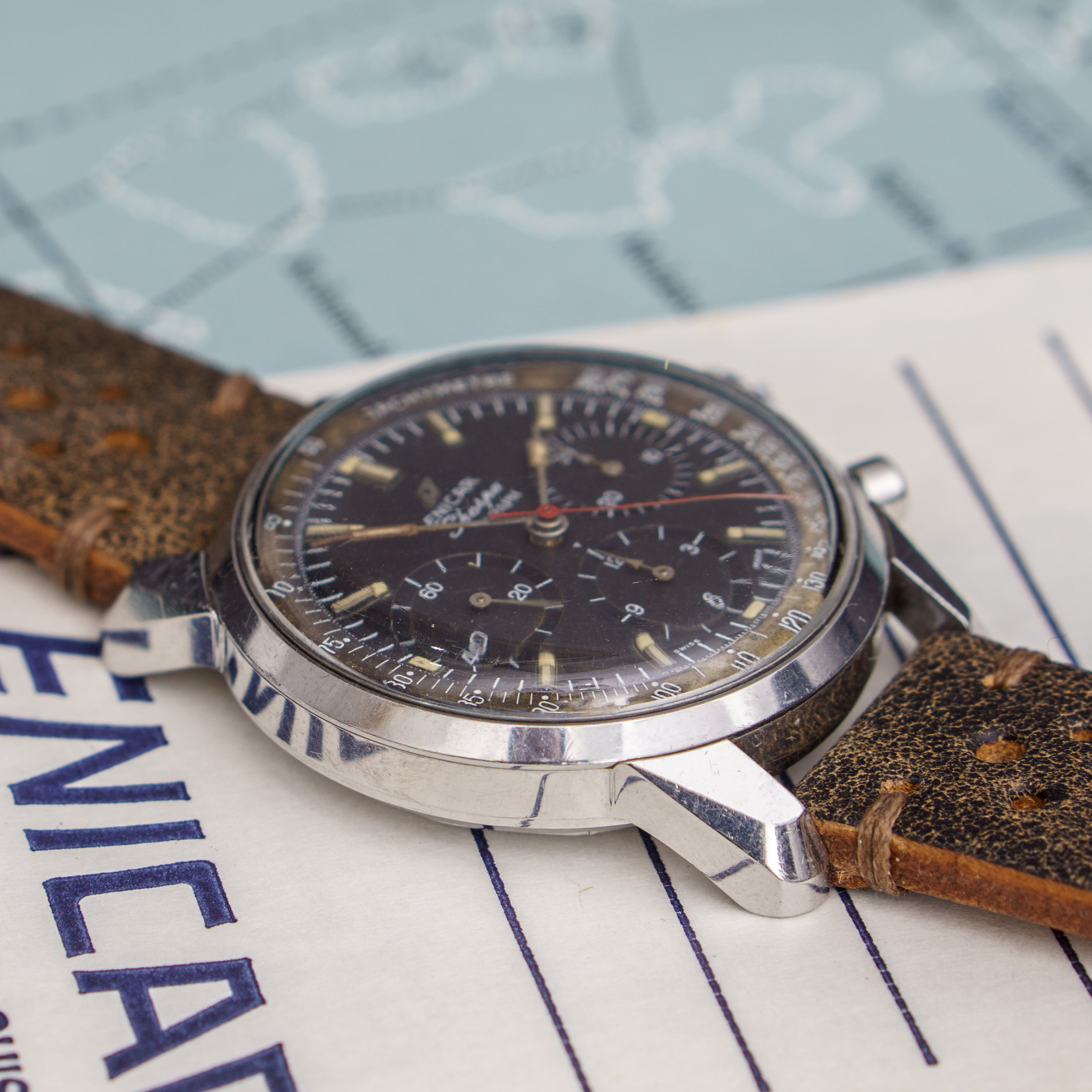 Dial and hands: The black dial is in very nice shape. The hands are all original and filled with tritium. The inner Tachy scale has a very unique patina, some would call it tropic 😉 It's eyecandy for sure.