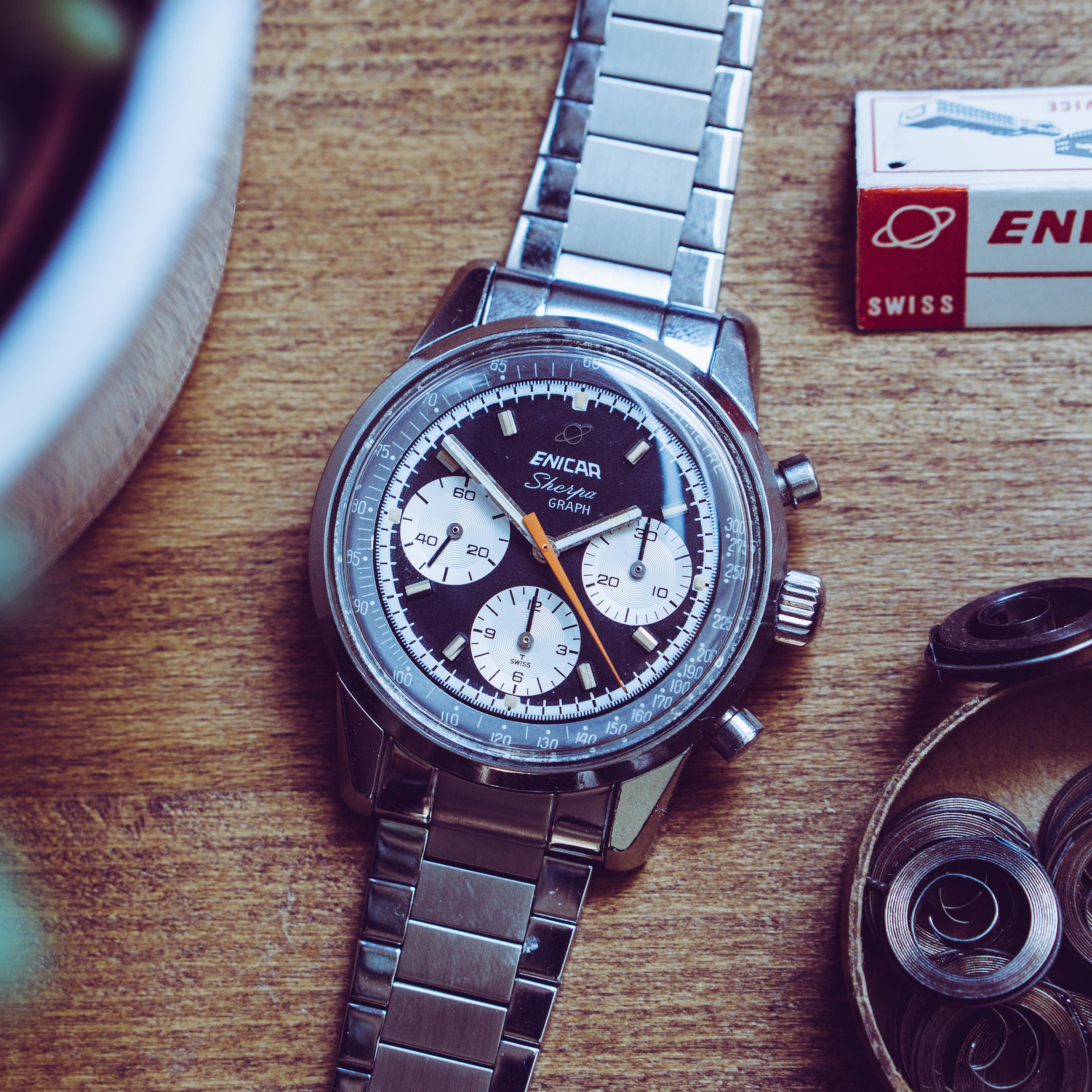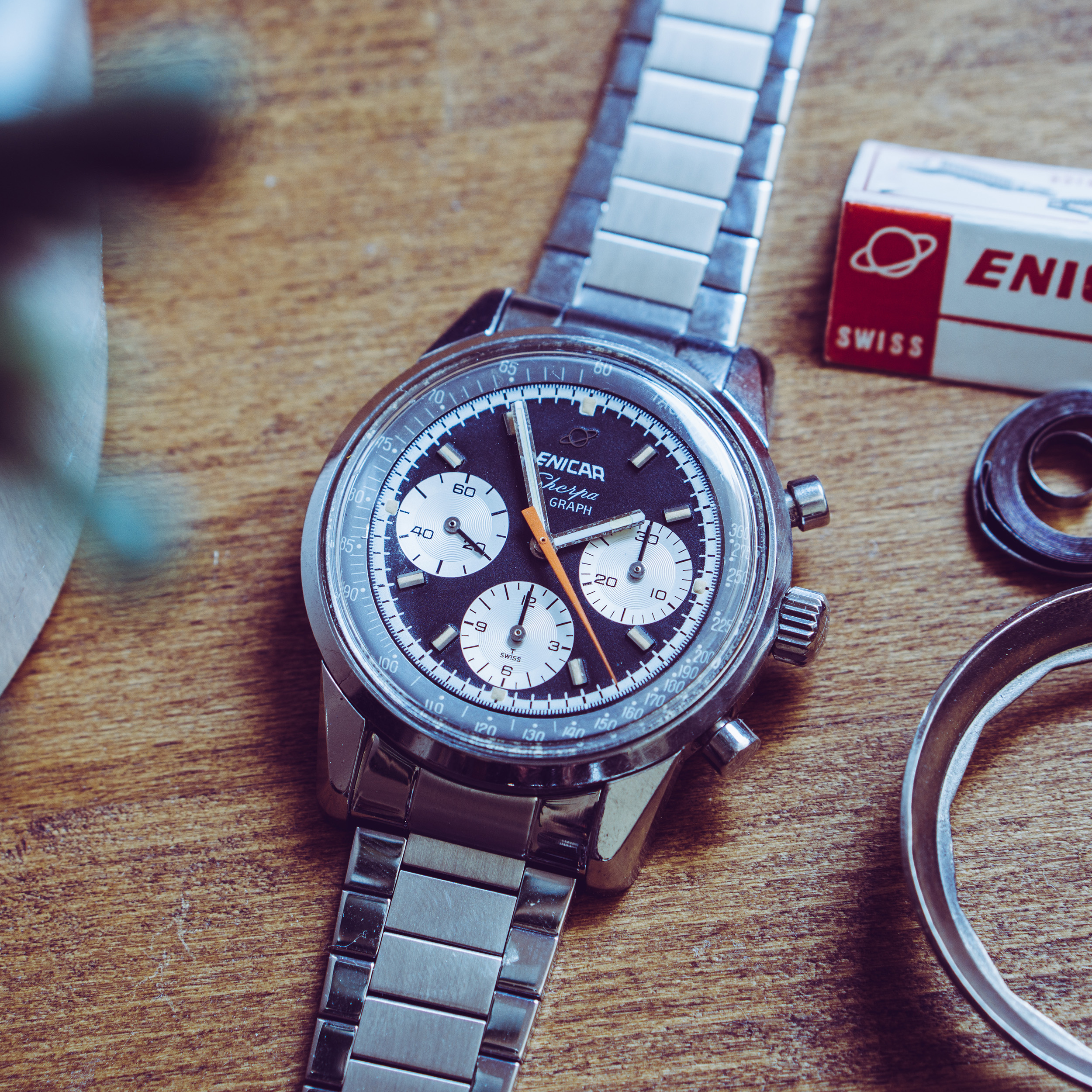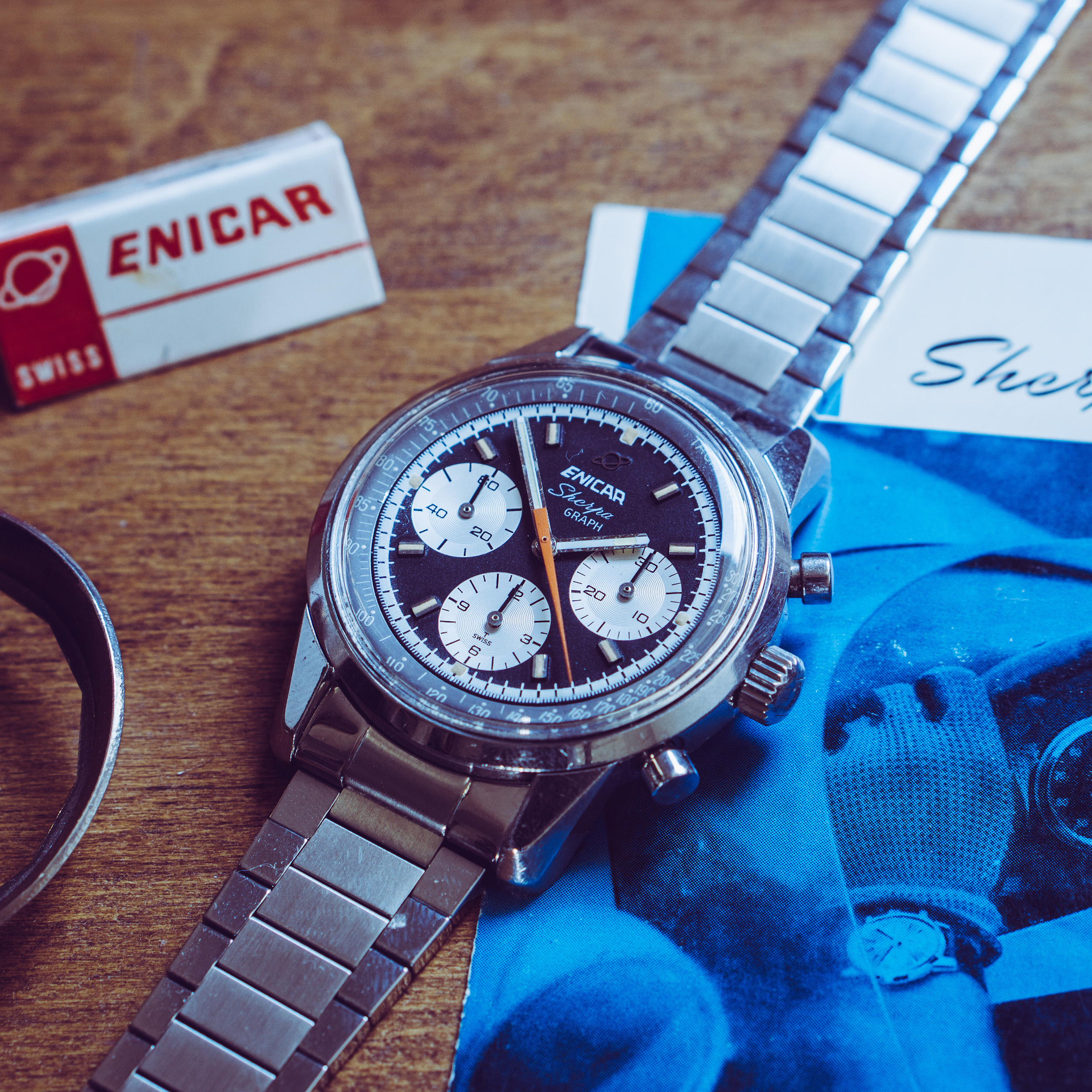 from my collection I am selling this nice Enicar Sherpa Graph MK IV from around 1967. The Sherpa Graph is the non - bezel version of the famous Graph chronograph line of Enicar in the 60s and mostly connected to racing drivers like Jim Clark and Stirling Moss. Established in the early sixites, this is a later MK IV model. (more info on that model you can find at enicar101.com )