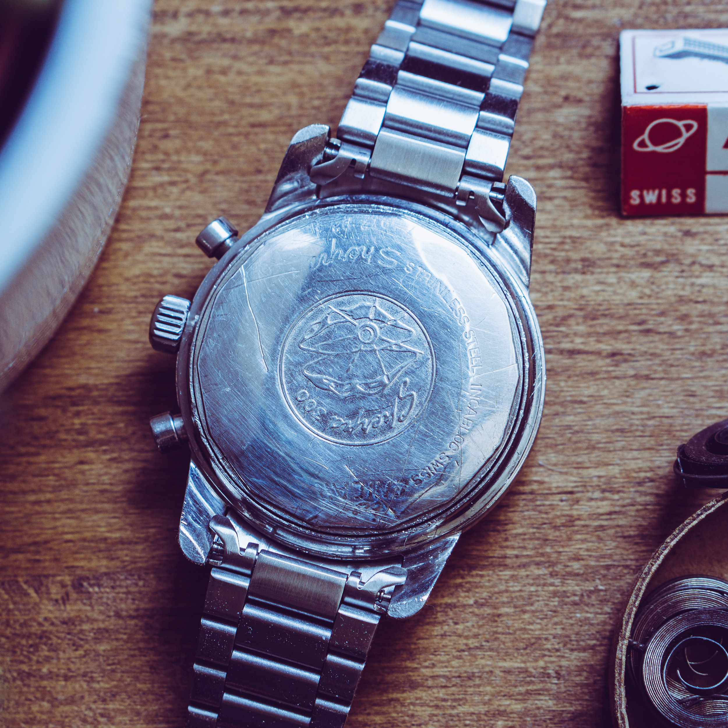 Case: 40mm stainless steel case in good conditon. Caseback is a bit polished, the Serial is not visible anymore. Edges are still sharp, crown is signed with waffle pattern. The crystal is a new NOS part.