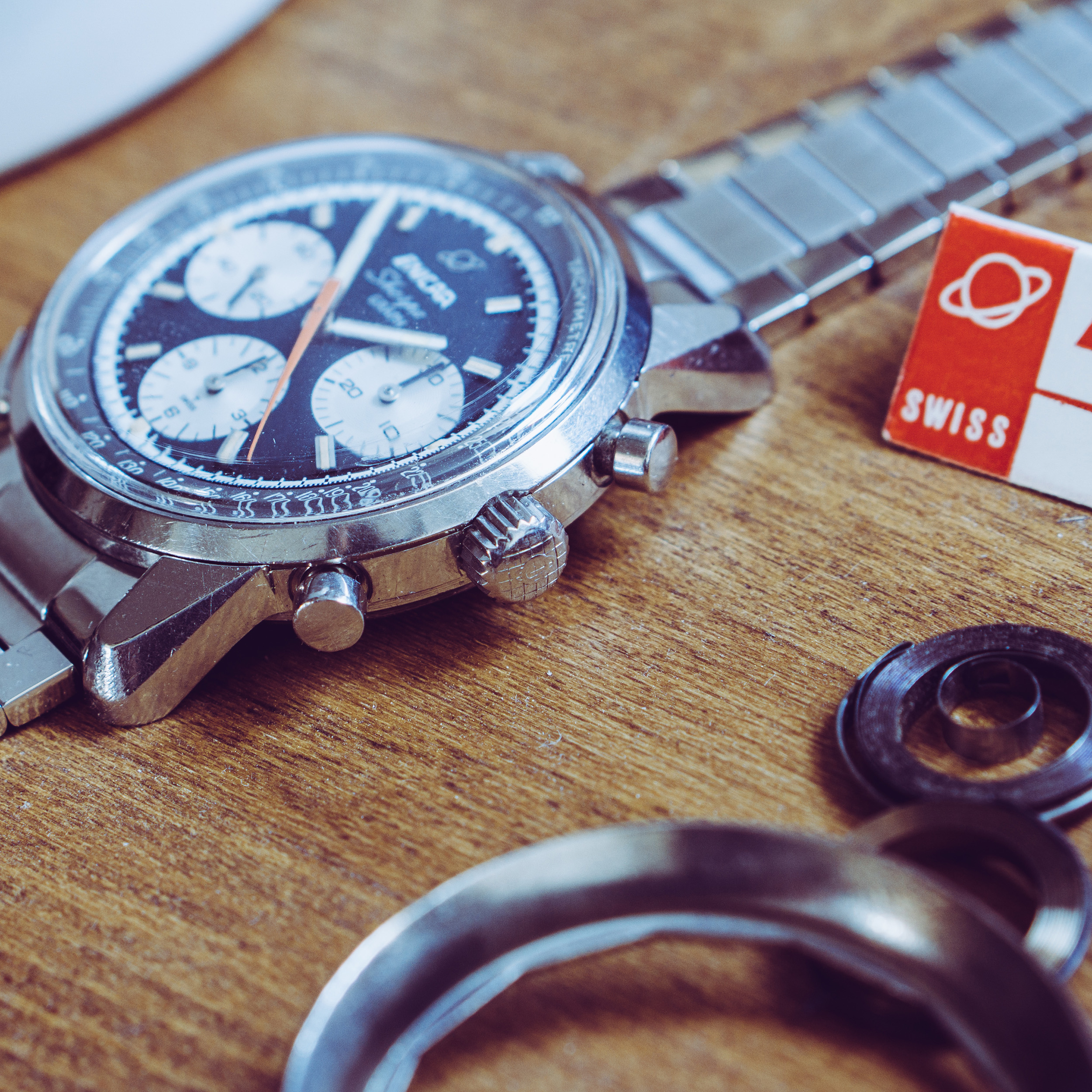 Dial and hands: The reverse panda dial is in very nice shape. The hands are all original and filled with tritium. The inner Tachy scale has some light scratches and patina.