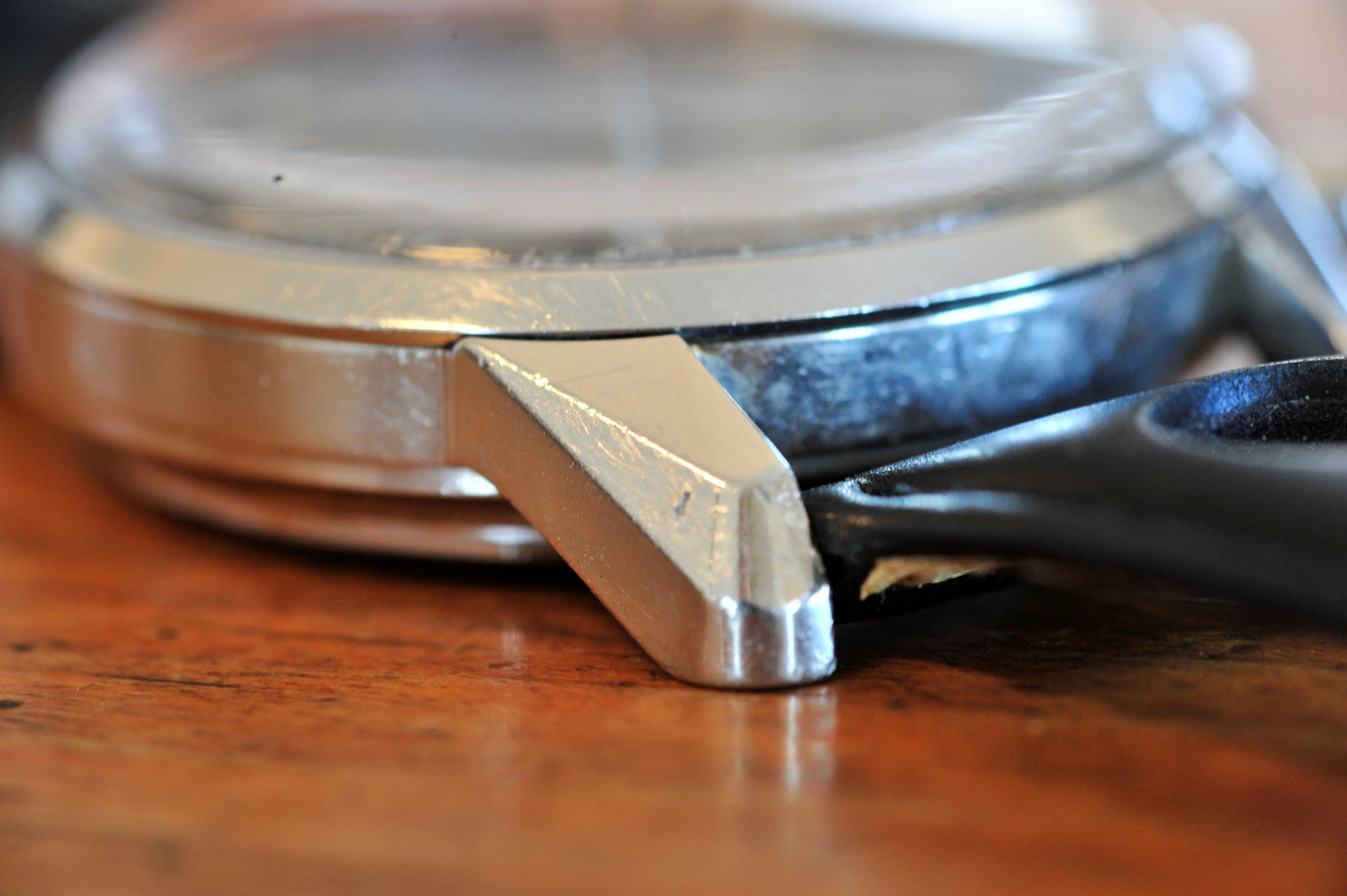 Solid with bevels pronounced as shown in photos. Seems unpolished except for caseback. Scratches as expected for nearly 60-year-old watch.