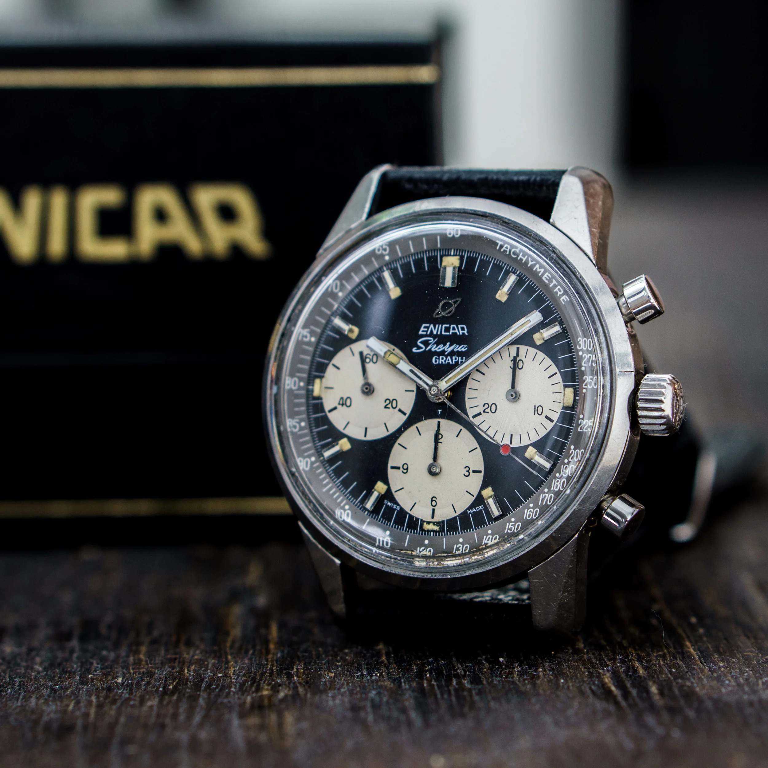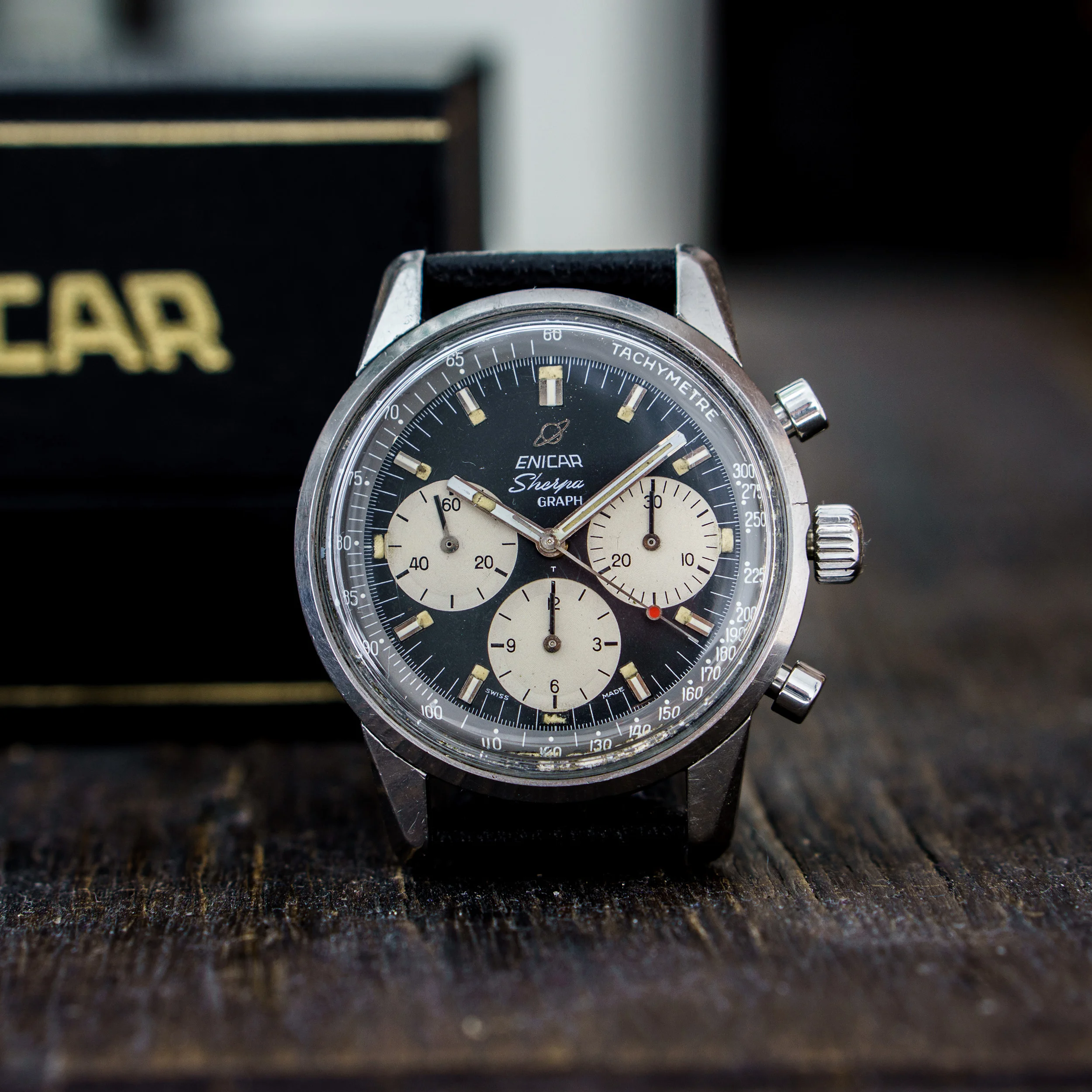 from my collection I am selling this nice Enicar Sherpa Graph MK IV from 1967. The Sherpa Graph is the non - bezel version of the famous Graph chronograph line of Enicar in the 60s and mostly connected to racing drivers like Jim Clark and Stirling Moss. The MK IV was used in another variation by F1 driver Gerhard Mitter.