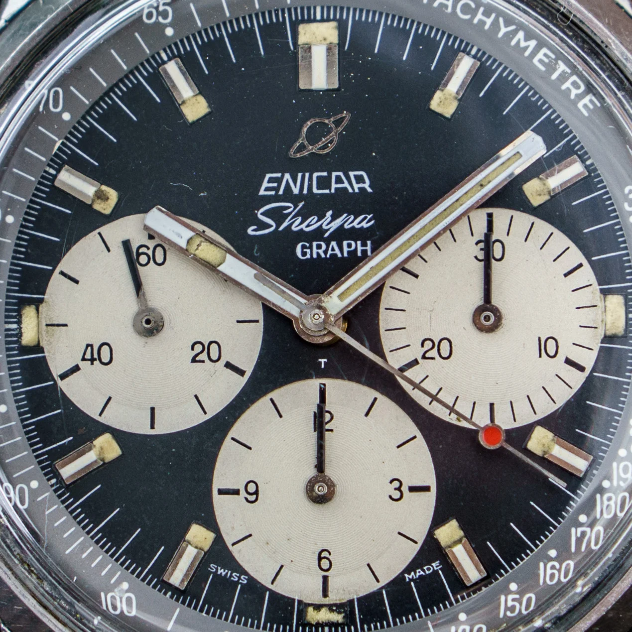 Dial and hands: The black-white dial is in very nice shape with original lume. The hands are all original and also filled with tritium. The inner Tachy scale has some patina.