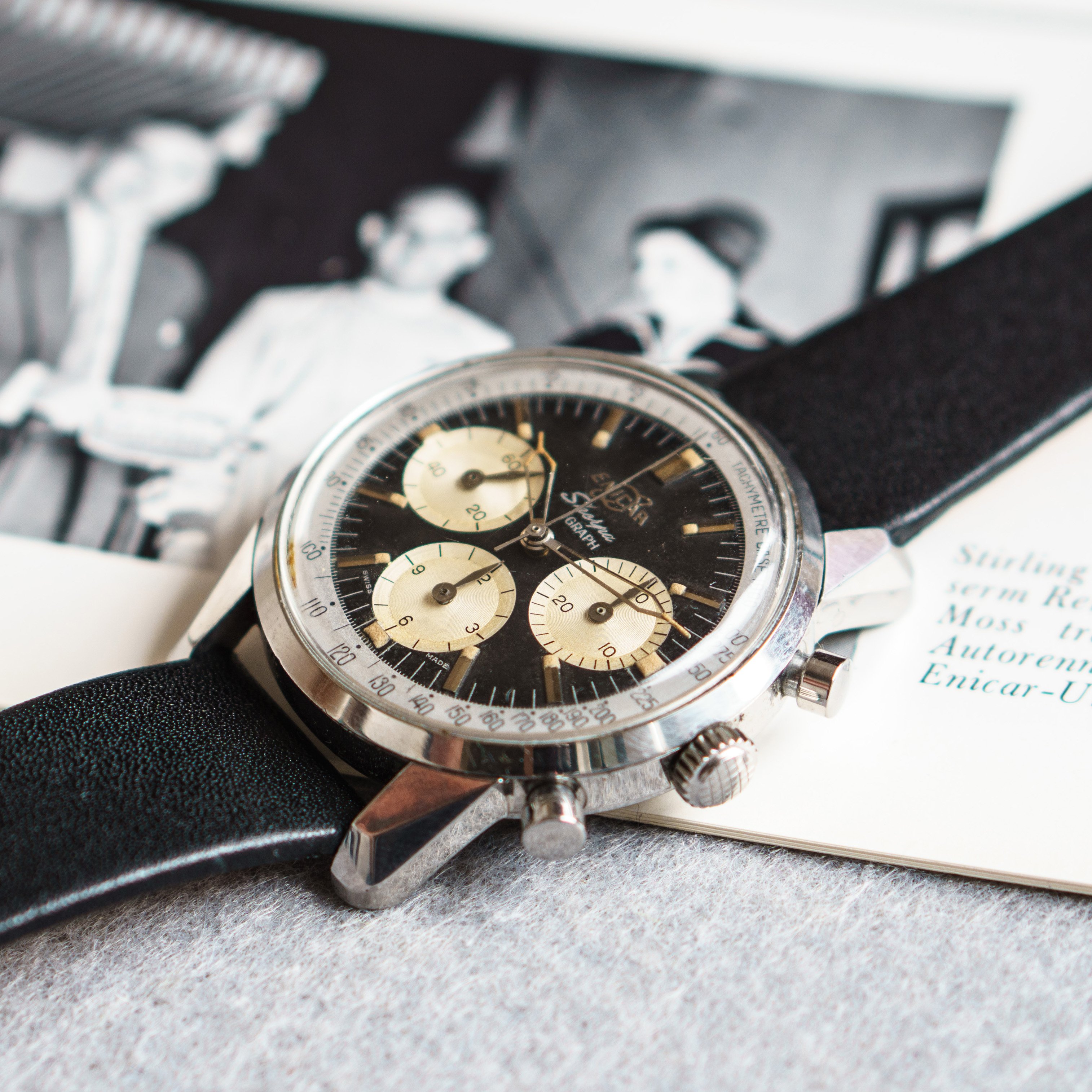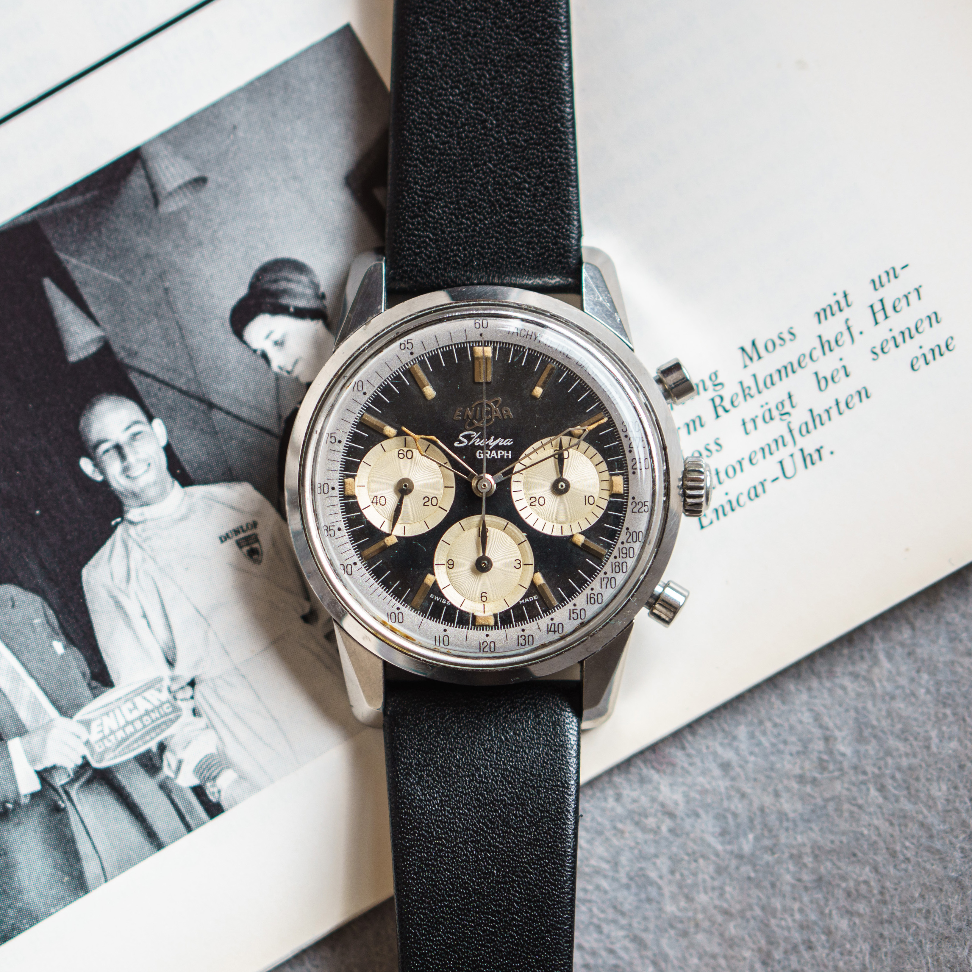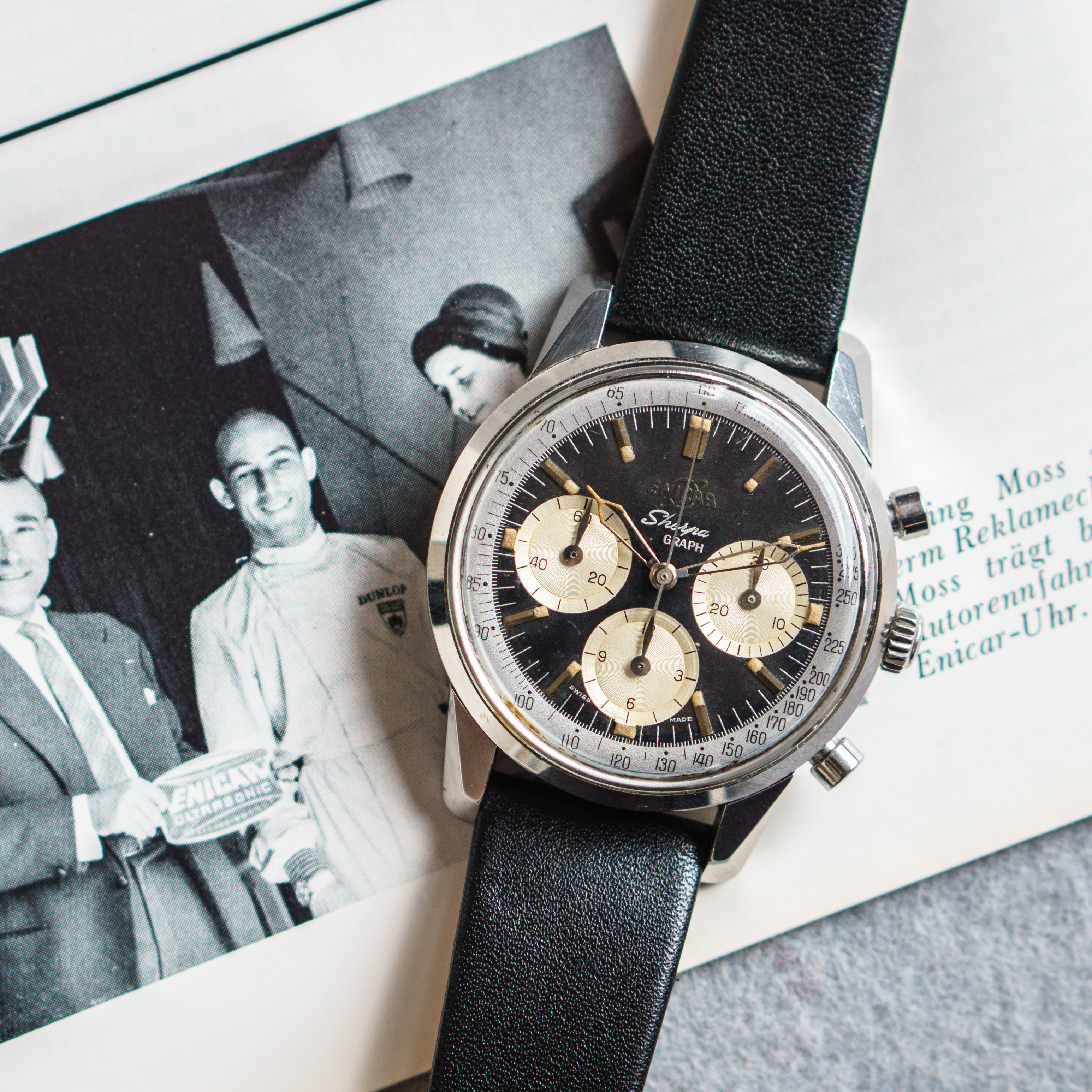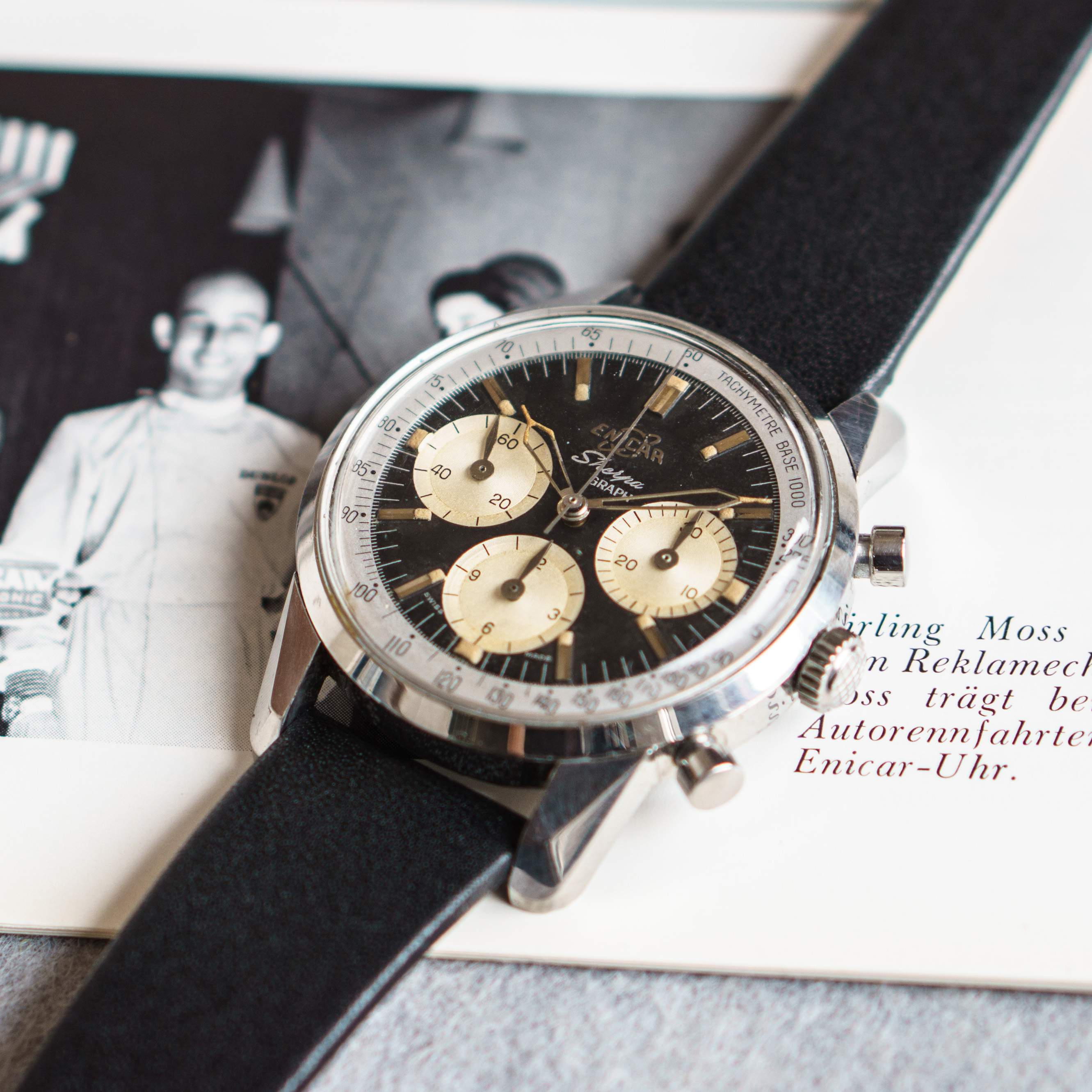 Thanks to @la_lusigne I was again bitten by the Zenith A386 virus. The Zenith is one of the watches I allways wanted to have but allways missed the opportunity. So this is my shot in the dark, maybe some of you have 5 of them and wants to build up an Enicar collection or your focus is in racing watches. Than this is your chance to trade your nice Zenith for one of just 500 build Enicar Sherpa Graph MK1a's, the first of the line, introduced in 1960. Back than Formula 1 Racer Stirling Moss was testimonial for Enicar and of course he got one of his examples as well.