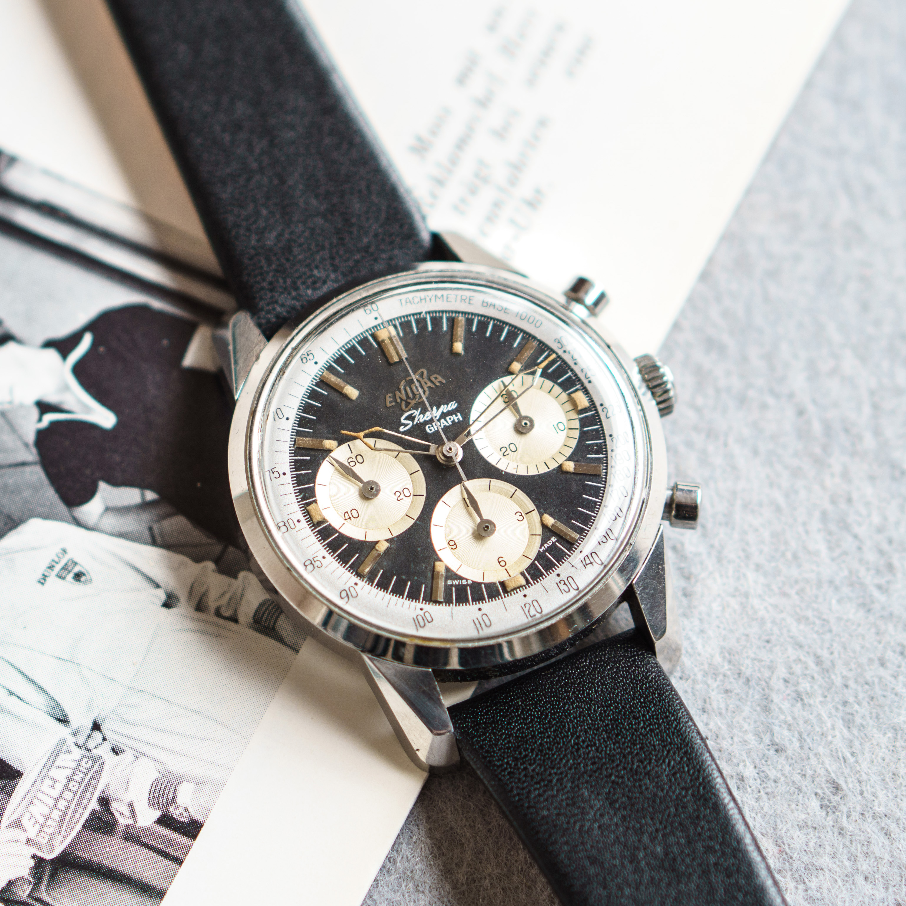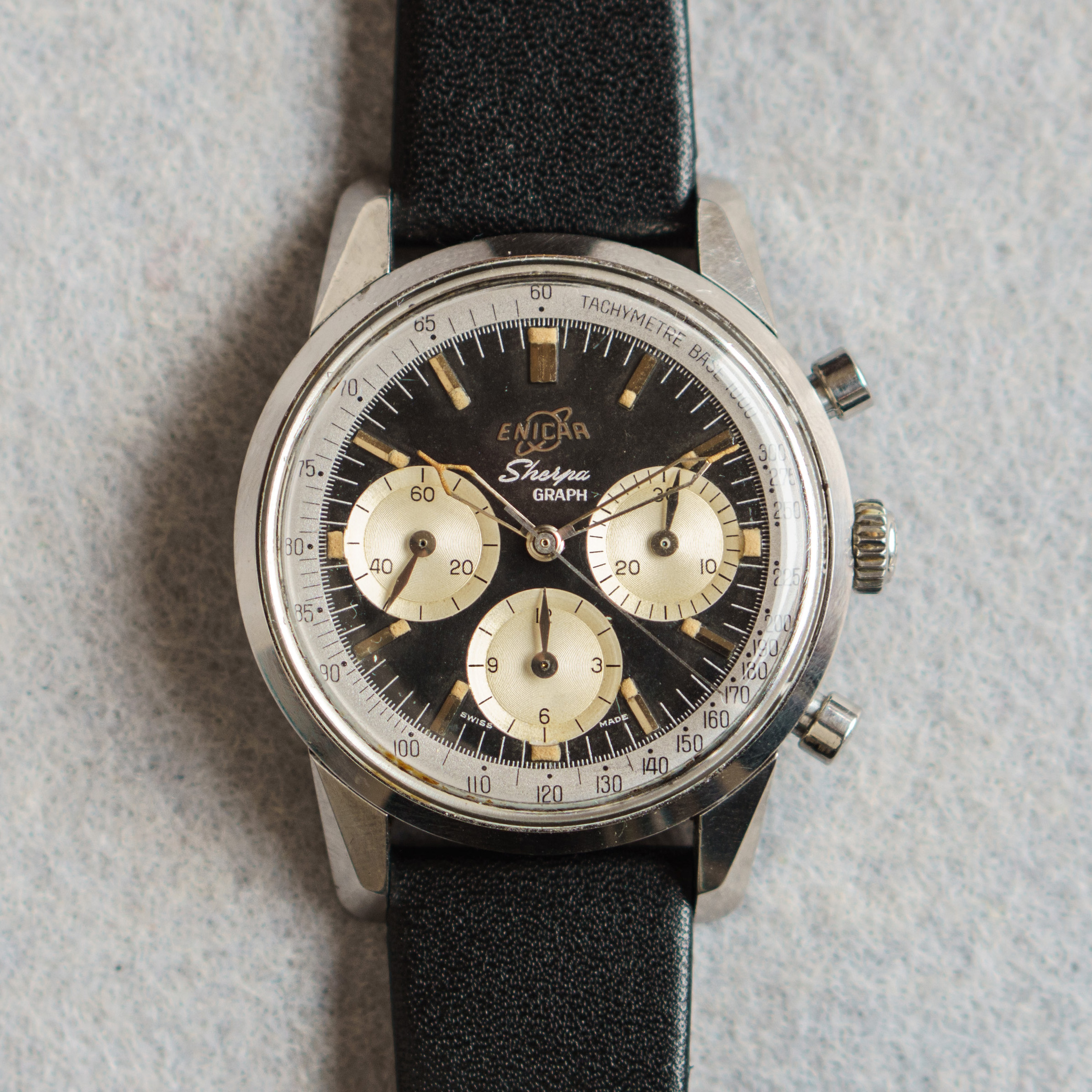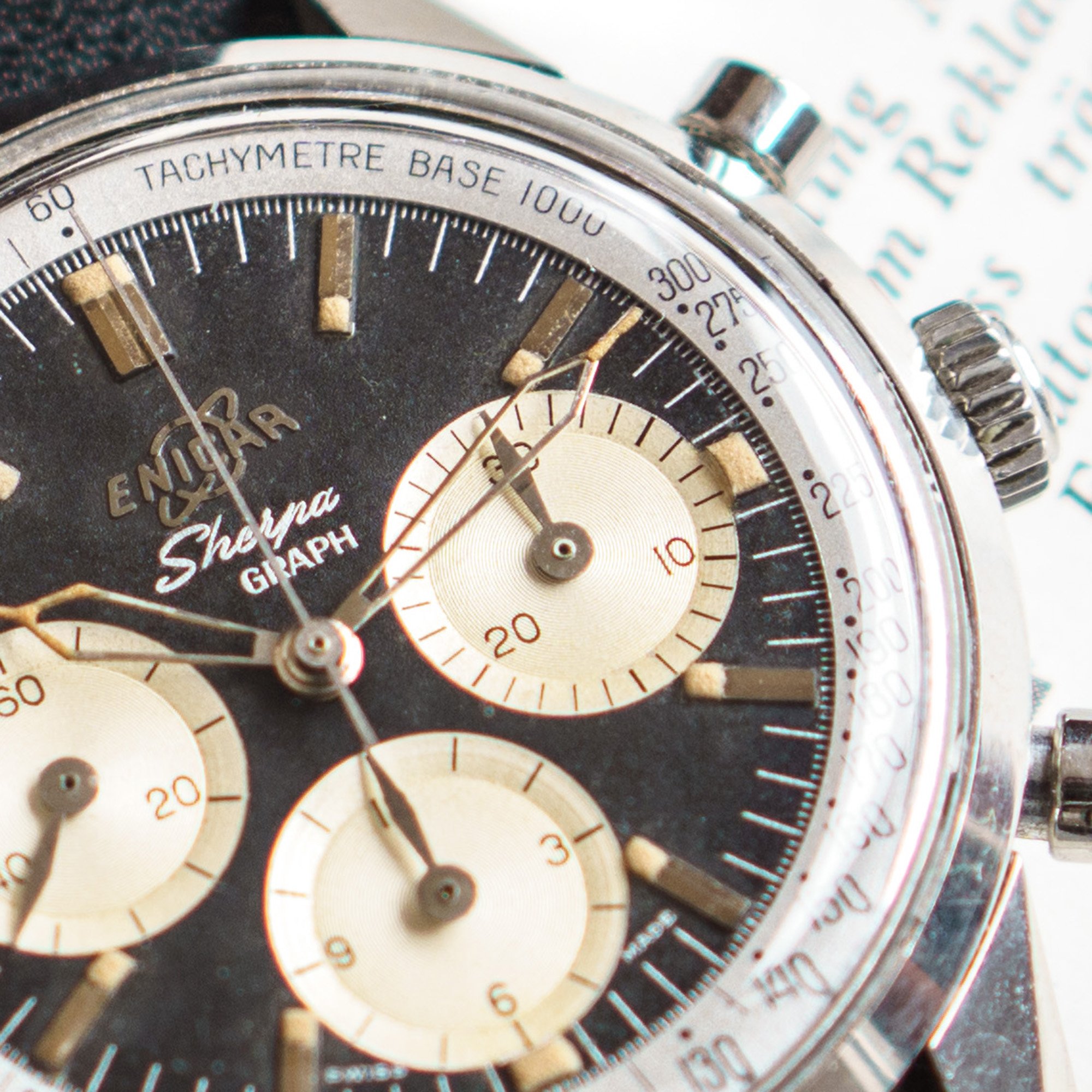 Thanks to @la_lusigne I was again bitten by the Zenith A386 virus. The Zenith is one of the watches I allways wanted to have but allways missed the opportunity. So this is my shot in the dark, maybe some of you have 5 of them and wants to build up an Enicar collection or your focus is in racing watches. Than this is your chance to trade your nice Zenith for one of just 500 build Enicar Sherpa Graph MK1a's, the first of the line, introduced in 1960. Back than Formula 1 Racer Stirling Moss was testimonial for Enicar and of course he got one of his examples as well.