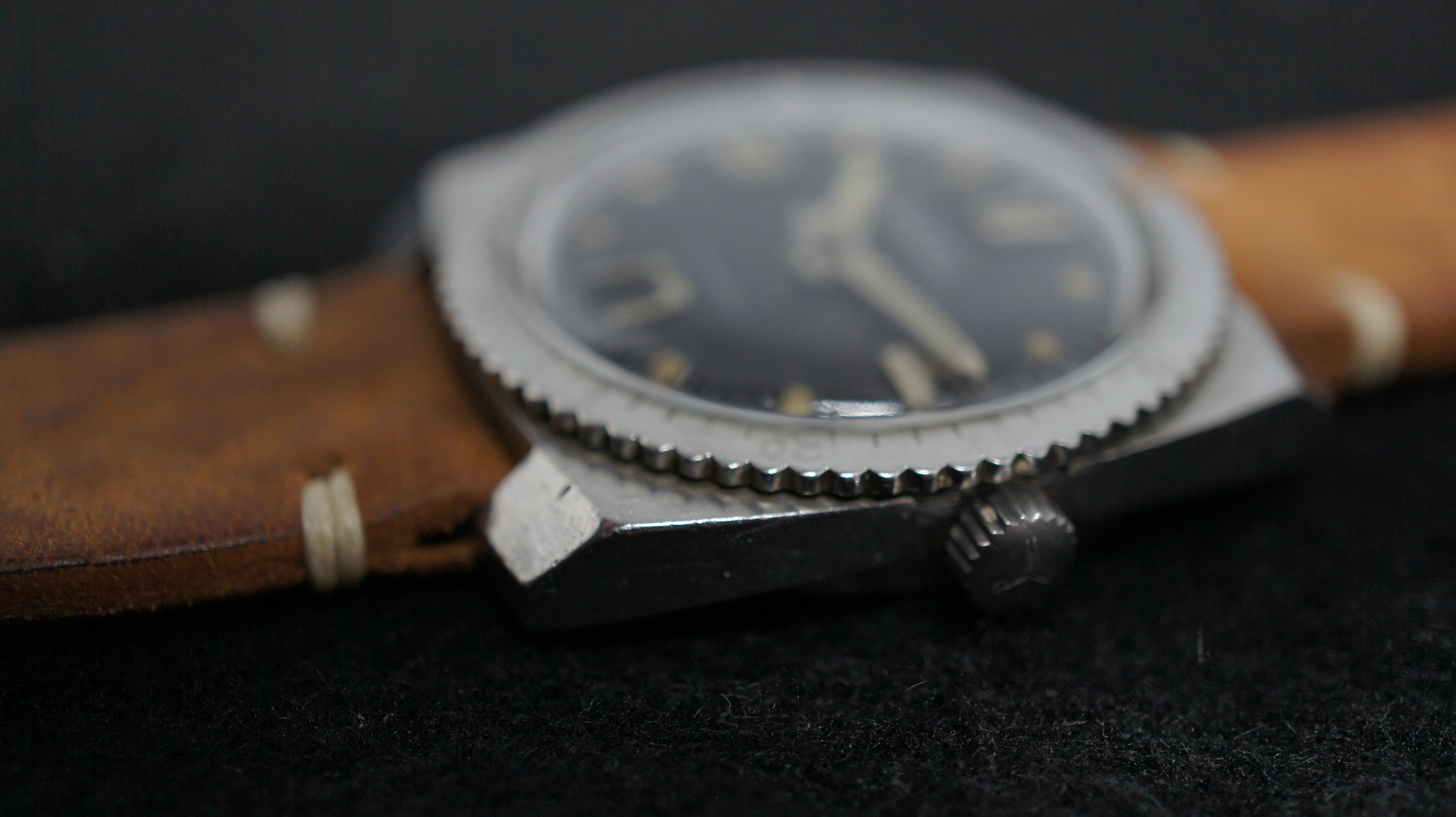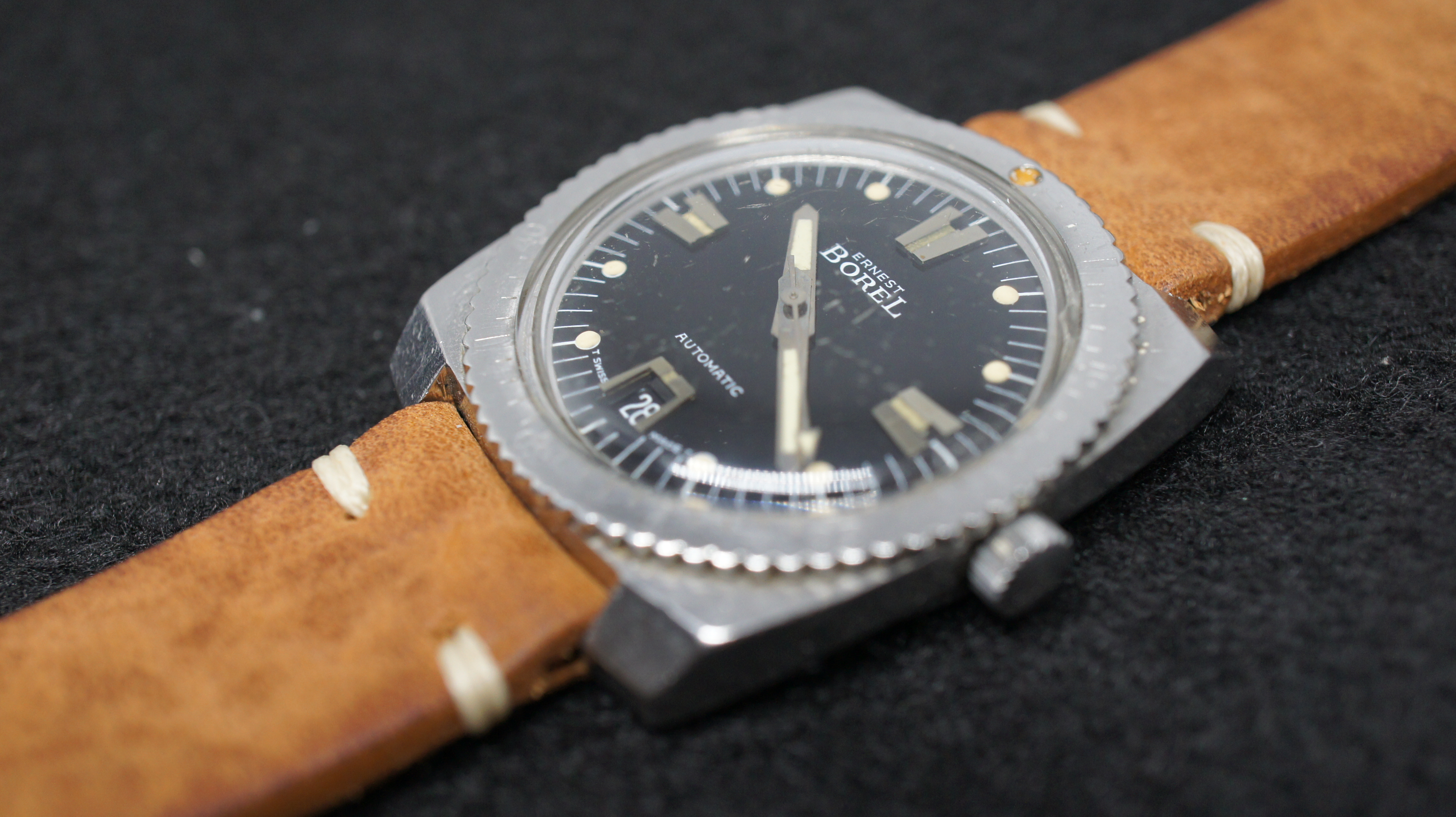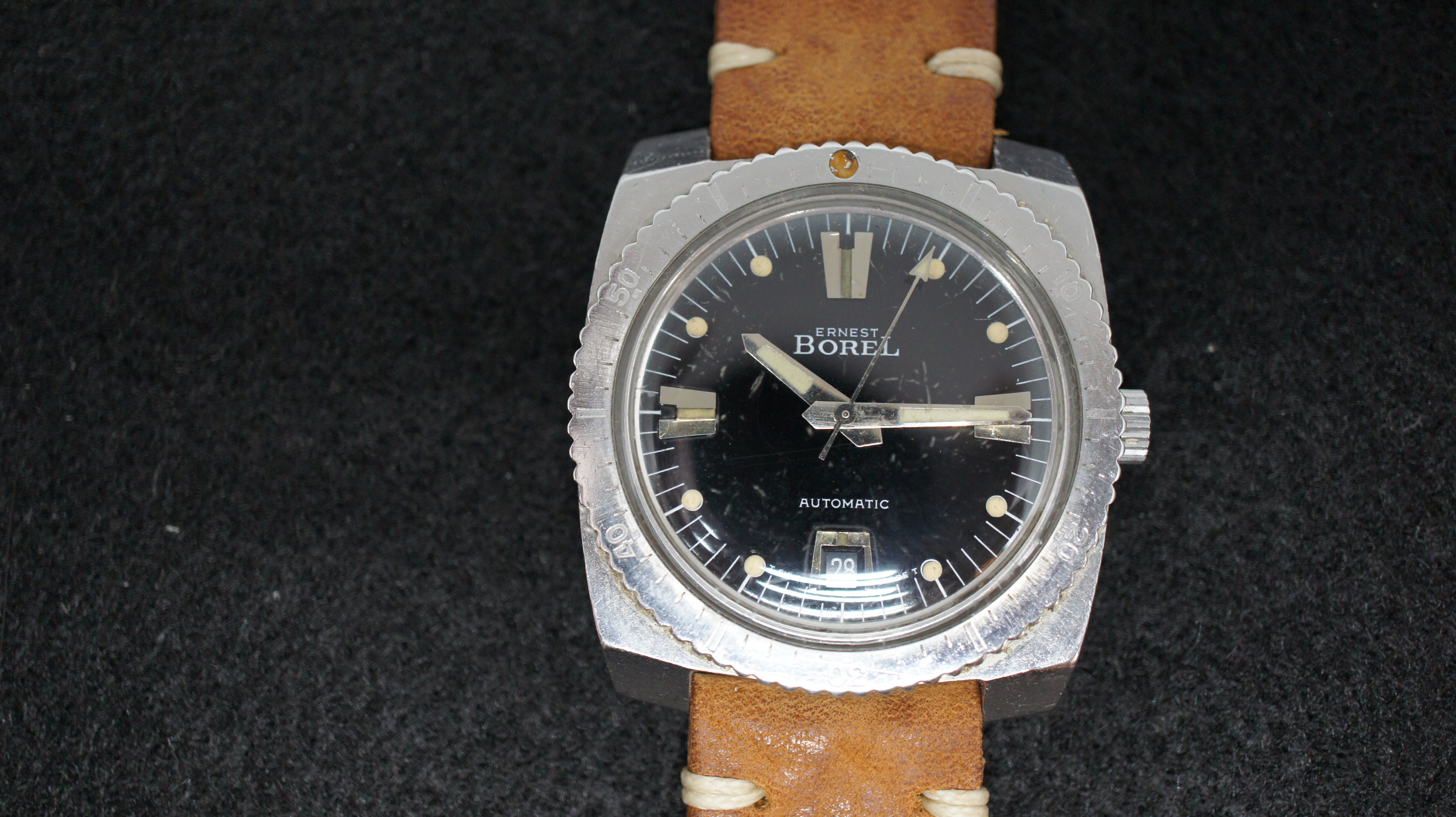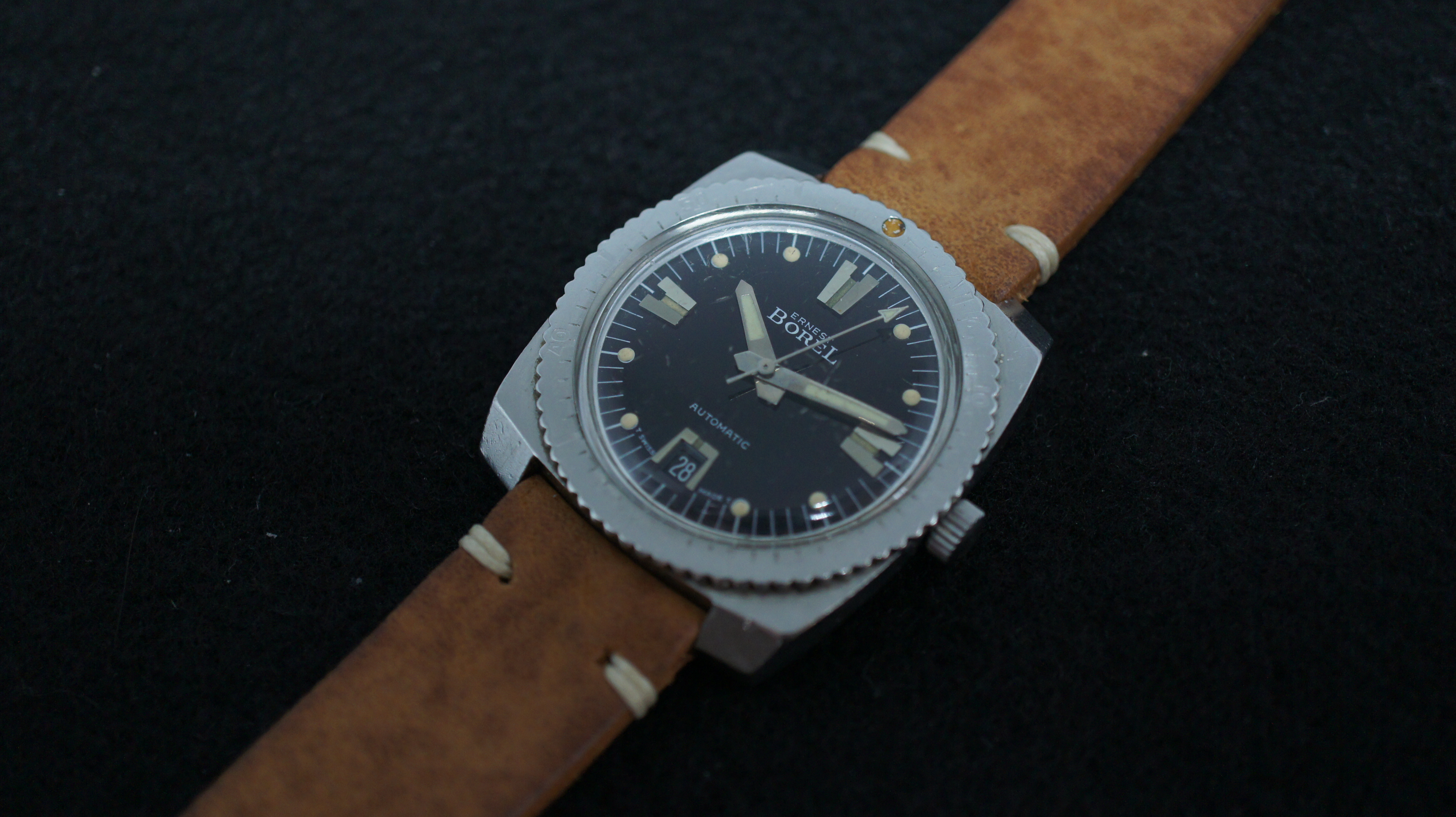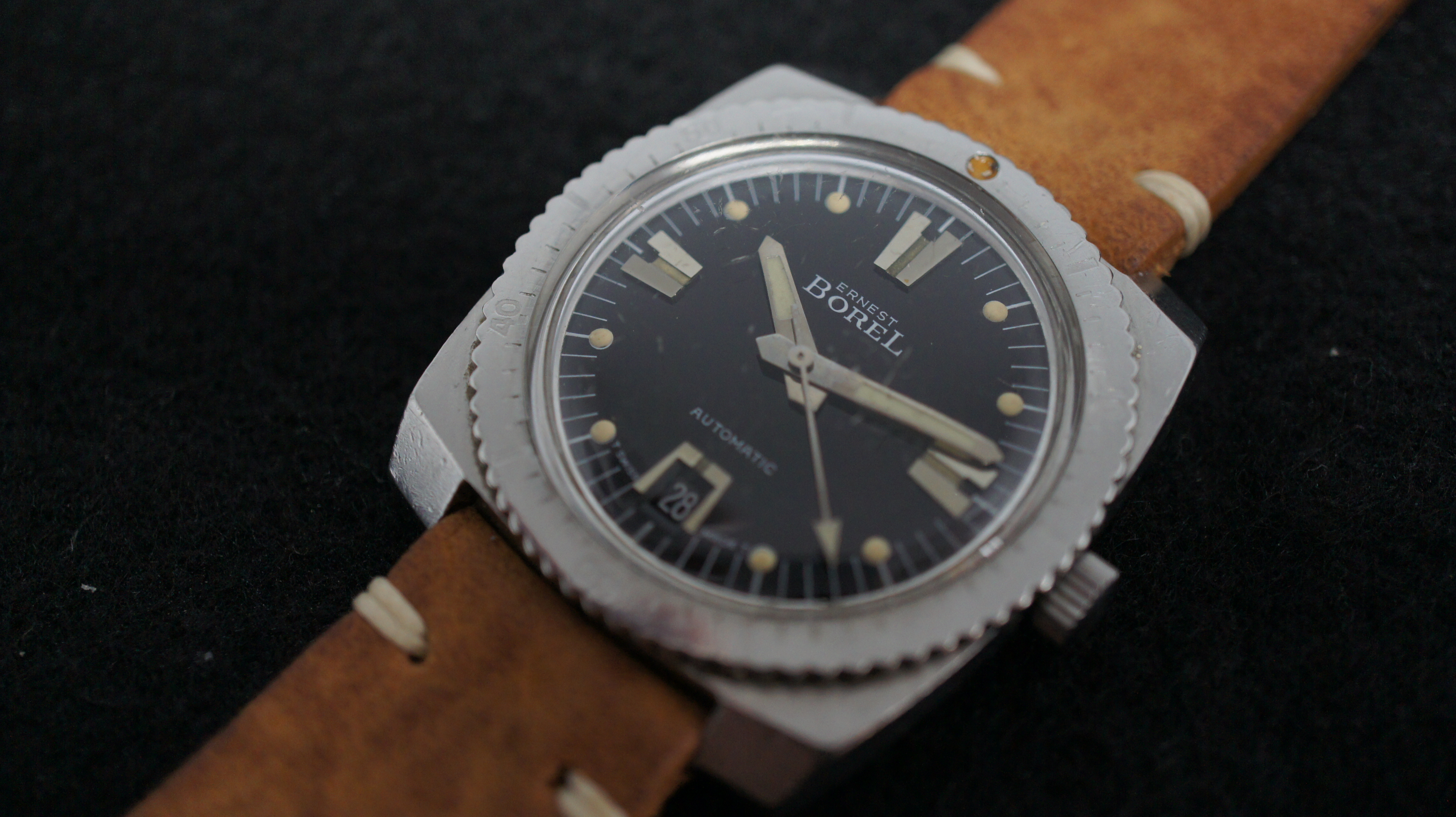 ·This is a very cool, early 70's, Ernest Borel diver, featuring an Aquastar style trapezoidal dial, with date tastefully placed at 6 o'clock. Solid steel case, 36mm in diameter, excluding signed Synchron crown and marked on the caseback "Super Water Resistant Tested 600 Feet". The aged tritium lume dots on the jet black dial look amazing, as does the arrow sweep. Dial is excellent - all marks showing are on the crystal. There is some minor crazing on the original acrylic crystal. Slim 11mm case thickness. Bezel is ratcheted at 5-minute markers. Watch is in working order, date changes at midnight, but service unkown. It comes on a high quality, unworn, 19mm Hodinkee "Brown Rustic Cow Leather" strap that pairs very nicely. US$650, includes shipping/paypal Canada/US.