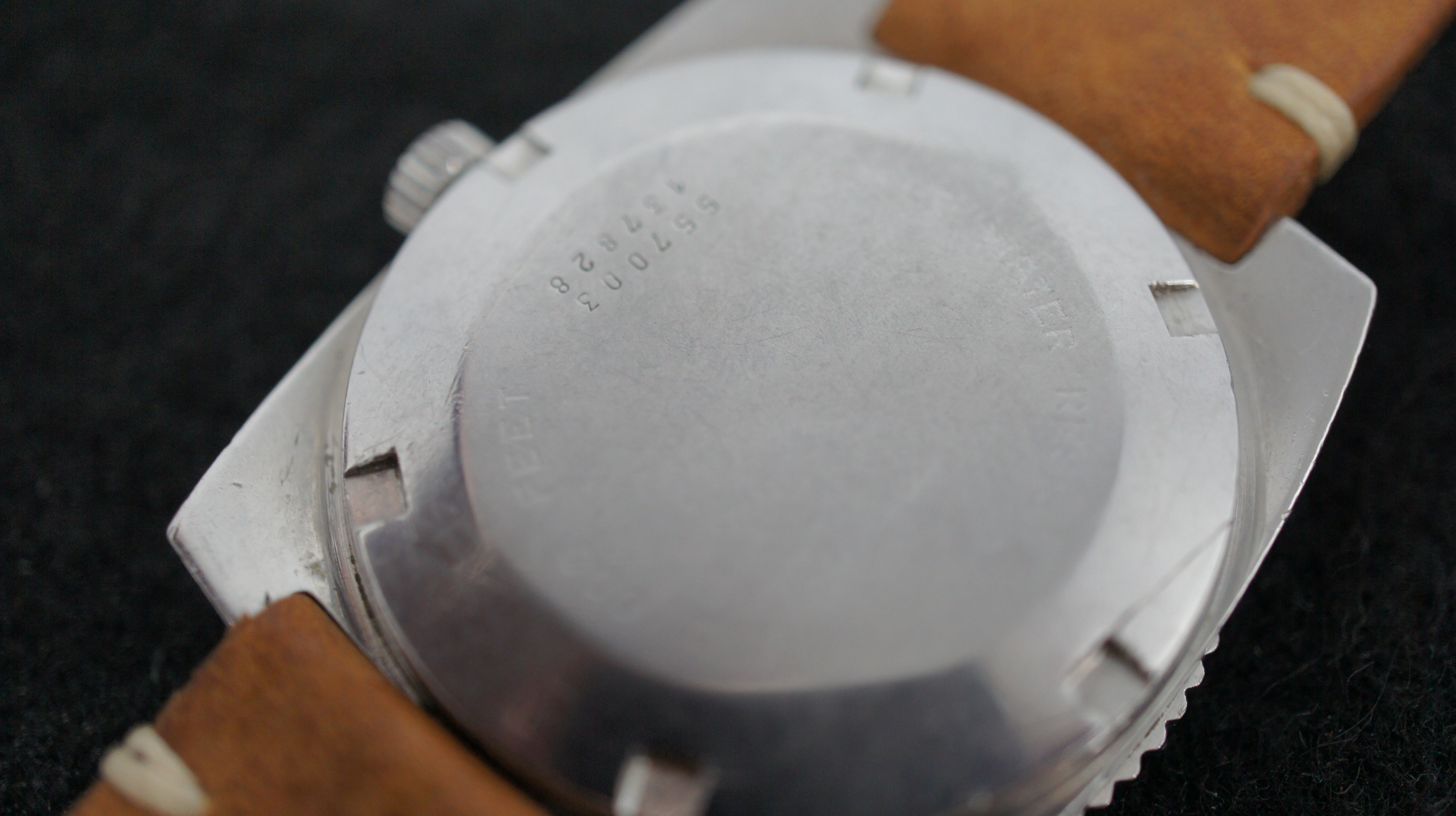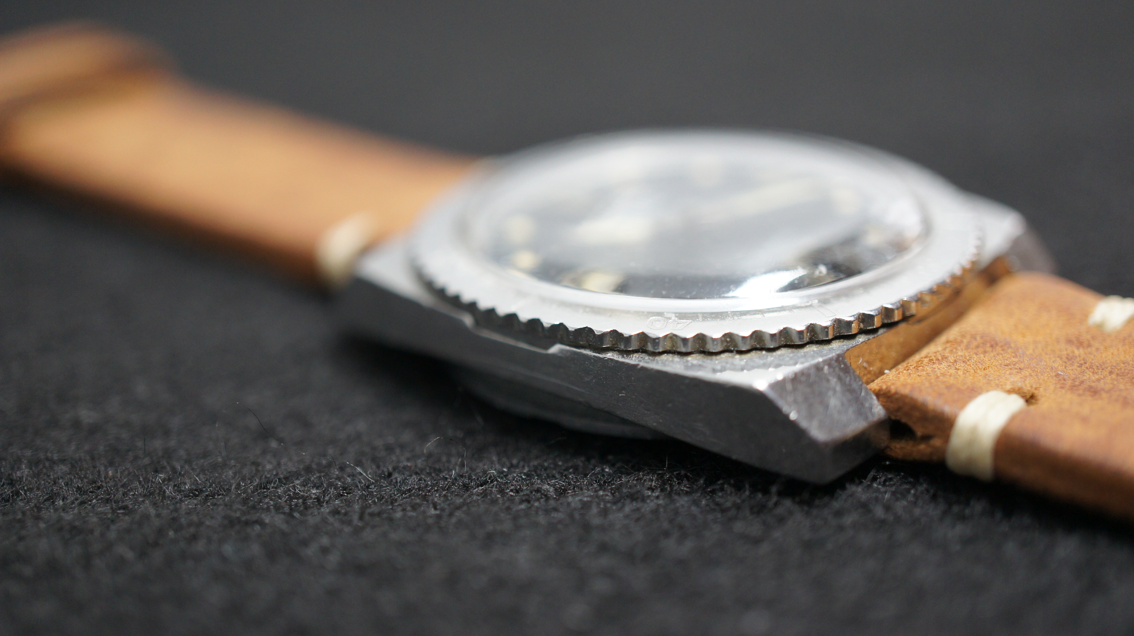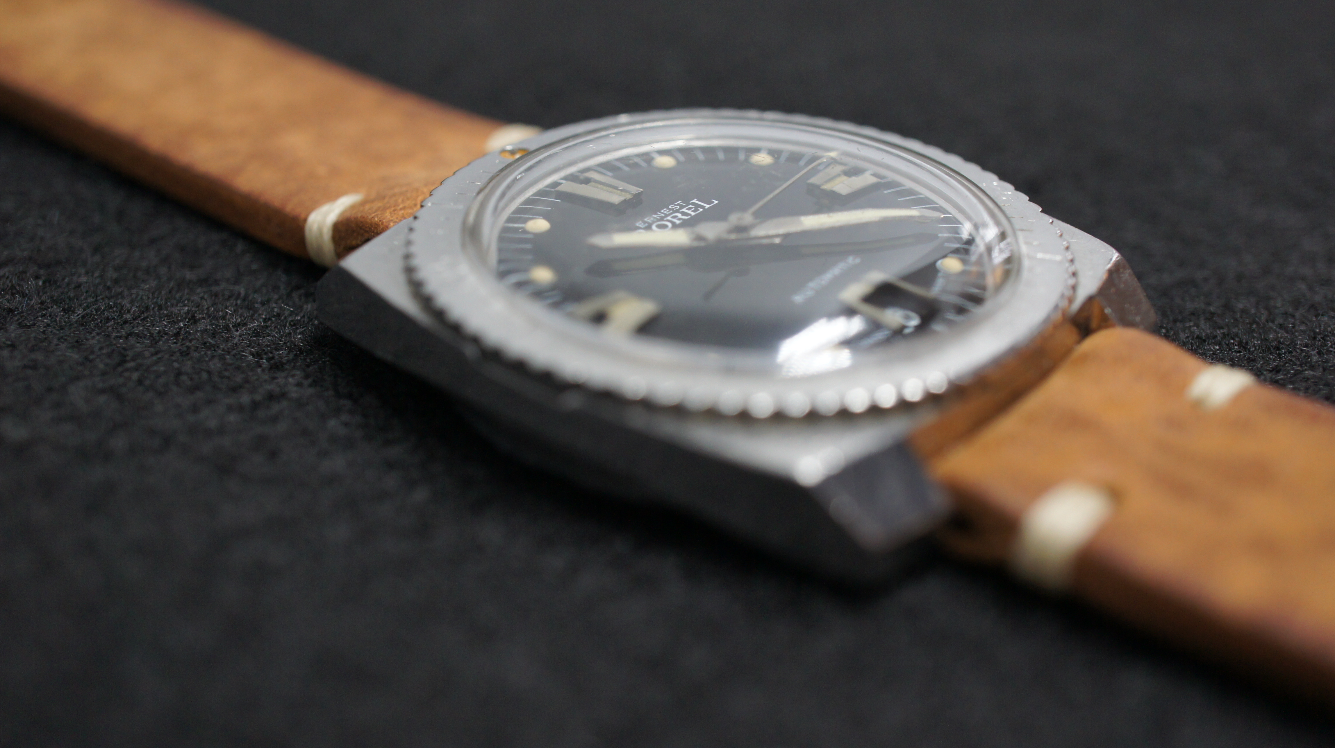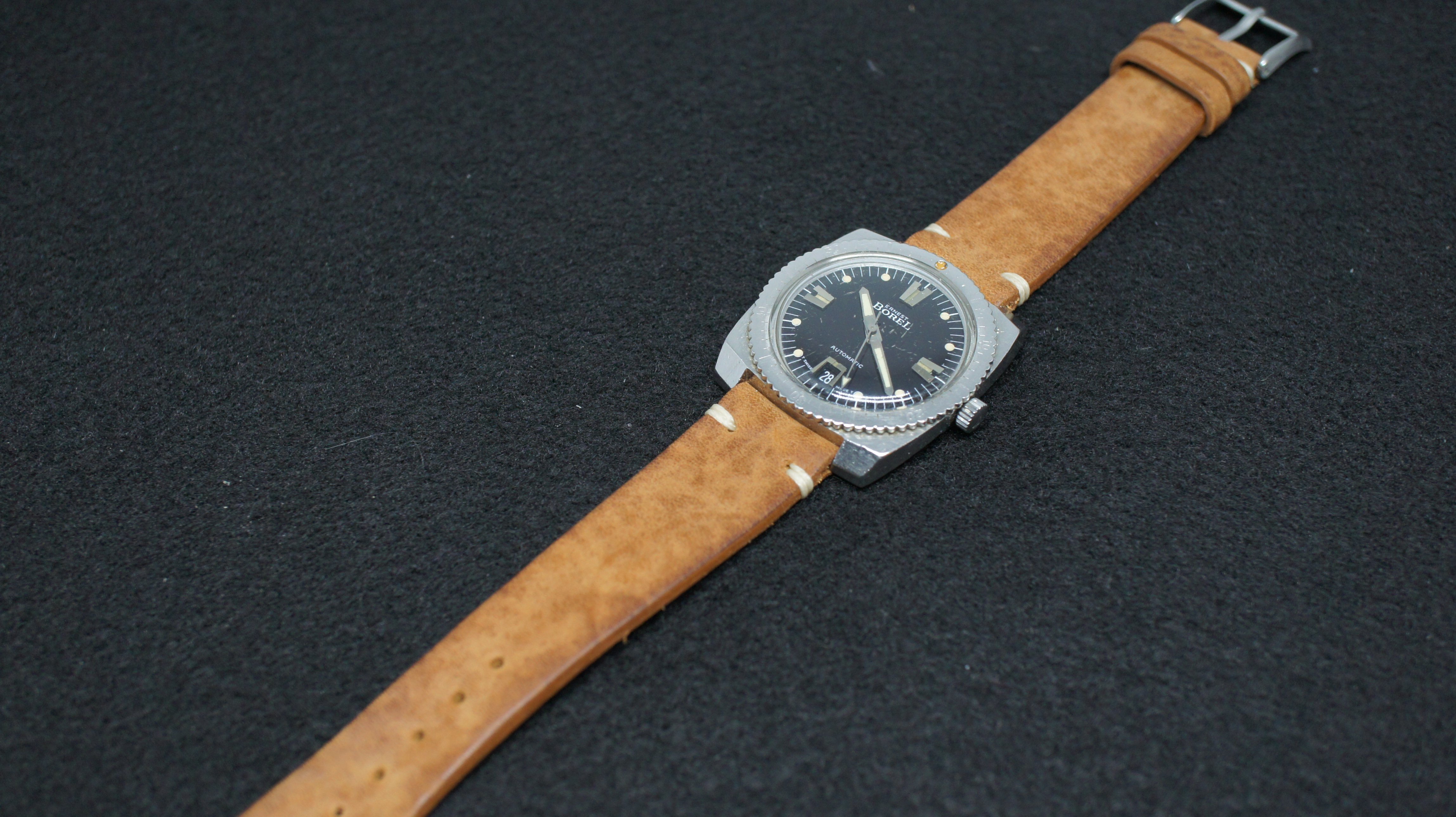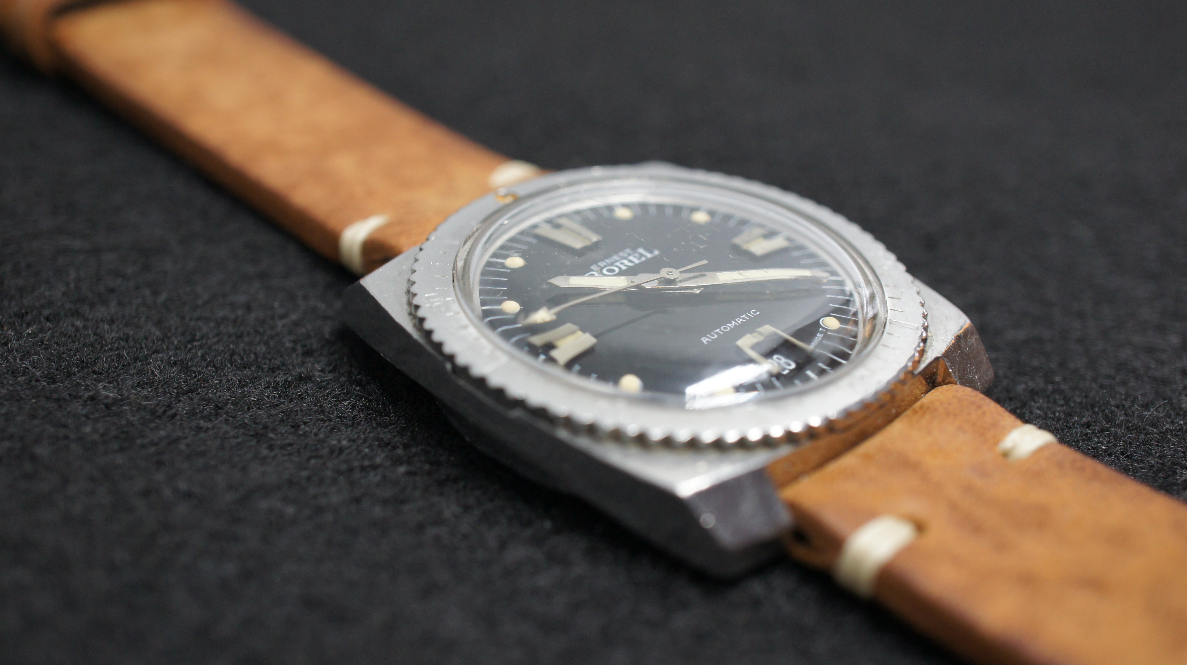 ·This is a very cool, early 70's, Ernest Borel diver, featuring an Aquastar style trapezoidal dial, with date tastefully placed at 6 o'clock. Solid steel case, 36mm in diameter, excluding signed Synchron crown and marked on the caseback "Super Water Resistant Tested 600 Feet". The aged tritium lume dots on the jet black dial look amazing, as does the arrow sweep. Dial is excellent - all marks showing are on the crystal. There is some minor crazing on the original acrylic crystal. Slim 11mm case thickness. Bezel is ratcheted at 5-minute markers. Watch is in working order, date changes at midnight, but service unkown. It comes on a high quality, unworn, 19mm Hodinkee "Brown Rustic Cow Leather" strap that pairs very nicely. US$650, includes shipping/paypal Canada/US.
