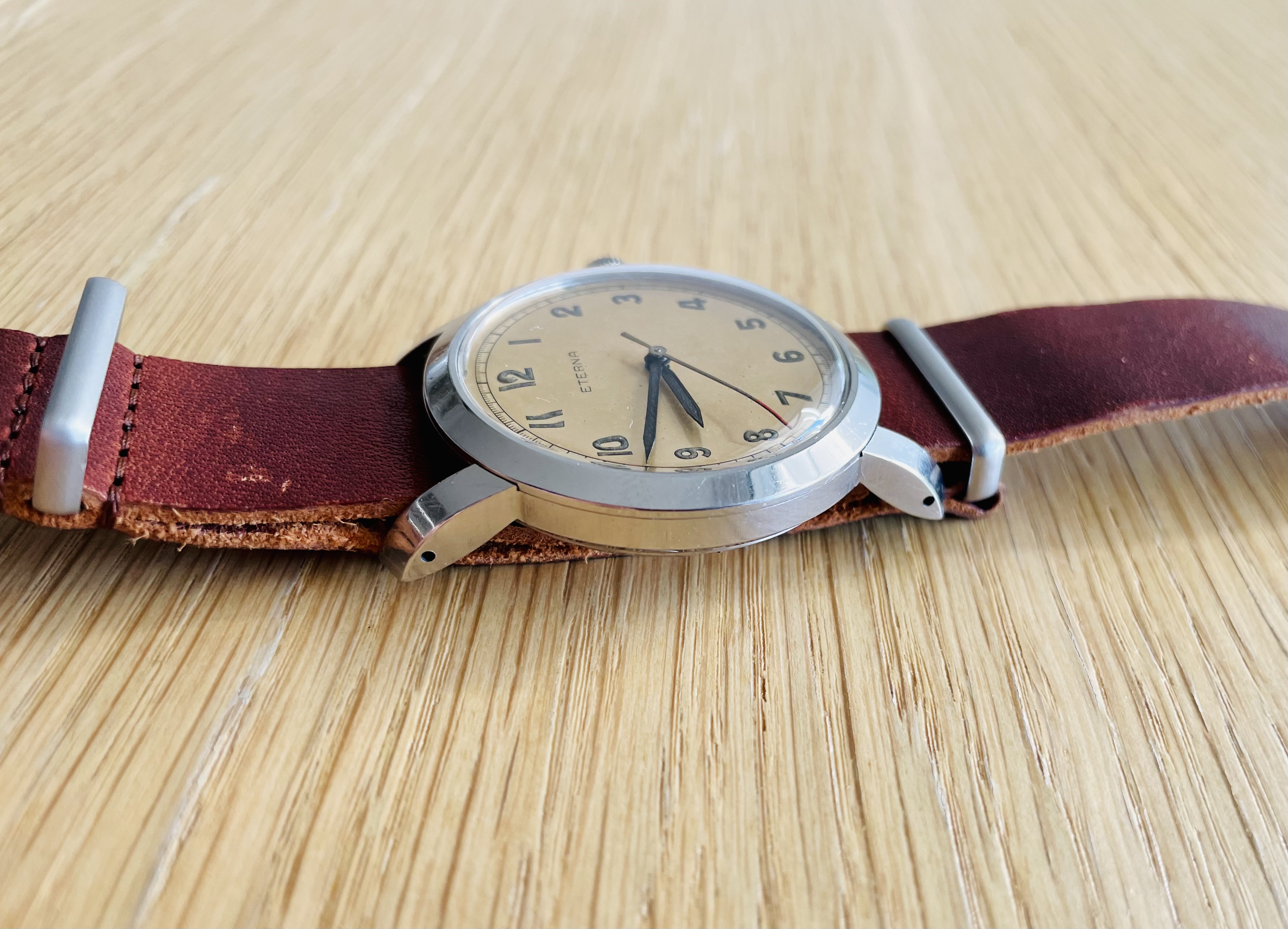 The dial developed a nice brownish to golden patina. The thin outer track has a shine to it, which is a nice contrast. There is some colour loss at the edge of the dial, as you can see on the photos, but - to me - nothing which is disturbing. The hour and minute hand of anthracite colour turn to a subtle blue depending on the incidence of light. The second hand has the ETERNA typical red tip.