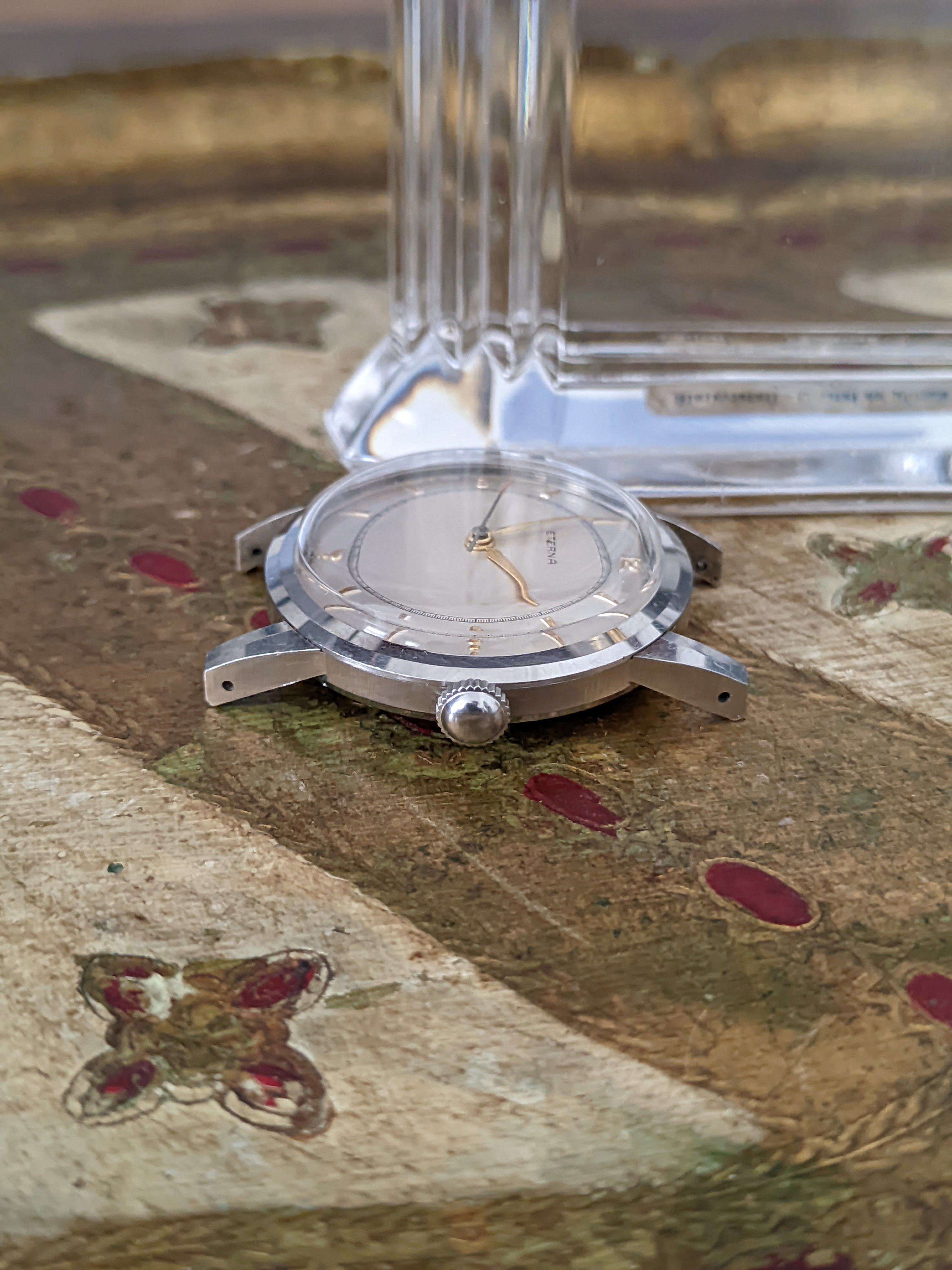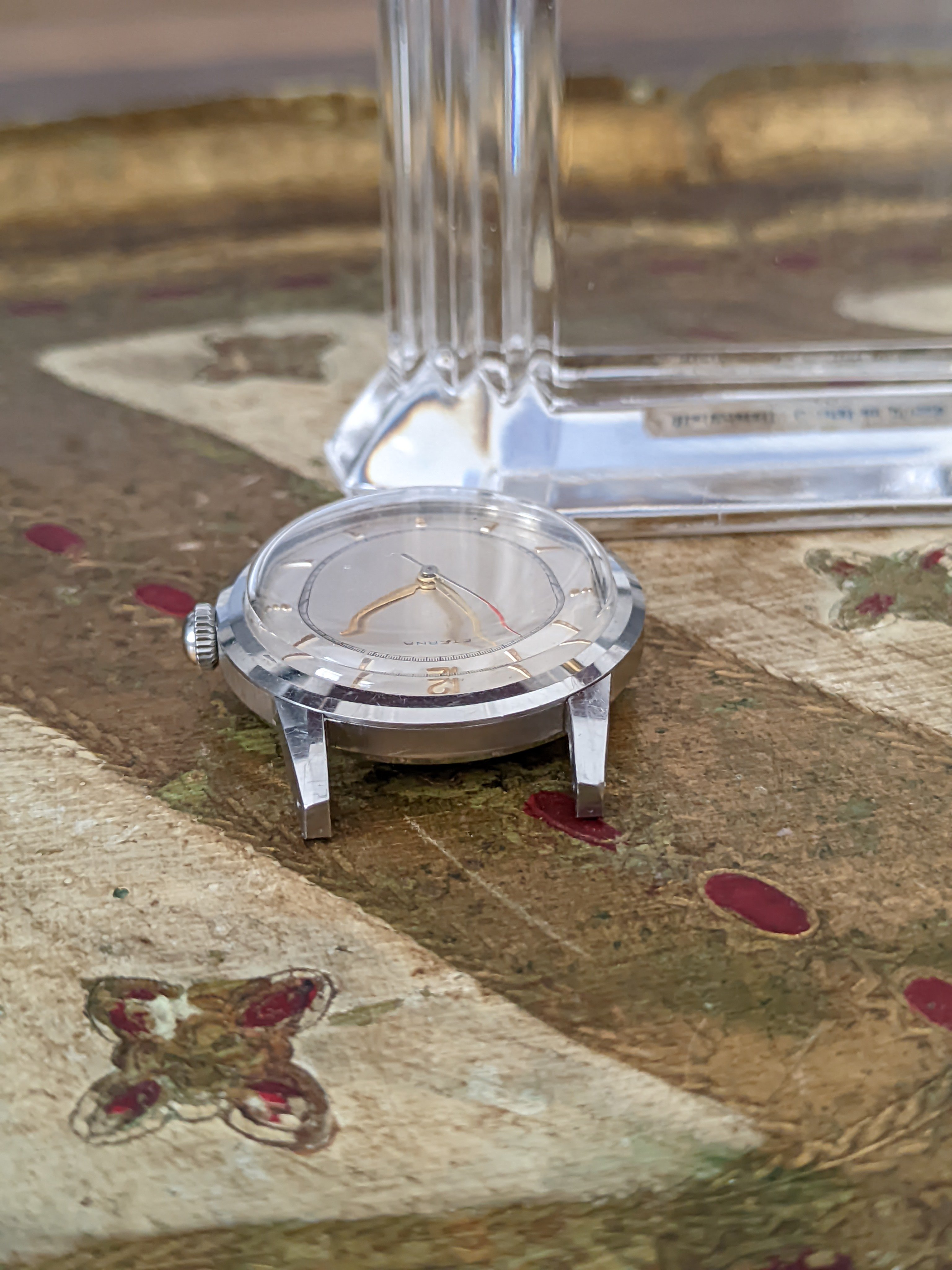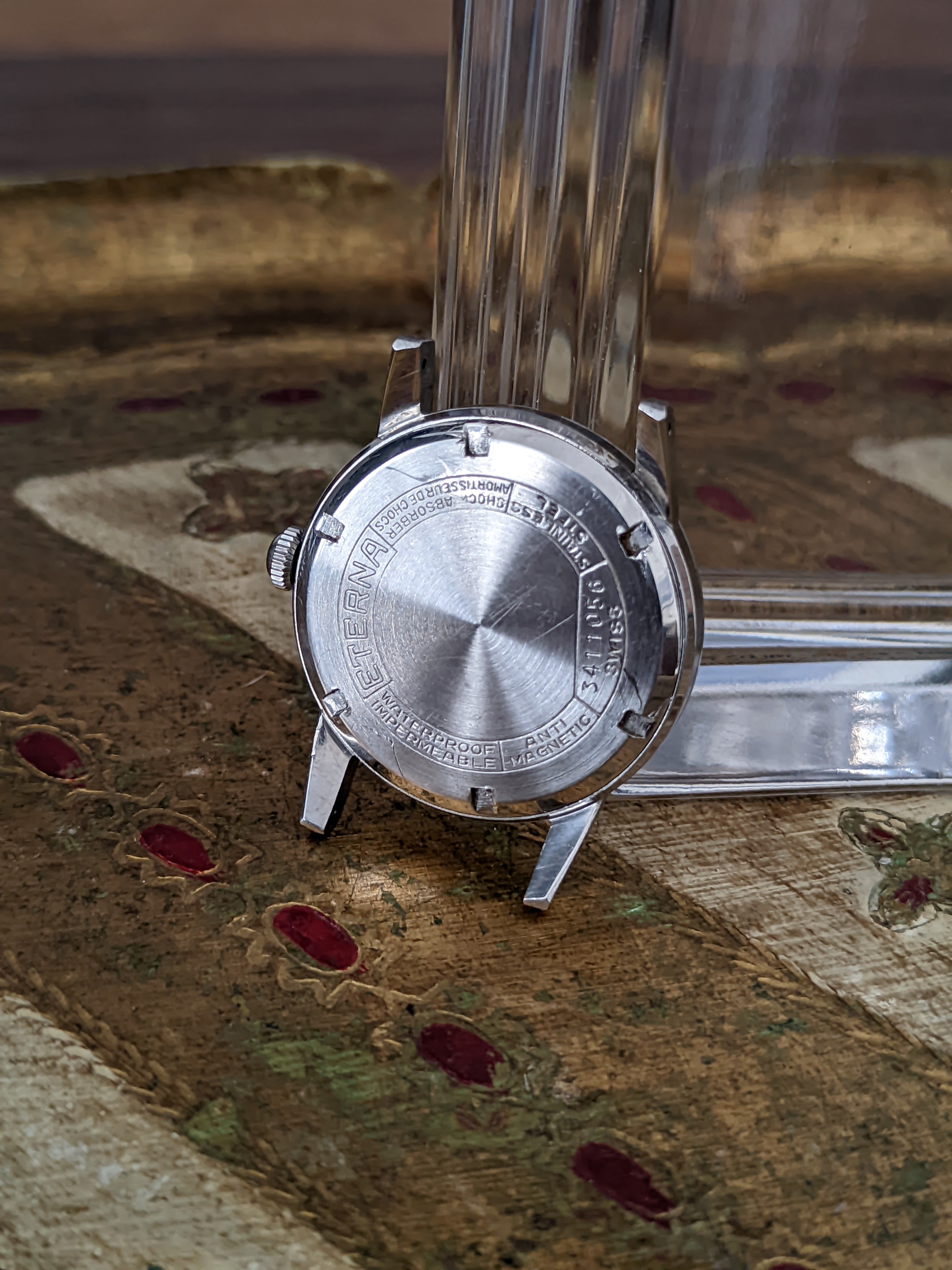 The sharp case features chamfered lugs (seem unpolished to my eyes), which were often used on ETERNA watches from that period.
