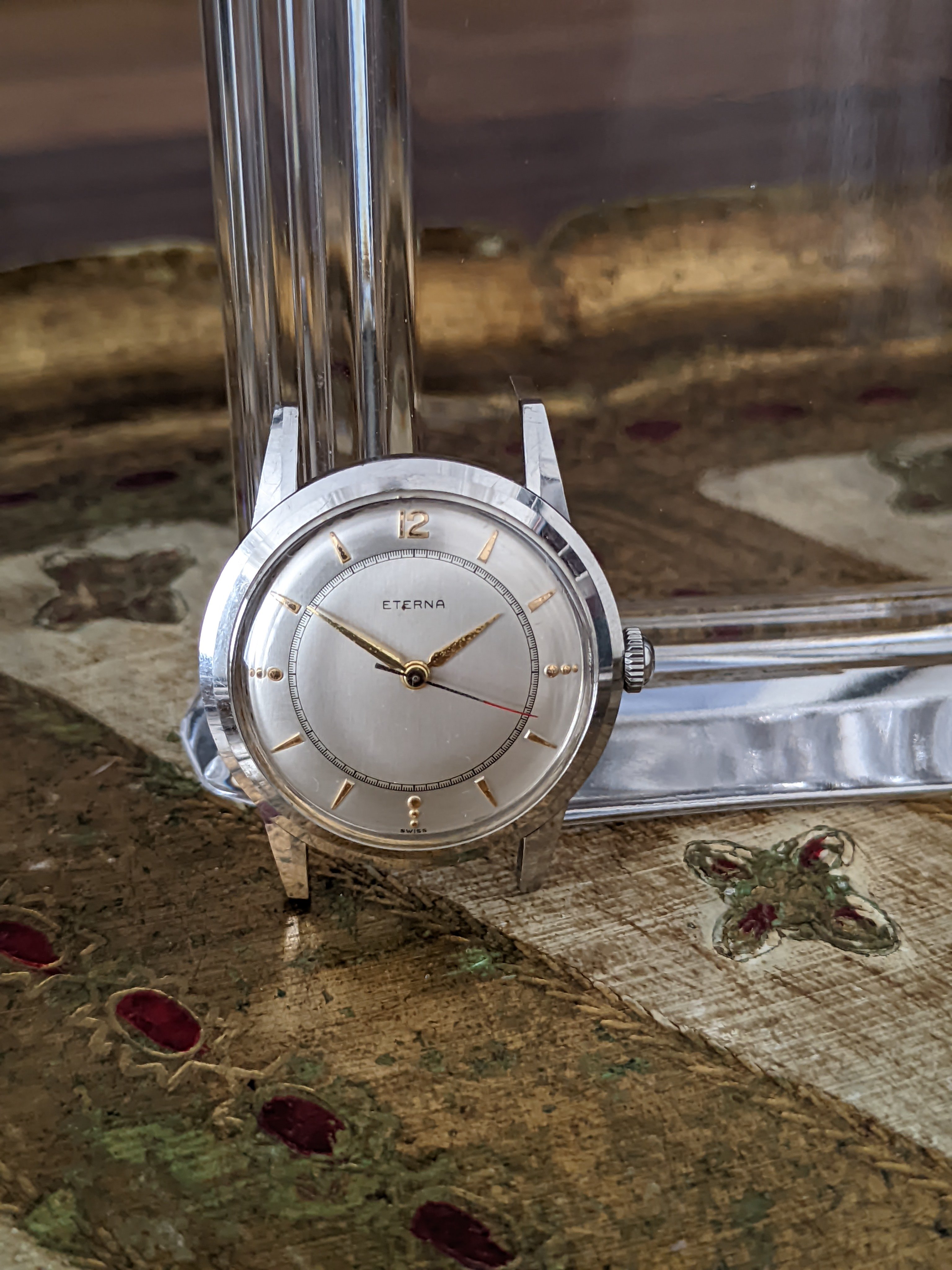 "This is, to my eye, one of the more interesting dial variations that ETERNA used during the mid-century. The indexes, as you can see in the photos, are inverted triangles, with the exception of 3, 6, 9 and 12. With the exception of the 12, those are comprised by three dots the closest to the minute/second track.... The truncated hands include a second hand with an iconic, red enamel tip. These were employed frequently by ETERNA during the period."