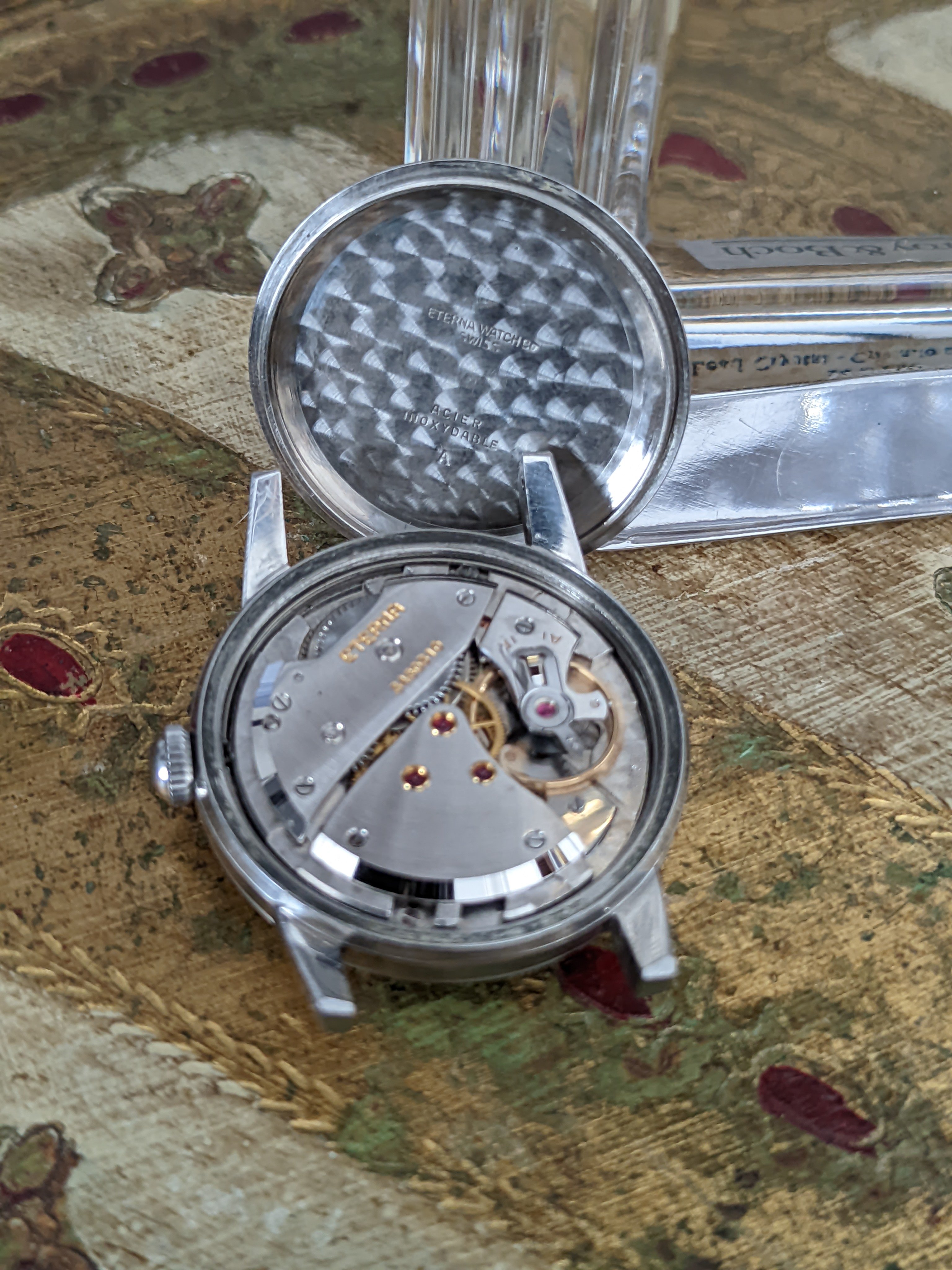 The watch is in excellent condition overall, and with the exception of a small dot on the second "E" of the Eterna on the dial.