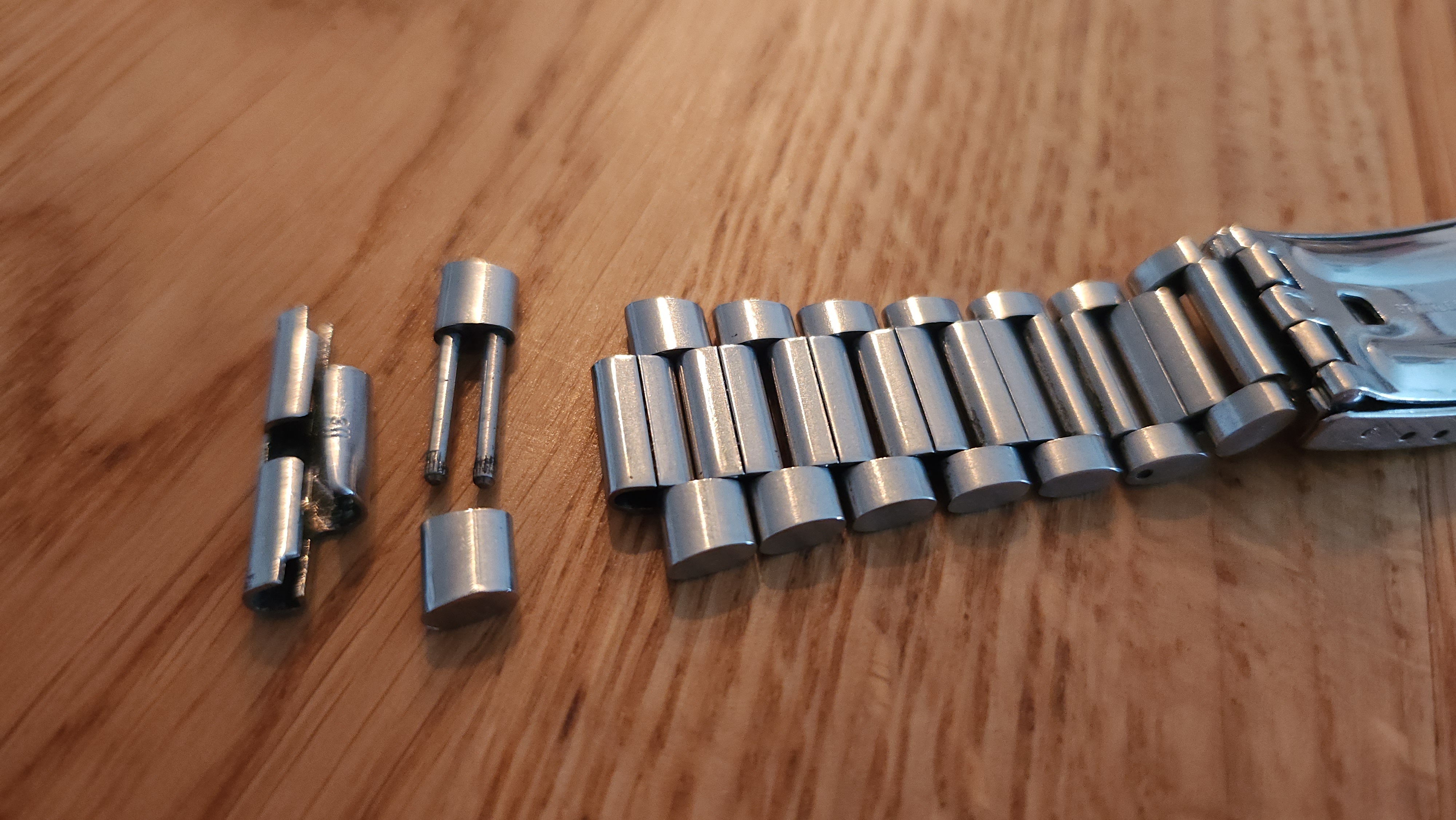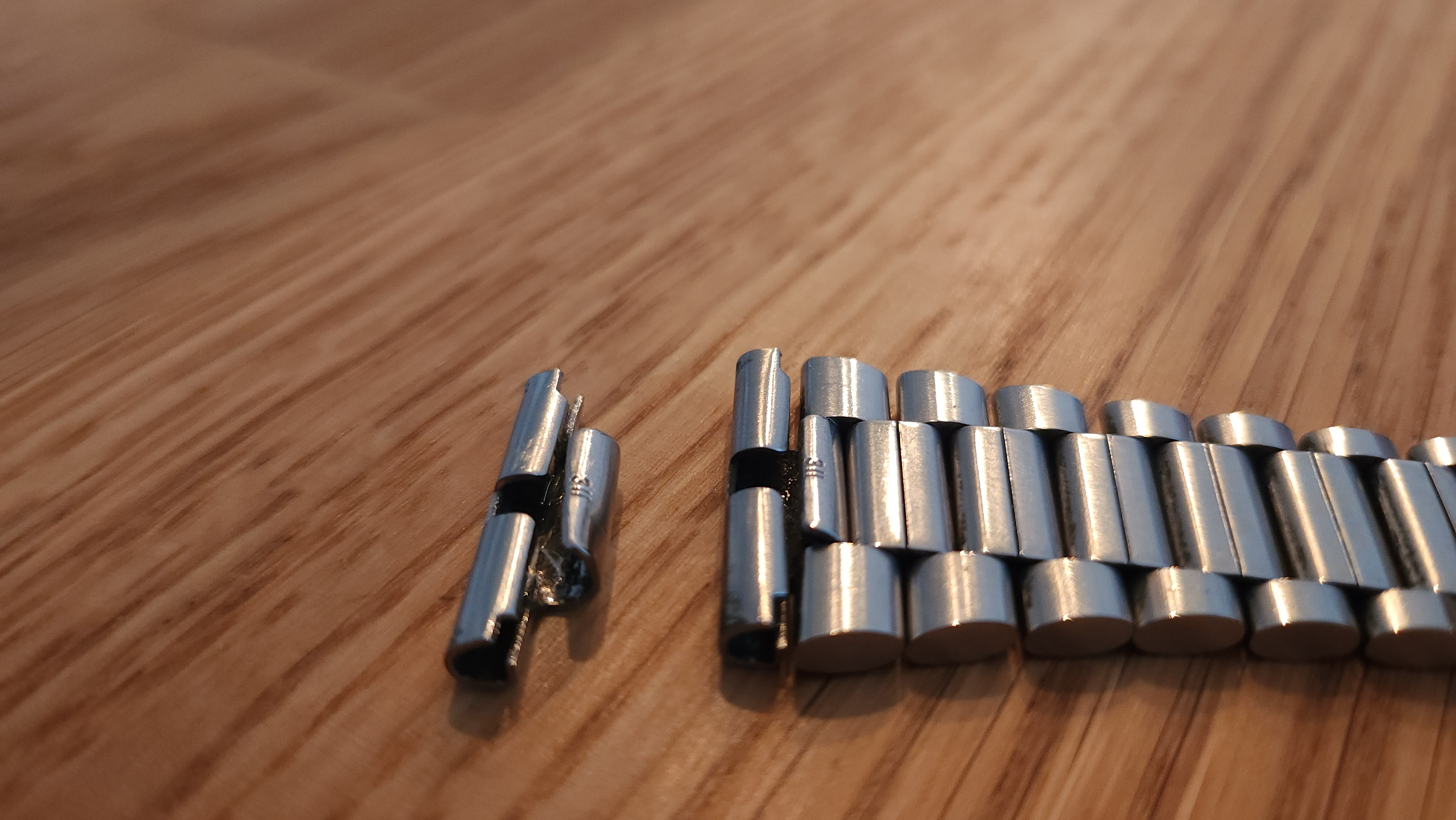 Troubles started when I tried to remove the bracelet, one end came out without too much trouble, on the other though the springbar simply would not budge. I tried and tried, getting more and more frustrated when finally, the link on the bracelet closest to the end-link on this side separated itself and only the endlink and the springbar remained on the watch. I don't think this link was supposed to be separated so I am wondering if it might separated again if I put it back together.