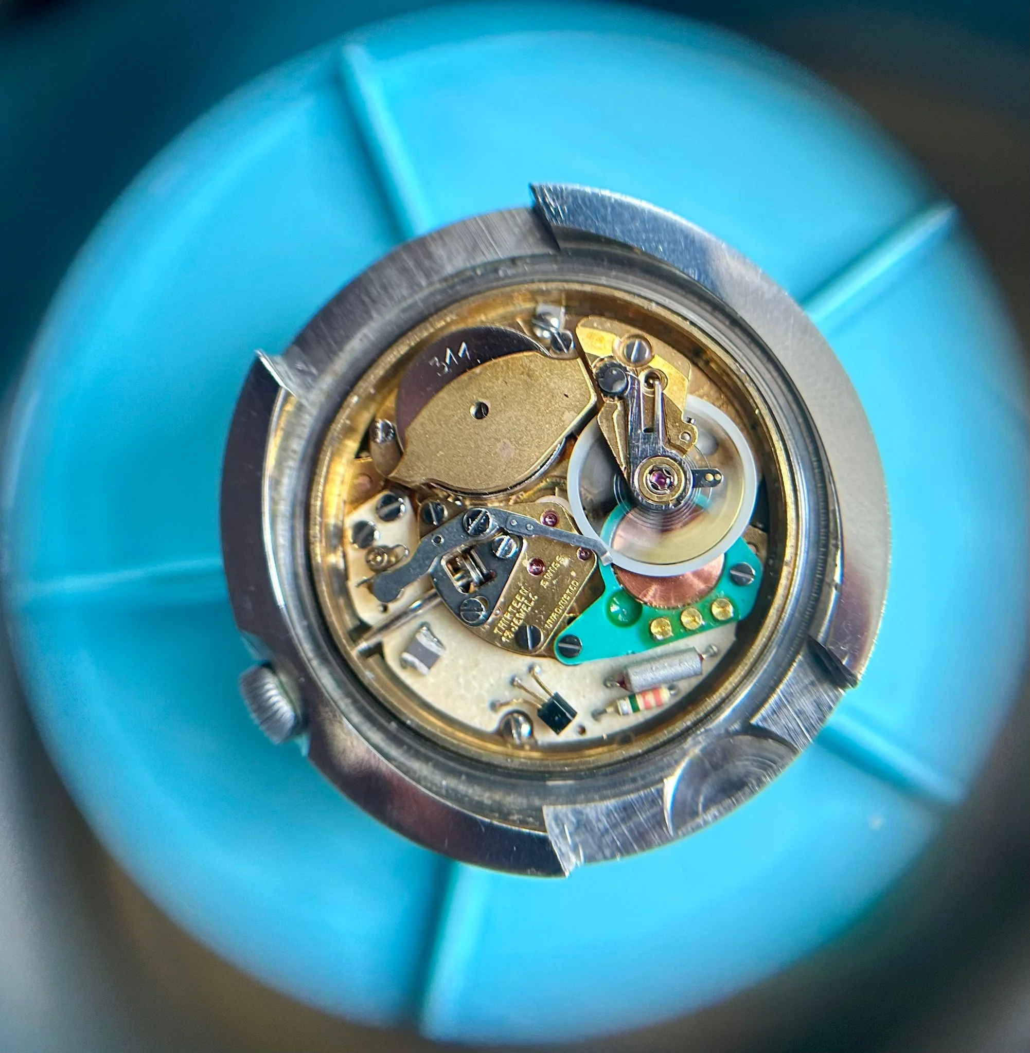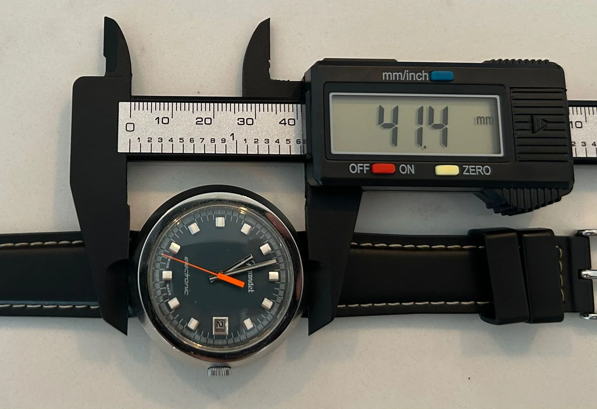 - Case: Striking UFO-shaped stainless steel case, measuring 41mm (excluding crown). The case is in excellent condition, with clean lines that perfectly capture the space-age aesthetics of the late 60s and early 70s. Says Water resistant on the caseback.