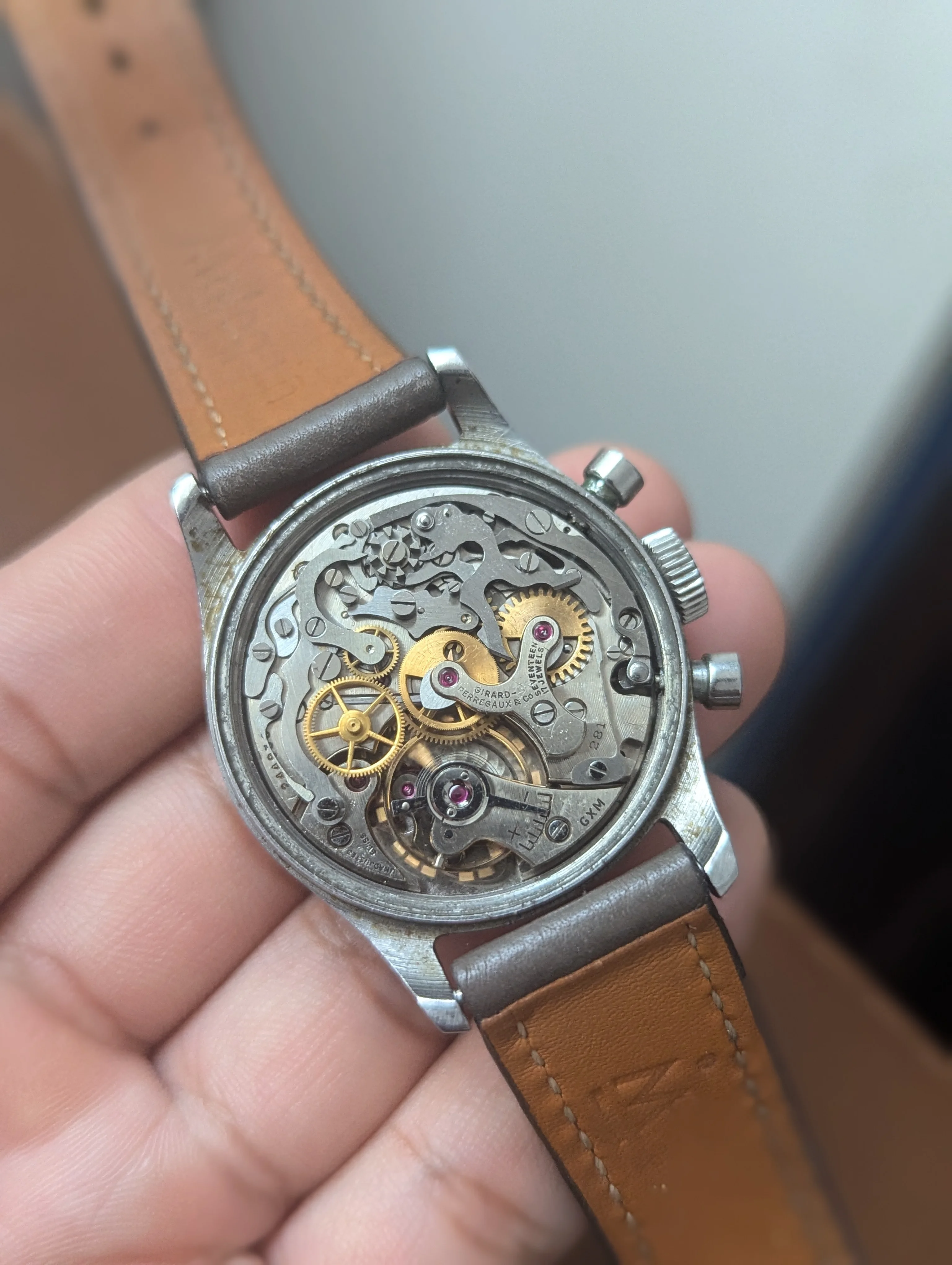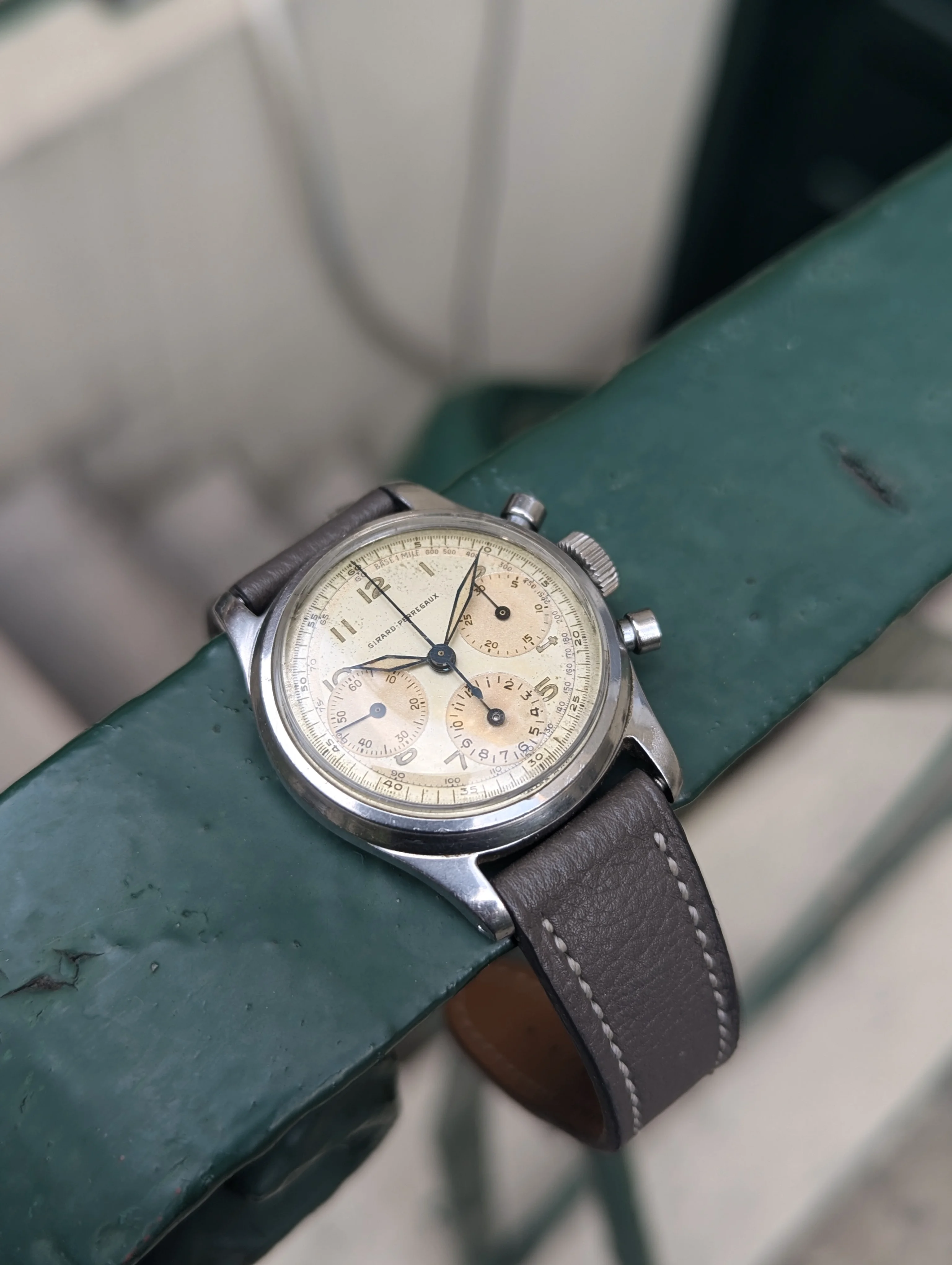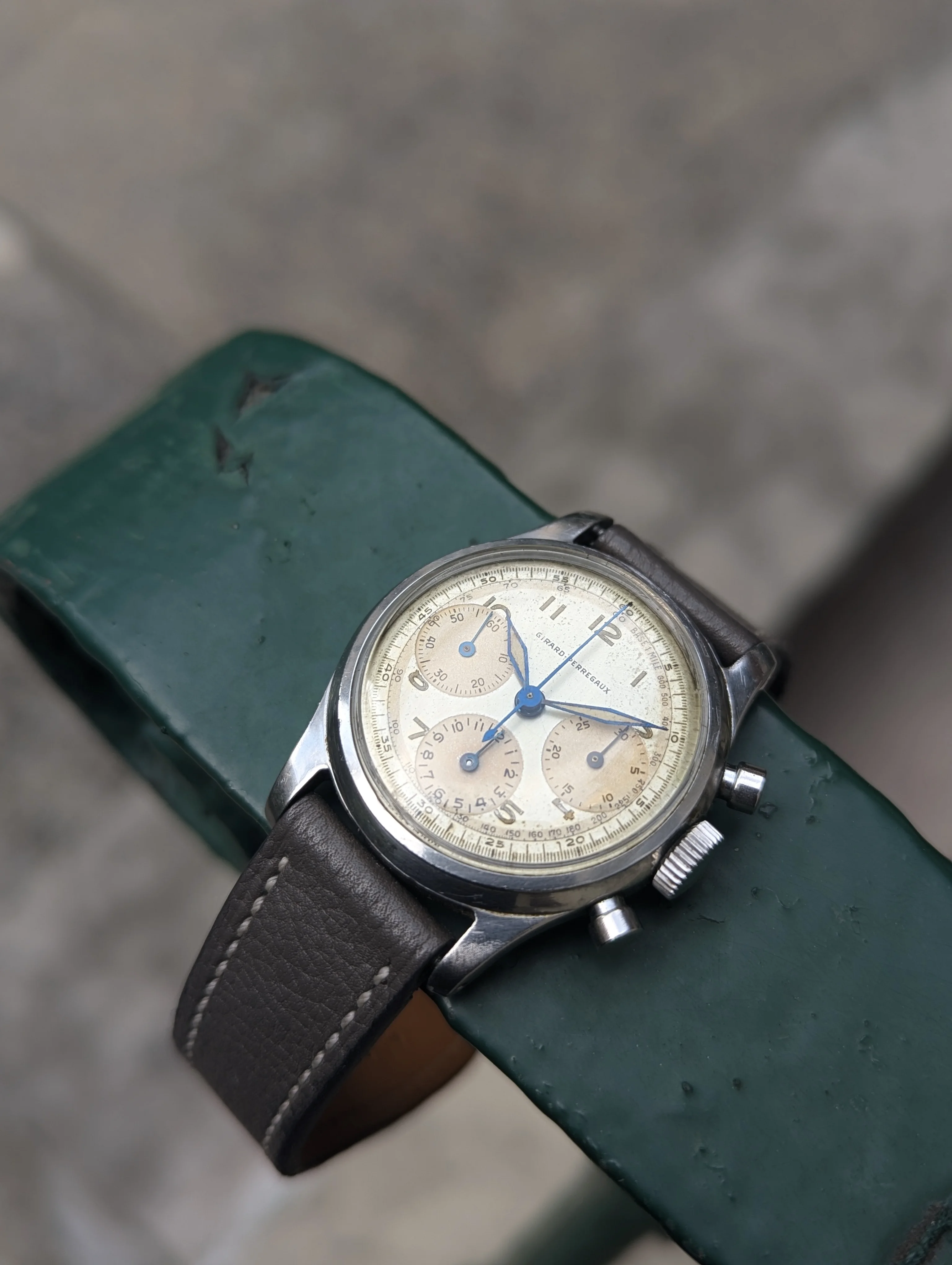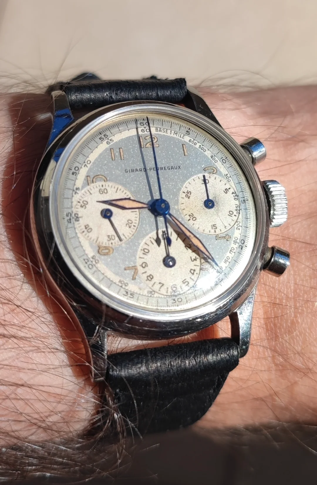 Up for sale is a Girard Perregaux 22209 Cal. 281 that's been in my collection for many years. The case measures about 34mm in diameter without the crown, and takes a 17-18mm strap. Dial and hands are original, and the dial has slight age and is a silver/light robin egg blue color in some light. Case is in decent condition, the caseback shows some marks where it looks like the incorrect opener was used. Chronograph works well, watch has not been serviced for many years and runs about -10 to -30 sec slow, so I would eventually recommend a service. Watch will come on a different strap from the one as shown. If you have any questions please send me a dm, and I'm also open to trades for other chronographs/vintage watches. Thanks!