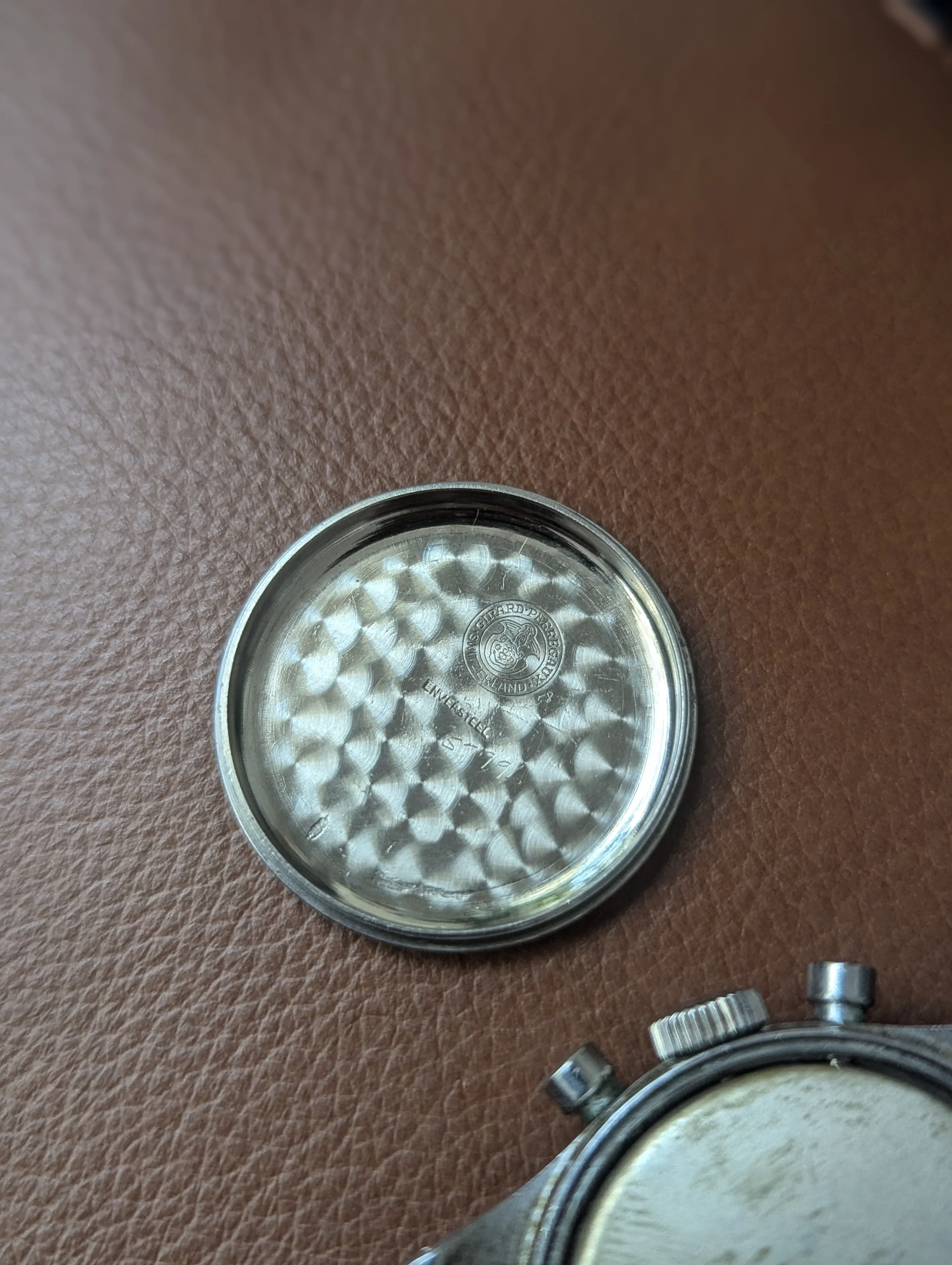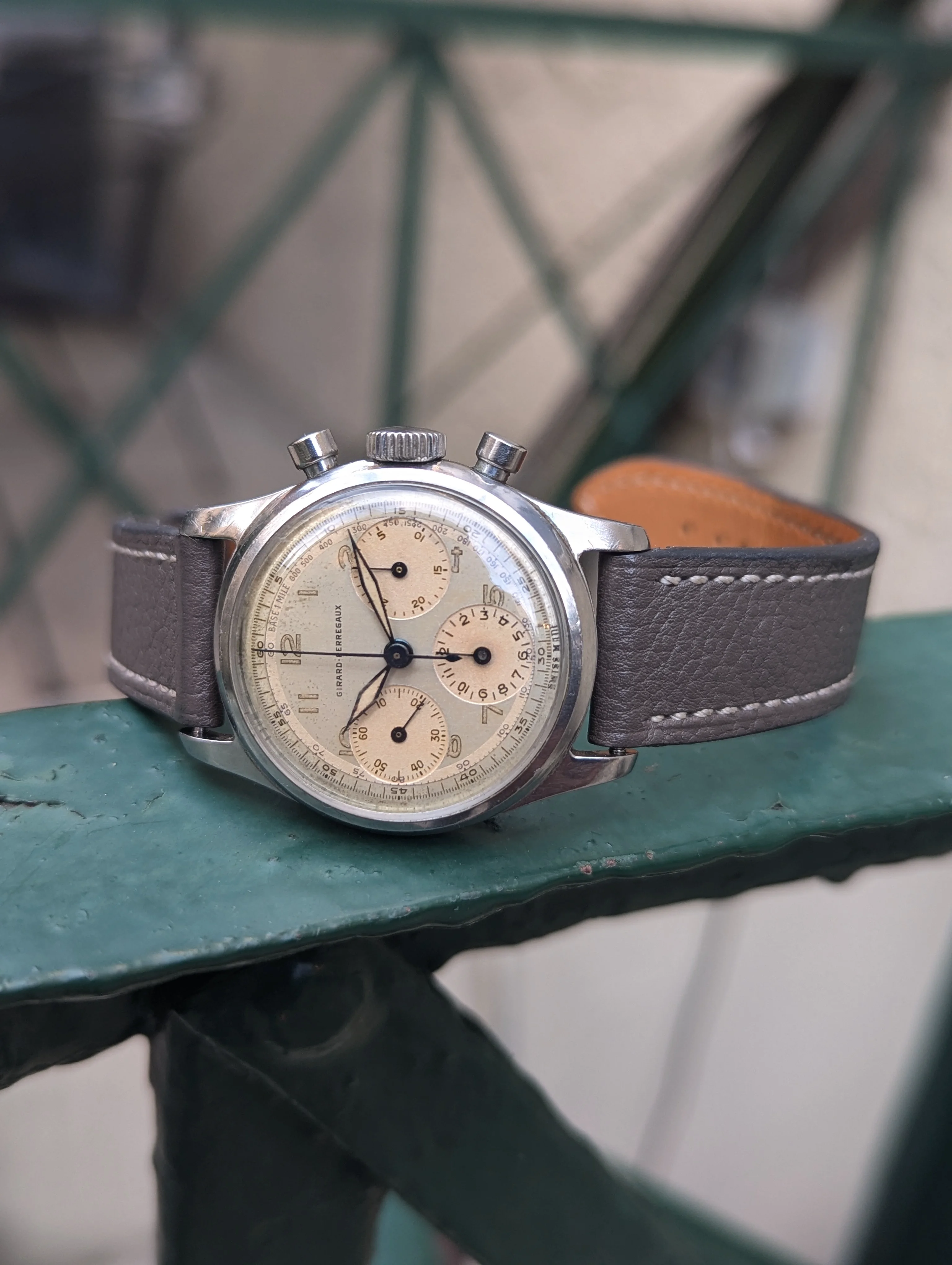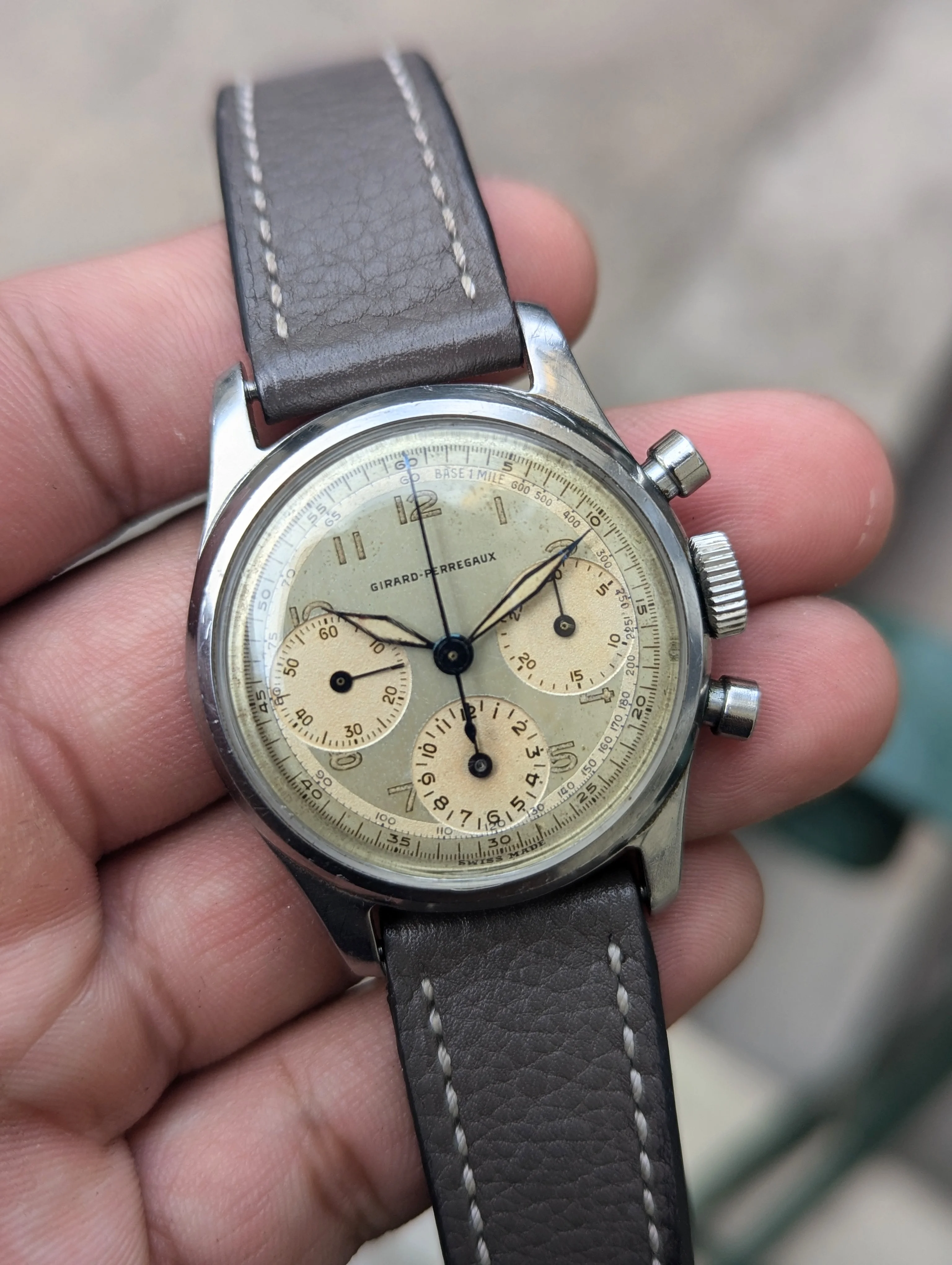 Up for sale is a Girard Perregaux 22209 Cal. 281 that's been in my collection for many years. The case measures about 34mm in diameter without the crown, and takes a 17-18mm strap. Dial and hands are original, and the dial has slight age and is a silver/light robin egg blue color in some light. Case is in decent condition, the caseback shows some marks where it looks like the incorrect opener was used. Chronograph works well, watch has not been serviced for many years and runs about -10 to -30 sec slow, so I would eventually recommend a service. Watch will come on a different strap from the one as shown. If you have any questions please send me a dm, and I'm also open to trades for other chronographs/vintage watches. Thanks!
