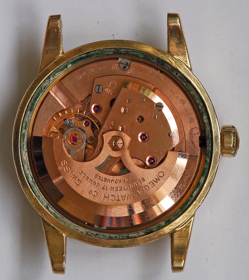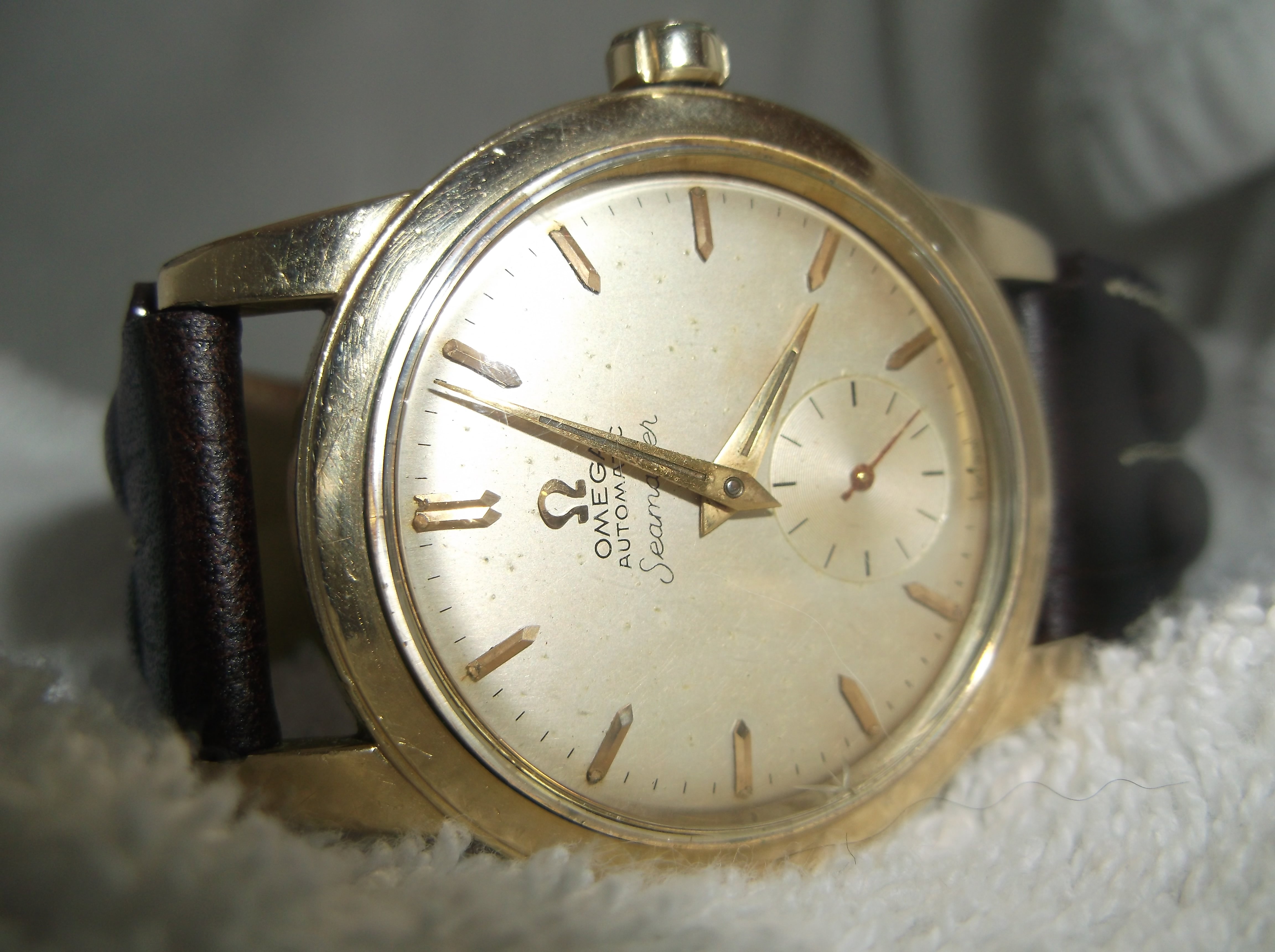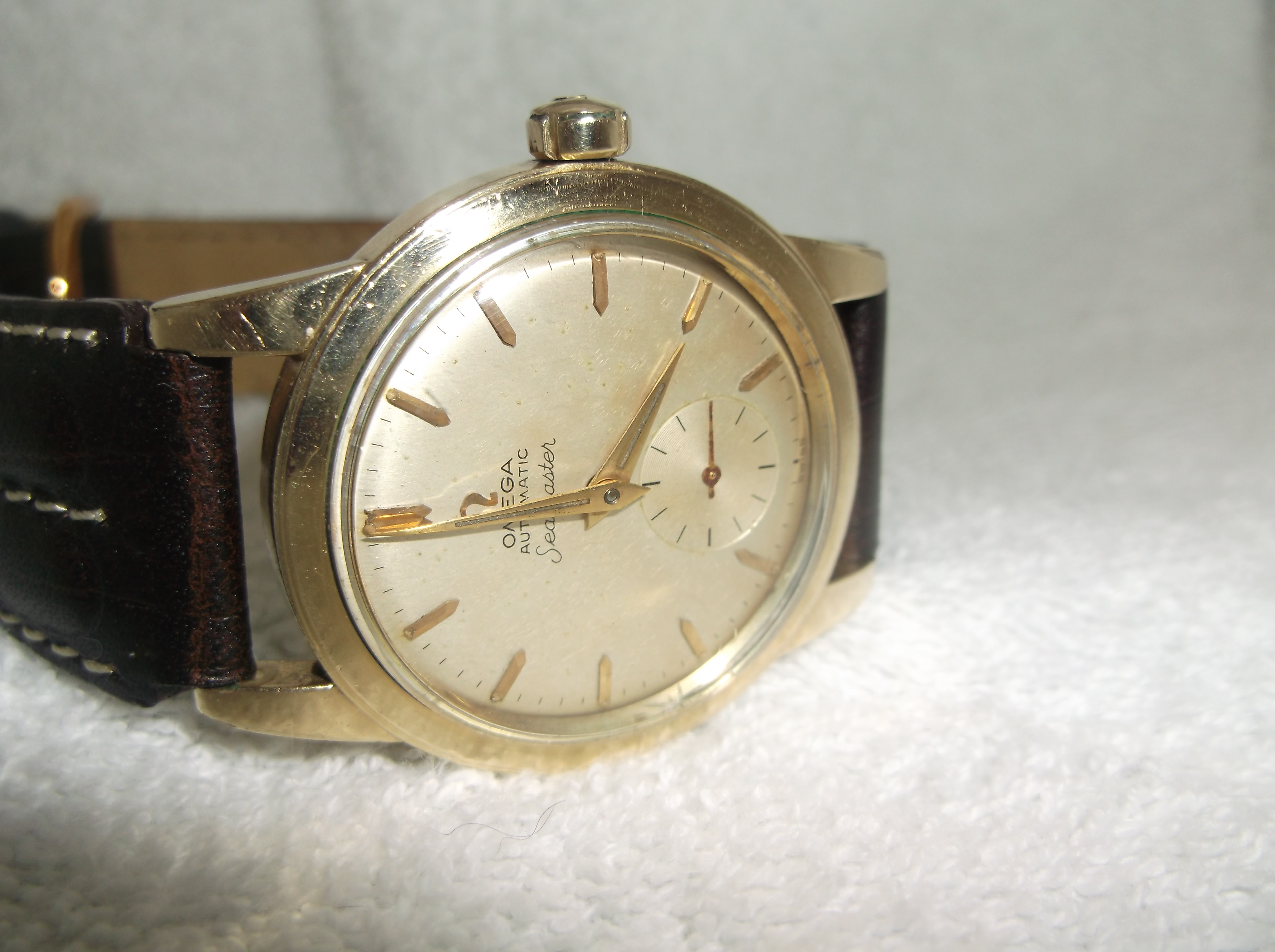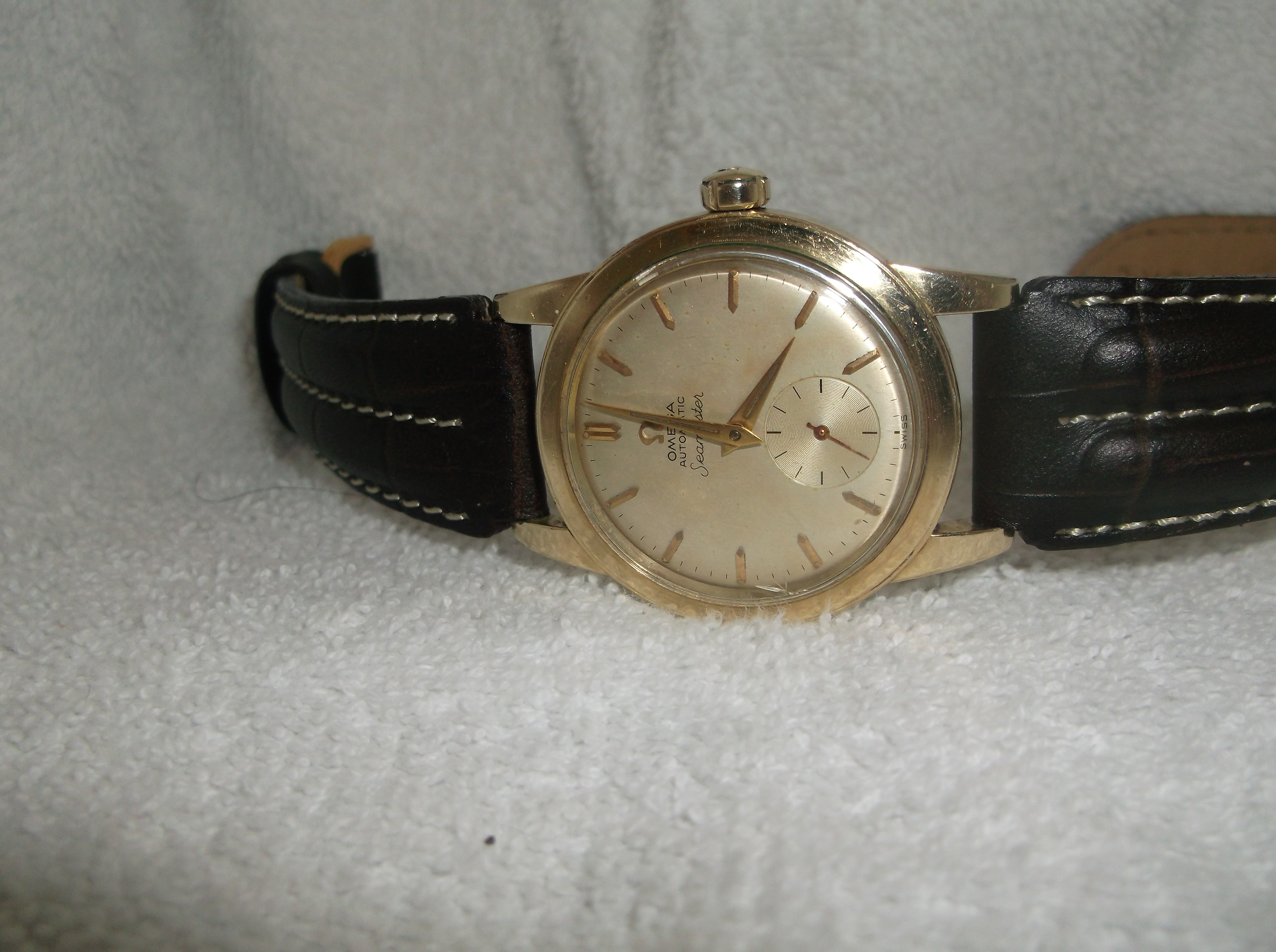 ·The watch has a 35mm case size excluding the crown. It is currently on a 20mm dark brown strap notched for a 18mm case. The movement is an Omega caliber 490 http://www.omega-fanatic.com/pages/gallery/omega-caliber-490--page-239.php. The watch does have a small crack in the crystal between 8 and 9 that is much more noticeable in the pictures than on the wrist. I purchased this watch on this forum and it has been serviced within the past 2 years. Keeps good time and looks great on the wrist.