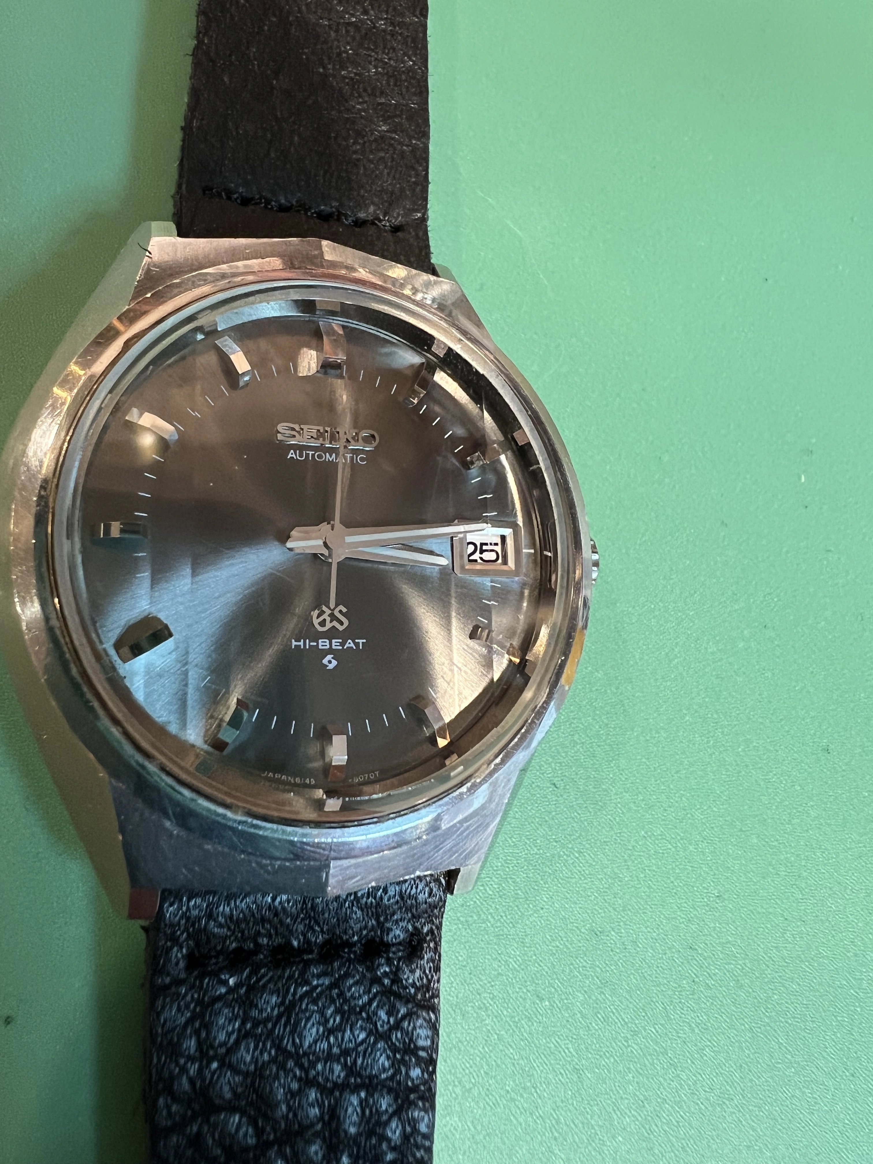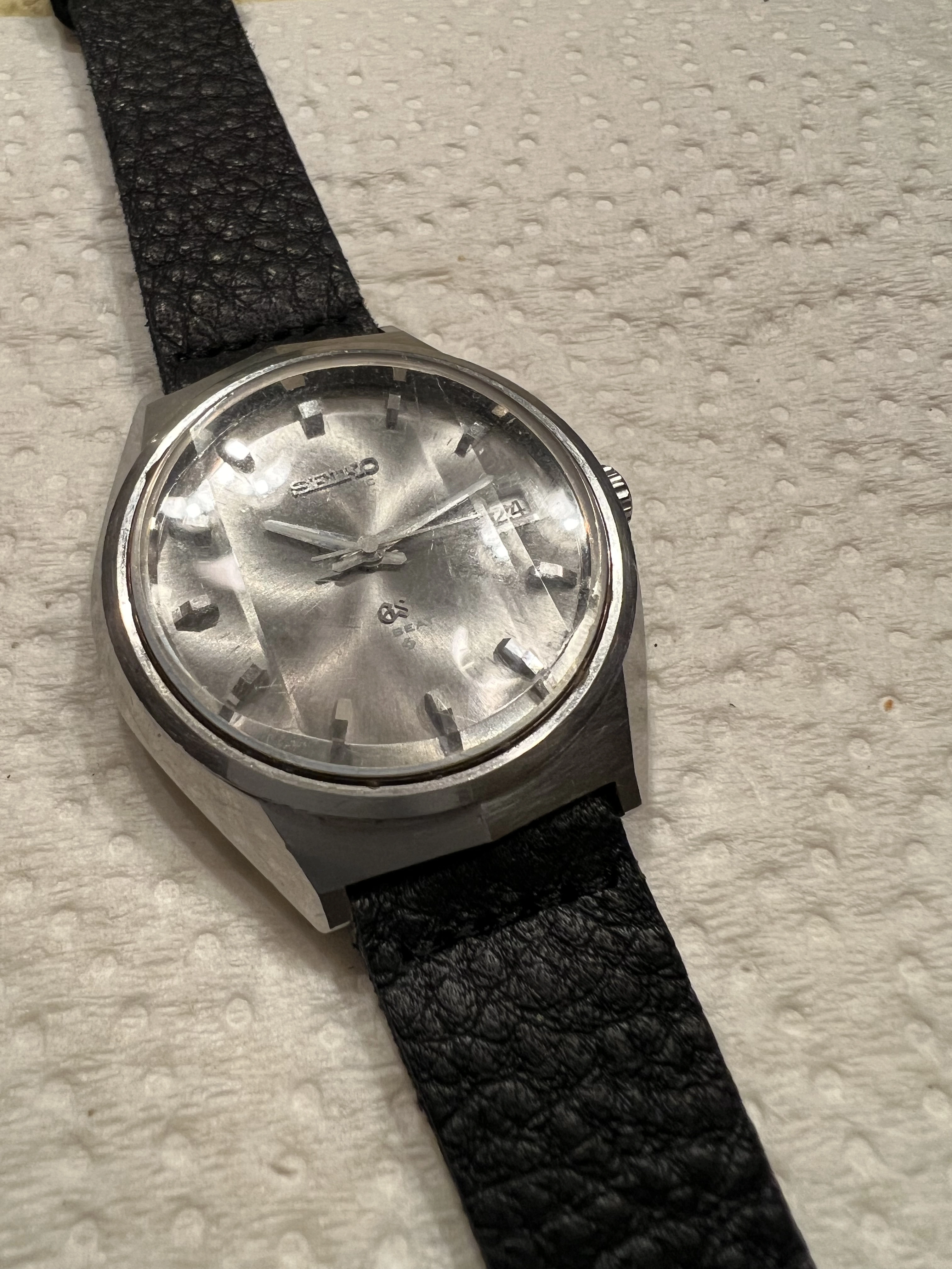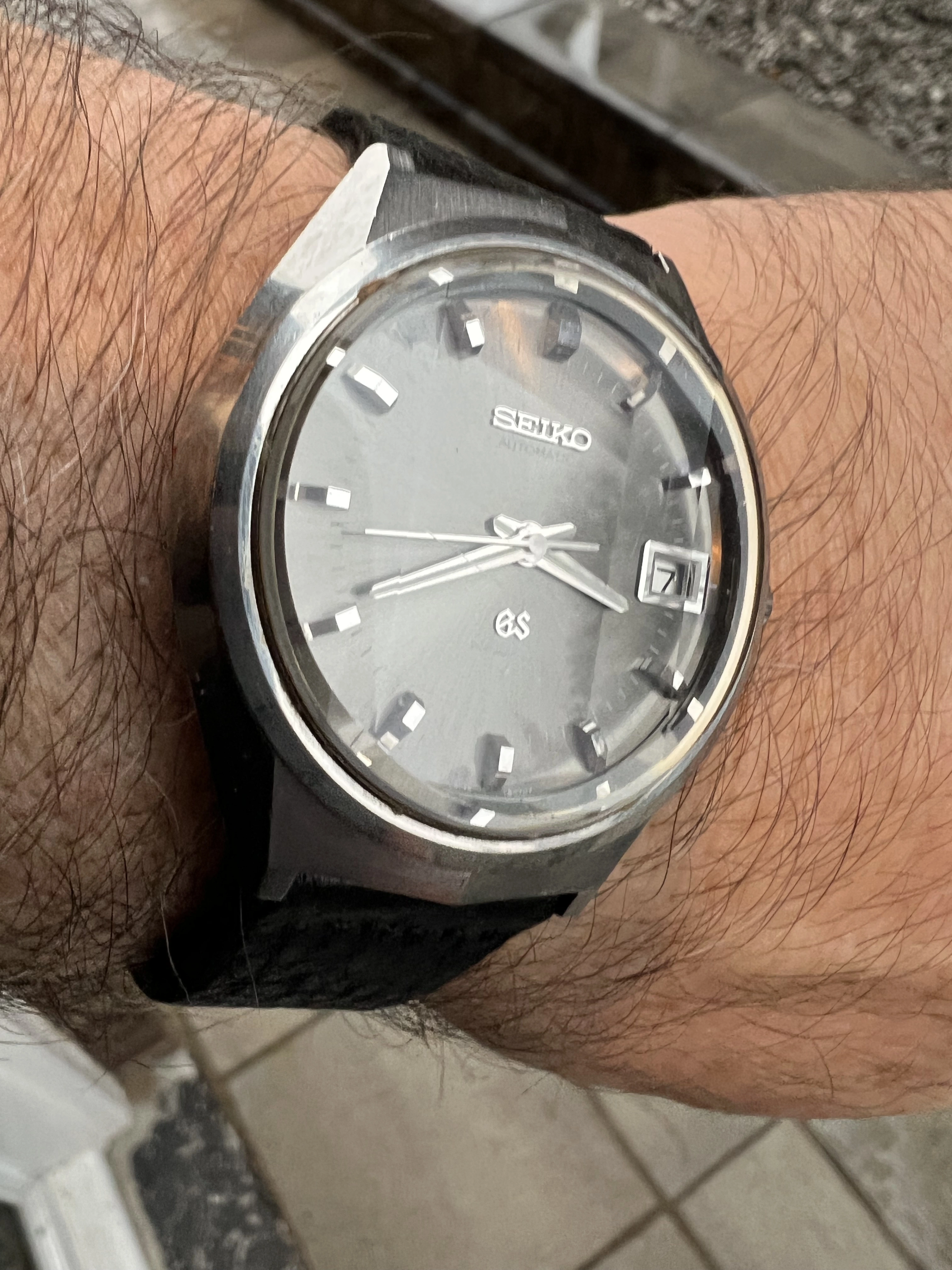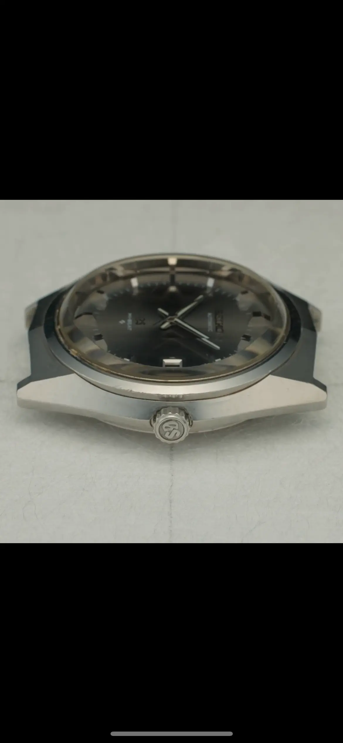Something a little different for the GS collector- 6145-8050 which is an unusual reference only made for 2 months, April and May 1972. They came in 4 dial colors, silver, blue green and brown. The colored dials were very uncommon. Over time almost all of the blue dials faded from UV exposure to charcoal grey, and that is what we have here. These watches had several other unusual features- the case was HSS hardened stainless steel, which was also used on several other special GS references including VFA. Also, the crystal was faceted with 2 vertical lines running top to bottom, which is hard to see in all photos but clearly noted on first photo. Hard to photograph this one lots of shots in different light. I’m selling this one to fulfill one of my 2025 collecting vows- to sell duplicates as I have another from April 72 (one from each of 2 months they were made).