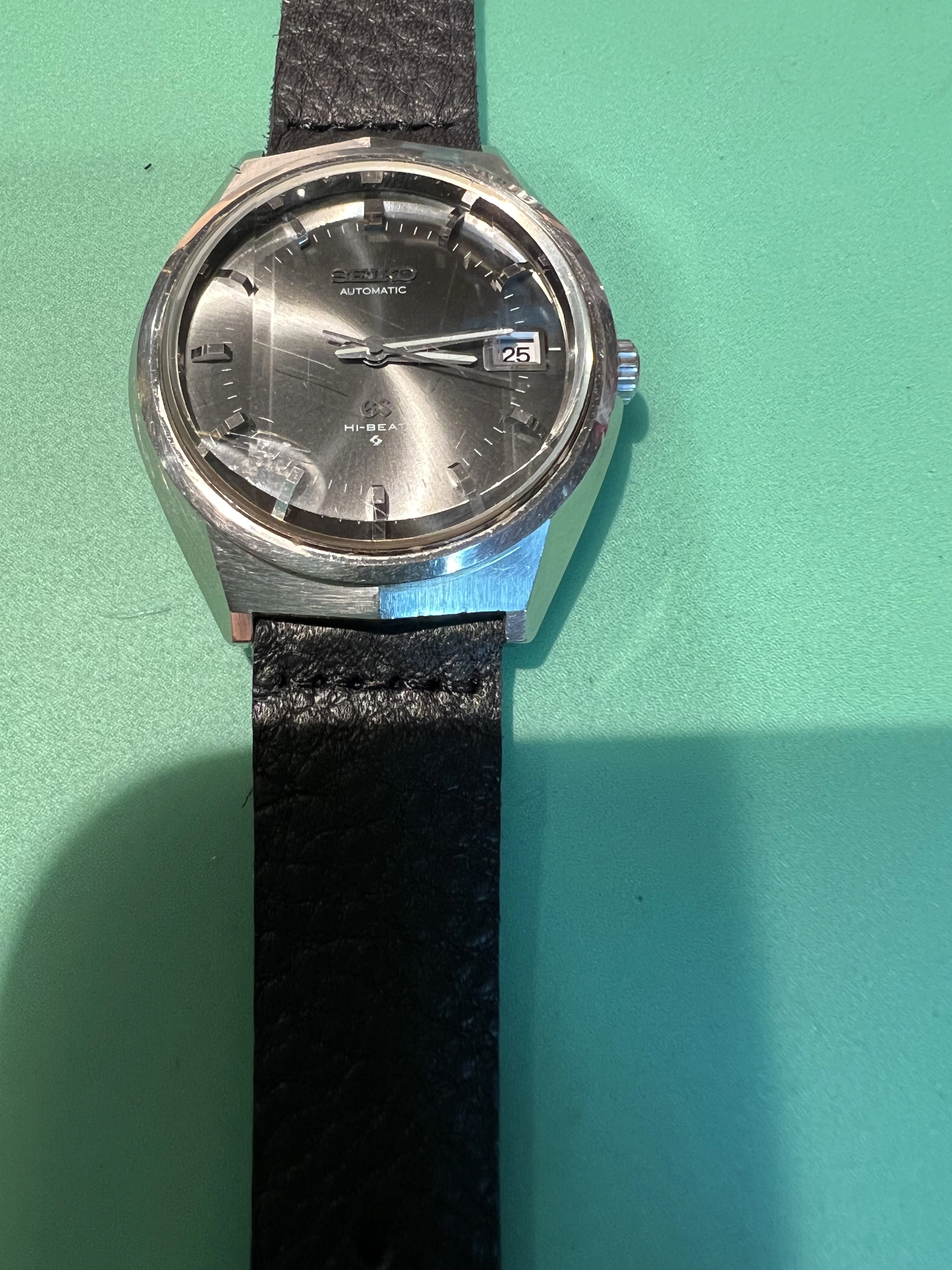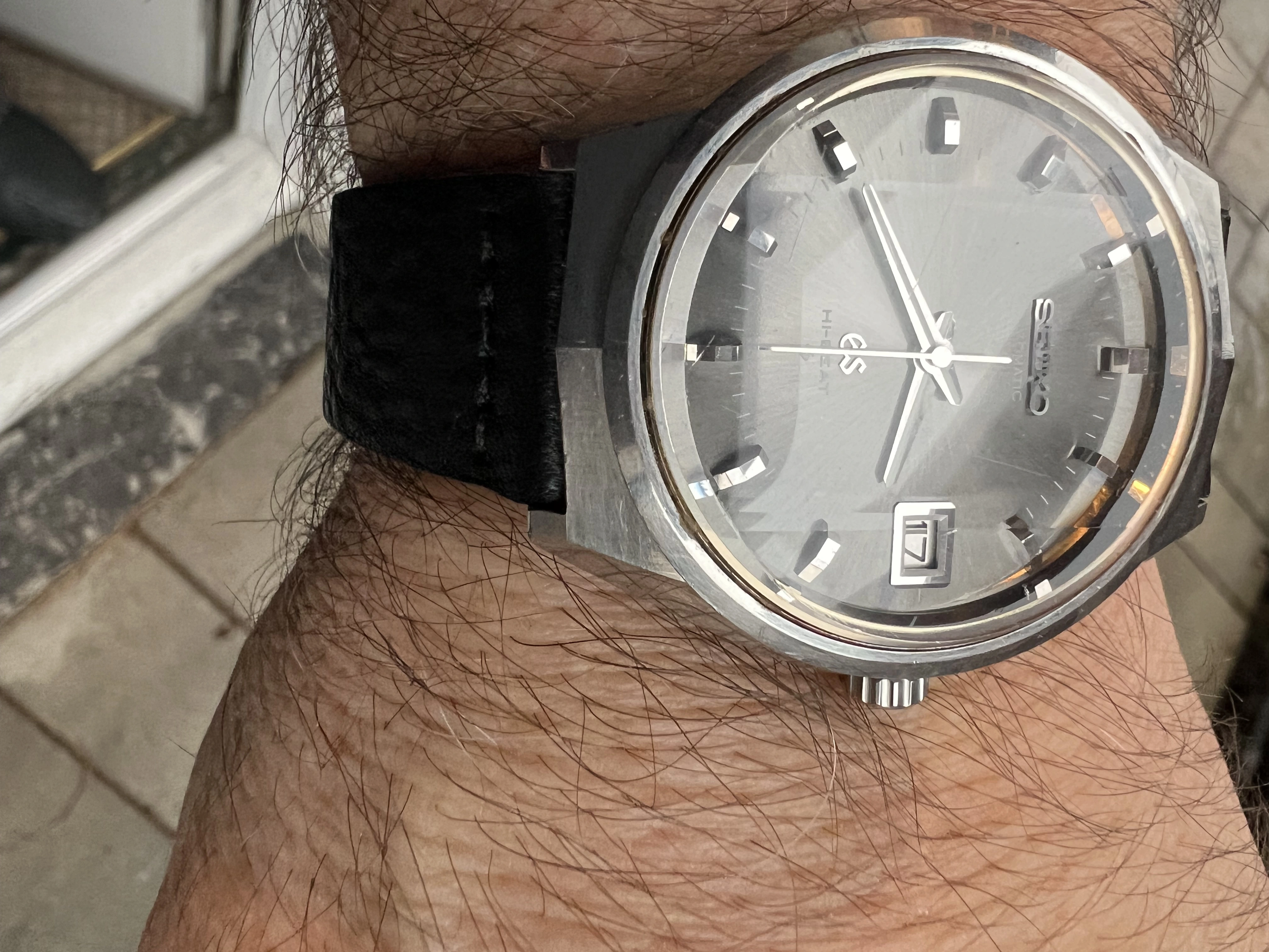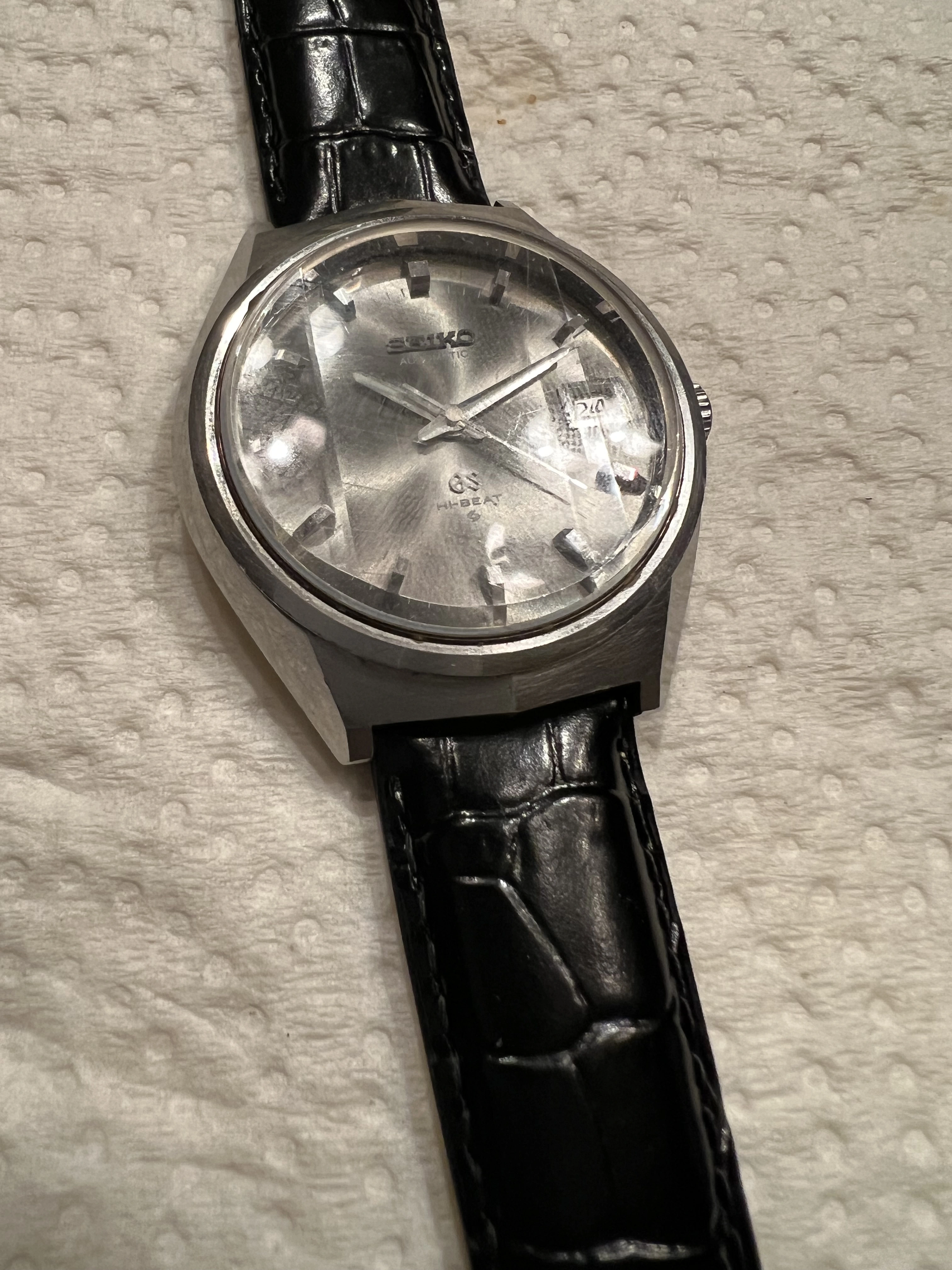 Something a little different for the GS collector- 6145-8050 which is an unusual reference only made for 2 months, April and May 1972. They came in 4 dial colors, silver, blue green and brown. The colored dials were very uncommon. Over time almost all of the blue dials faded from UV exposure to charcoal grey, and that is what we have here. These watches had several other unusual features- the case was HSS hardened stainless steel, which was also used on several other special GS references including VFA. Also, the crystal was faceted with 2 vertical lines running top to bottom, which is hard to see in all photos but clearly noted on first photo. Hard to photograph this one lots of shots in different light. I’m selling this one to fulfill one of my 2025 collecting vows- to sell duplicates as I have another from April 72 (one from each of 2 months they were made).