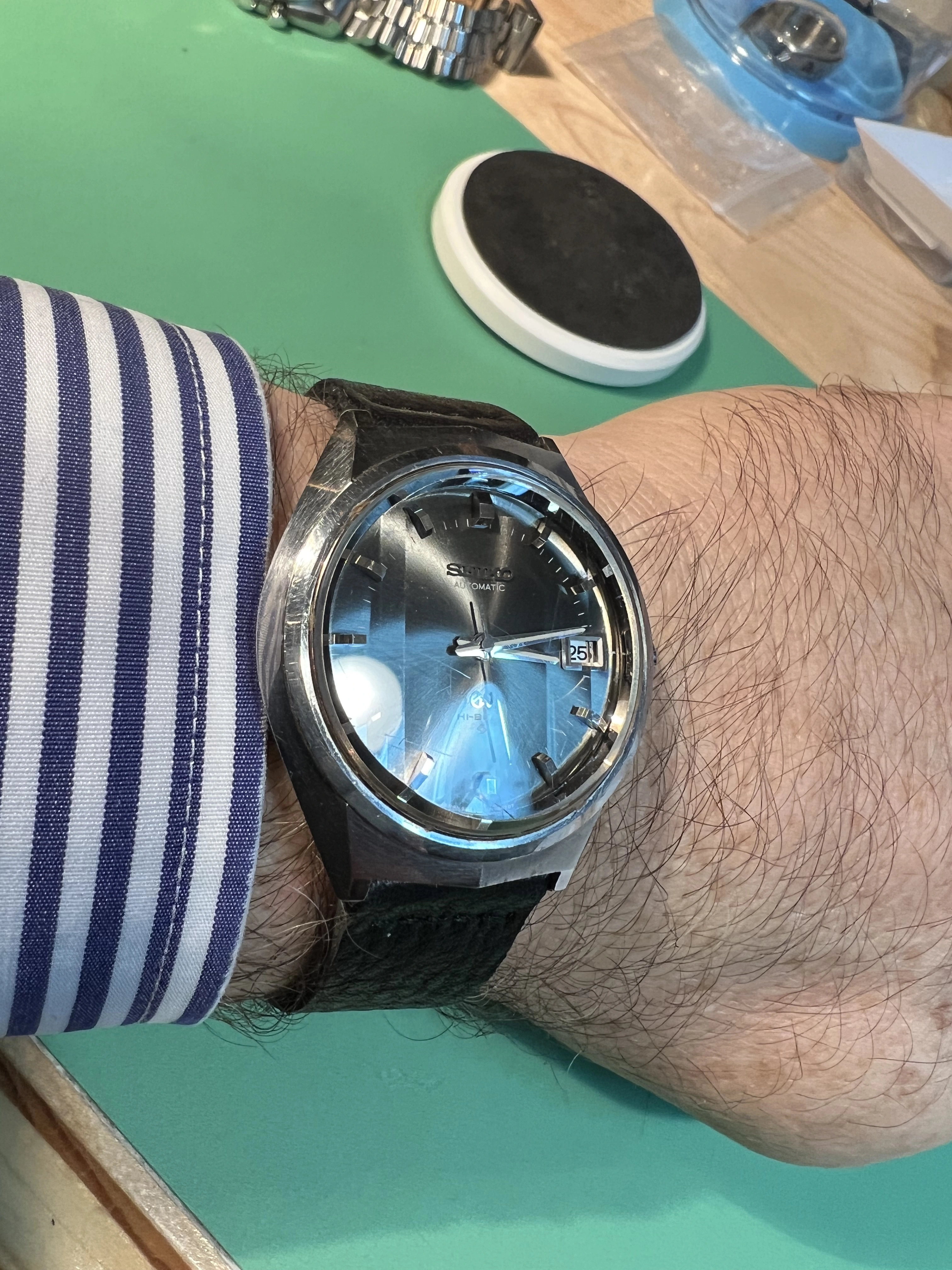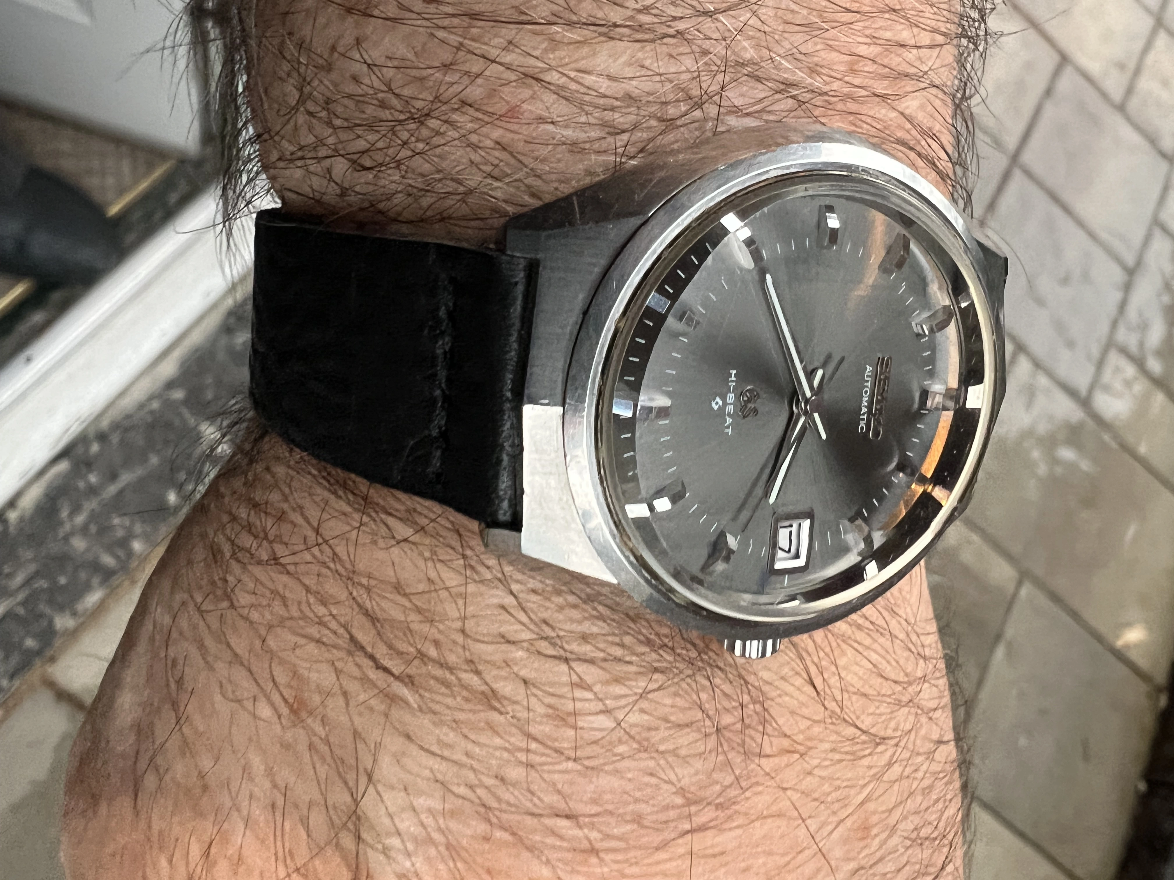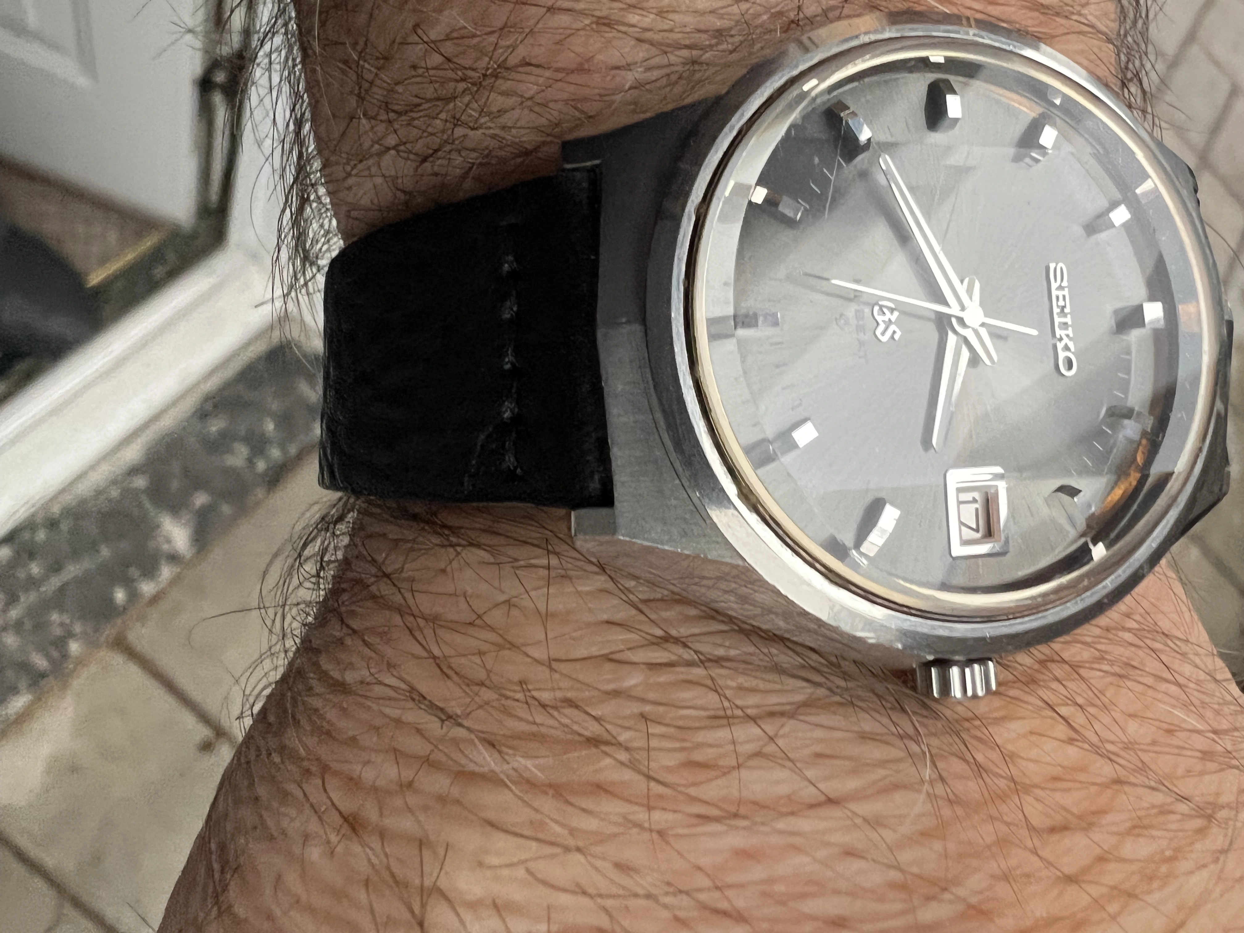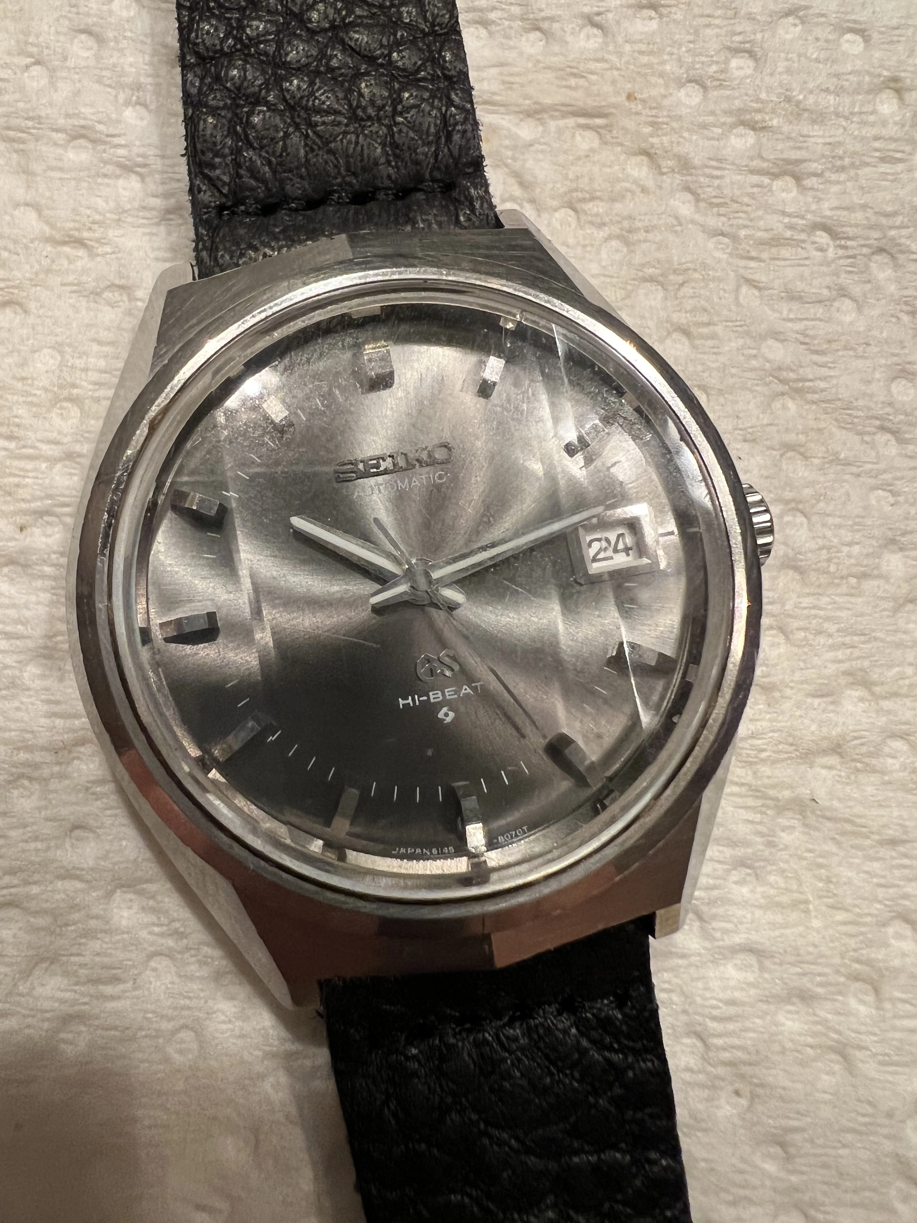 Something a little different for the GS collector- 6145-8050 which is an unusual reference only made for 2 months, April and May 1972. They came in 4 dial colors, silver, blue green and brown. The colored dials were very uncommon. Over time almost all of the blue dials faded from UV exposure to charcoal grey, and that is what we have here. These watches had several other unusual features- the case was HSS hardened stainless steel, which was also used on several other special GS references including VFA. Also, the crystal was faceted with 2 vertical lines running top to bottom, which is hard to see in all photos but clearly noted on first photo. Hard to photograph this one lots of shots in different light. I’m selling this one to fulfill one of my 2025 collecting vows- to sell duplicates as I have another from April 72 (one from each of 2 months they were made).