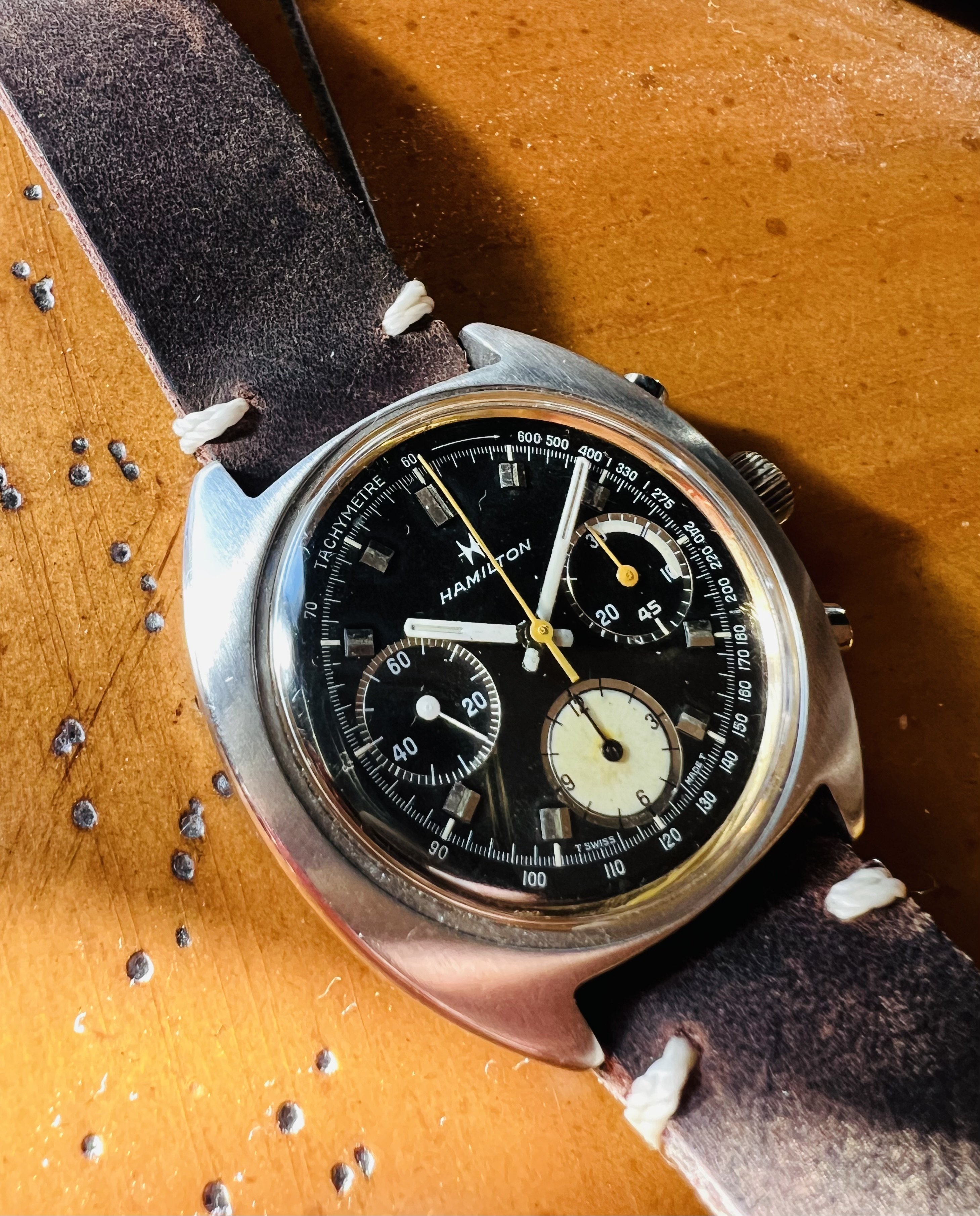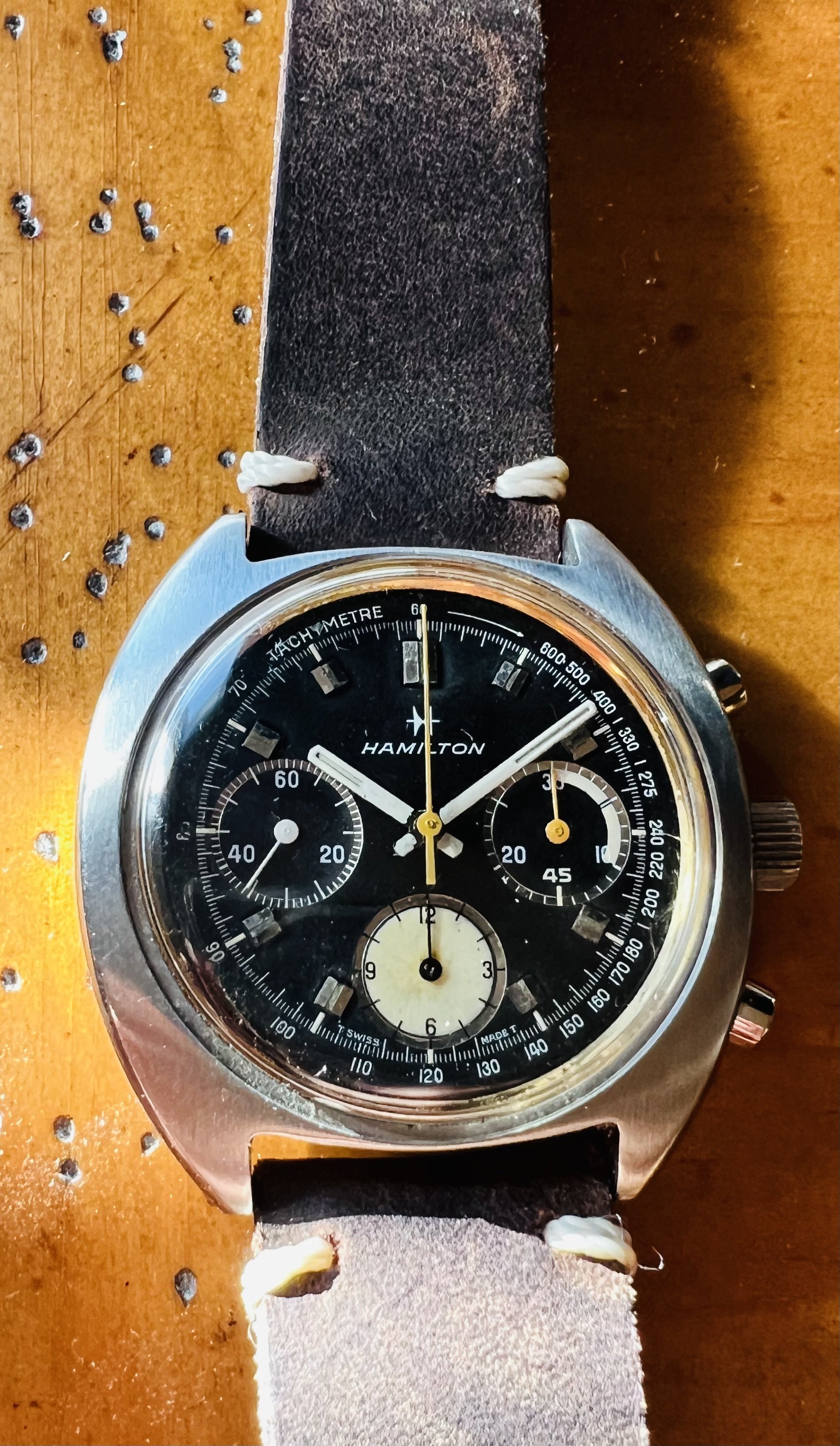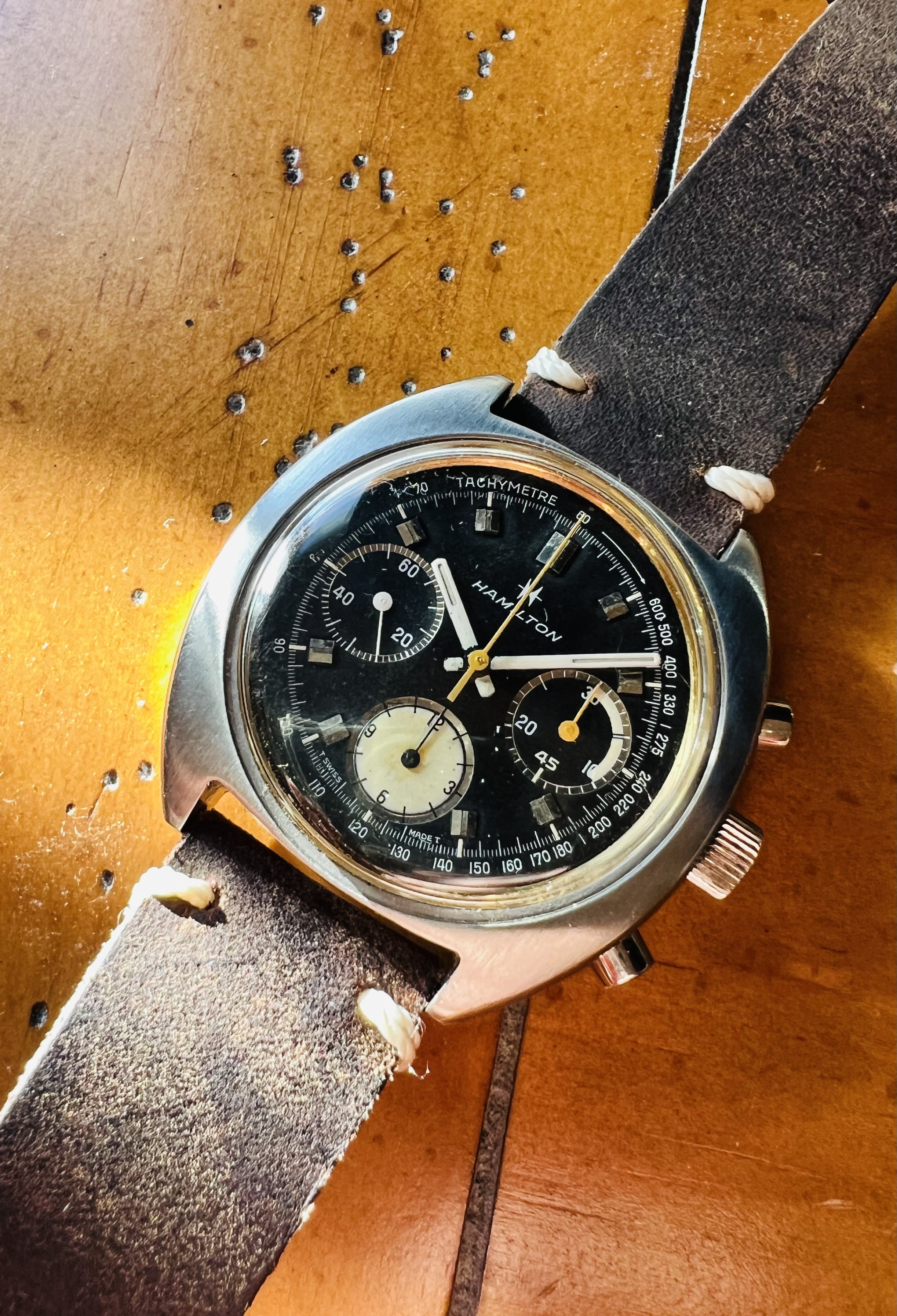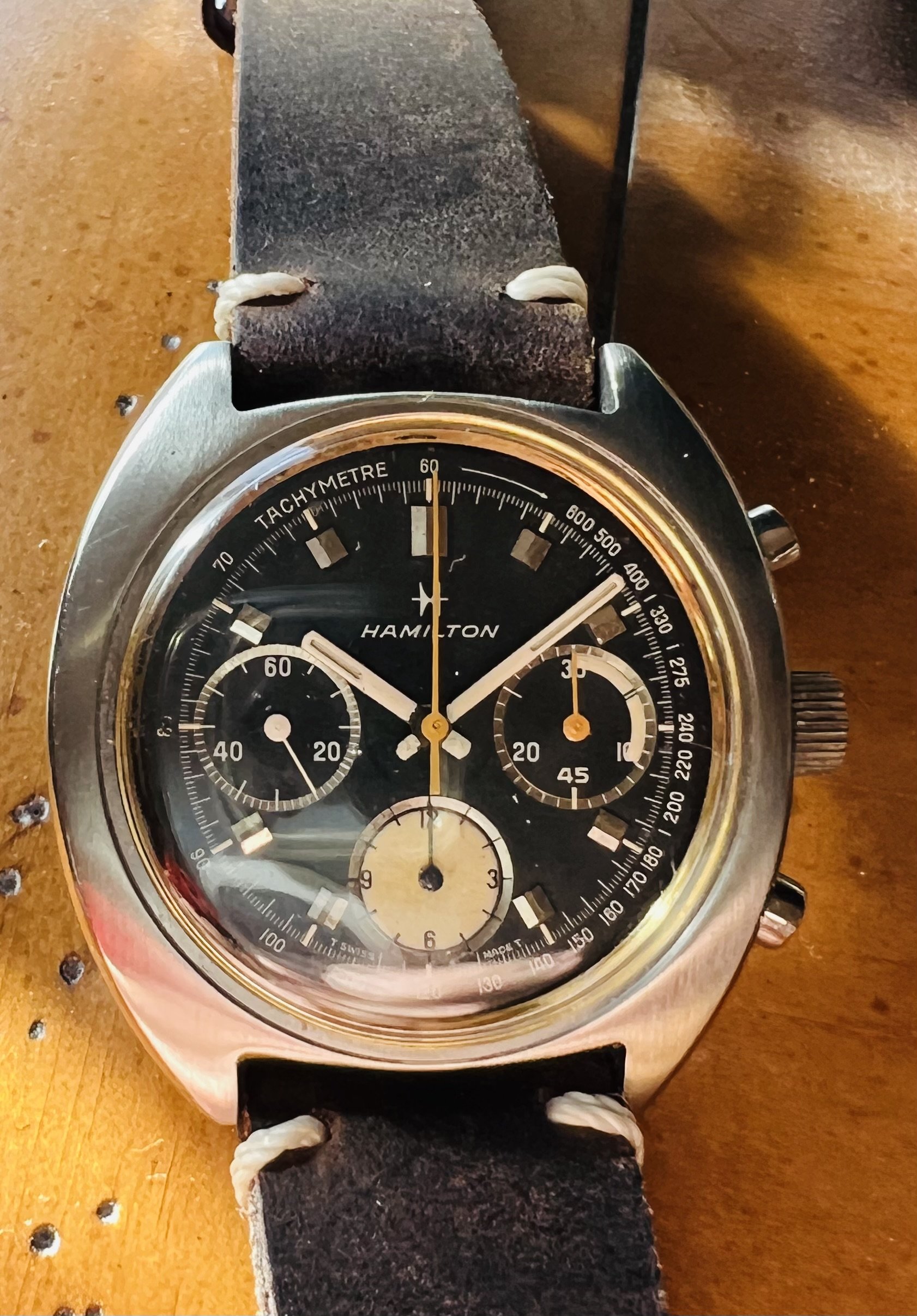·Up for sale is my Hamilton Chronograph G utilizing Hamilton’s calibre 640 based on the Valjoux 7736. The watch hails from the 1970s and it’s my understanding it was only manufactured for 3 years. The dial and hands developed a charming vintage fade that’ll work well with your favorite pair of blue jeans. Although I don’t know the service history, the watch operates without any issues. Selling for a reasonable $1700 and free USPS shipping within the CONUS. International buyers to discuss shipping.