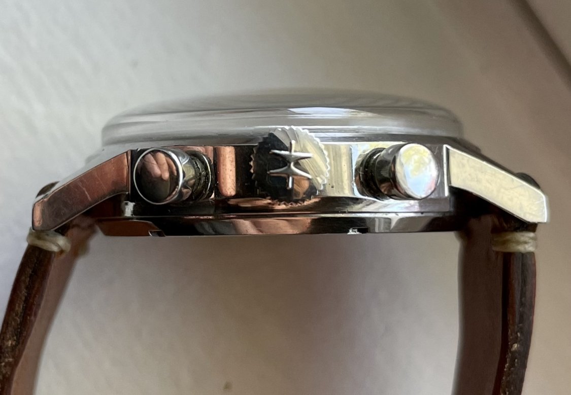The original, unrefinished reverse panda dial has some patina around the edges of the dial. NOS Hamilton chronograph dials pop up on eBay from time to time and swapping in a clean dial would double the value of the watch. Coincidentally, an OF member is selling a NOS reverse panda dial for a ref. 7733 that might be compatible with a ref. 7723.