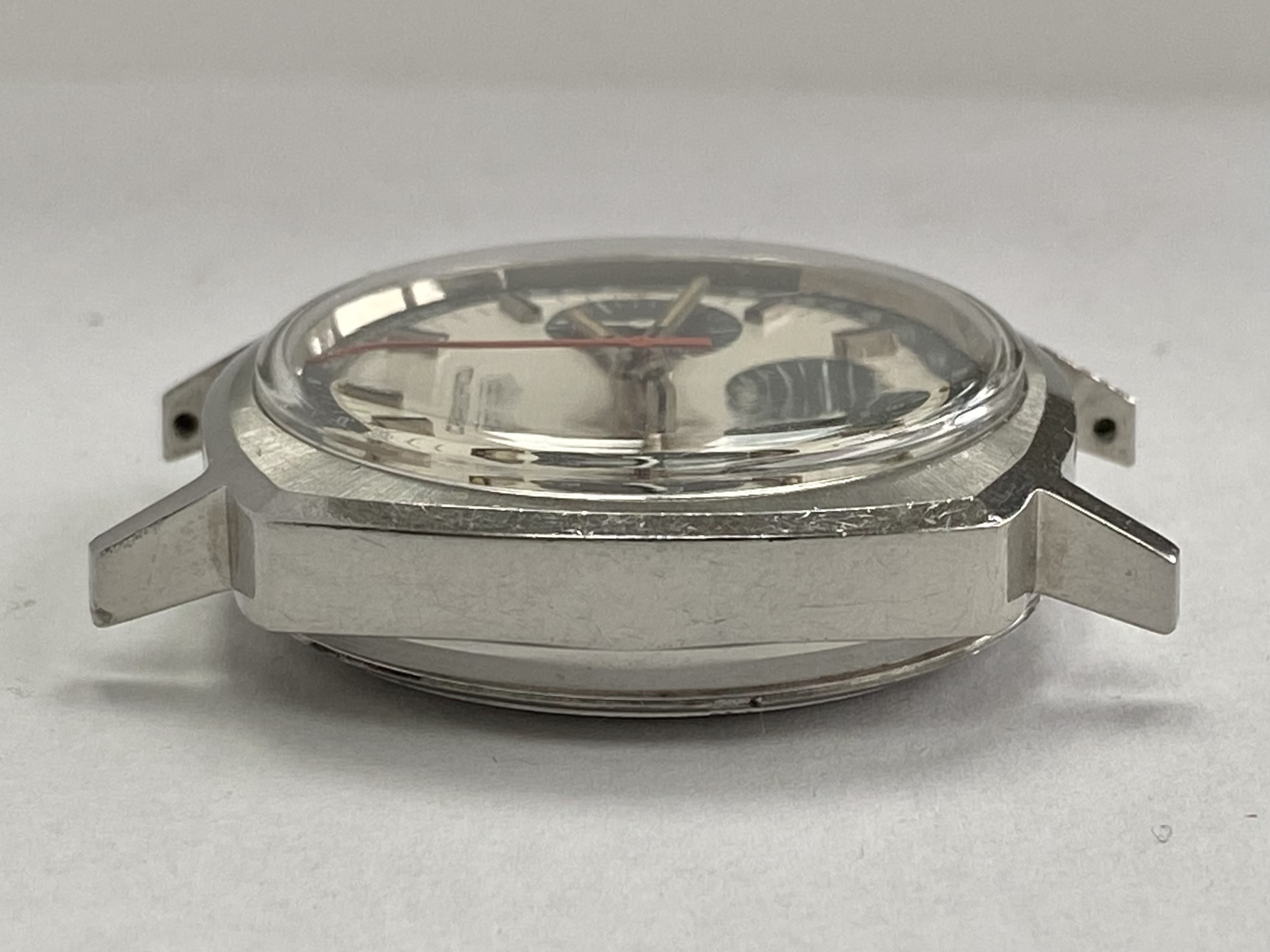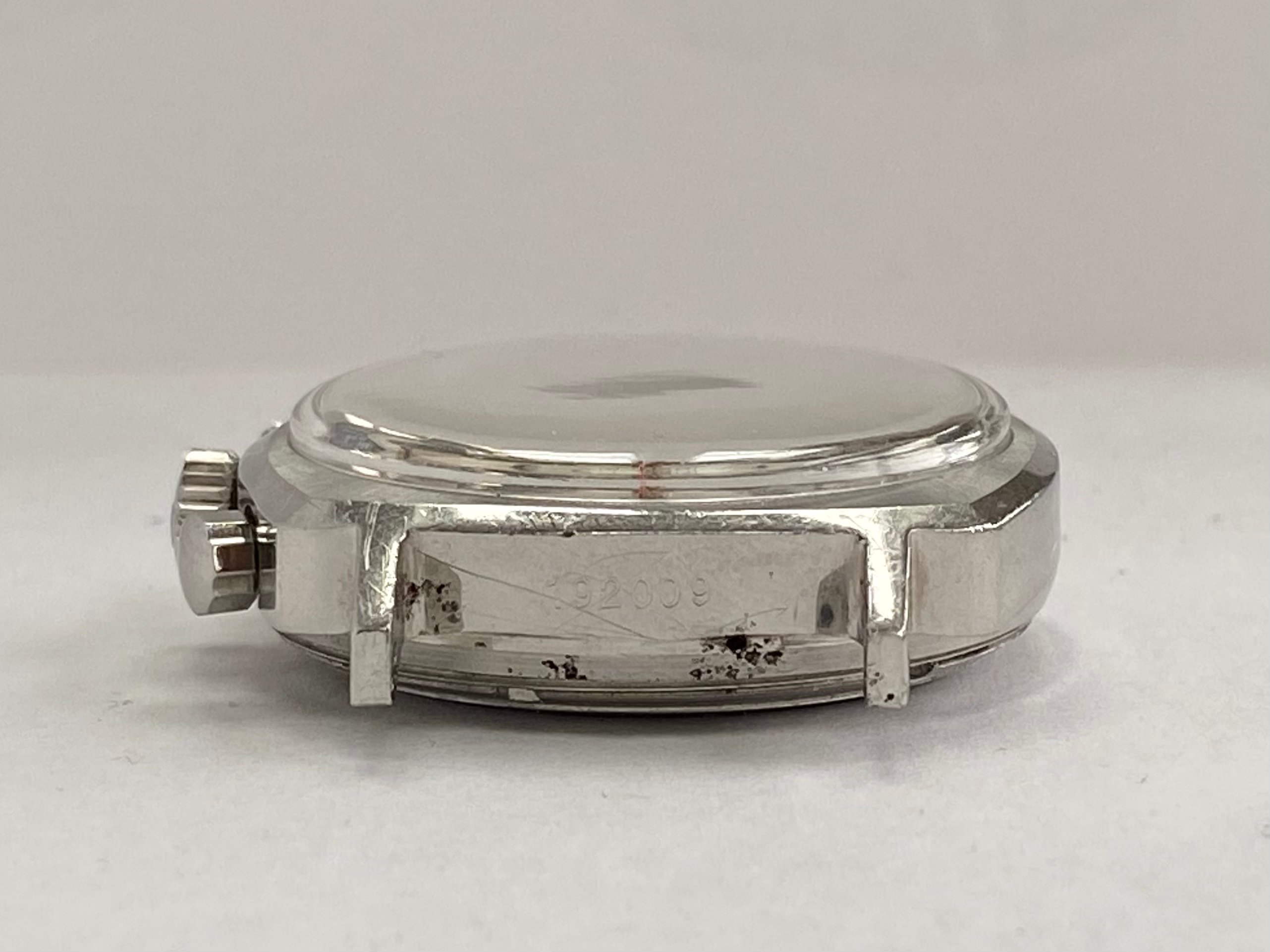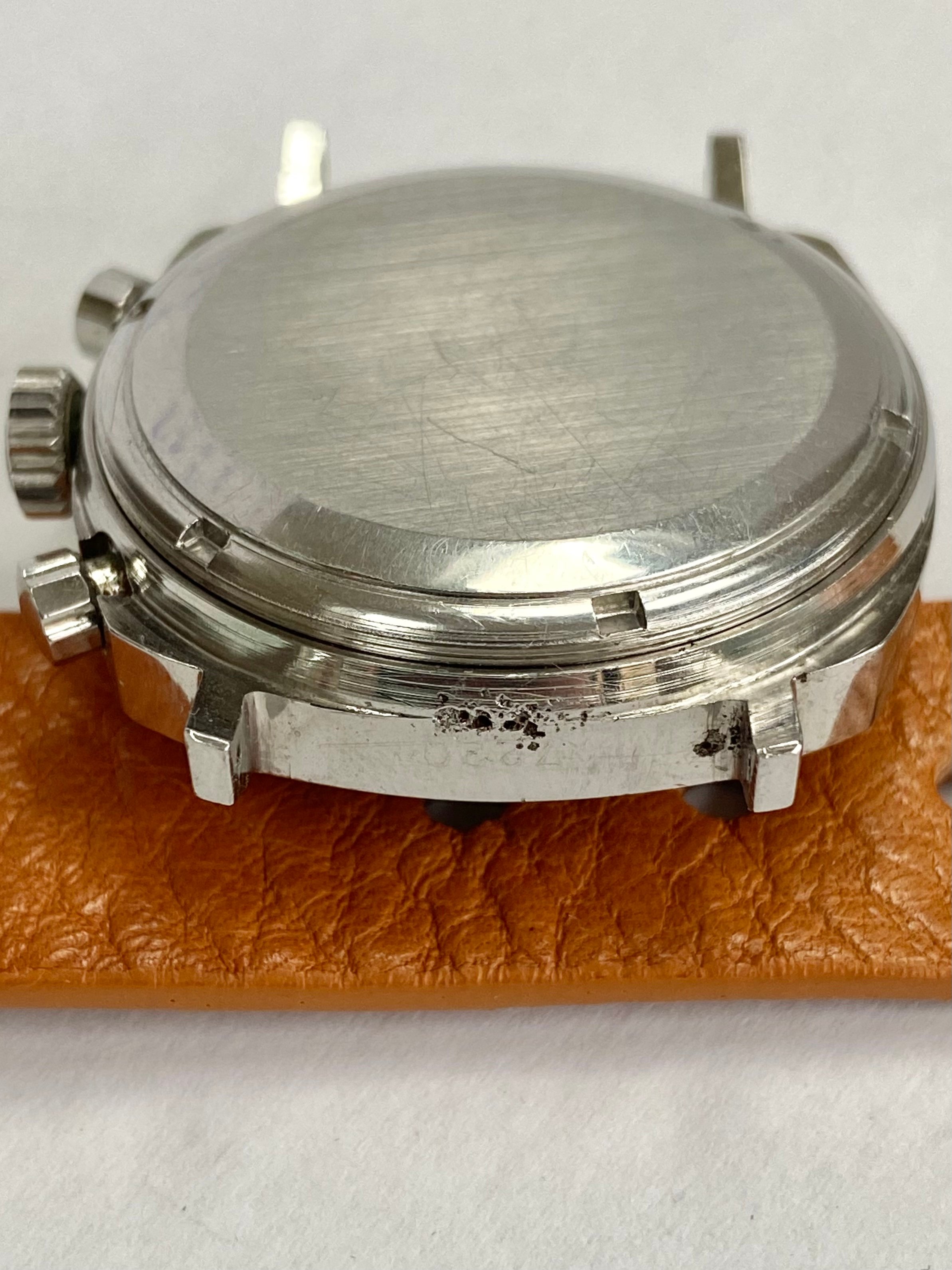 There is some pitting between the lugs. This has been cleaned at service to prevent further deterioration. Does not impact function etc of the watch and isn’t visible when worn. Again, plenty of pictures provided to show the condition.