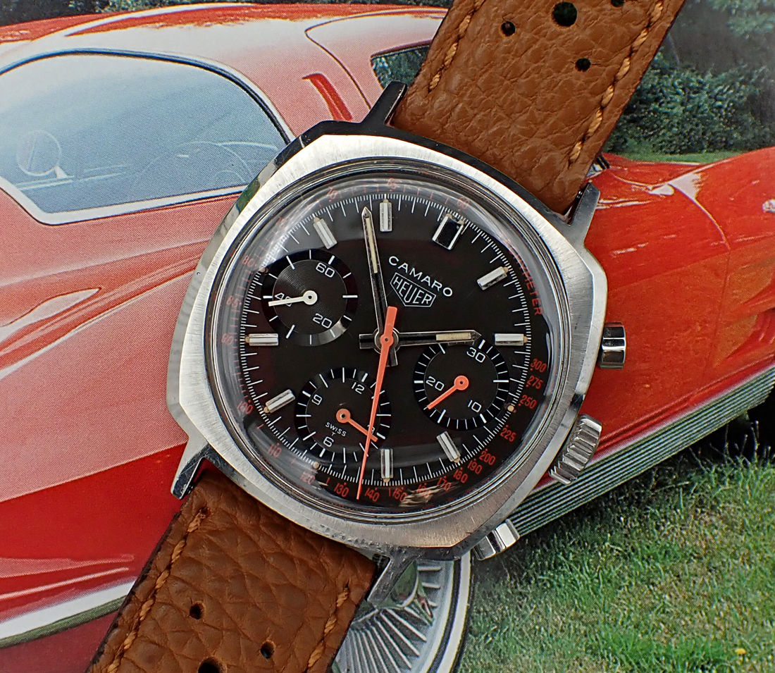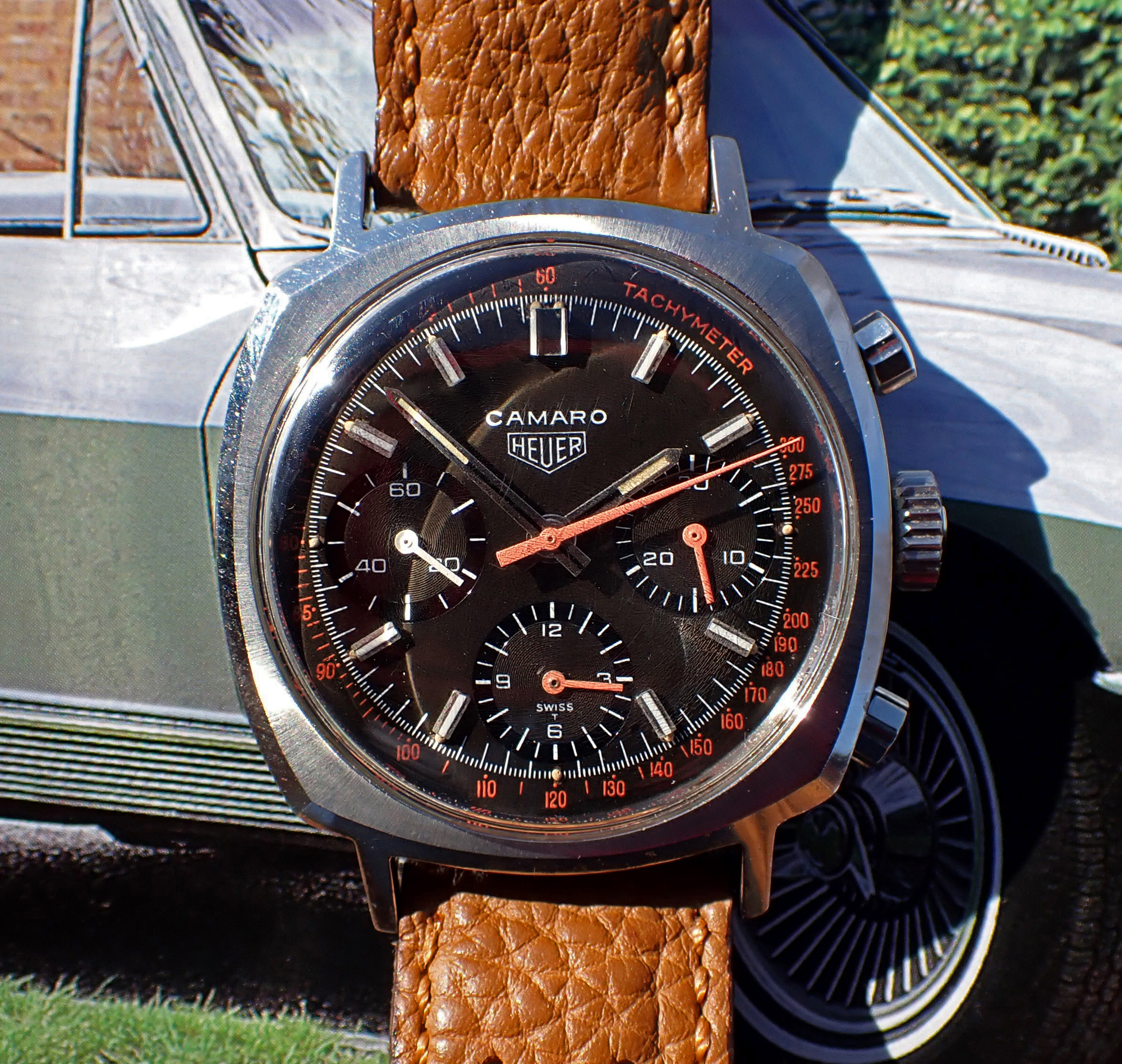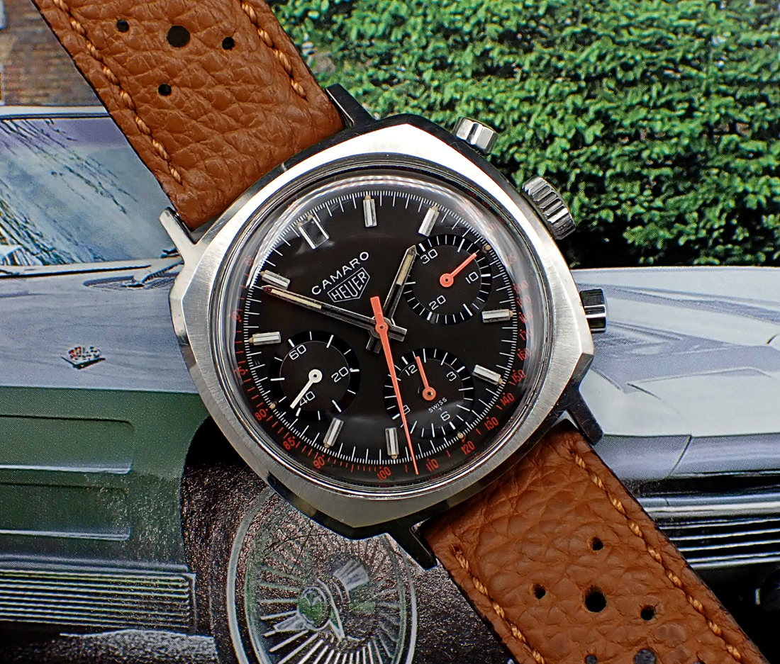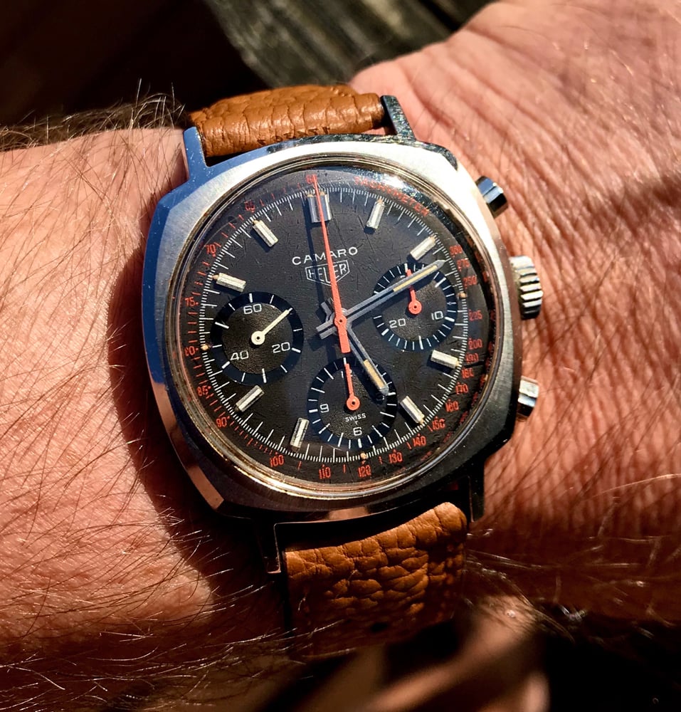This 7220 Camaro, which Heuer heads more knowledgeable than I have dubbed the 7220NT Third Execution Exotic, has the correct 174,xxx case serial number for this specific iteration of brown dial, which was only made for a very short time. I know everyone raves about the Panda versions of Camaros as the ne plus ultra but having owned both, this stunning and uniformly "tropical" brown dial blows them away, IMO (in fact, the dials on these are not actually "tropical" per se, as the consensus opinion of the experts is that these were born brown and I’d have to agree). Personally, I call this one King Camaro and I think when you peruse the pictures in different lighting conditions you’ll see why I do. After all, you find Panda dials on Carreras and Autavias but nothing as unique as this. There is just something so appropriate to the funky Camaro case shape and the late-60s/early-70s ethos that makes a deep brown dial with a red Tachy track and orange chrono hands totally work. And I know the lucky next owner will enjoy the one-of-a-kind style of this cool brown beauty as much as I have.