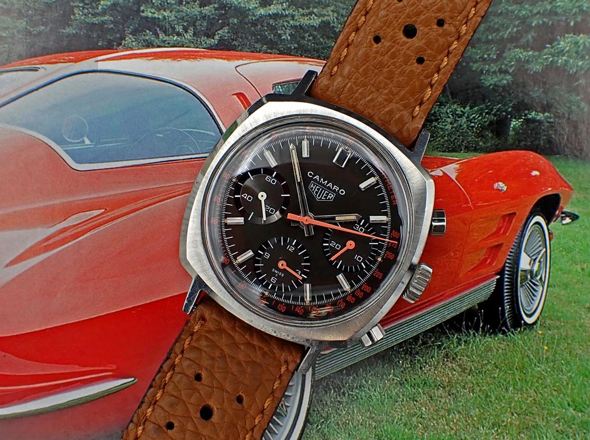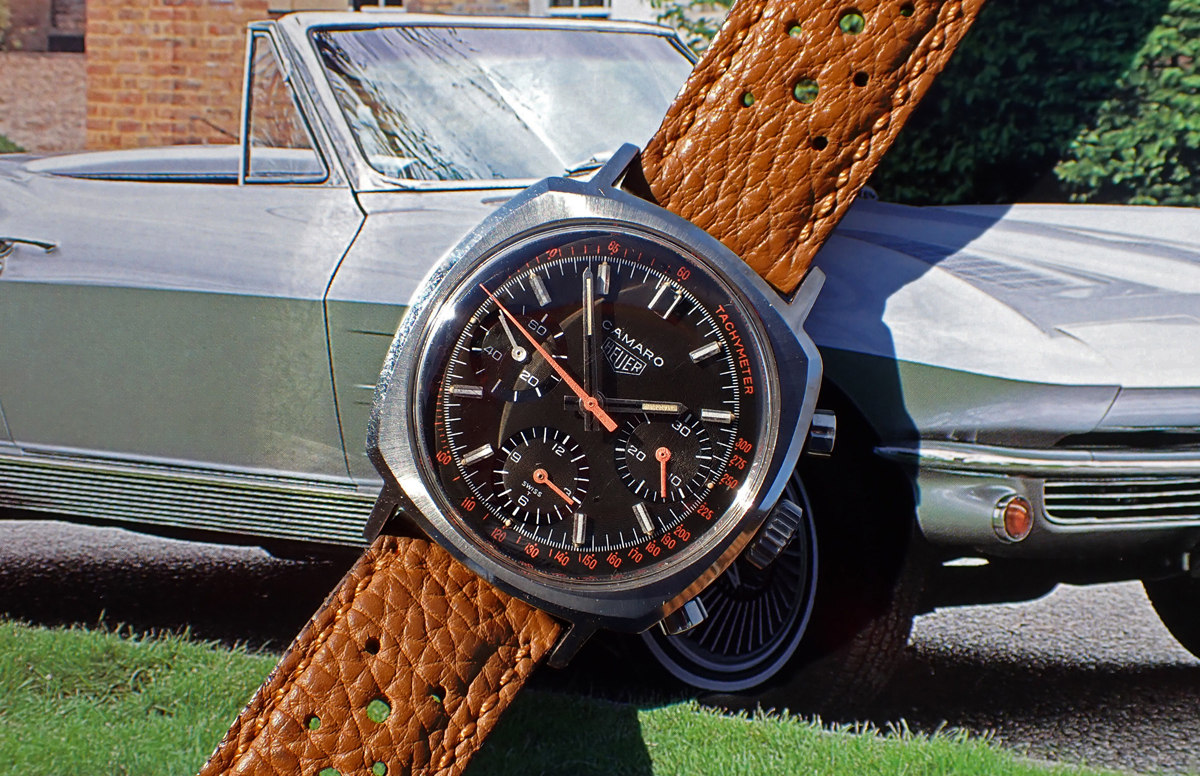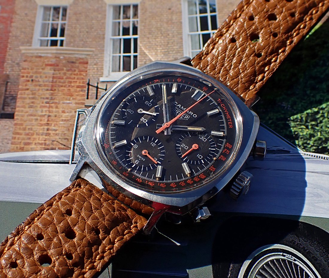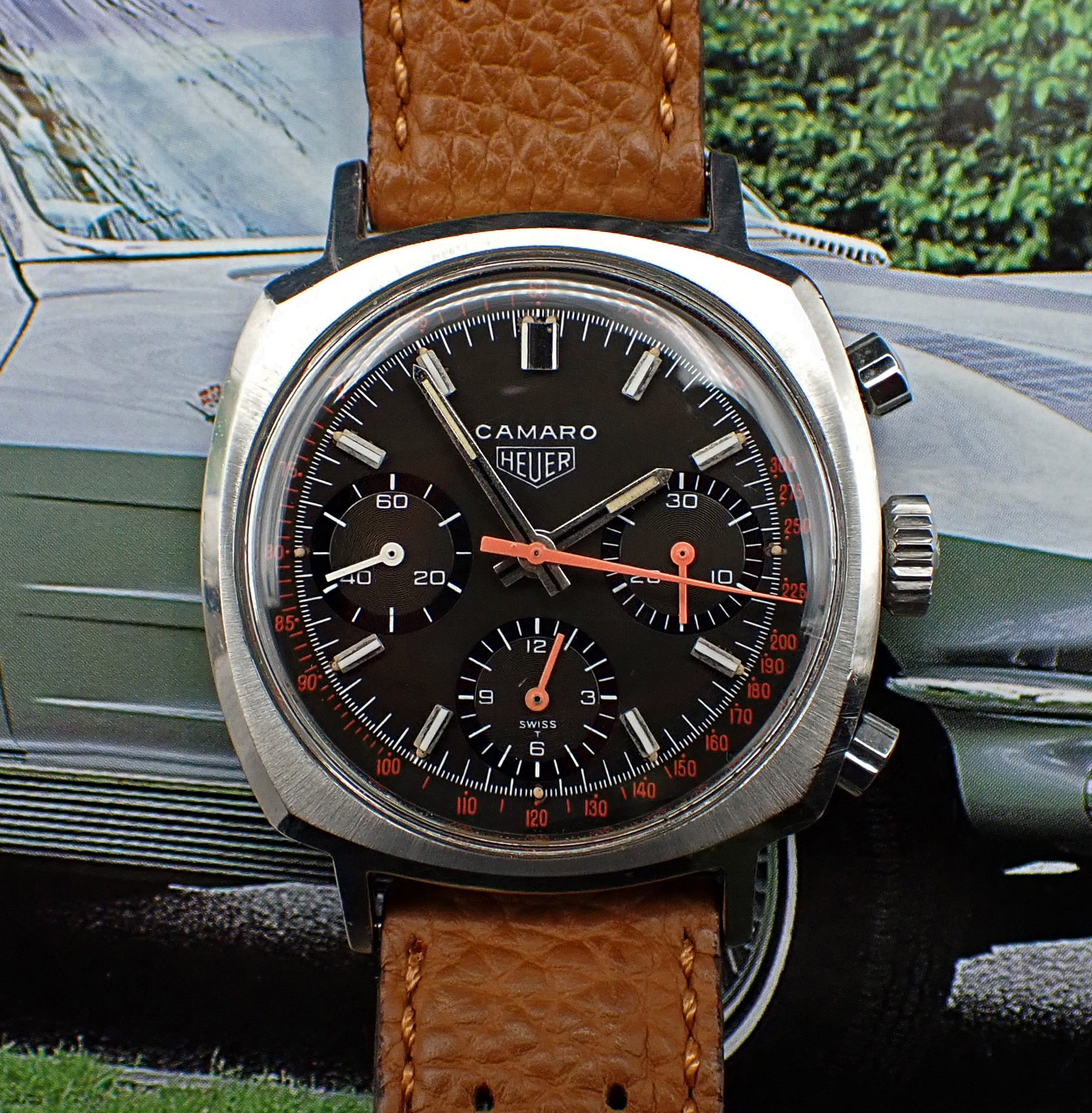 This 7220 Camaro, which Heuer heads more knowledgeable than I have dubbed the 7220NT Third Execution Exotic, has the correct 174,xxx case serial number for this specific iteration of brown dial, which was only made for a very short time. I know everyone raves about the Panda versions of Camaros as the ne plus ultra but having owned both, this stunning and uniformly "tropical" brown dial blows them away, IMO (in fact, the dials on these are not actually "tropical" per se, as the consensus opinion of the experts is that these were born brown and I’d have to agree). Personally, I call this one King Camaro and I think when you peruse the pictures in different lighting conditions you’ll see why I do. After all, you find Panda dials on Carreras and Autavias but nothing as unique as this. There is just something so appropriate to the funky Camaro case shape and the late-60s/early-70s ethos that makes a deep brown dial with a red Tachy track and orange chrono hands totally work. And I know the lucky next owner will enjoy the one-of-a-kind style of this cool brown beauty as much as I have.