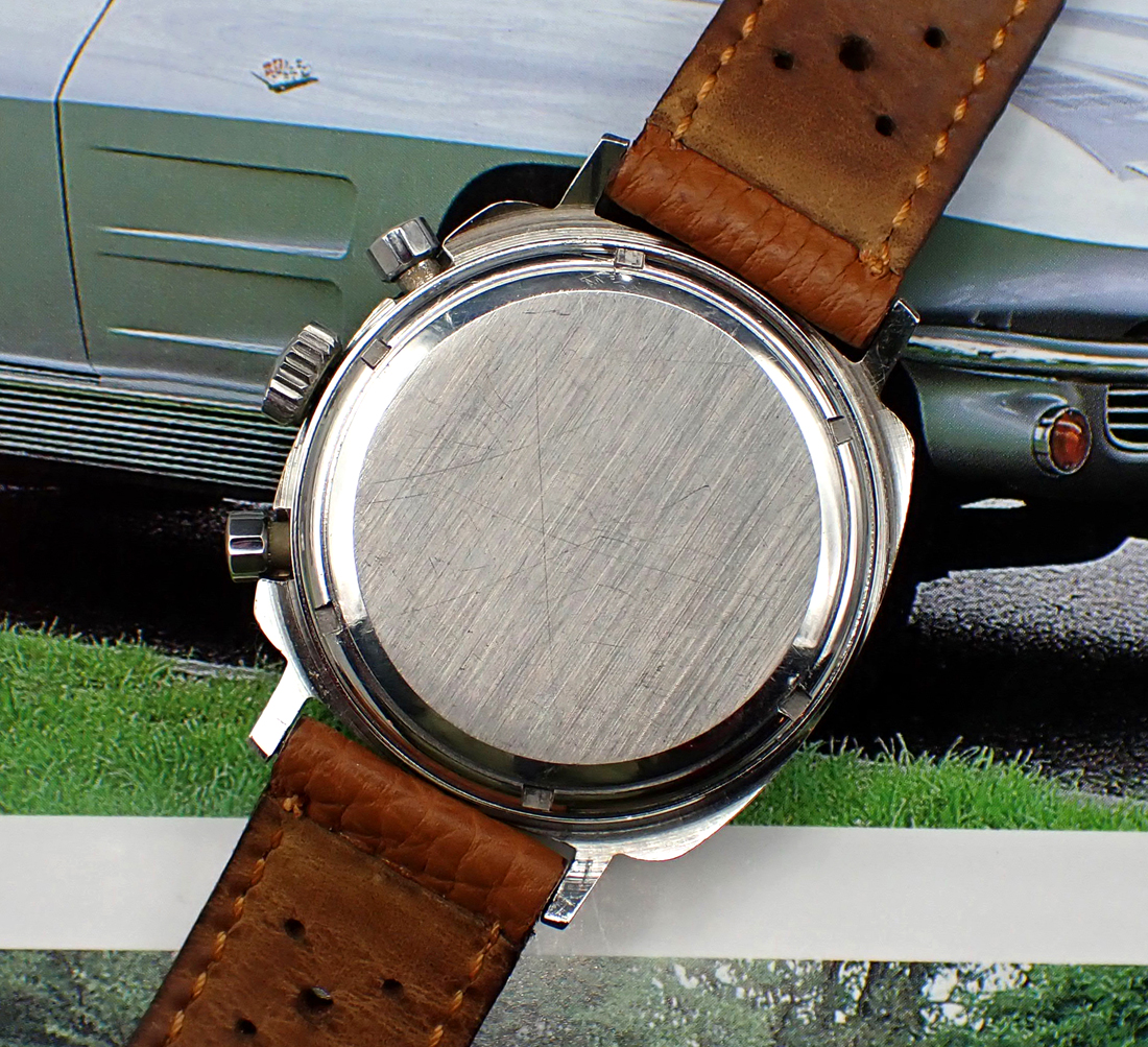 STRAP: This great Camaro comes on a lightly used tan padded leather racing strap with generic steel double-tang buckle (made by Fluco, I believe). I have the exact same strap in darker brown with even less use that I’ll also include in the sale. This watch has a lug width of 19mm.