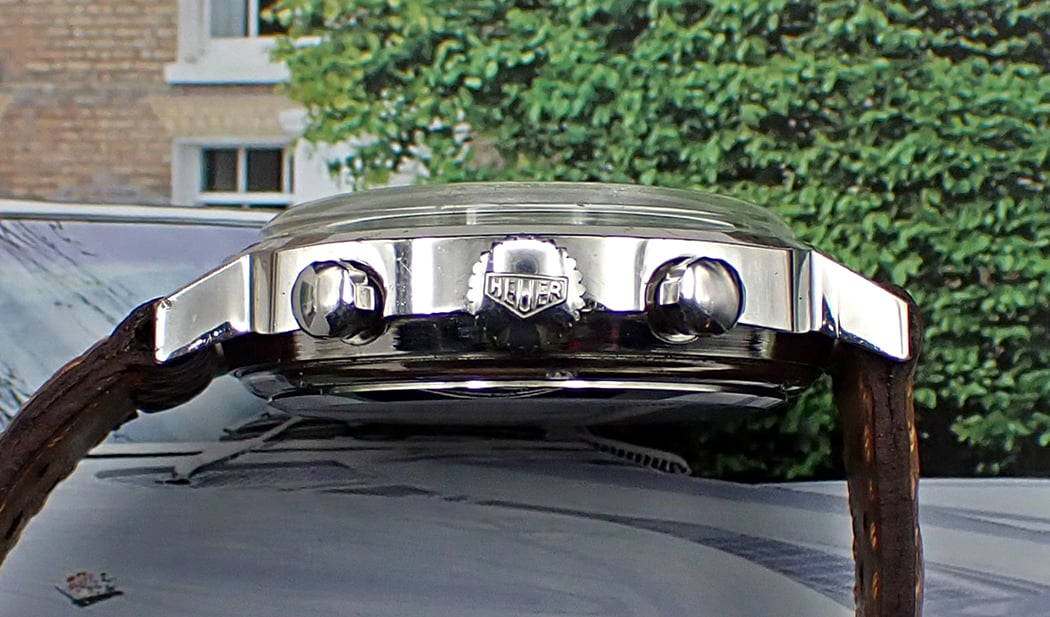 CROWN & PUSHERS: Signed Heuer push-in crown is Excellent cosmetically, as are the correct matching fluted pushers. The winding crown sits tight to the case, winds and pulls out to the time-setting position as it should. The top pusher stops and starts the chronograph and the bottom pusher crisply resets all chrono registers precisely to zero as designed.