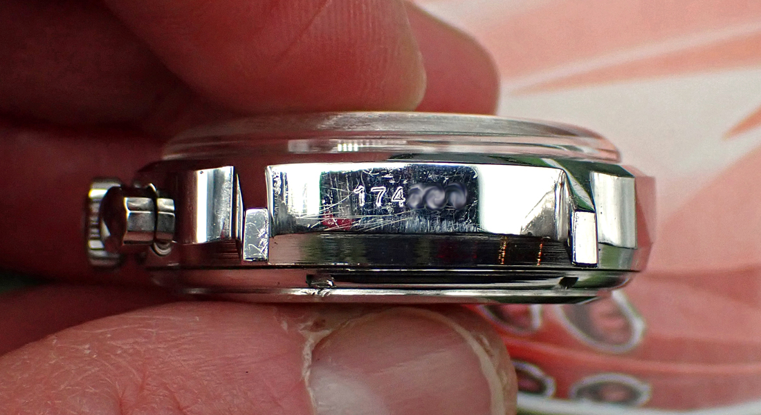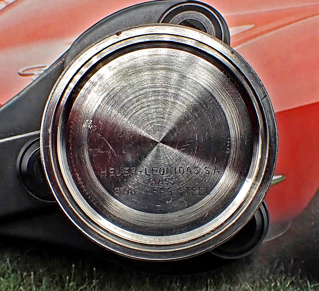 CASE & BACK: All-stainless steel two-piece screw-back, cushion-shaped case (somewhat like a larger version of the venerable Rolex "Army") with sunburst-brushed top and polished chamfers & sides measures 37mm wide (not including crown) x 45mm lug tip to lug tip. The case appears to me to be unpolished with the desirable sunburst finish on top still intact and all edges sharp. The watch has certainly been worn and there are some minor scuffs, light scratches and nicks but it still is in Excellent vintage condition for a more than 50-year-old wristwatch. The stepped, notched screw-in caseback also appears unpolished and shows its original vertical milling. It is clean and dedication-free with only some superficial scratches - likewise Excellent condition. The caseback screws down smoothly and tightly. In looking at the inner back closely I’m only able to discern my watchmaker’s service marks, so he may actually have been the first to work on the movement. It is, of course, signed with the correct minimalist Heuer-Leonidas nomenclature of the period. The full 174,xxx serial number, appropriate for the extremely limited production of this exact dial/hands layout, and correct 7220 model number are both fully legible between their respective lugs.
