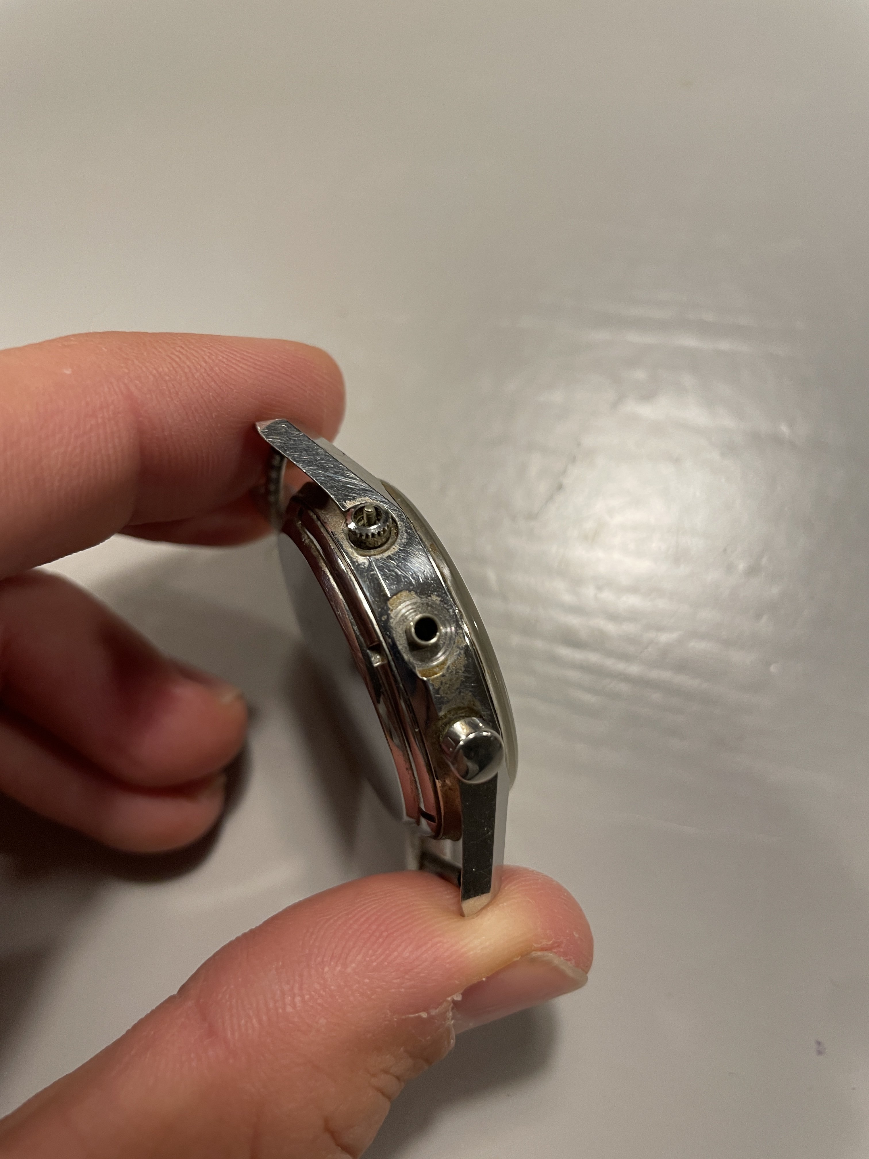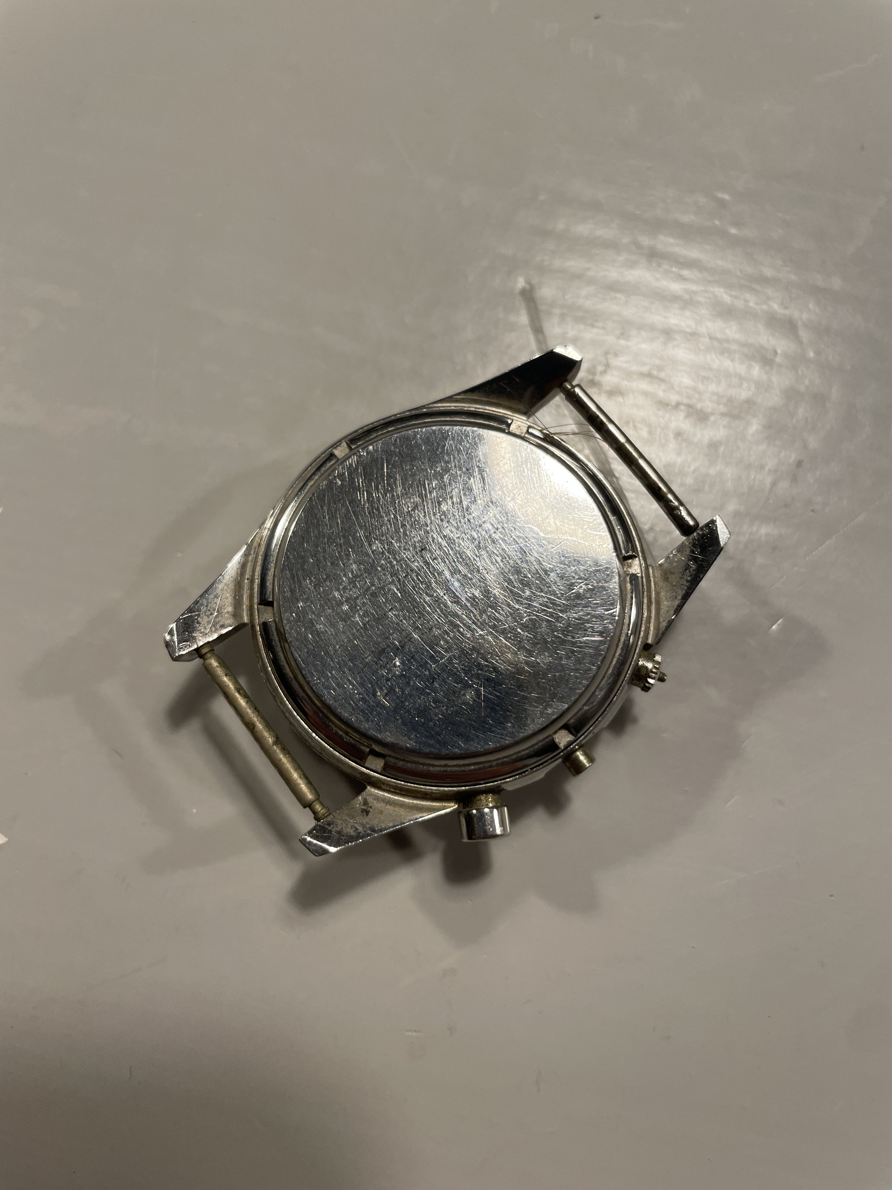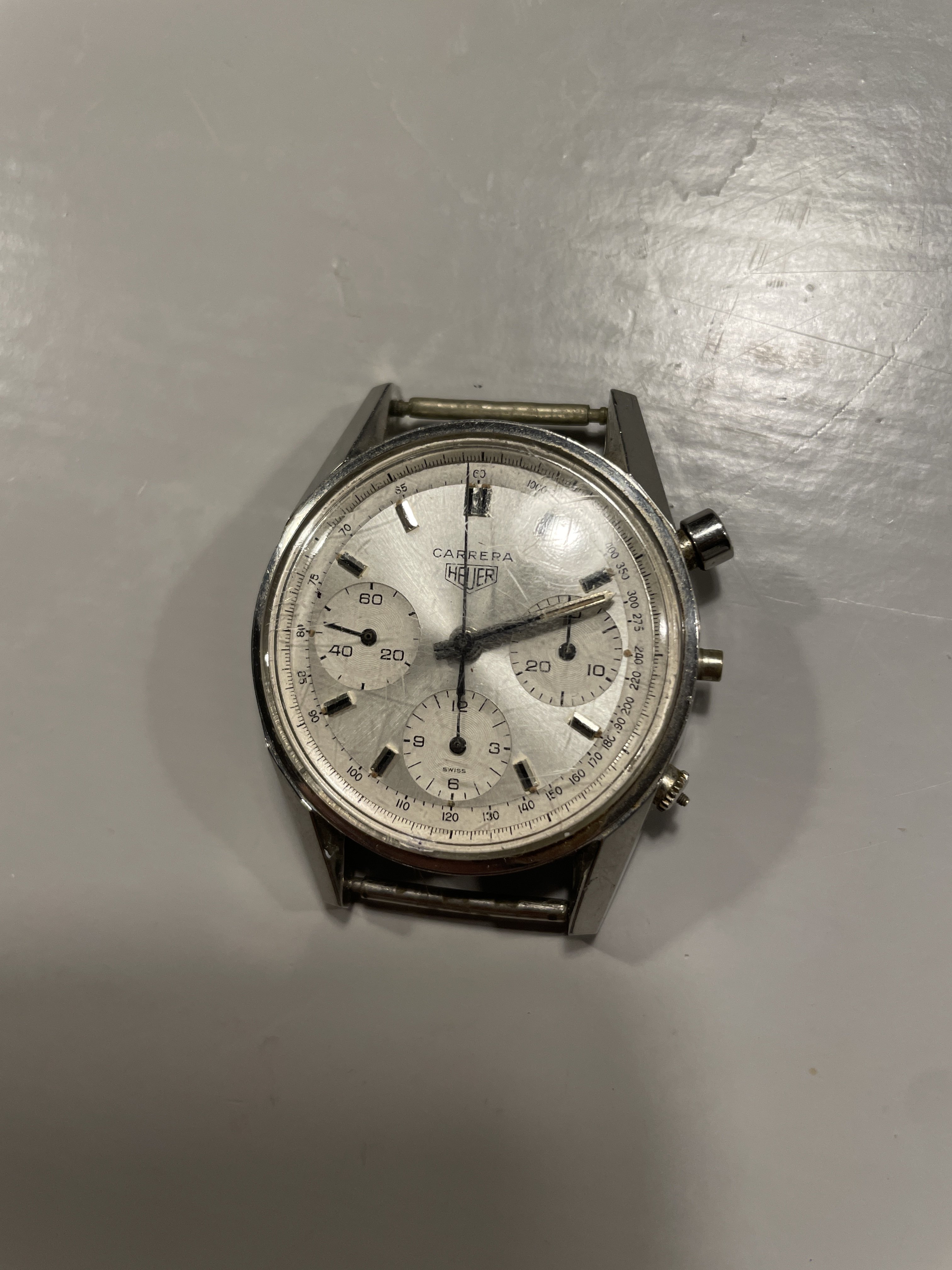 Today I received a recently purchased project Heuer Carrera reference 2447. When I shake the watch the seconds hand moves, that’s good news. And underneath the scratched up crystal there is a very nice dial hiding. Only thing, it is missing the crown and one pusher. Anyone knows where and how I can find original ones for them? Was this crown originally signed or unsigned? Thanks in advance.