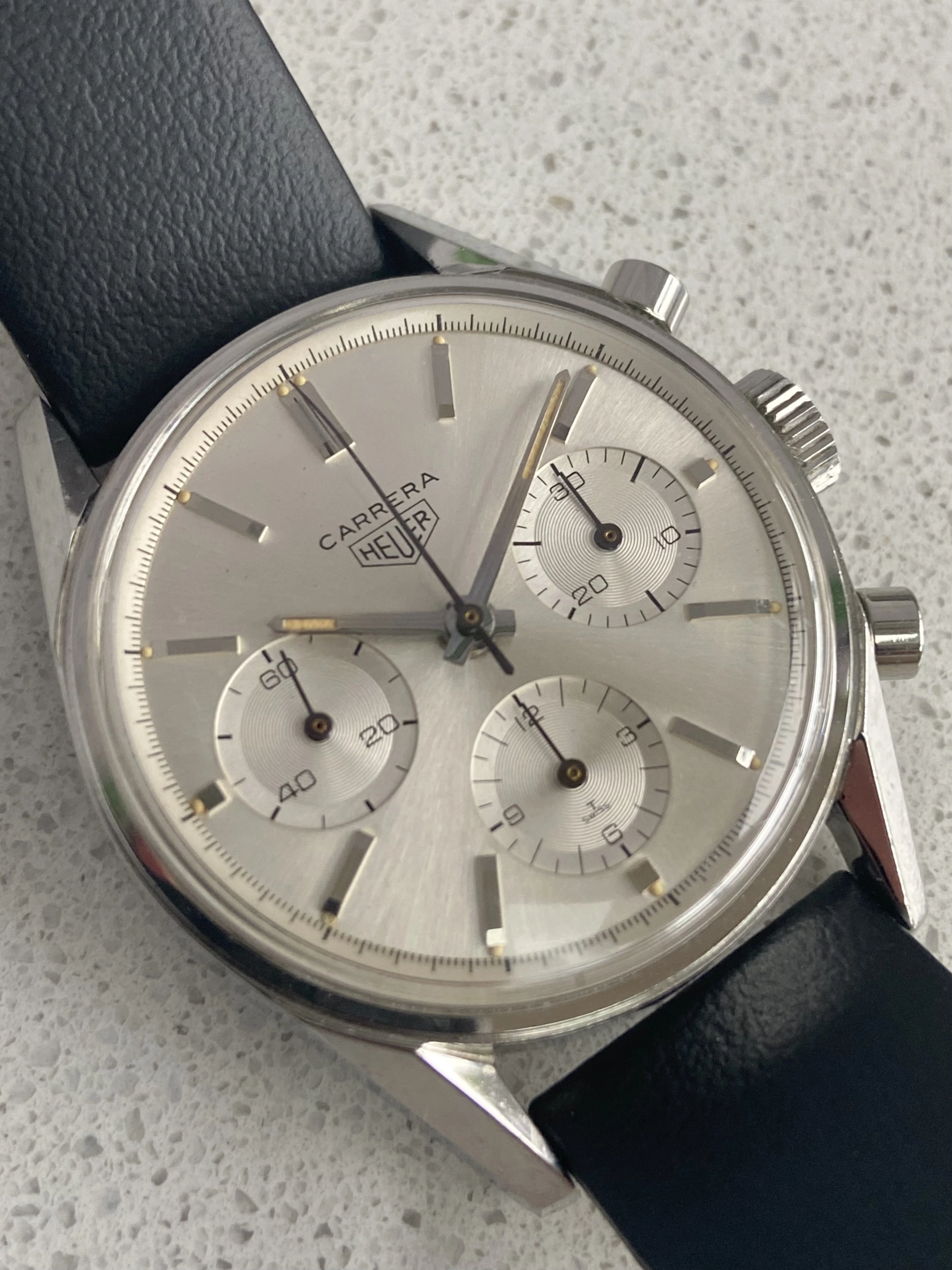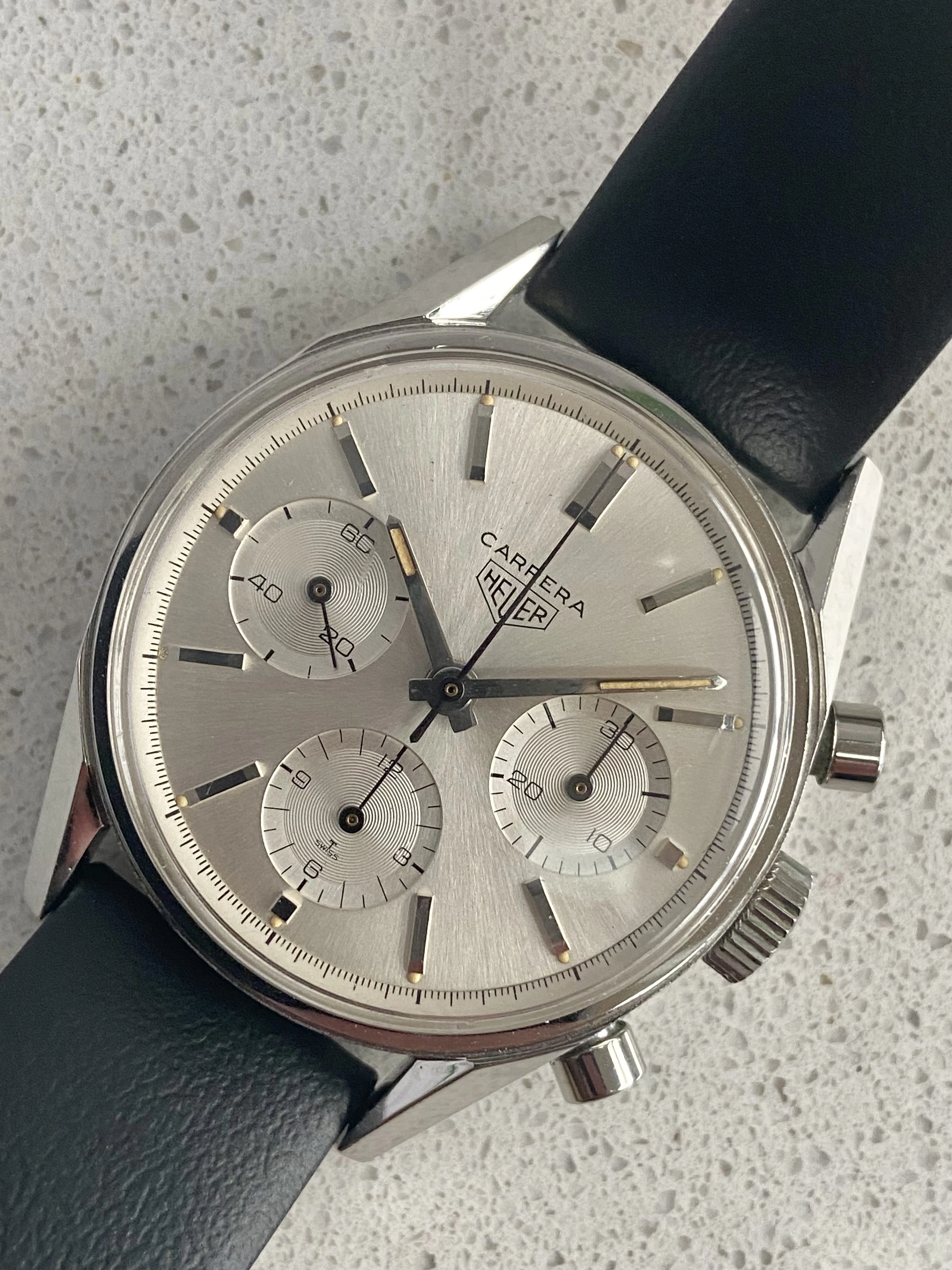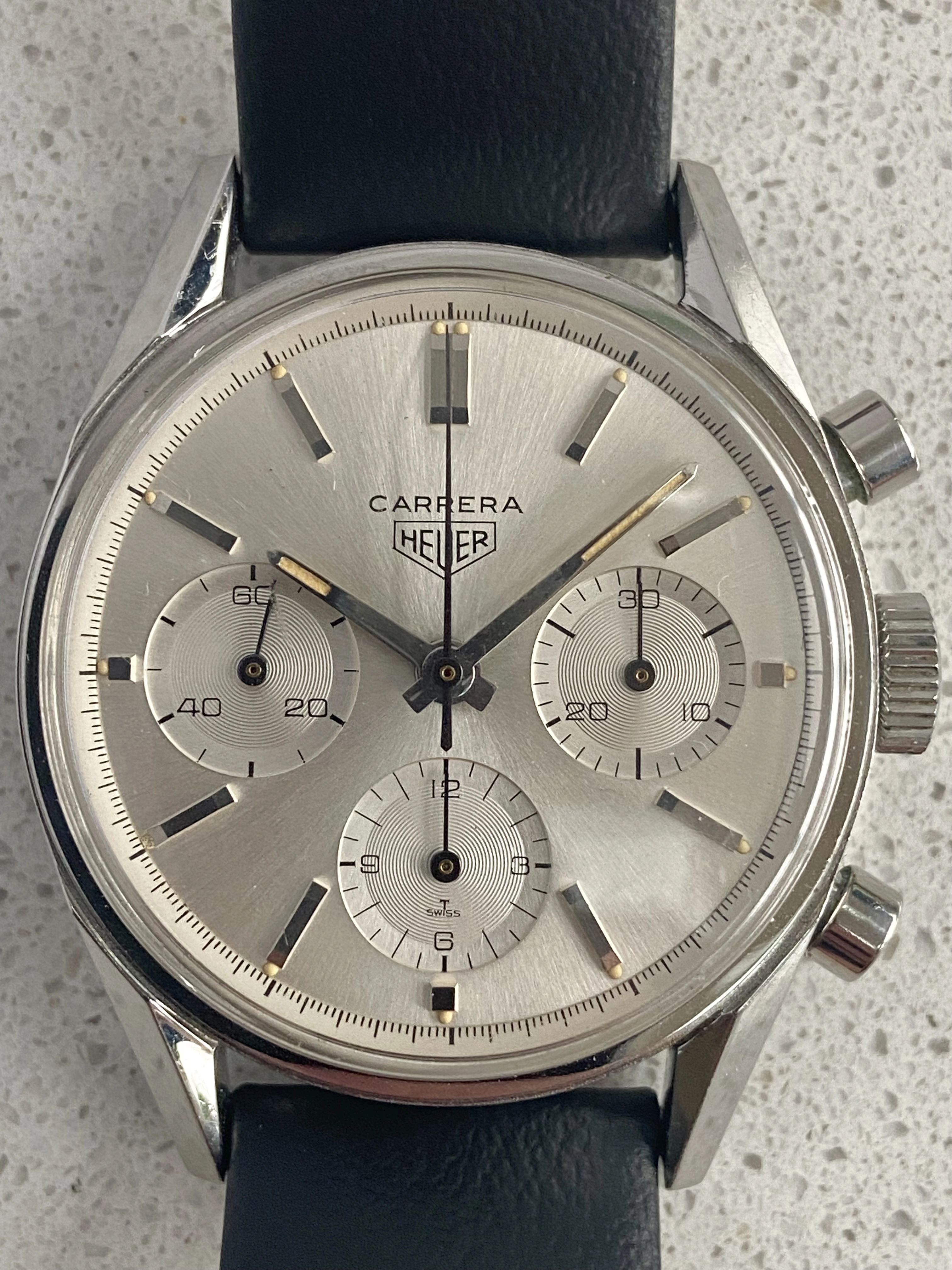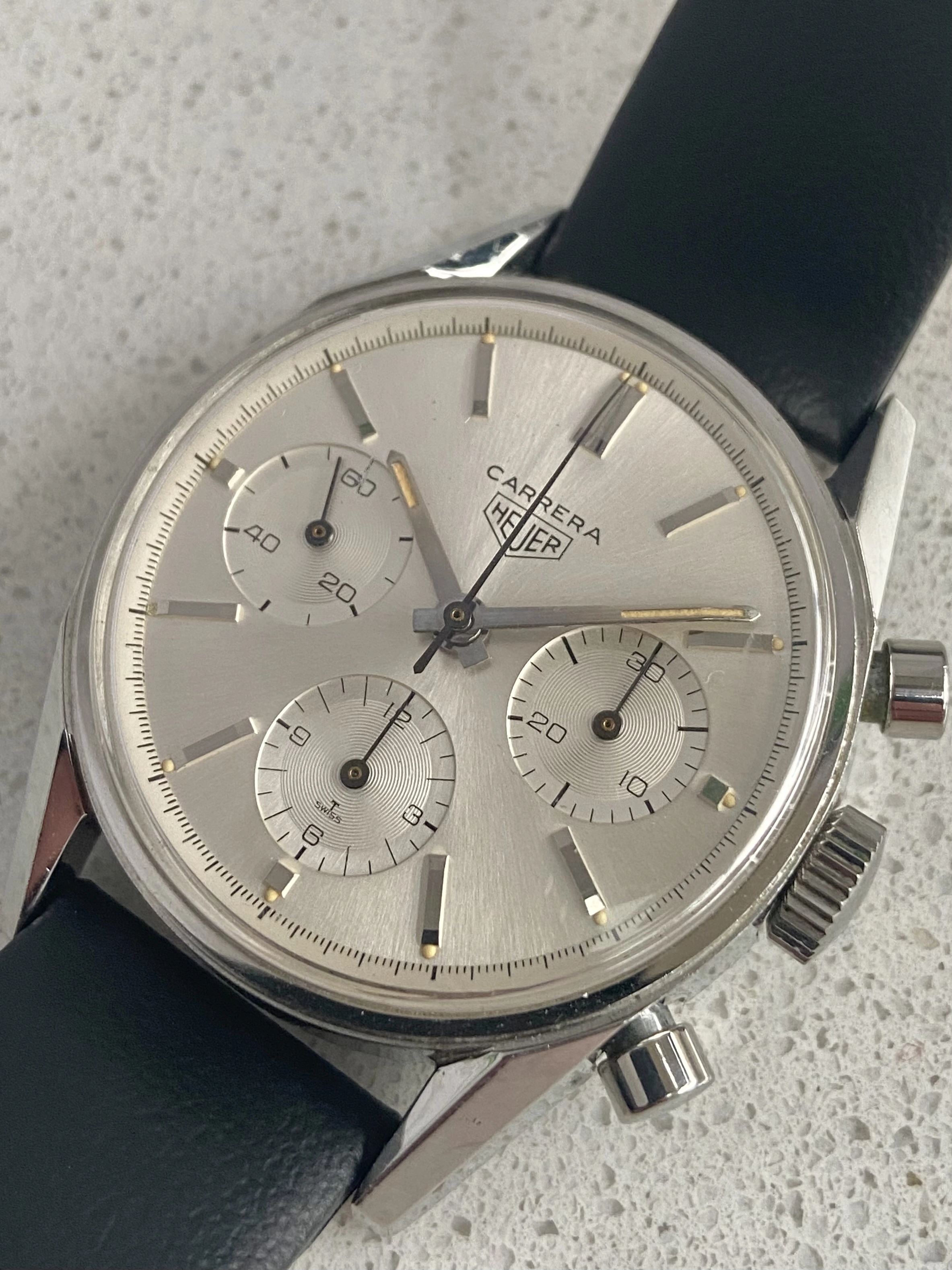 Utterly wonderful silver sunburst dial in excellent condition, factory original, not restored, refinished or relumed. Until the early 6xxxx serials, the first Carreras had eggshell white dials, before moving to the silver sunburst dials from the mid 60’s. This is one of the earliest silver sunburst dials.