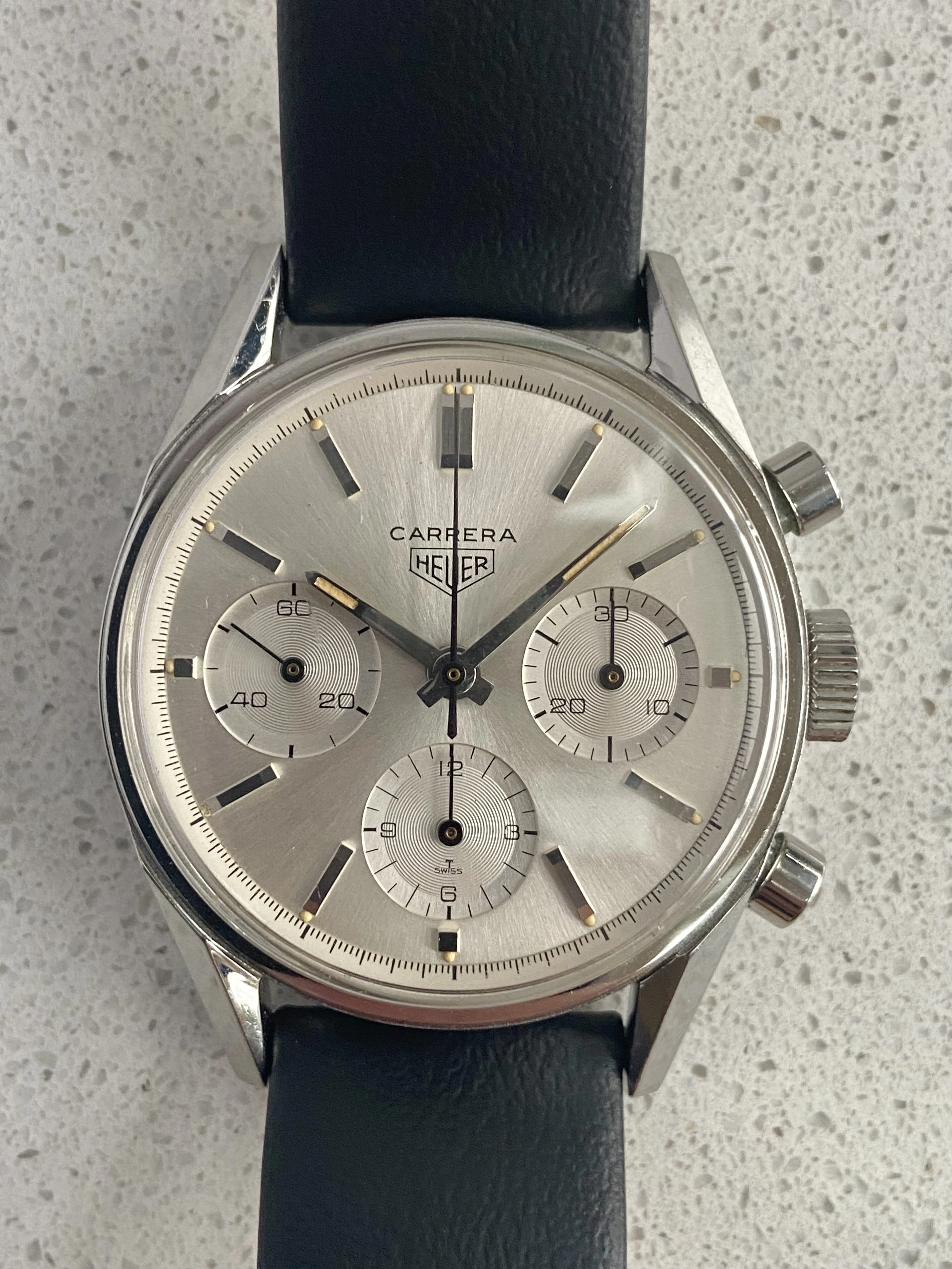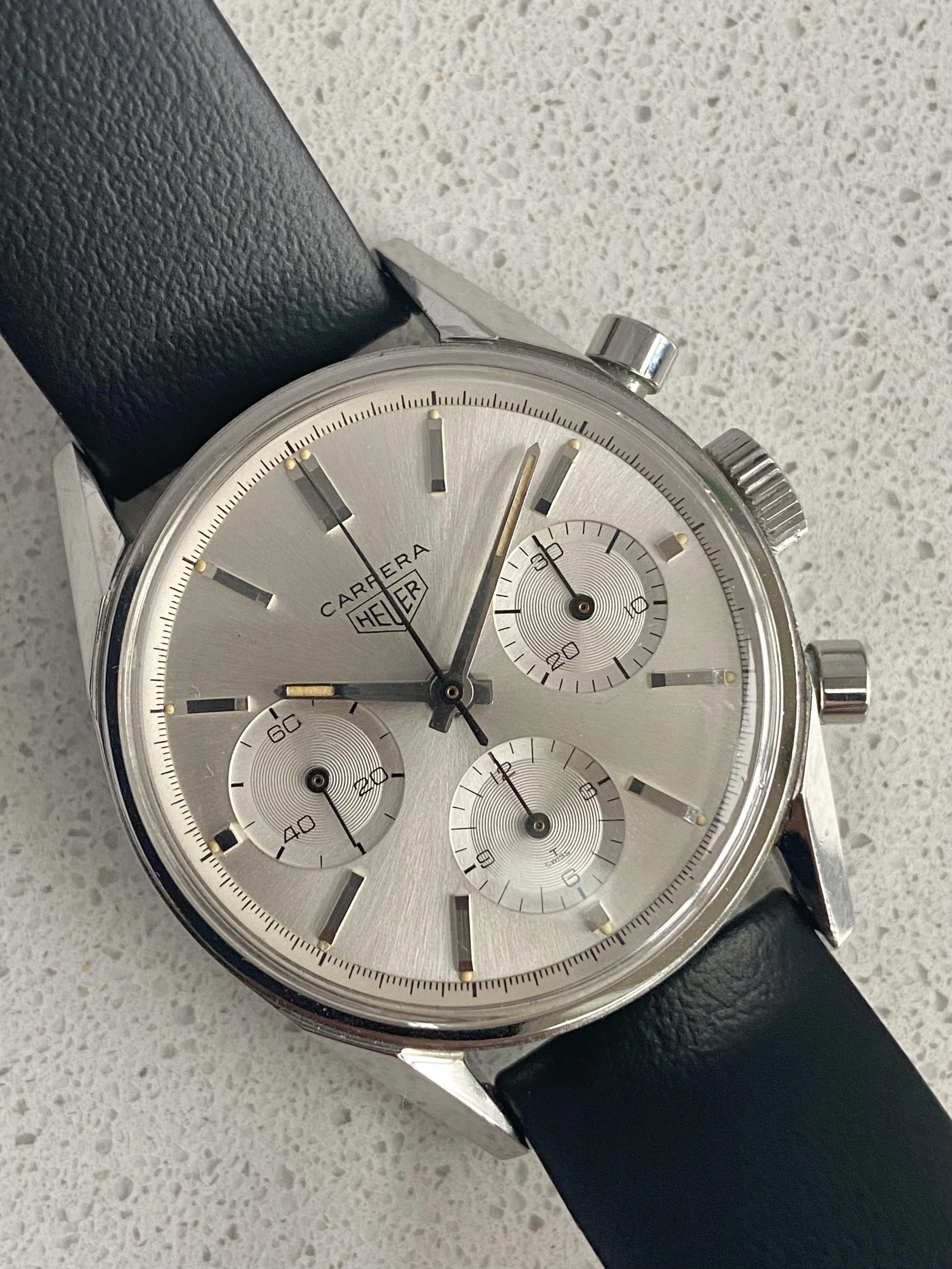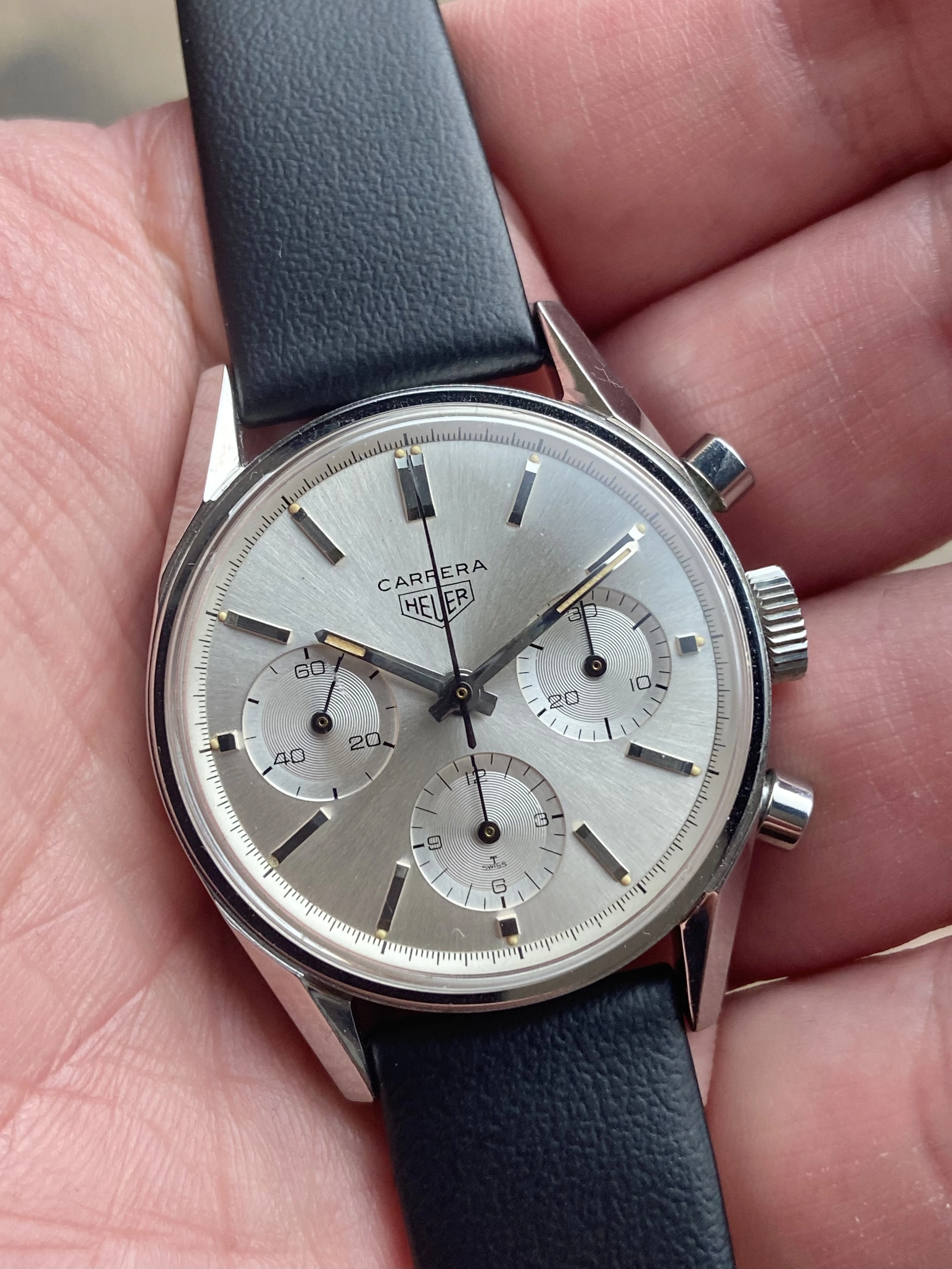 Utterly wonderful silver sunburst dial in excellent condition, factory original, not restored, refinished or relumed. Until the early 6xxxx serials, the first Carreras had eggshell white dials, before moving to the silver sunburst dials from the mid 60’s. This is one of the earliest silver sunburst dials.