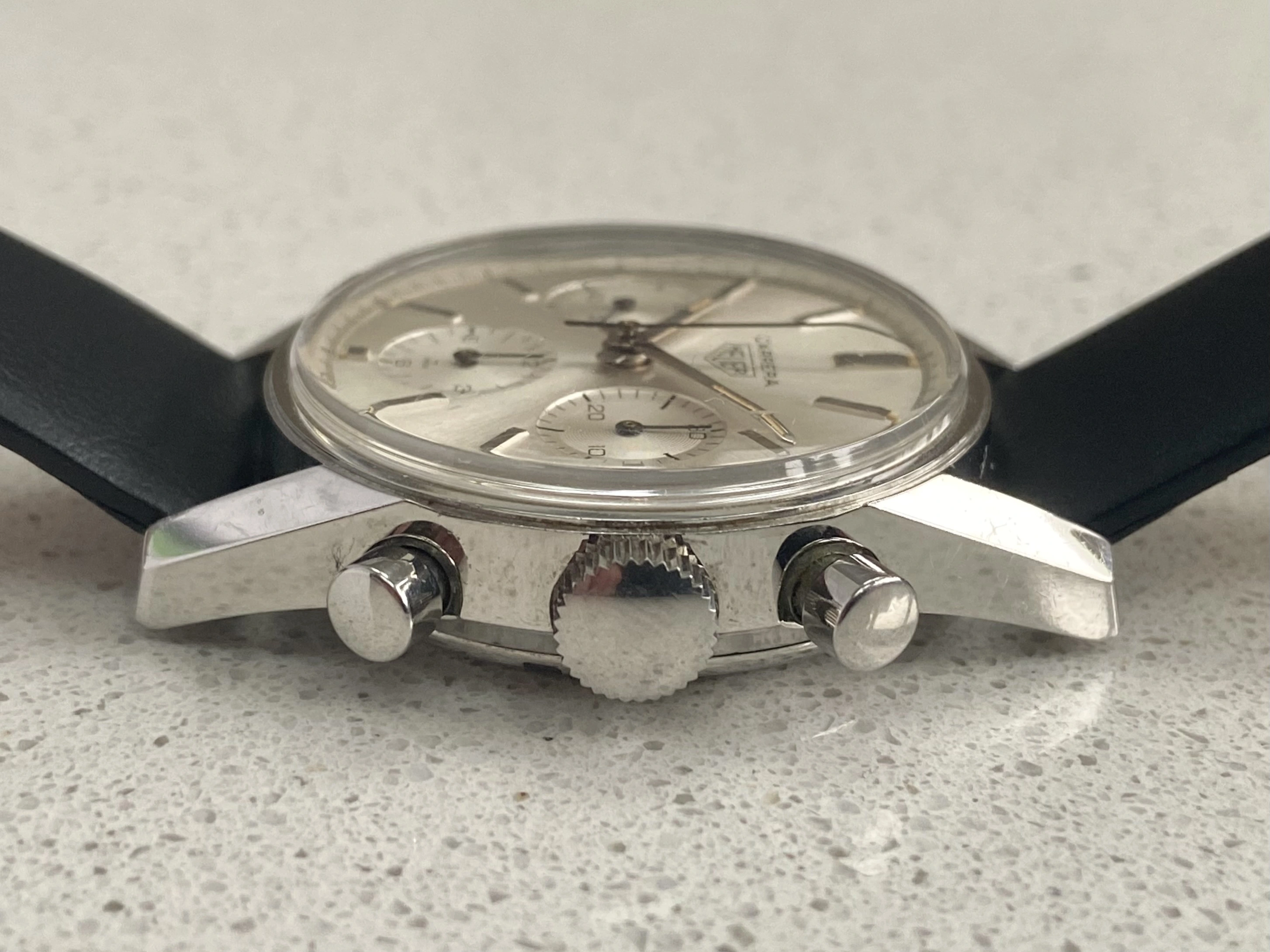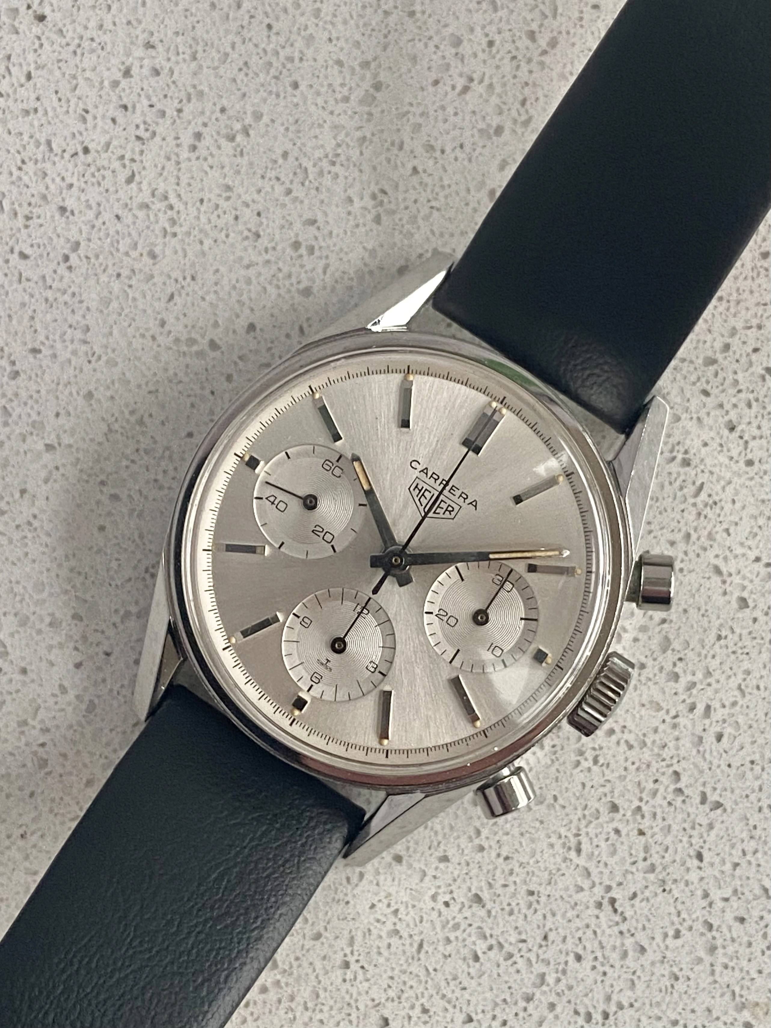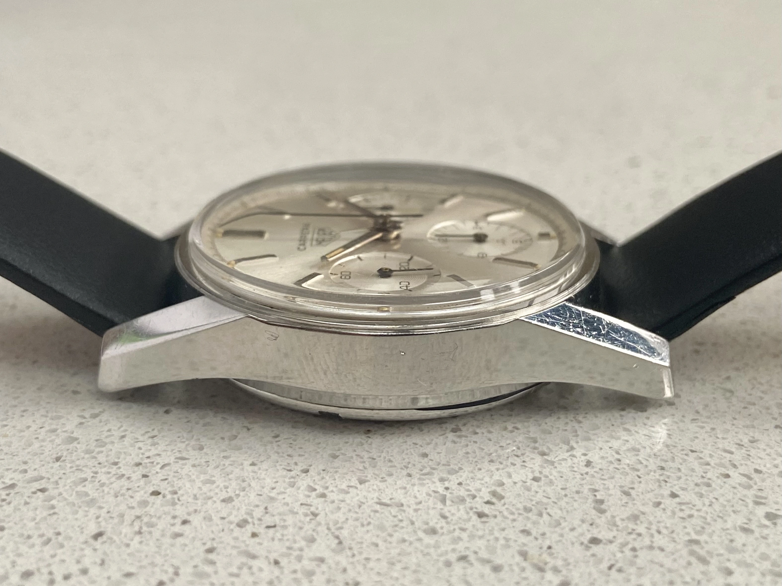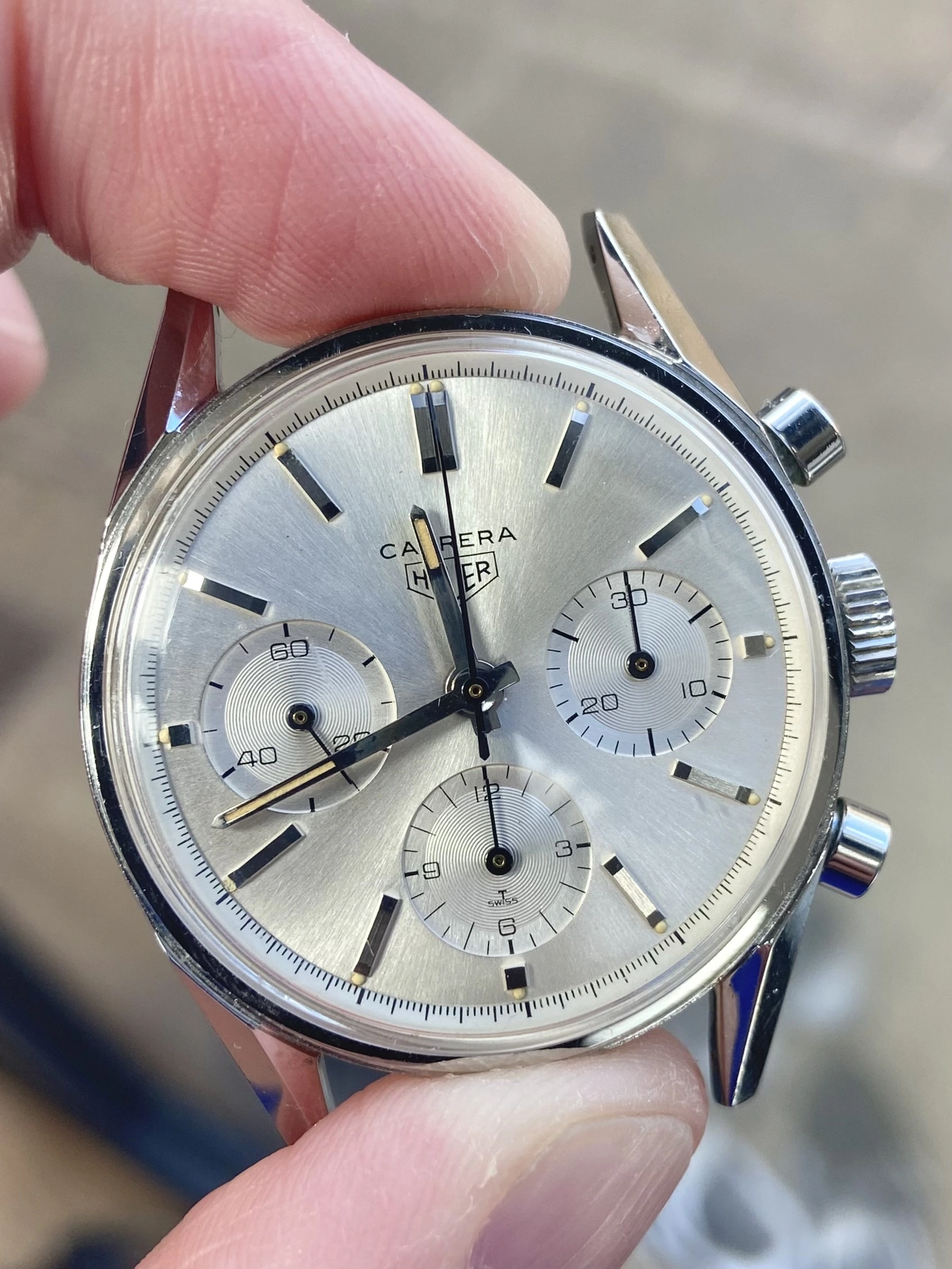 Utterly wonderful silver sunburst dial in excellent condition, factory original, not restored, refinished or relumed. Until the early 6xxxx serials, the first Carreras had eggshell white dials, before moving to the silver sunburst dials from the mid 60’s. This is one of the earliest silver sunburst dials.