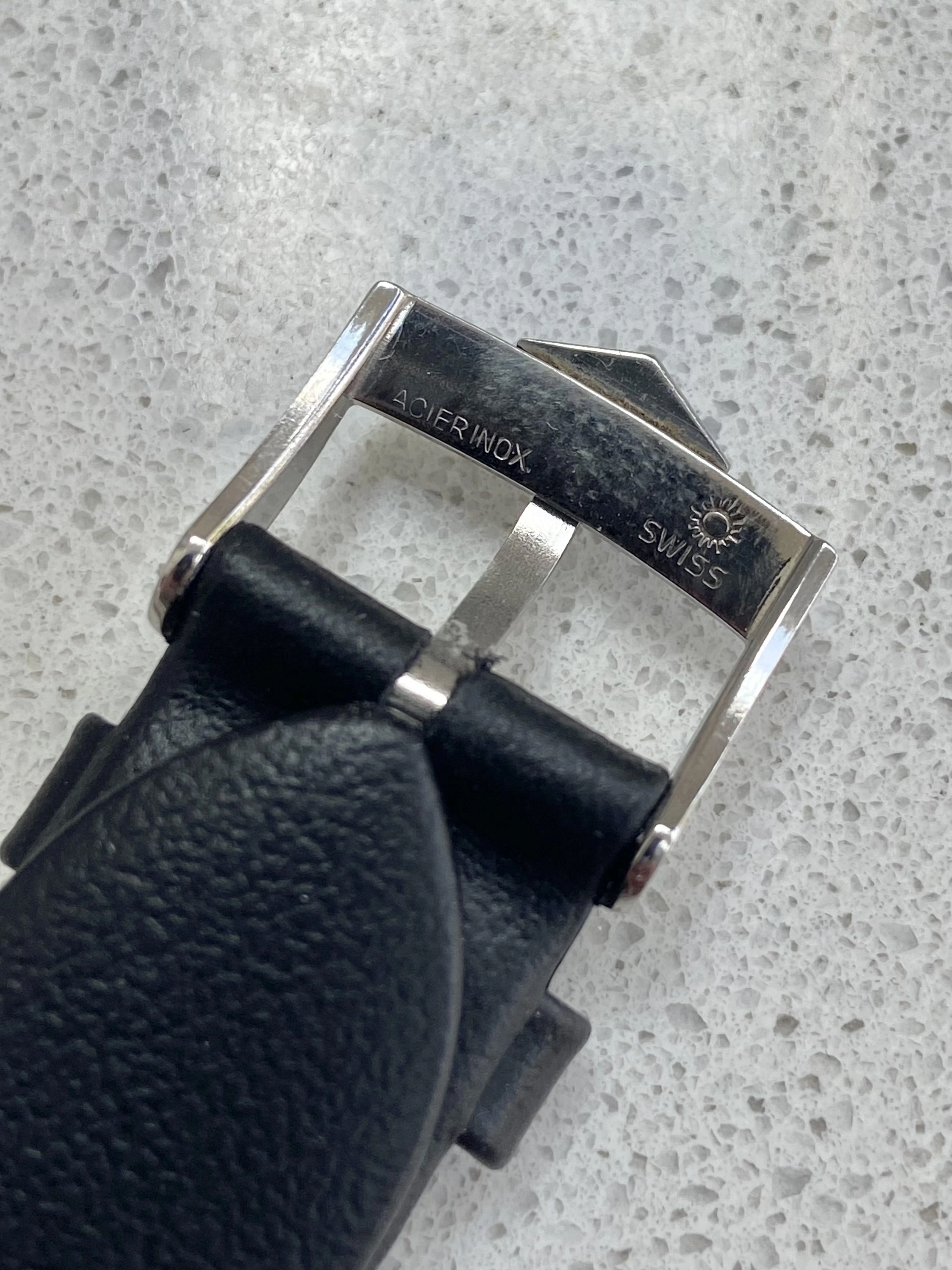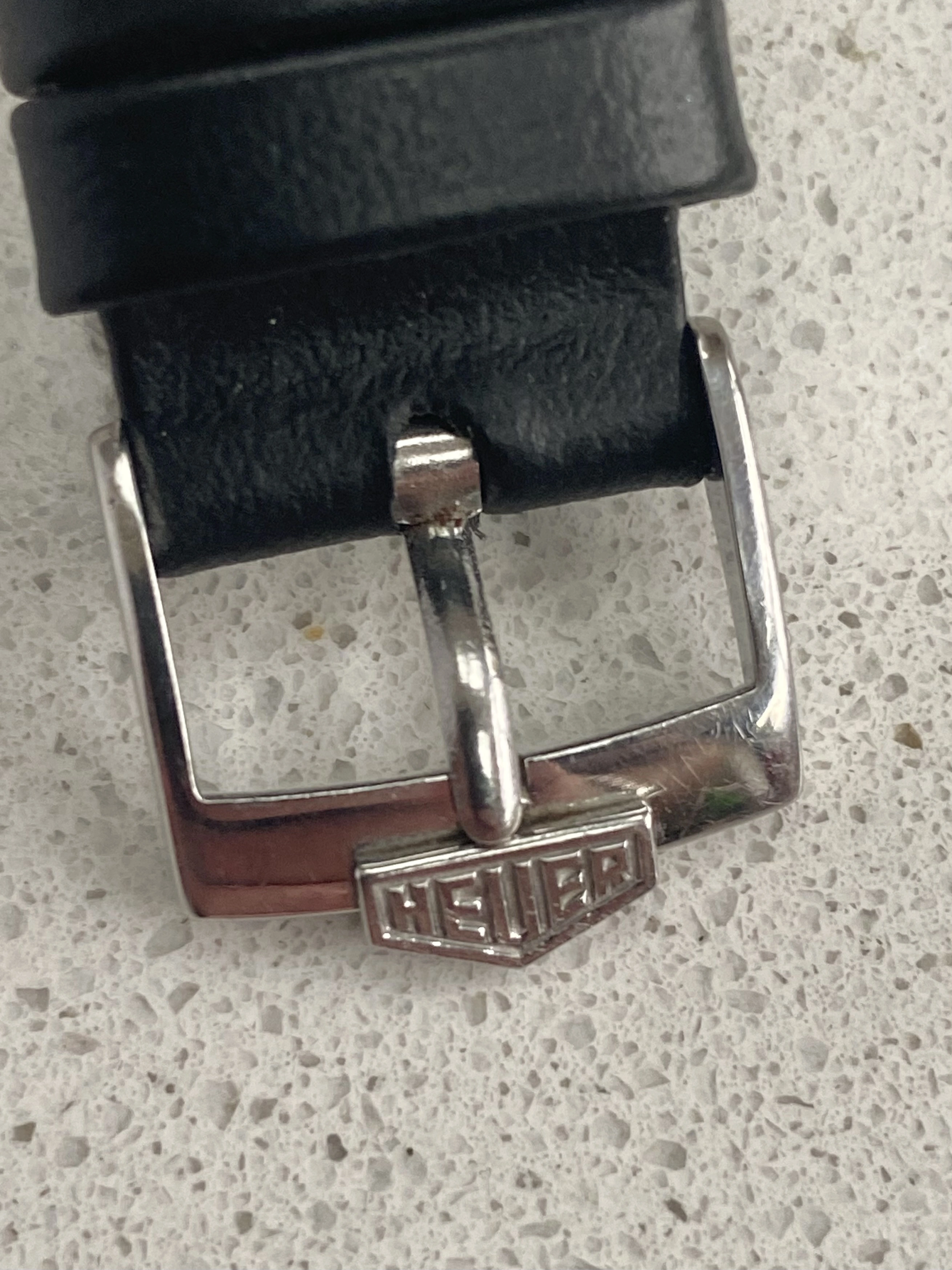 Modern plain black leather strap in keeping with the straps that originally came on the early Carreras (pre beads of rice bracelets). With vintage genuine Heuer sun buckle.
