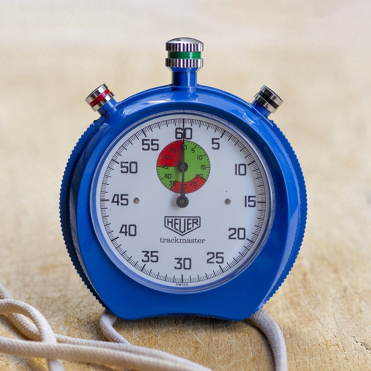 Description: Vintage, 1970's Heuer Trackmaster Ref. 8047 with original box and lanyard string. Color-coded push buttons (green = start, red = stop, black = re-set) retain their original factory paint. Manua winding. Plastic case, dial and crystal are all in excellent condition. Stopwatch fully winds, starts, stops and re-sets. This vintage Heuer precision timer is well preserved and looks to have been very well cared for.