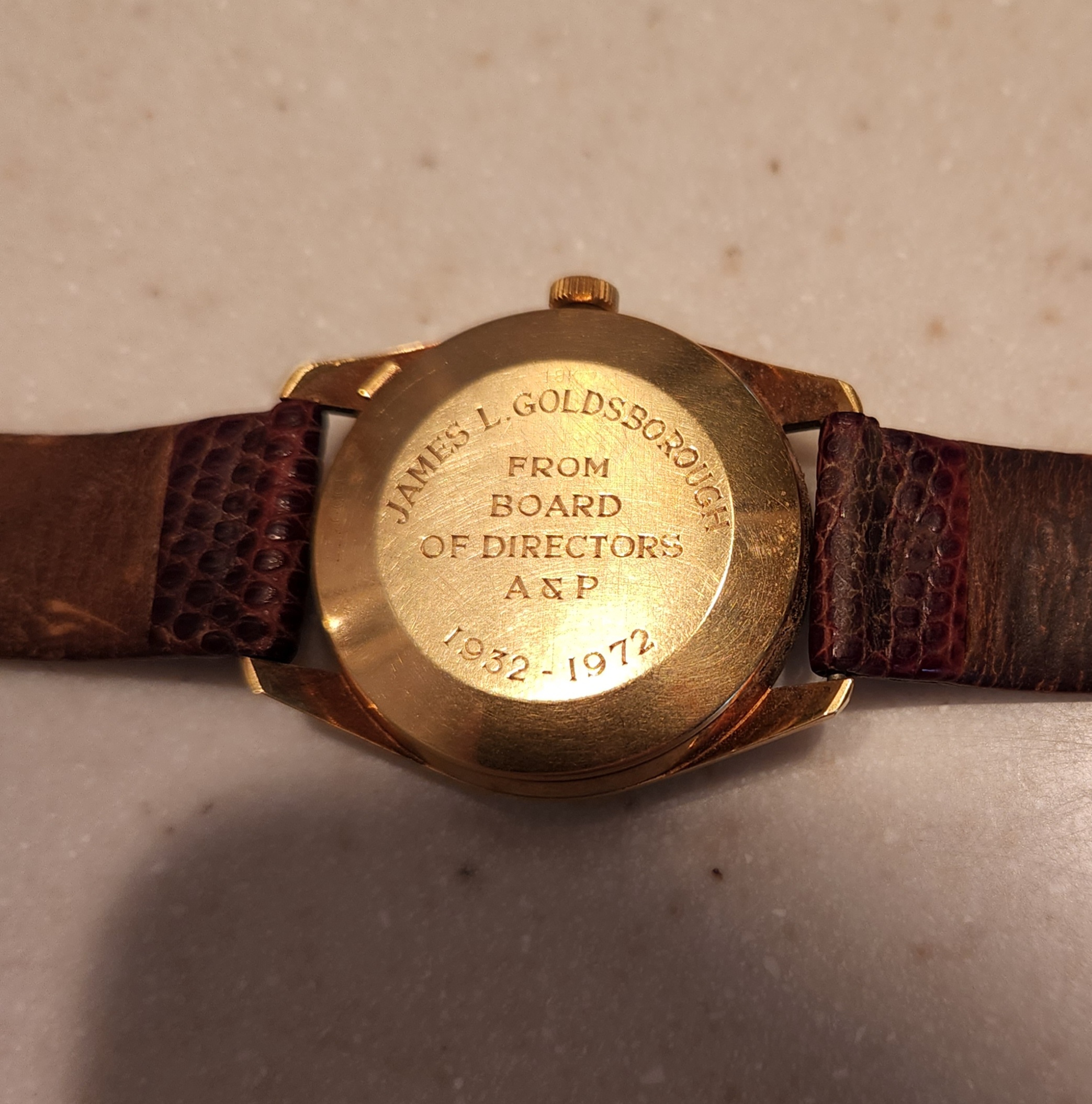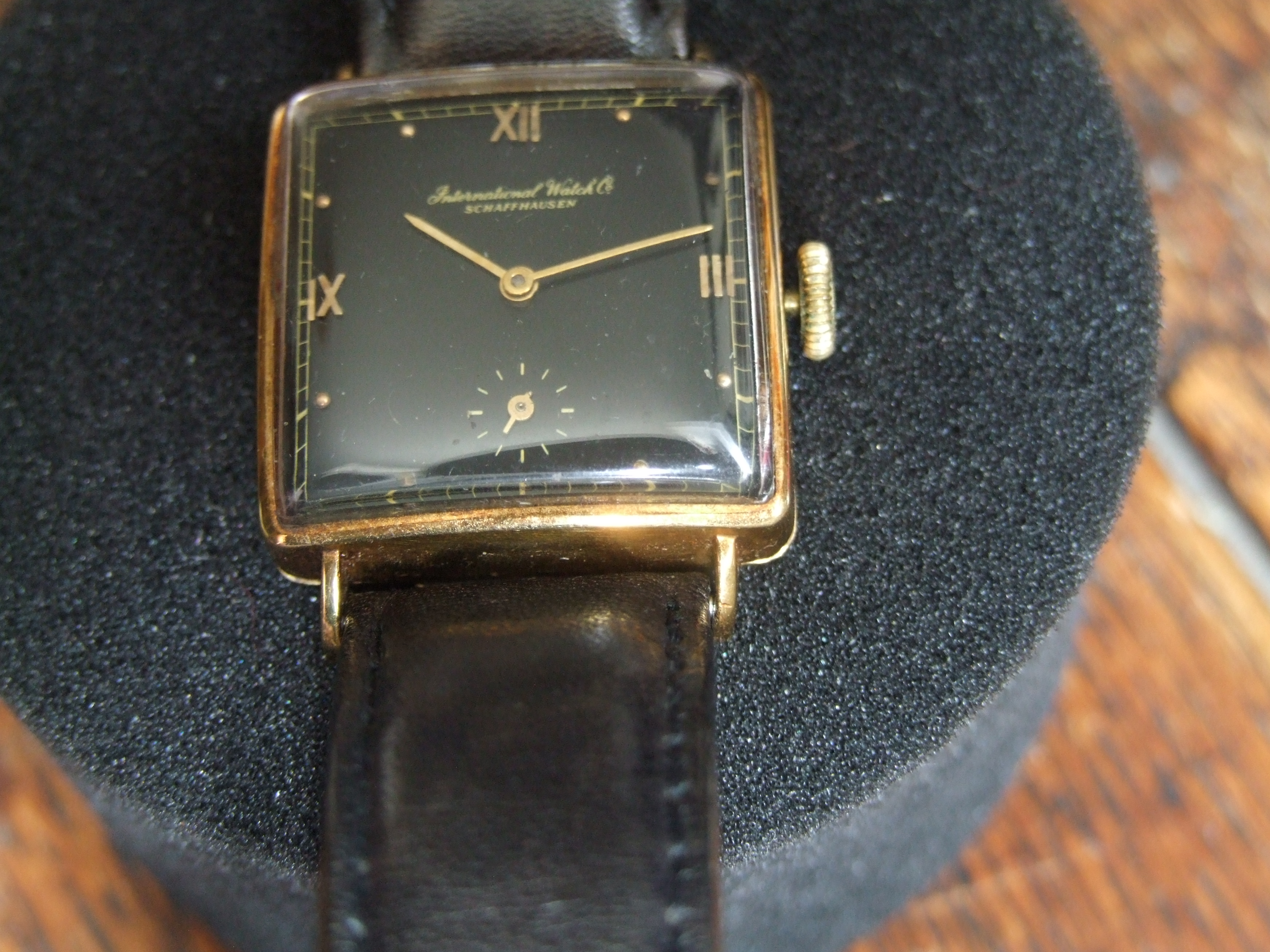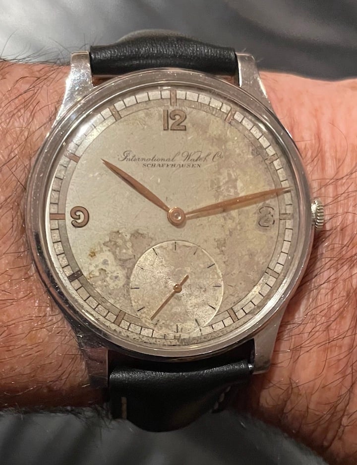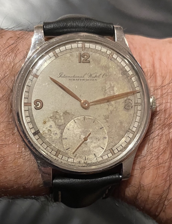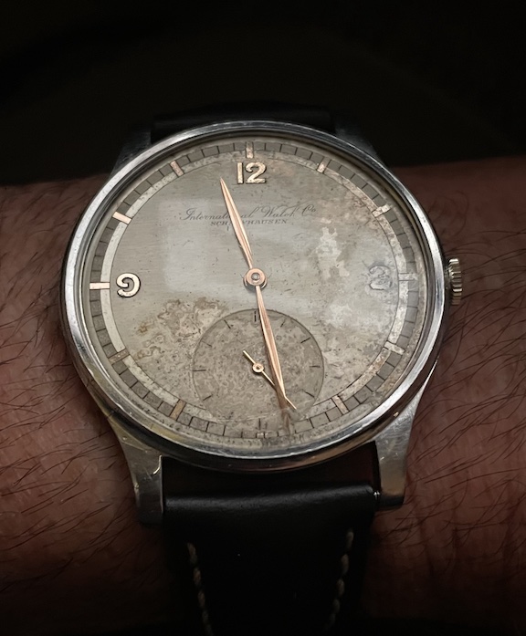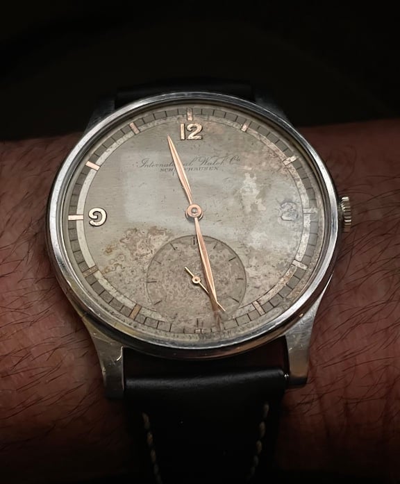 I've attached a few photos of a vintage IWC. The watch belonged to my wife's grandfather. Her grandmother passed away a few months ago at the age of 98, and my mother-in-law found this among her mother's possessions. My wife has fond memories from her childhood of her grandfather wearing this watch on Sundays and special occasions. As the engraving on the caseback signifies, the watch was a retirement gift to her grandfather, who spent four decades as a butcher in an A&P supermarket. My mother-in-law has gifted it to me, and to my knowledge it was never serviced.