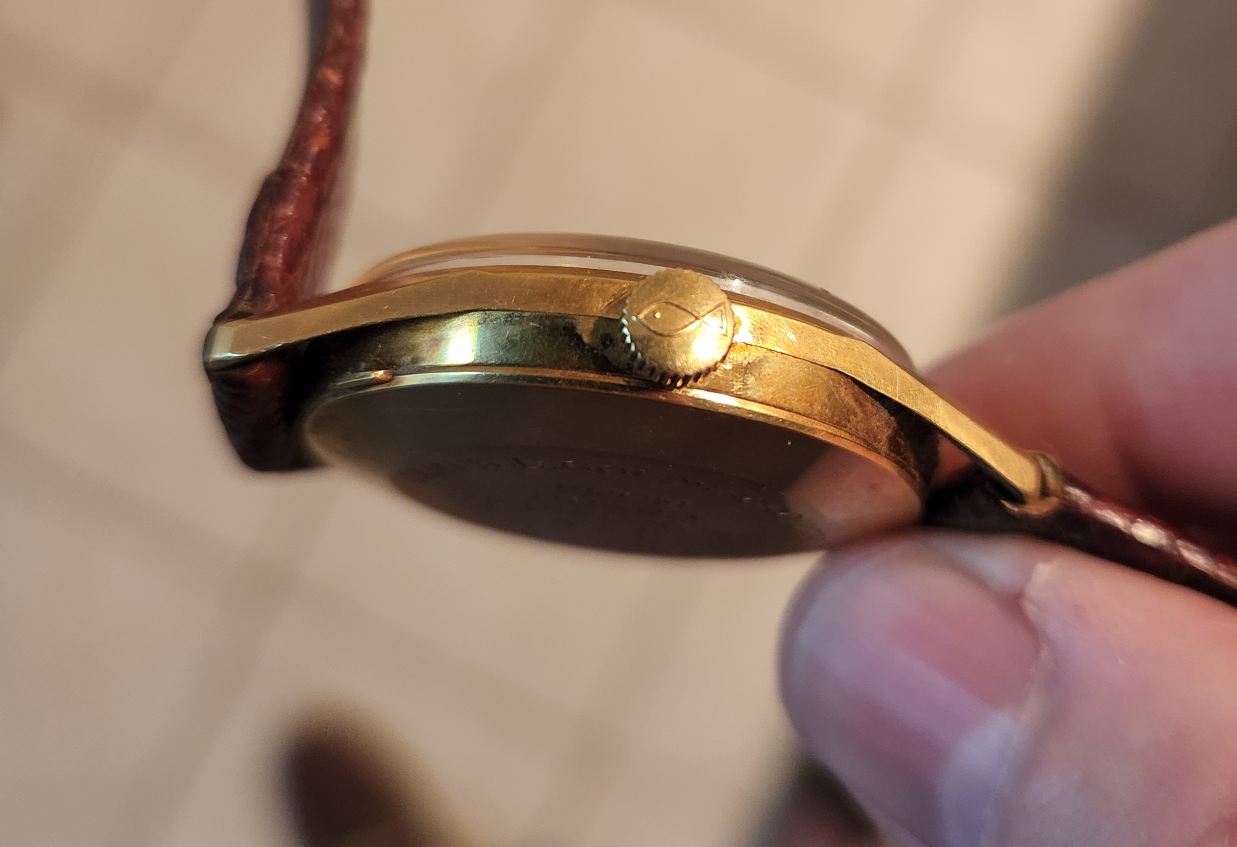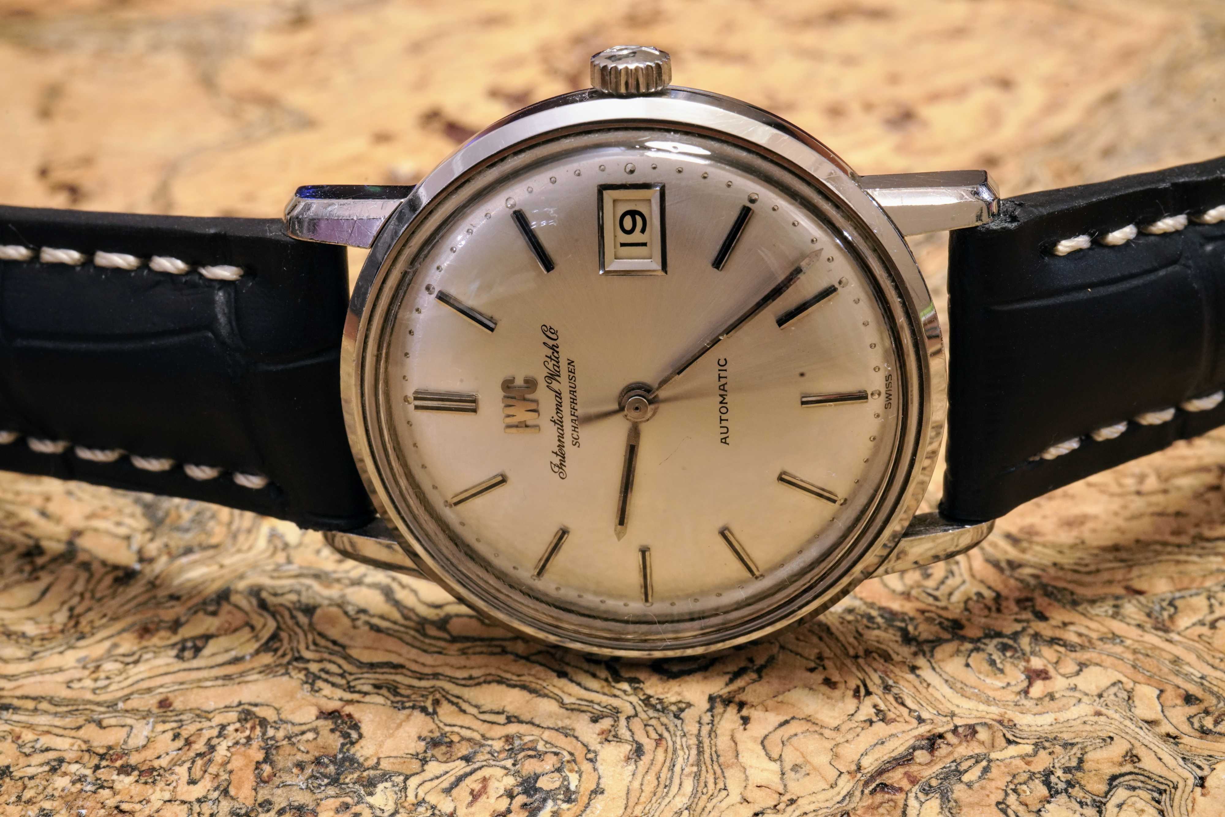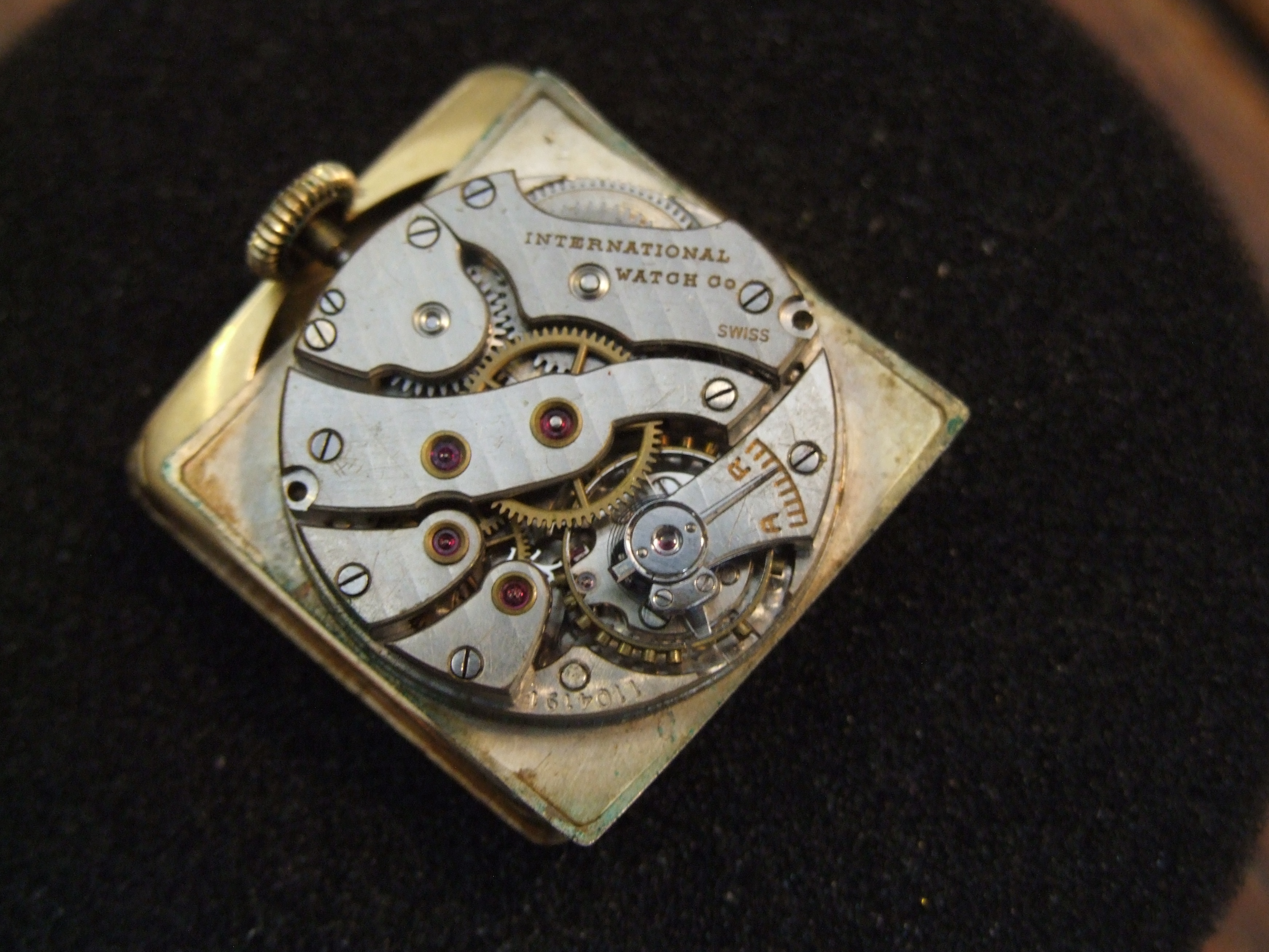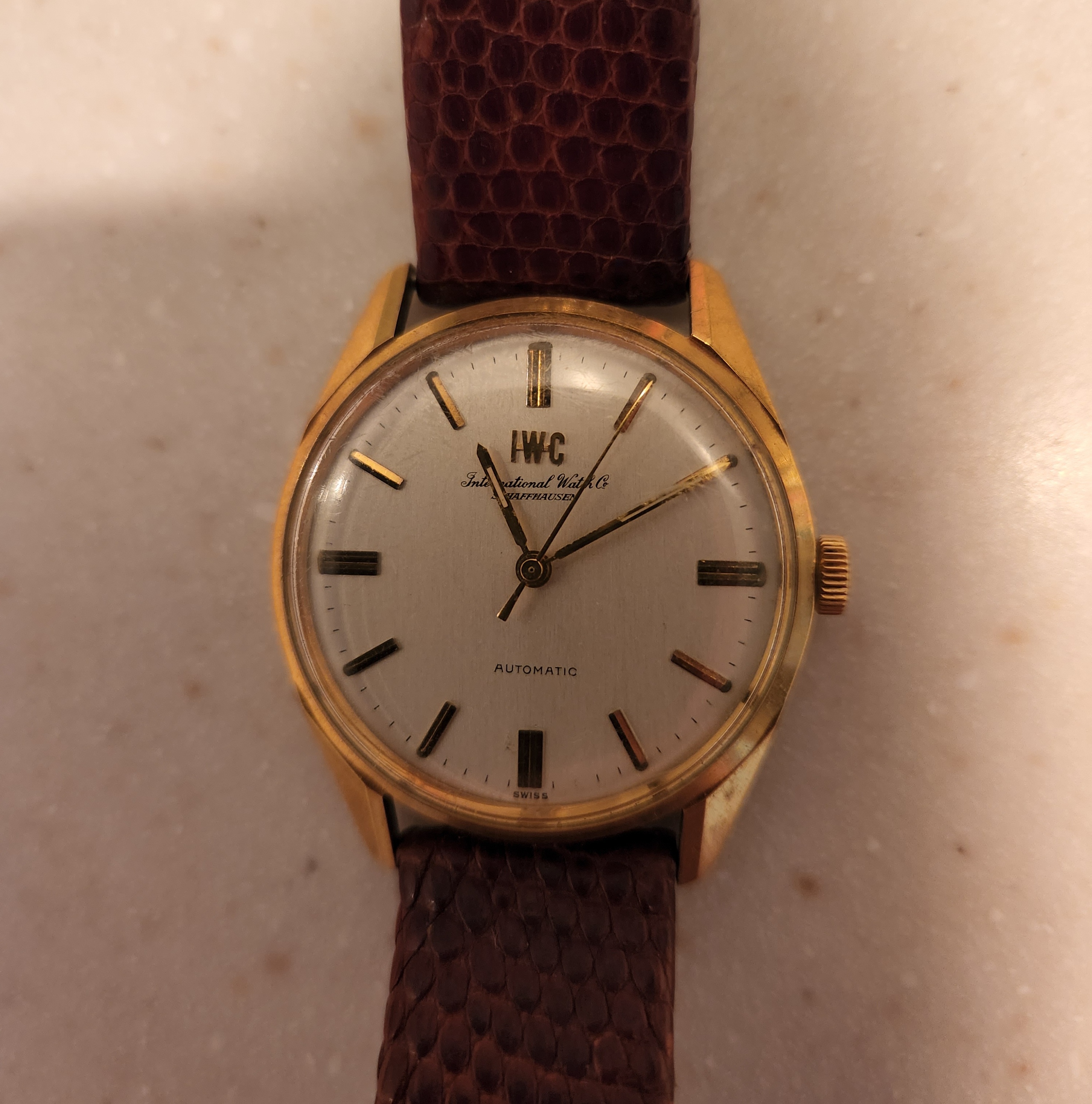 I've attached a few photos of a vintage IWC. The watch belonged to my wife's grandfather. Her grandmother passed away a few months ago at the age of 98, and my mother-in-law found this among her mother's possessions. My wife has fond memories from her childhood of her grandfather wearing this watch on Sundays and special occasions. As the engraving on the caseback signifies, the watch was a retirement gift to her grandfather, who spent four decades as a butcher in an A&P supermarket. My mother-in-law has gifted it to me, and to my knowledge it was never serviced.