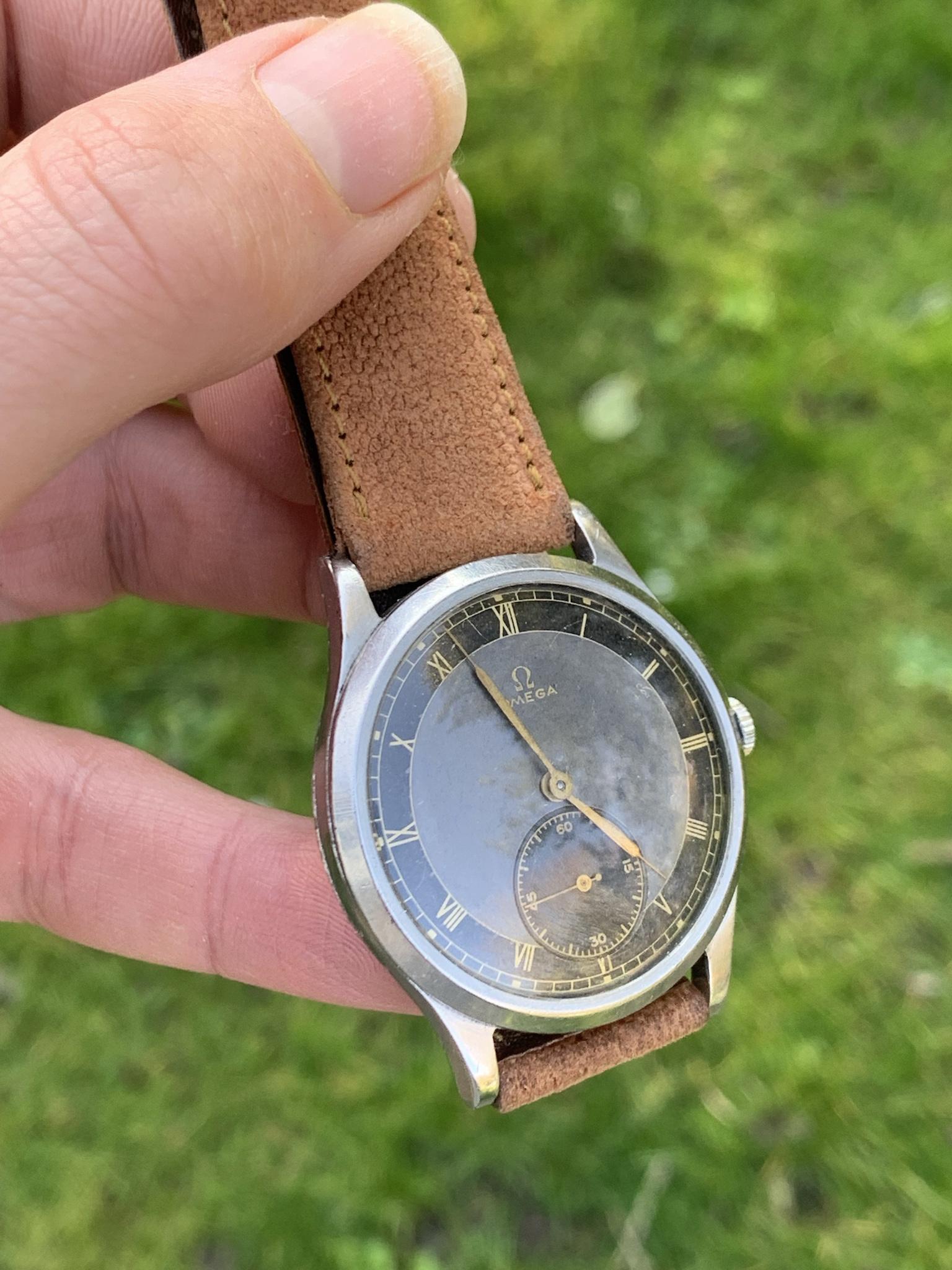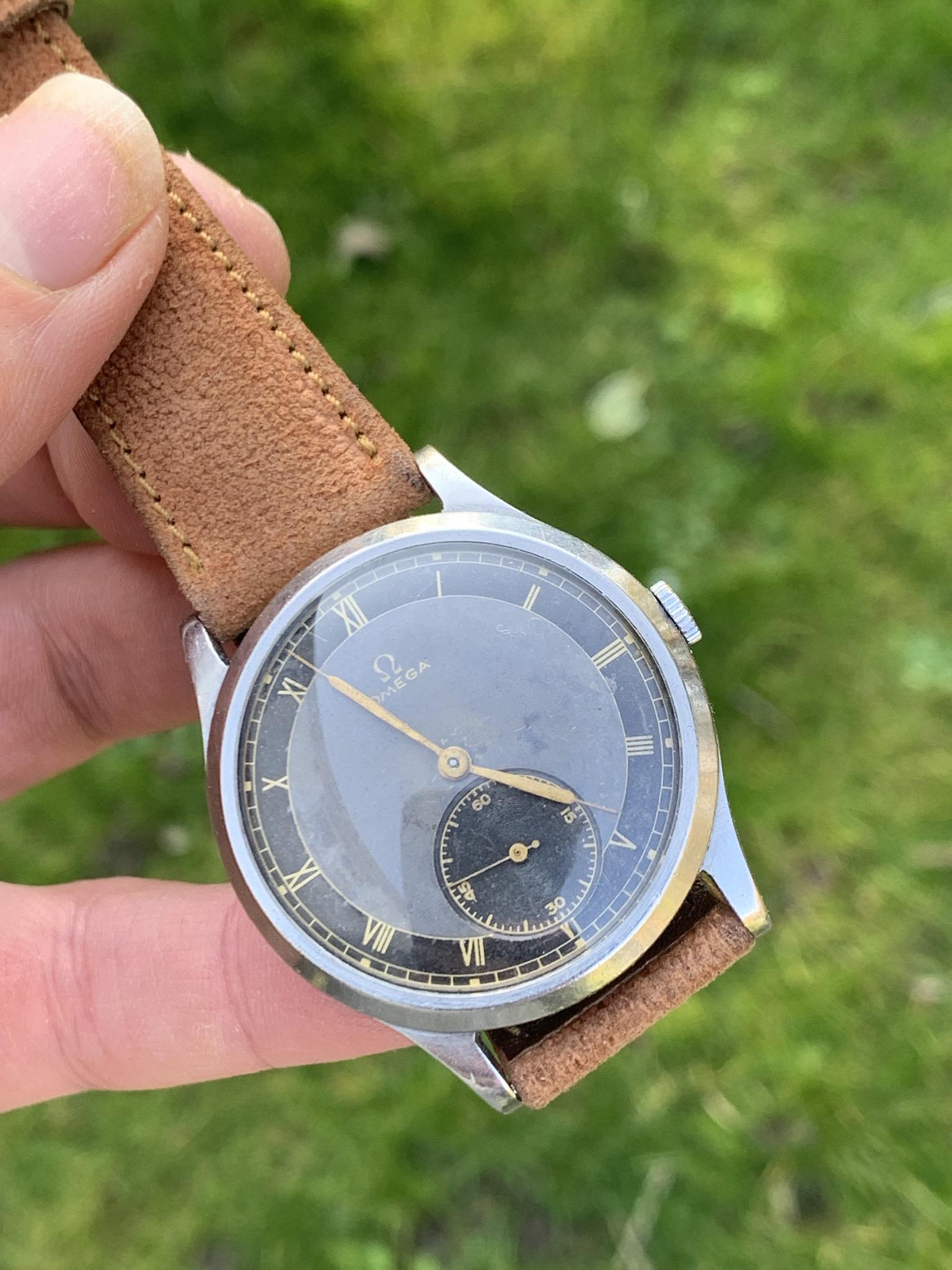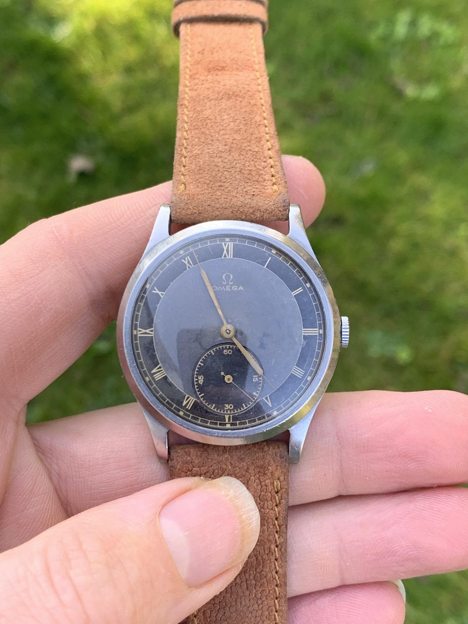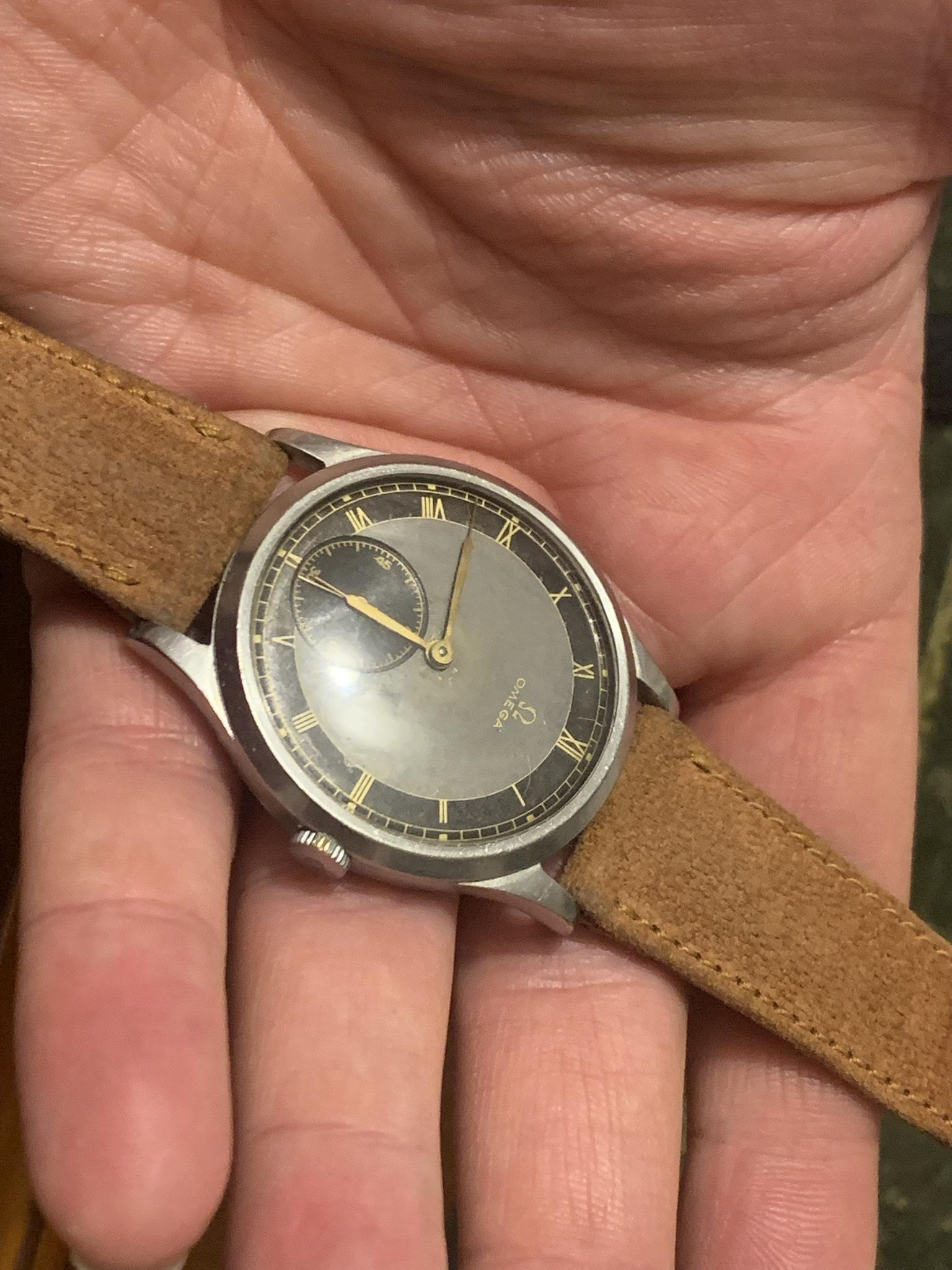 Dial: As you can see for a watch that is 84 years old, this dial is in good shape, there are some marks and patina so please observe the pictures closely. This dial style is incredibly rare, with a bulls-eye style dial, with small seconds dial, and combination of grey and black areas concentric rings, combined with gold 'mirror' numerals. It is quite difficult to picture, so I've taken pictures in various lighting conditions to help represent it in all sorts of situations.