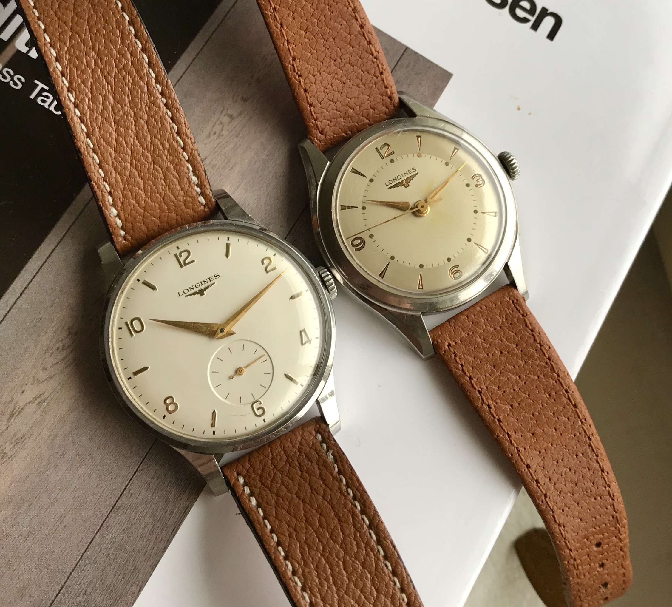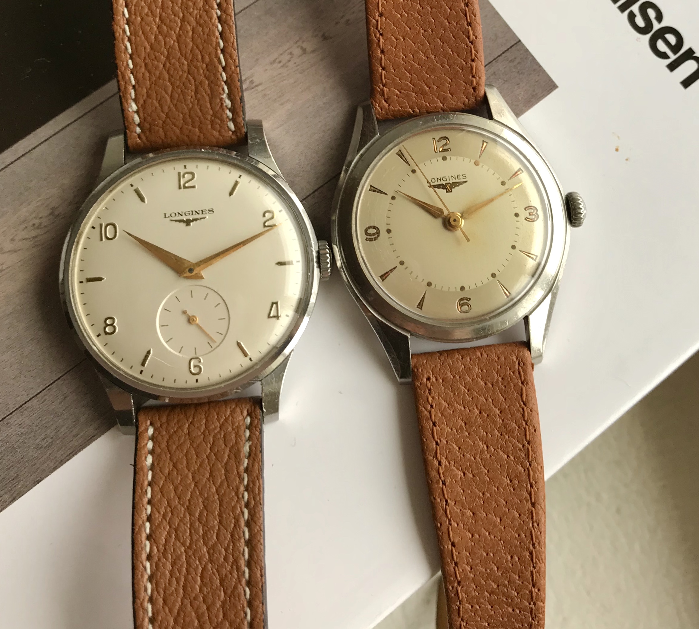 Two manual 50's jumbo Longines about the same case diameter ~37mm excluding crown, but one wears significally larger than the other