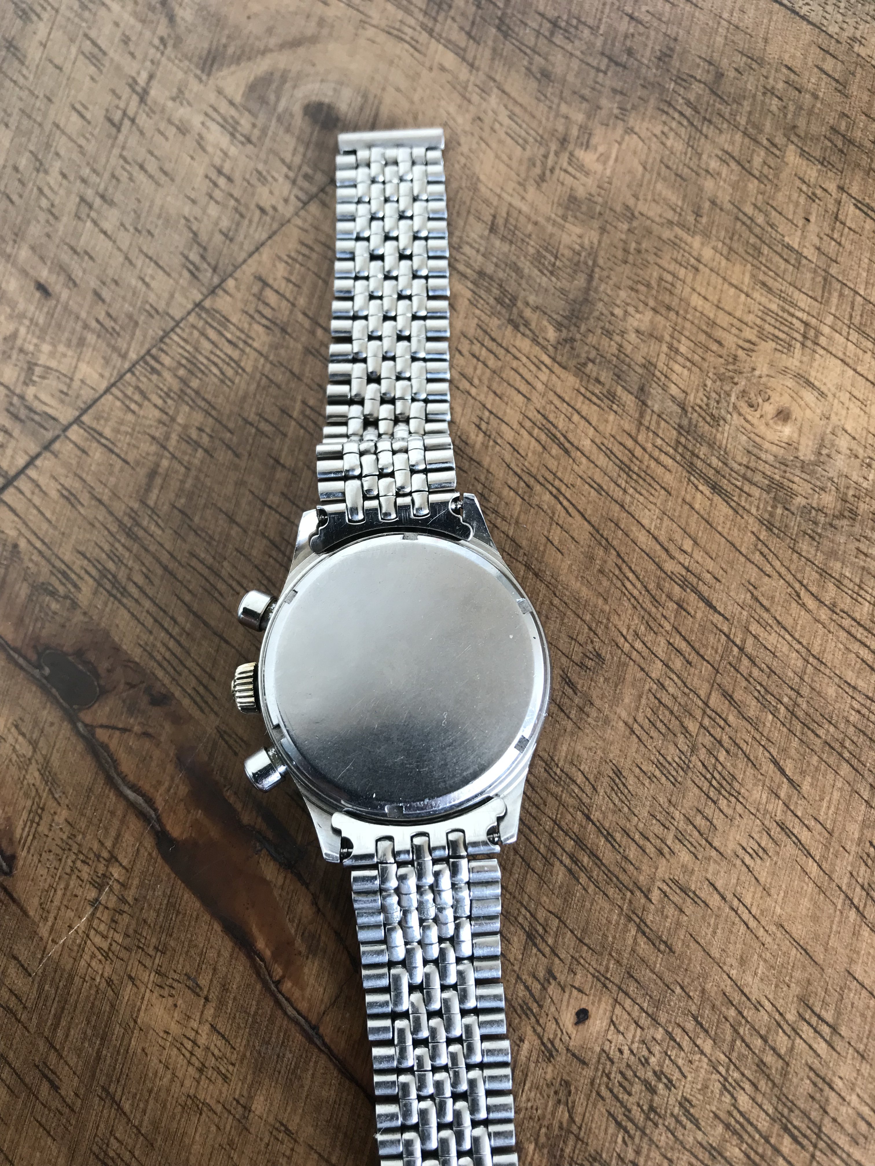 Case: 35mm w/o crown. Rare “step case” that’s sought after in Chronographs from this era. 18mm lug width.