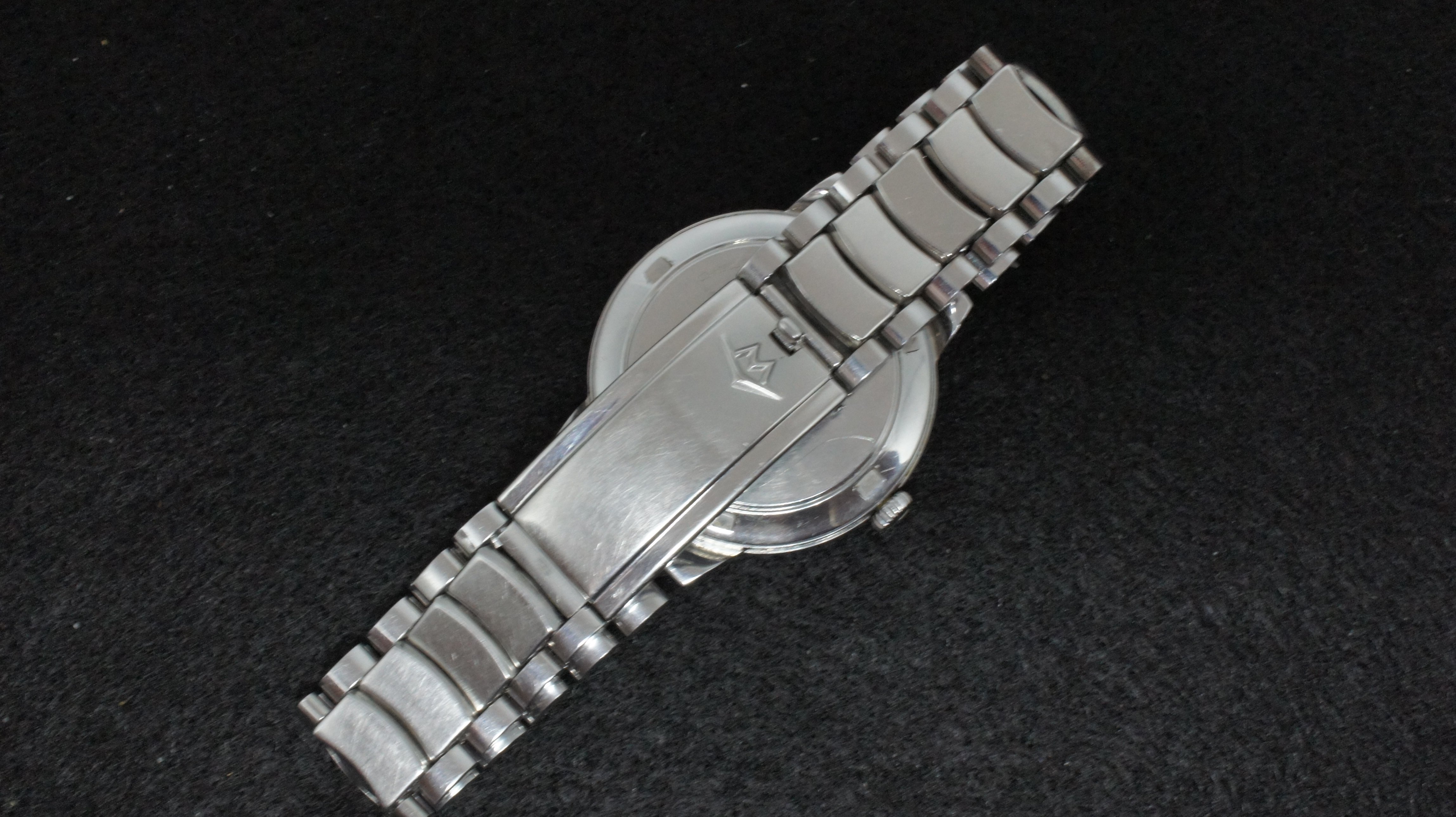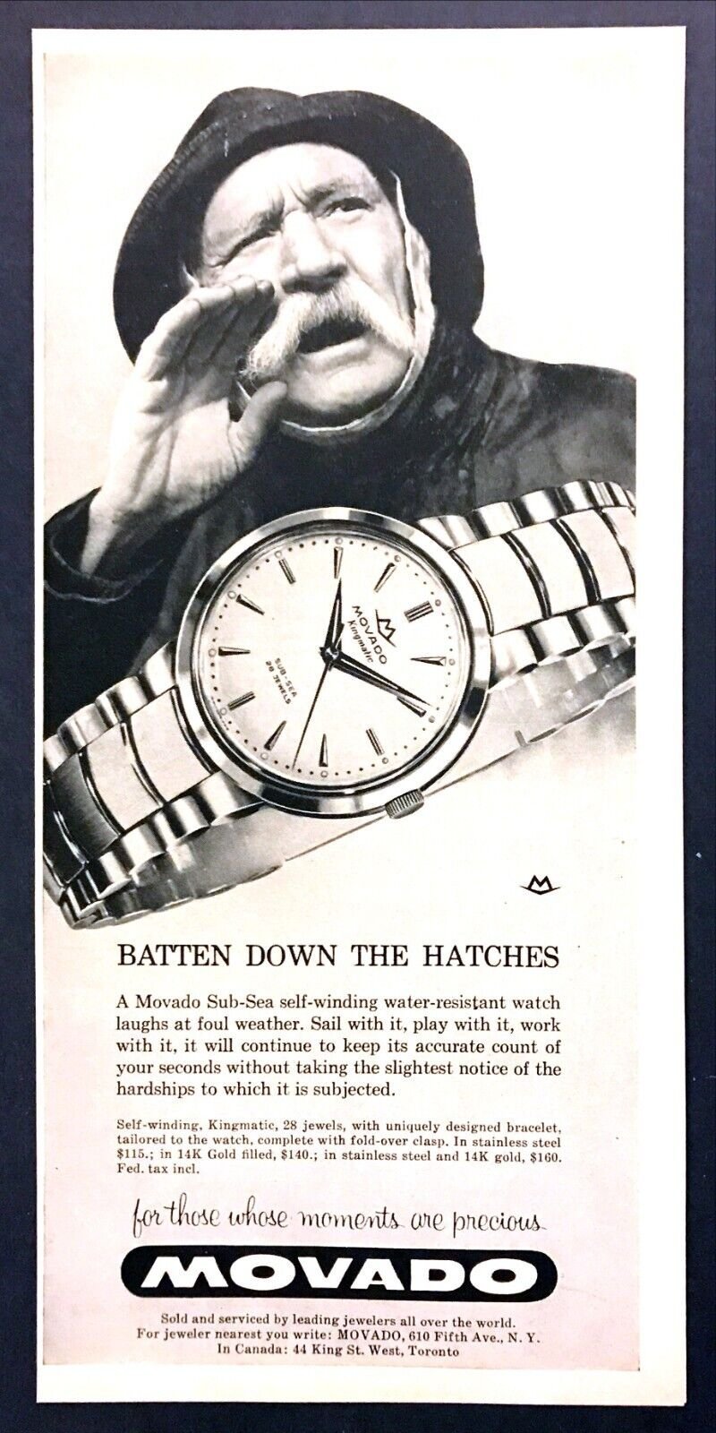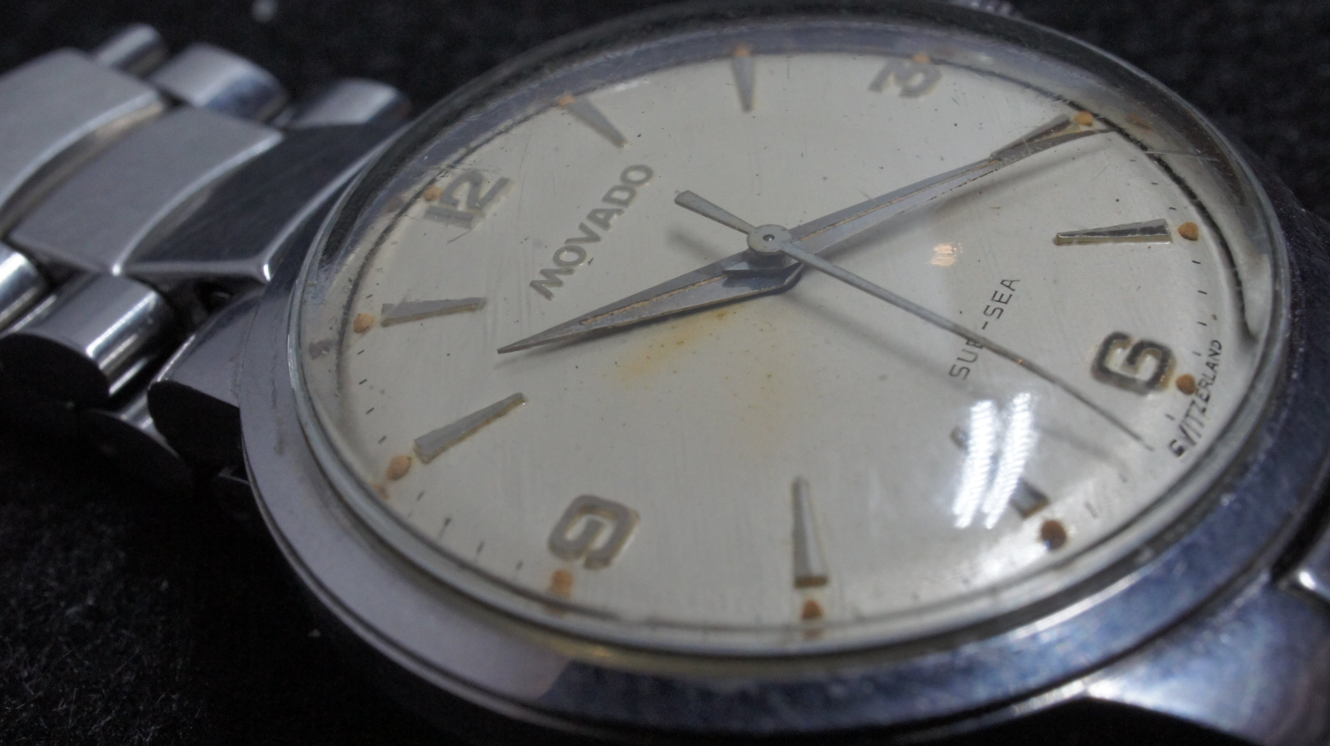 ·Circa late 1950's vintage Movado Sub-Sea with original signed integrated bracelet and adjustable clasp. Steel case measures 33mm excluding signed original crown. Caliber 127, Adjusted Two Positions, 18,000 A/h manual wind movement, in working order and keeping time, but service unknown. Caliber 127 was produced by Movado from 1952 to 1960. Bracelet will fit wrist up to 7.5 and larger with adjustable clasp. Dial in excellent original condition, with some traces of radium burn. Overall watch is in nice condition for its age and an uncommon model. A beautiful movement from the golden age of Swiss watchmaking. The magazine ad below is from 1959 featuring the same case but the Kingmatic version. Reduced US$295, includes shipping/paypal Canada/US.