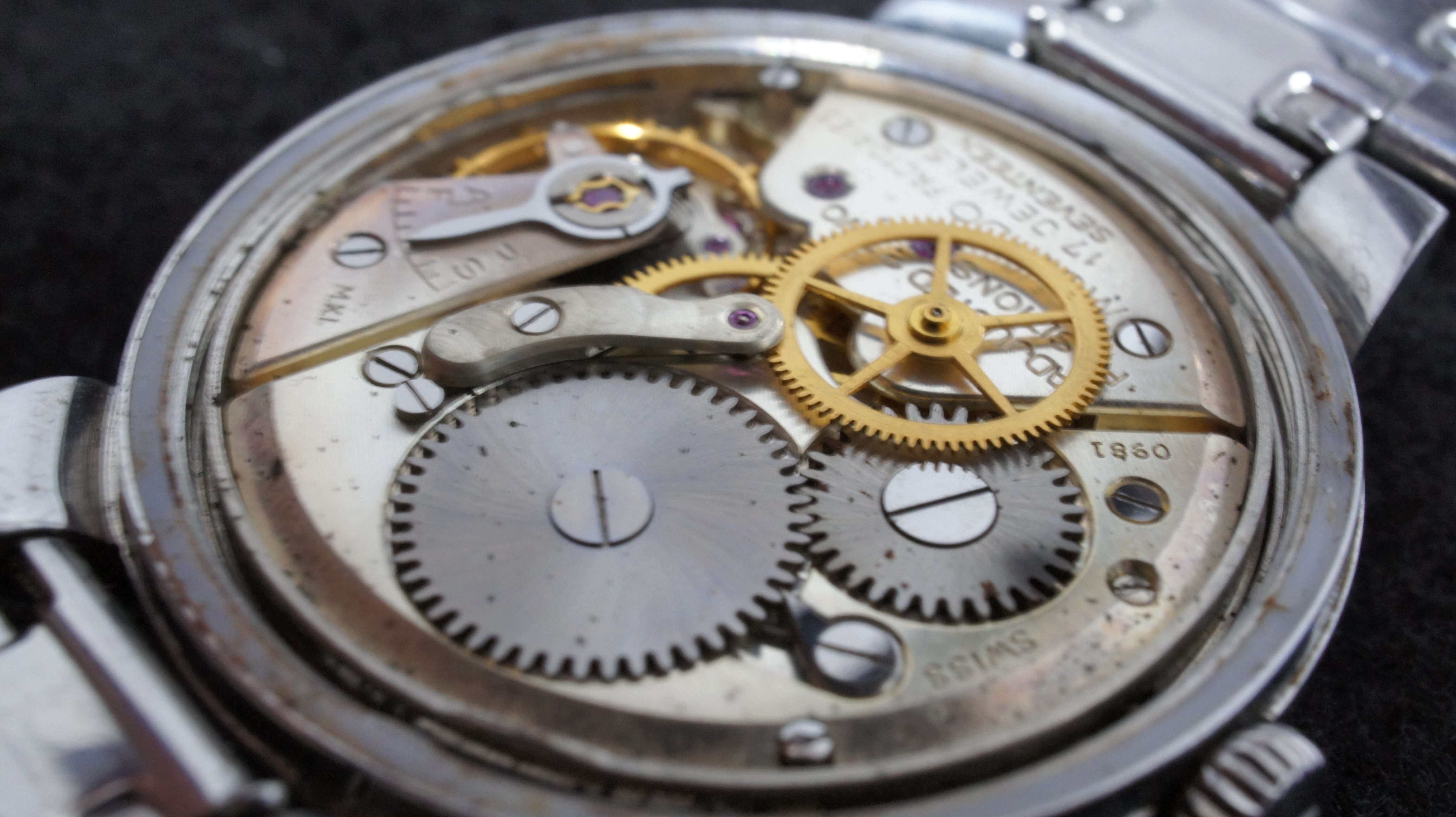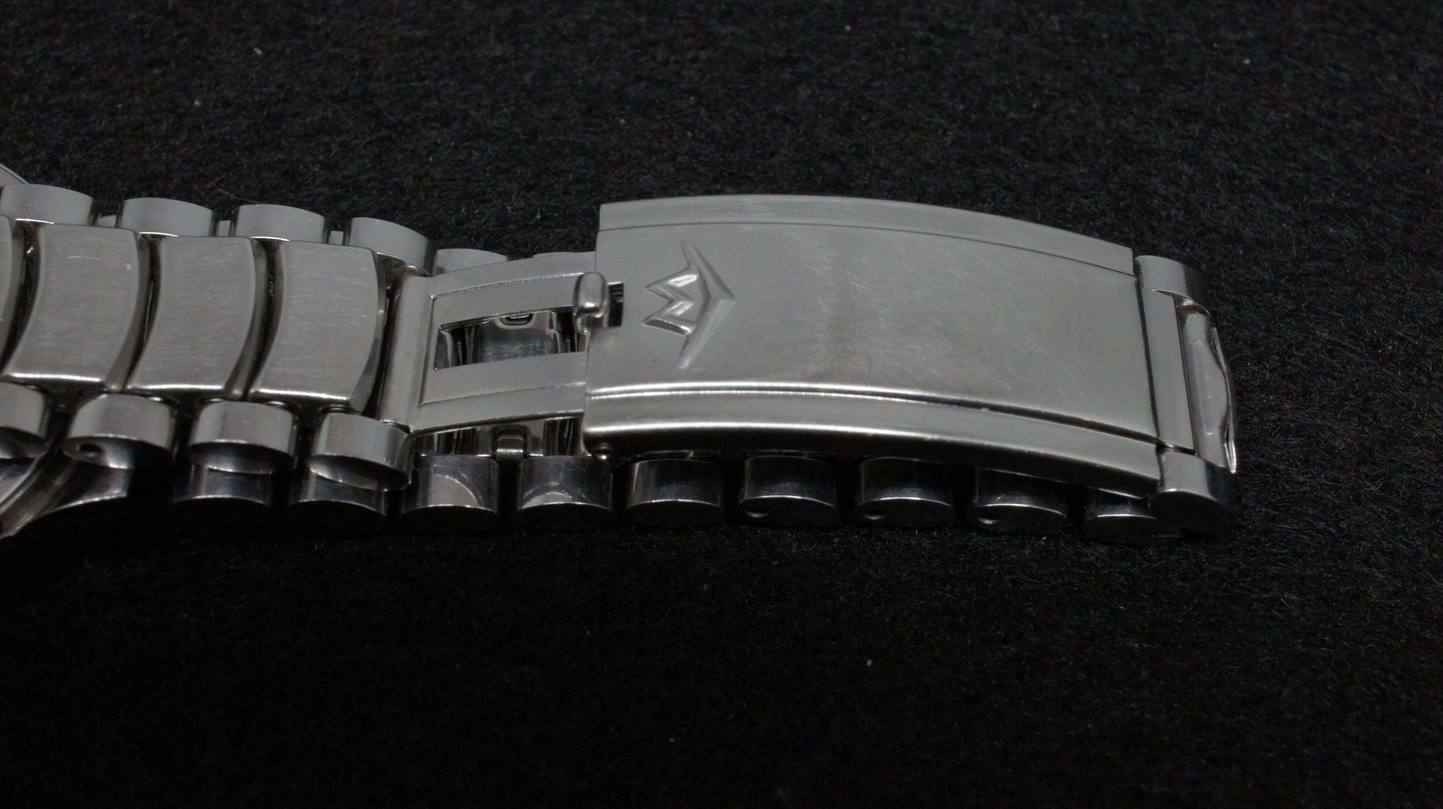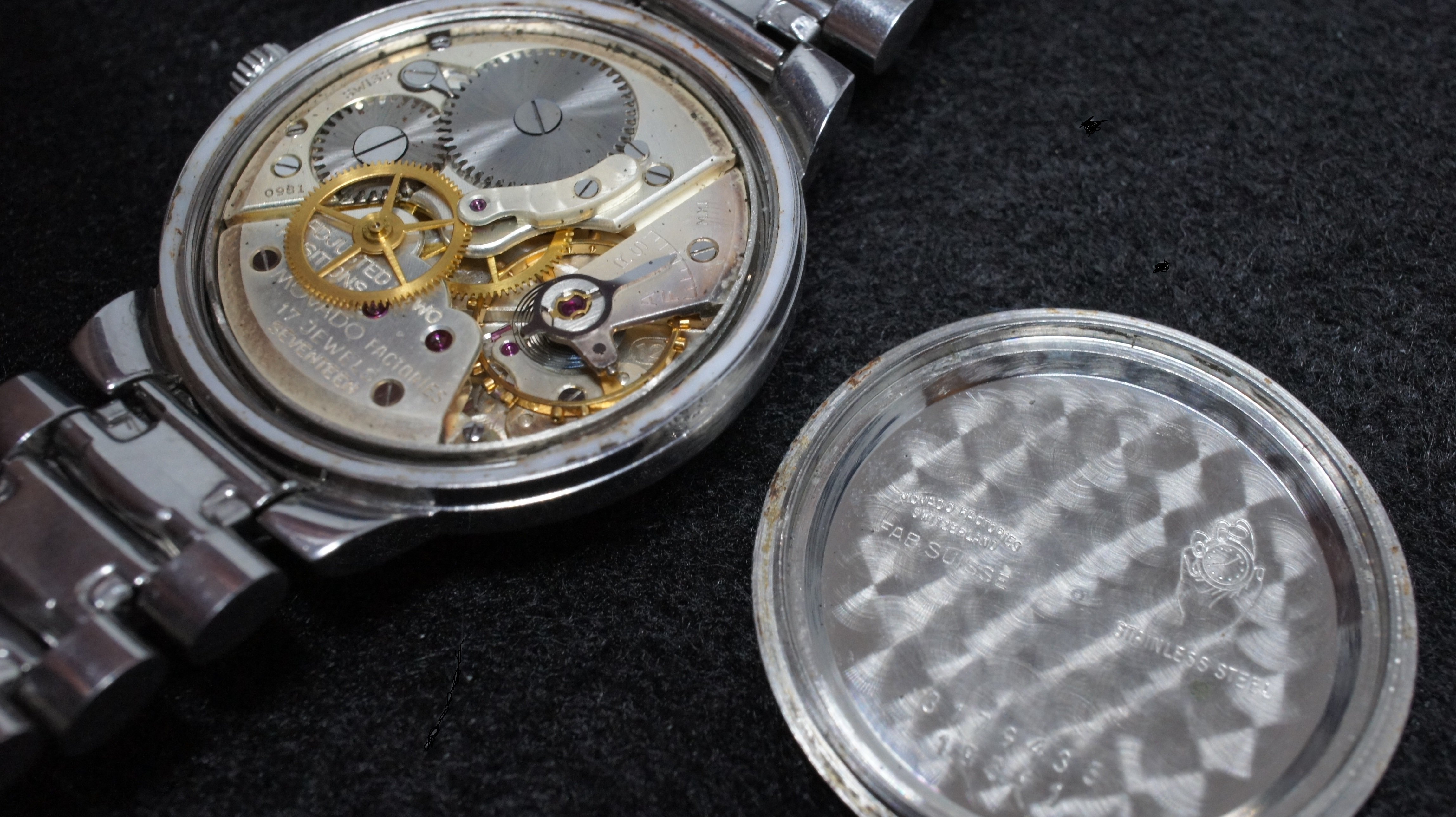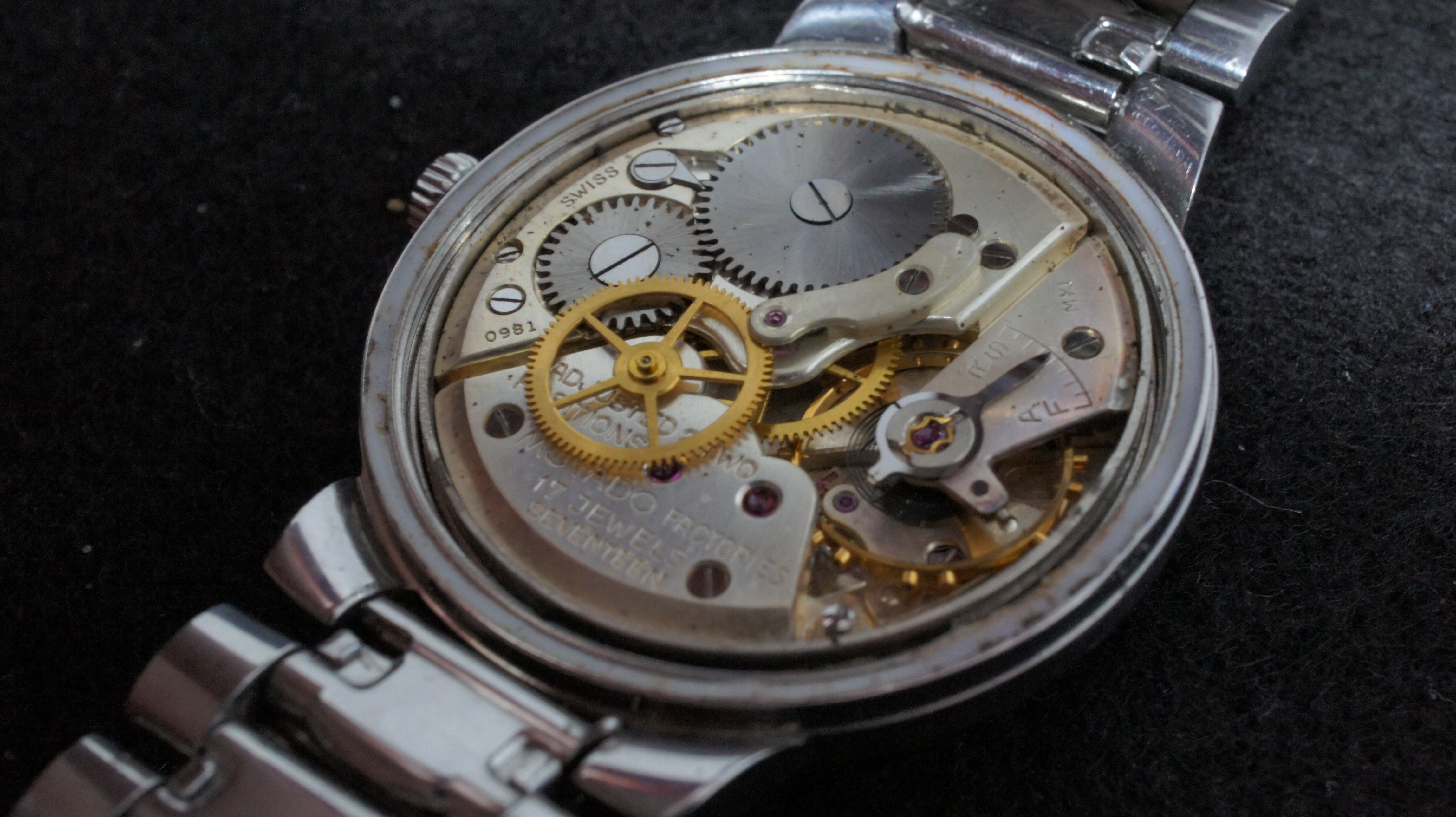 ·Circa late 1950's vintage Movado Sub-Sea with original signed integrated bracelet and adjustable clasp. Steel case measures 33mm excluding signed original crown. Caliber 127, Adjusted Two Positions, 18,000 A/h manual wind movement, in working order and keeping time, but service unknown. Caliber 127 was produced by Movado from 1952 to 1960. Bracelet will fit wrist up to 7.5 and larger with adjustable clasp. Dial in excellent original condition, with some traces of radium burn. Overall watch is in nice condition for its age and an uncommon model. A beautiful movement from the golden age of Swiss watchmaking. The magazine ad below is from 1959 featuring the same case but the Kingmatic version. Reduced US$295, includes shipping/paypal Canada/US.