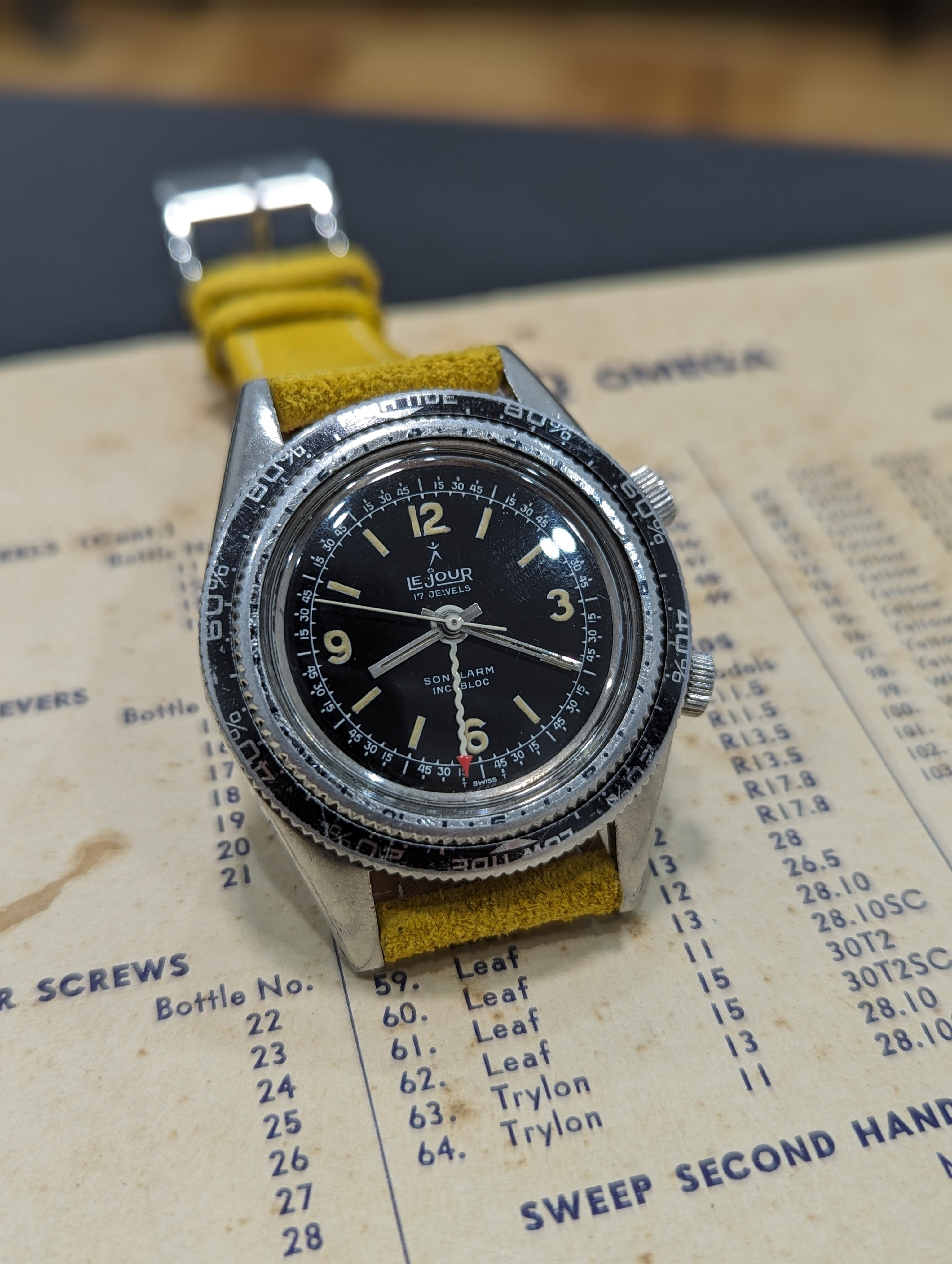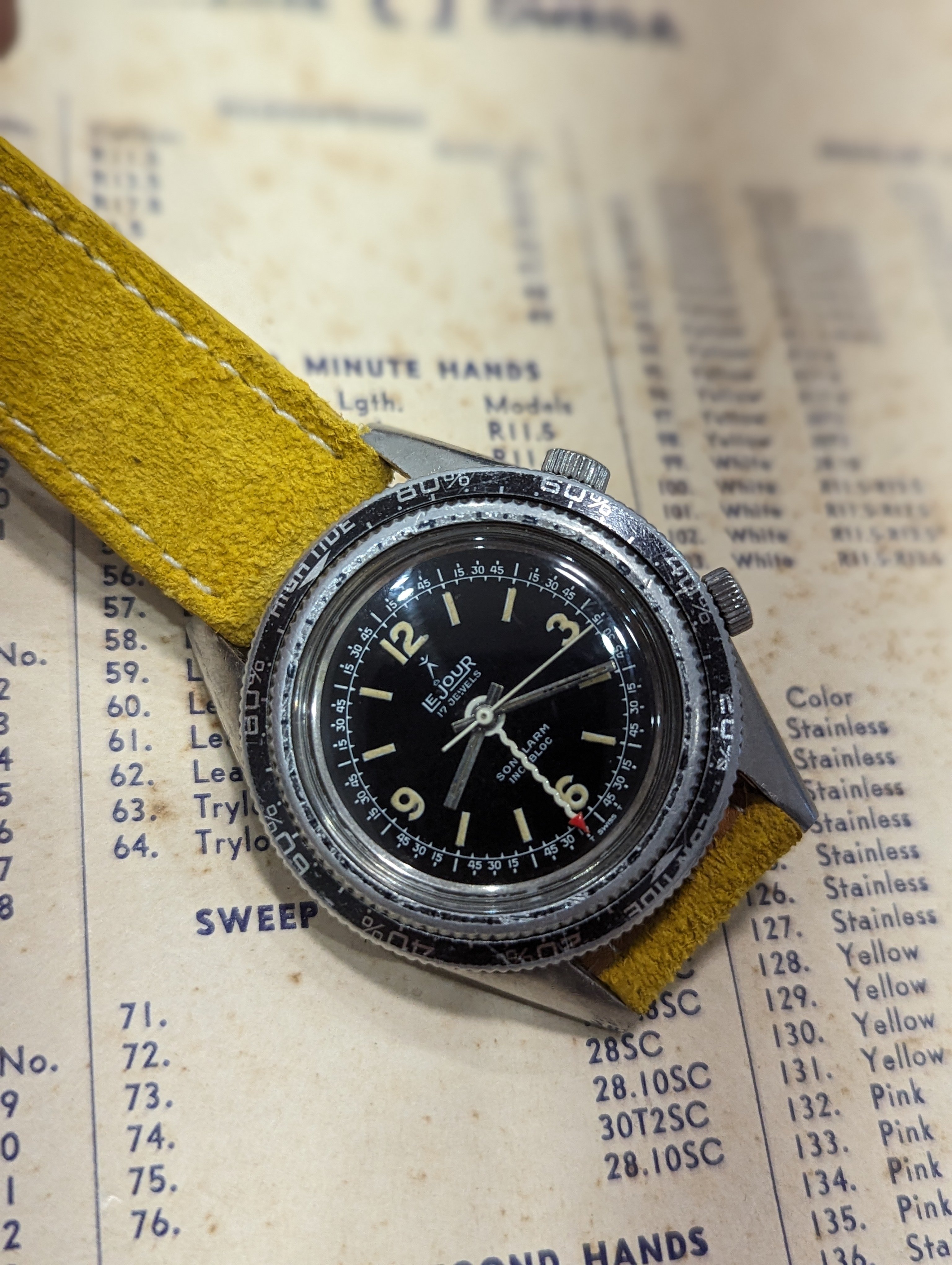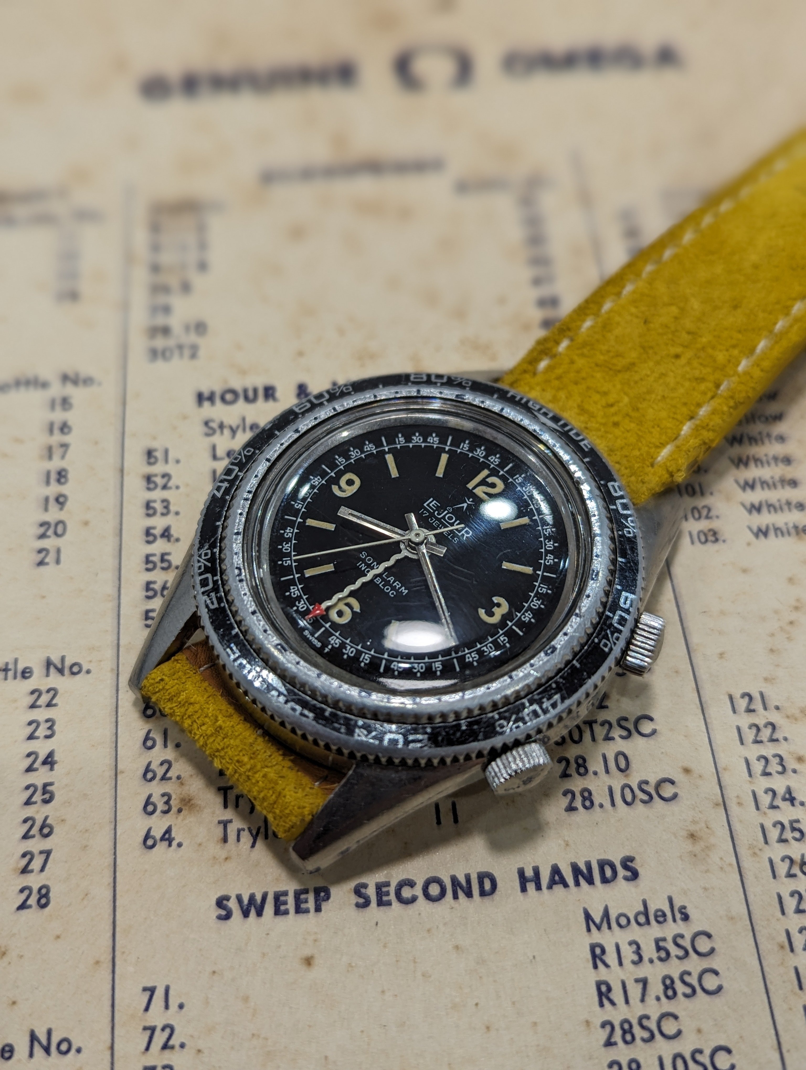 Up for sale is a rather uncommon Lejour Sonolarm. Measures about 38mm in diameter, alarm functions as it should and was serviced last year. Case shows some age, and the back has some light denting. Dial and hands are in very nice condition. If you have any questions, feel free to pm me!