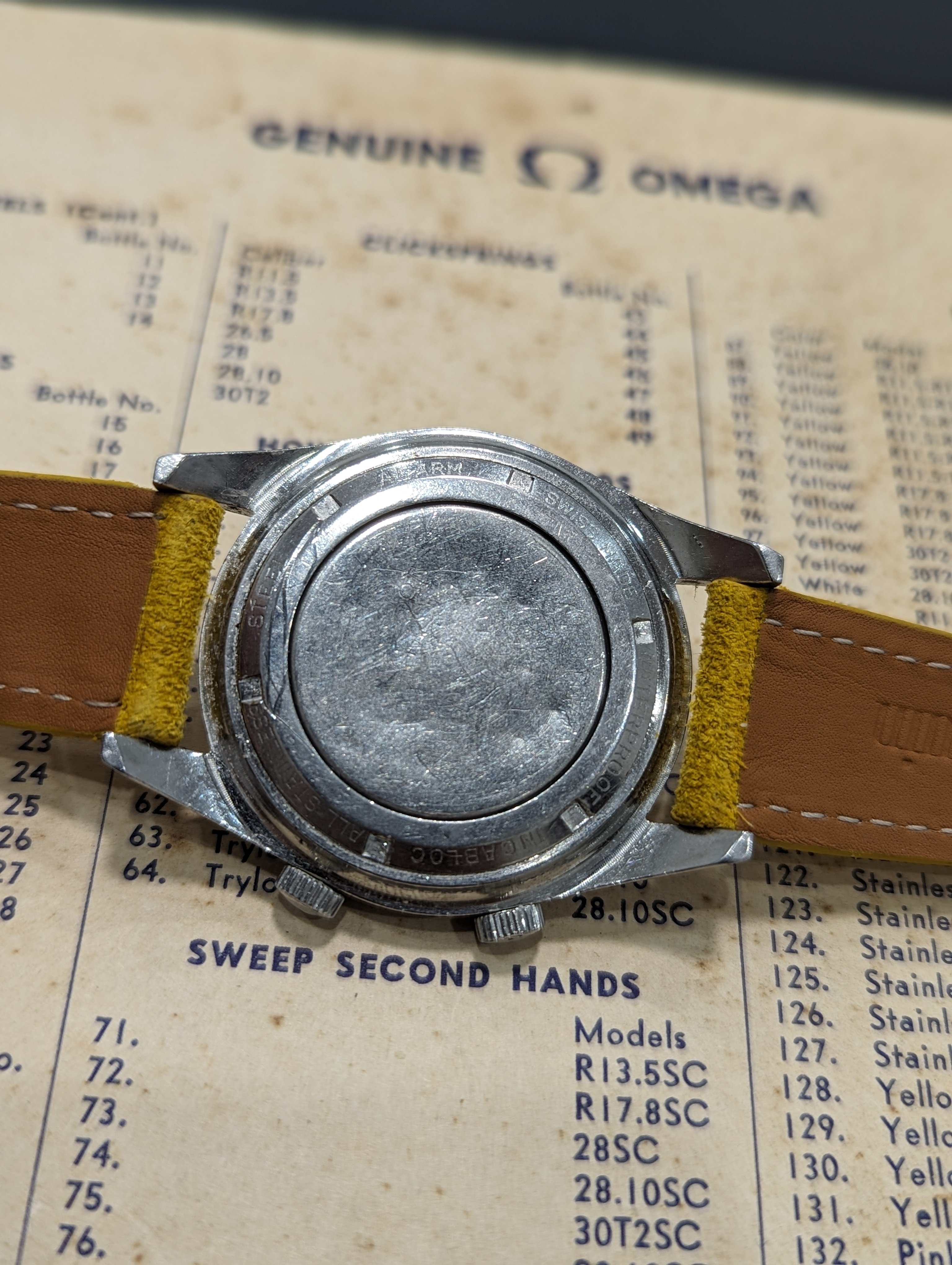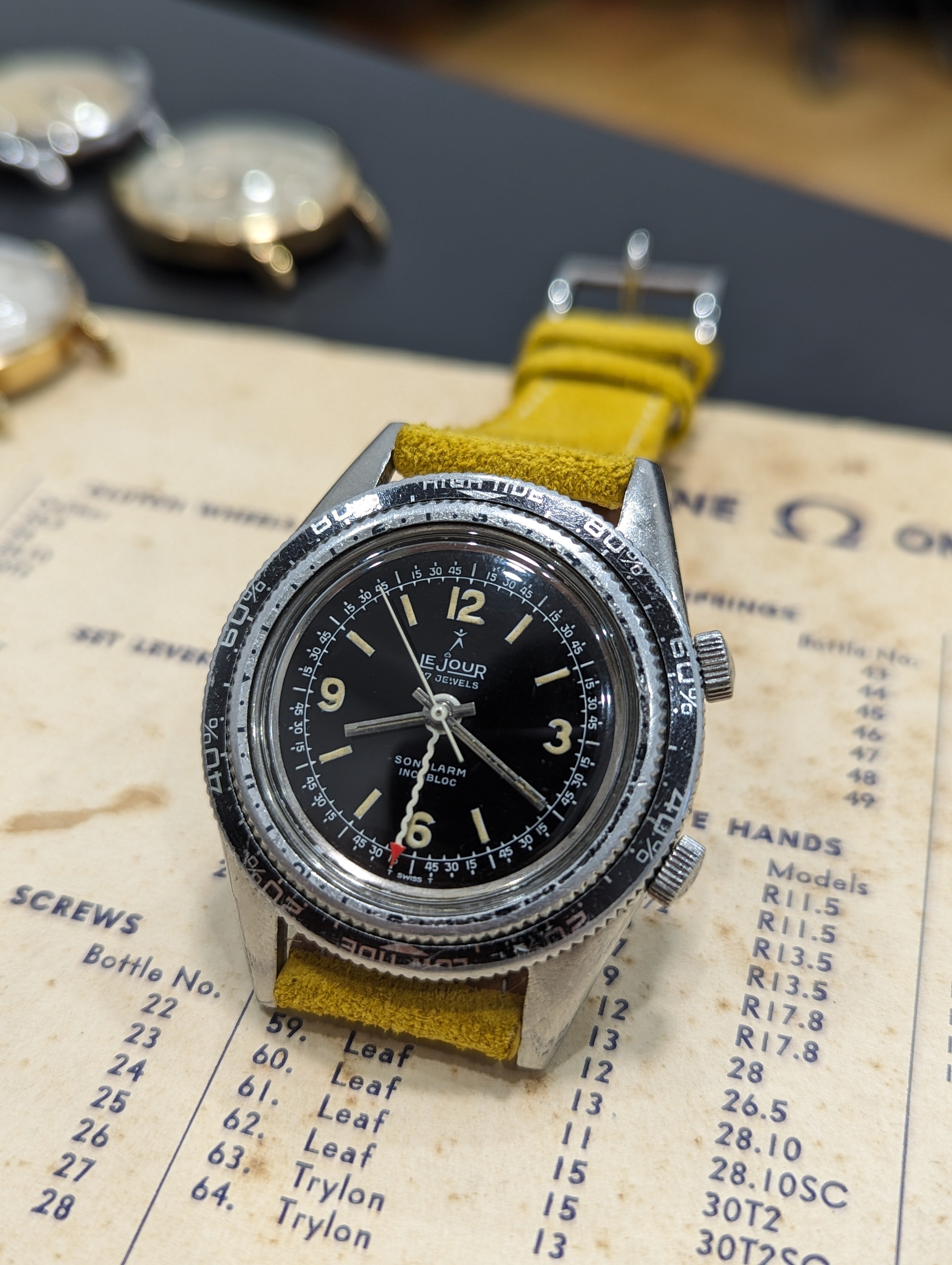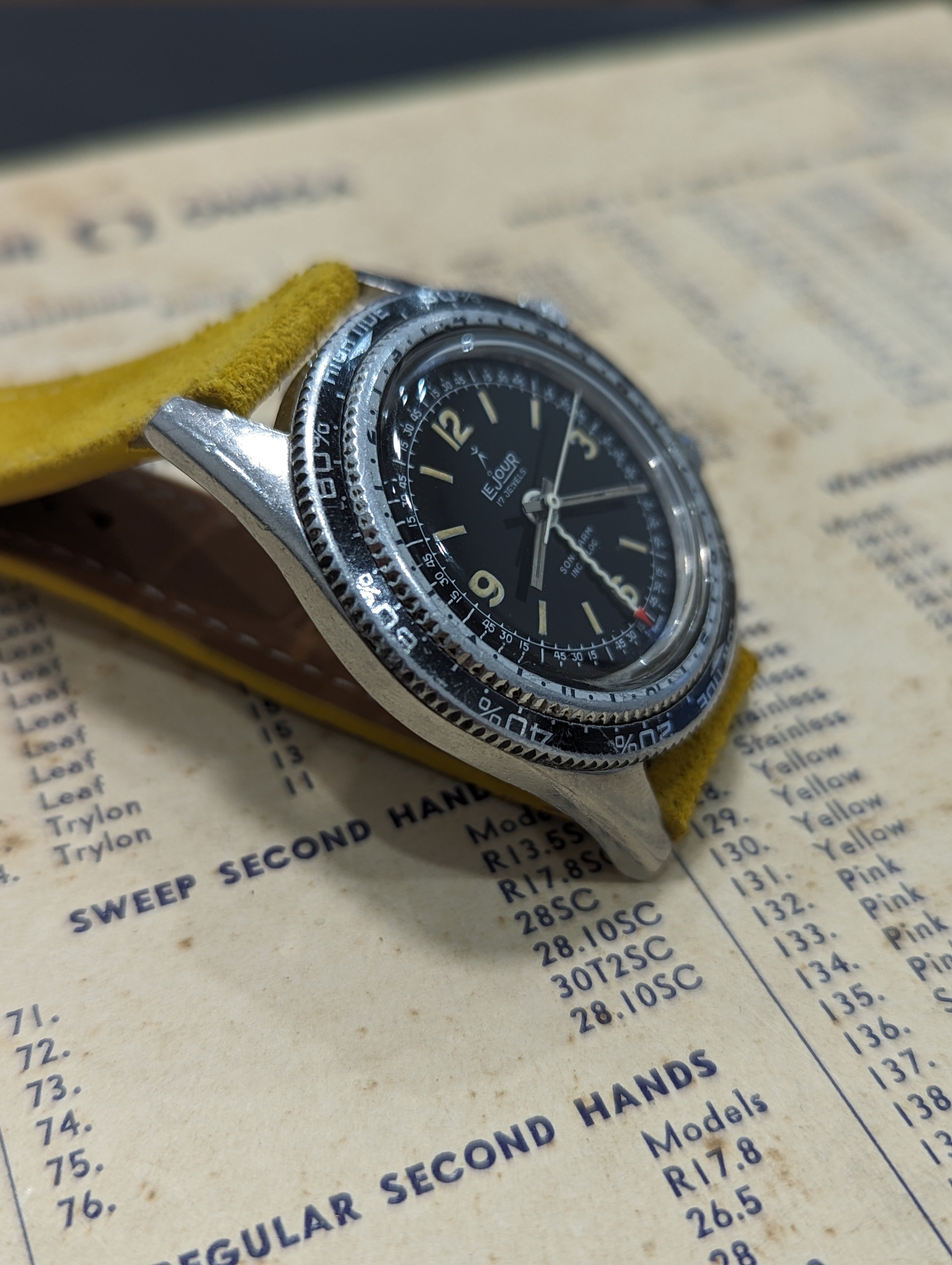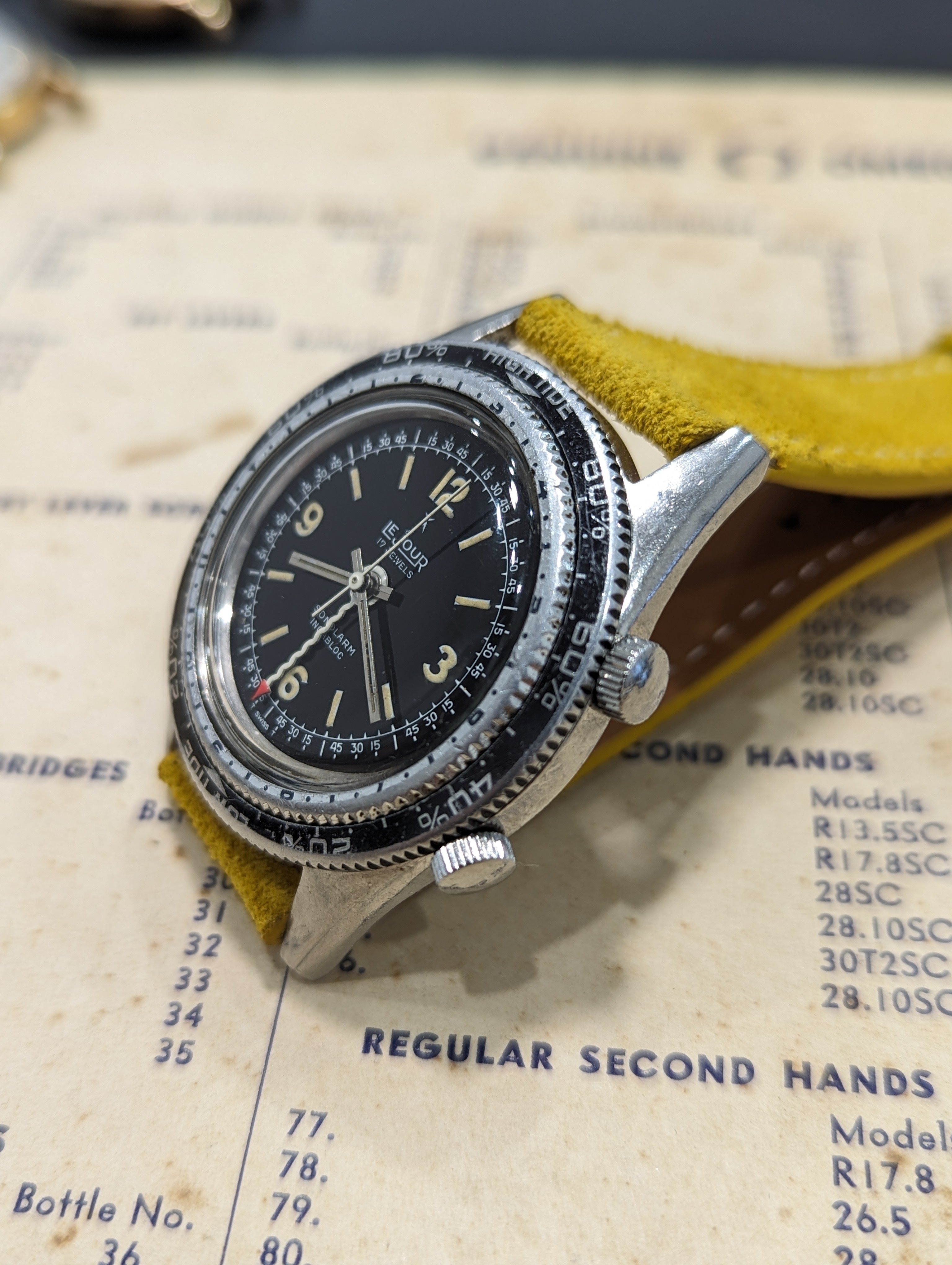 Up for sale is a rather uncommon Lejour Sonolarm. Measures about 38mm in diameter, alarm functions as it should and was serviced last year. Case shows some age, and the back has some light denting. Dial and hands are in very nice condition. If you have any questions, feel free to pm me!