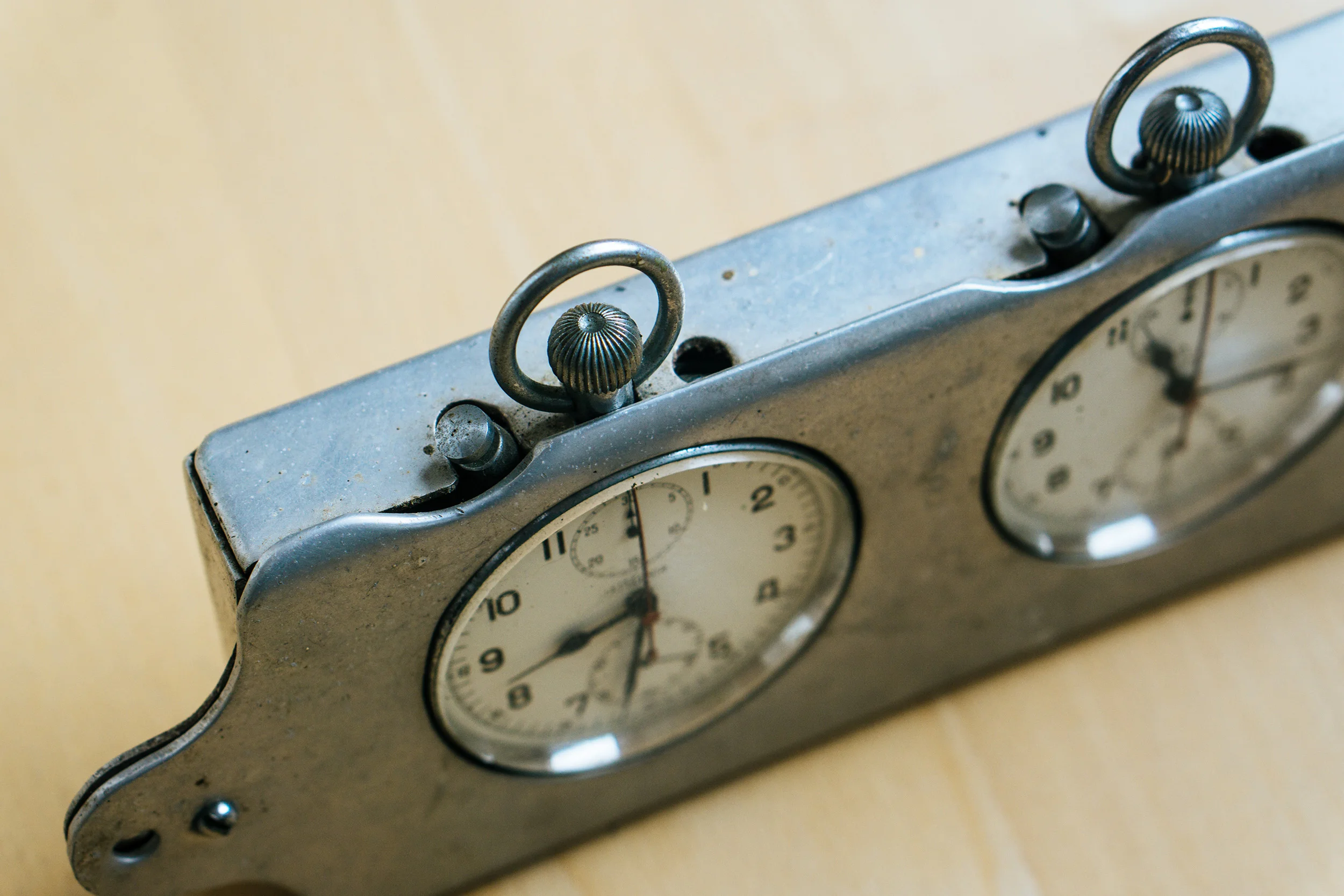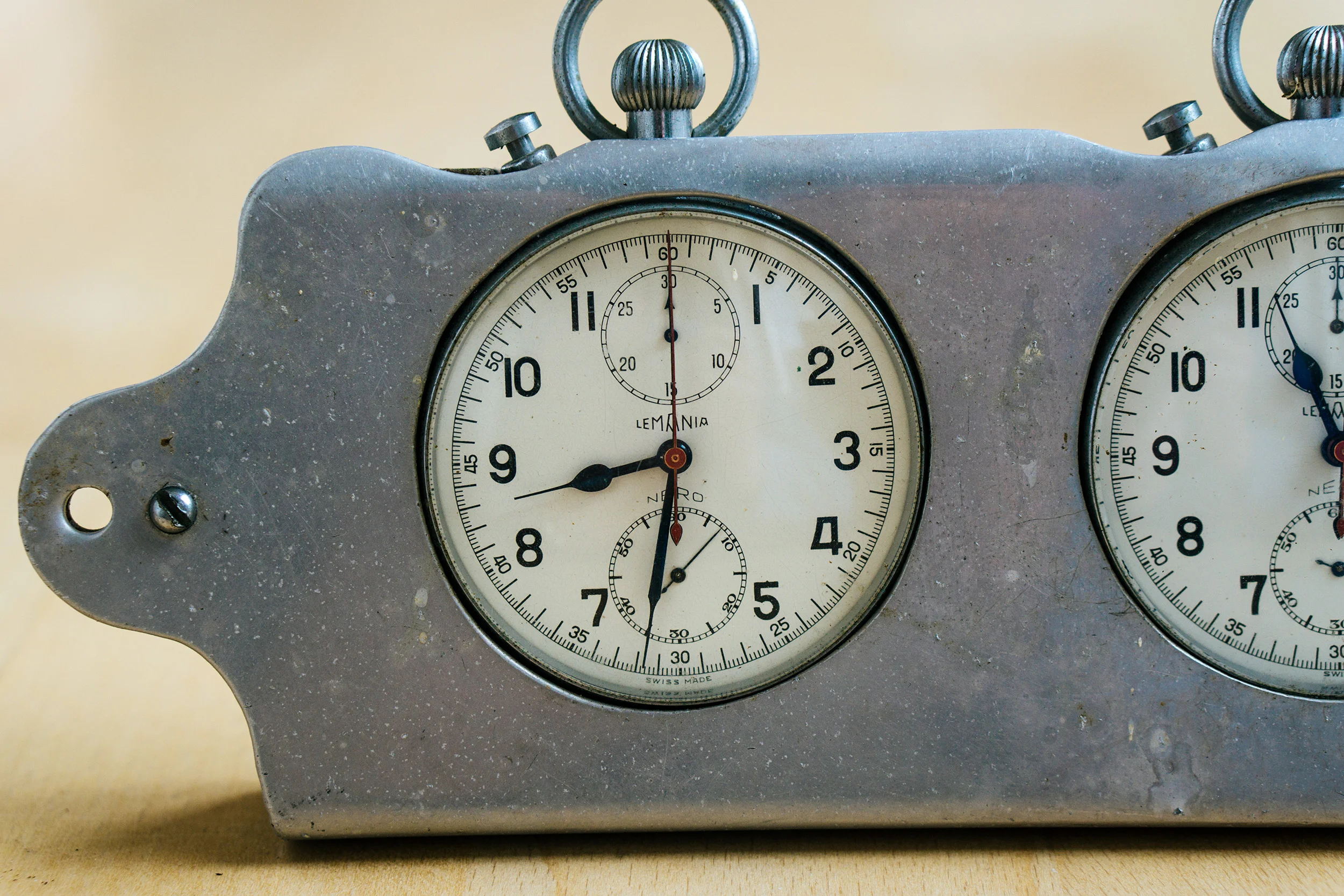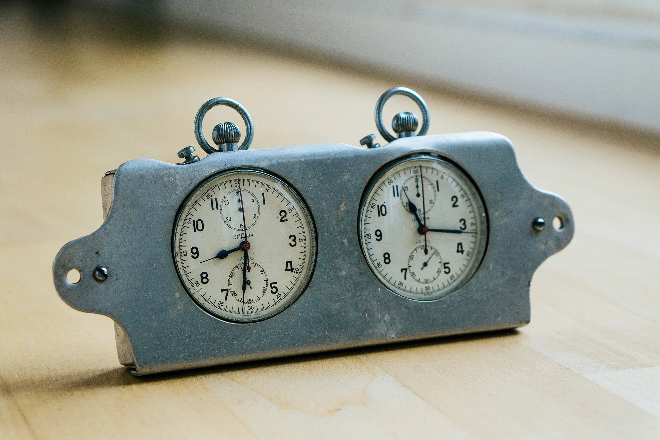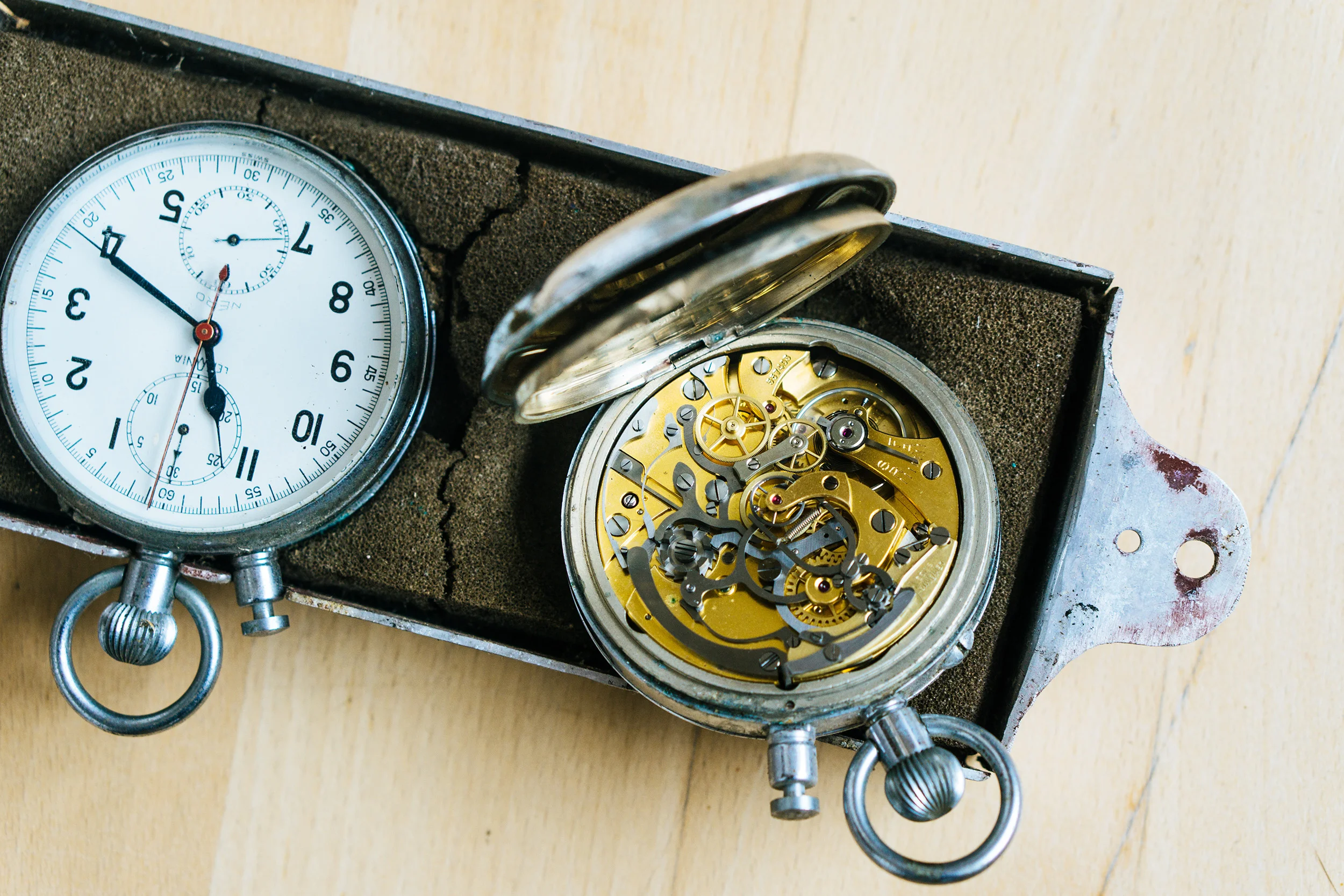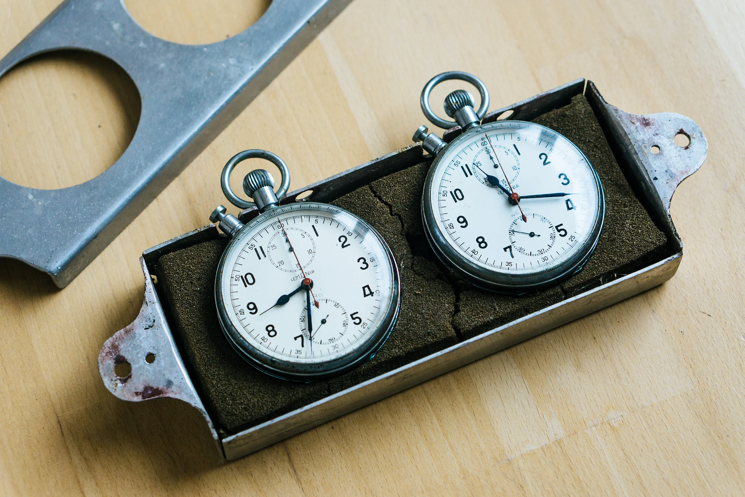 These are two Lemania Nero Cal 1130 Chronographs with Rattrapante complication in a steel housing. They may were used on a dashboard on a car or in a factory. History is unknown. The casing looks like it was build by someone by hand.