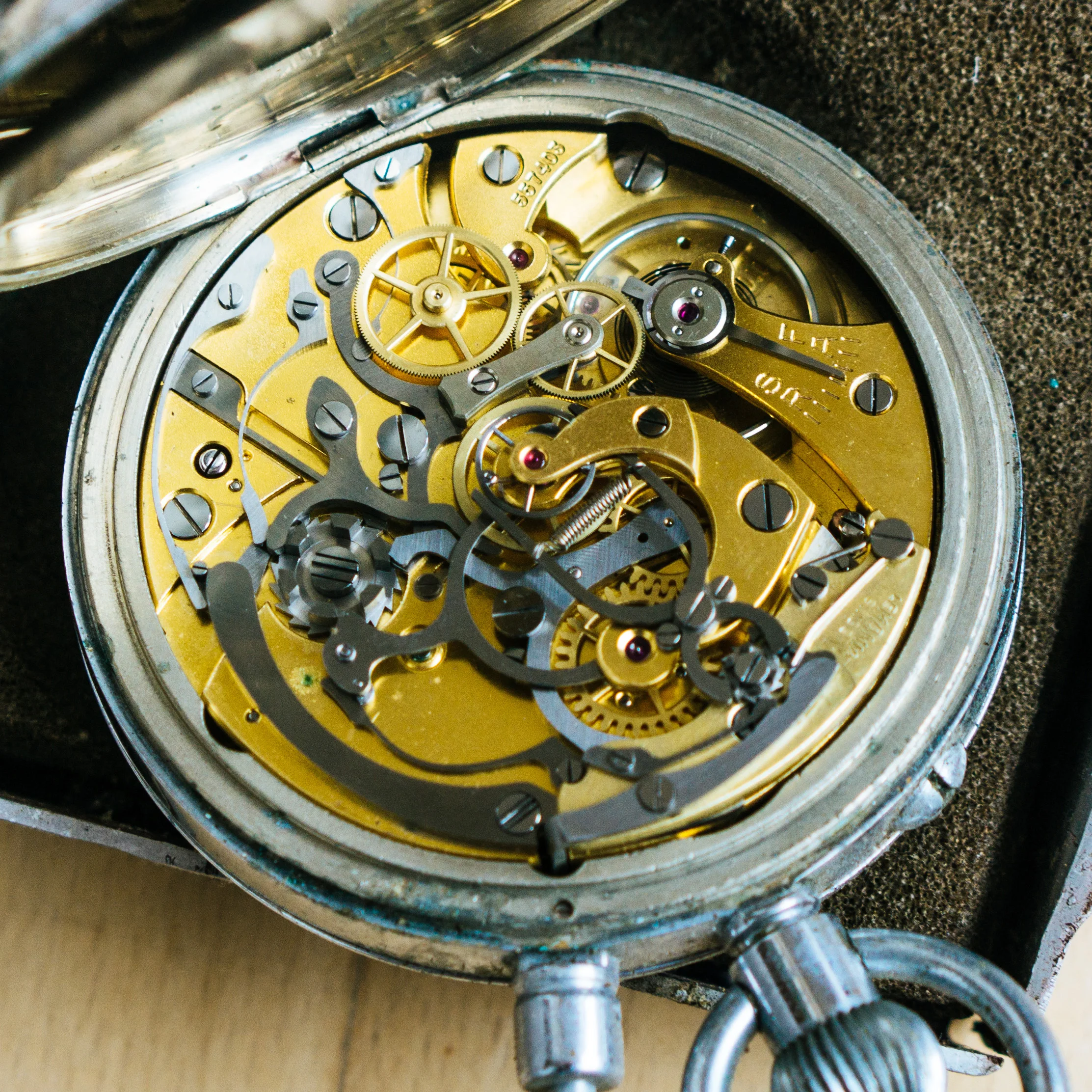 The watches are 65mm in size and were the top of the line of Lemania pocket Chronographs. The movements were also used in Omega watches. The serials are in chronological order (Serial 557.404 & 557.403) which makes it even cooler.