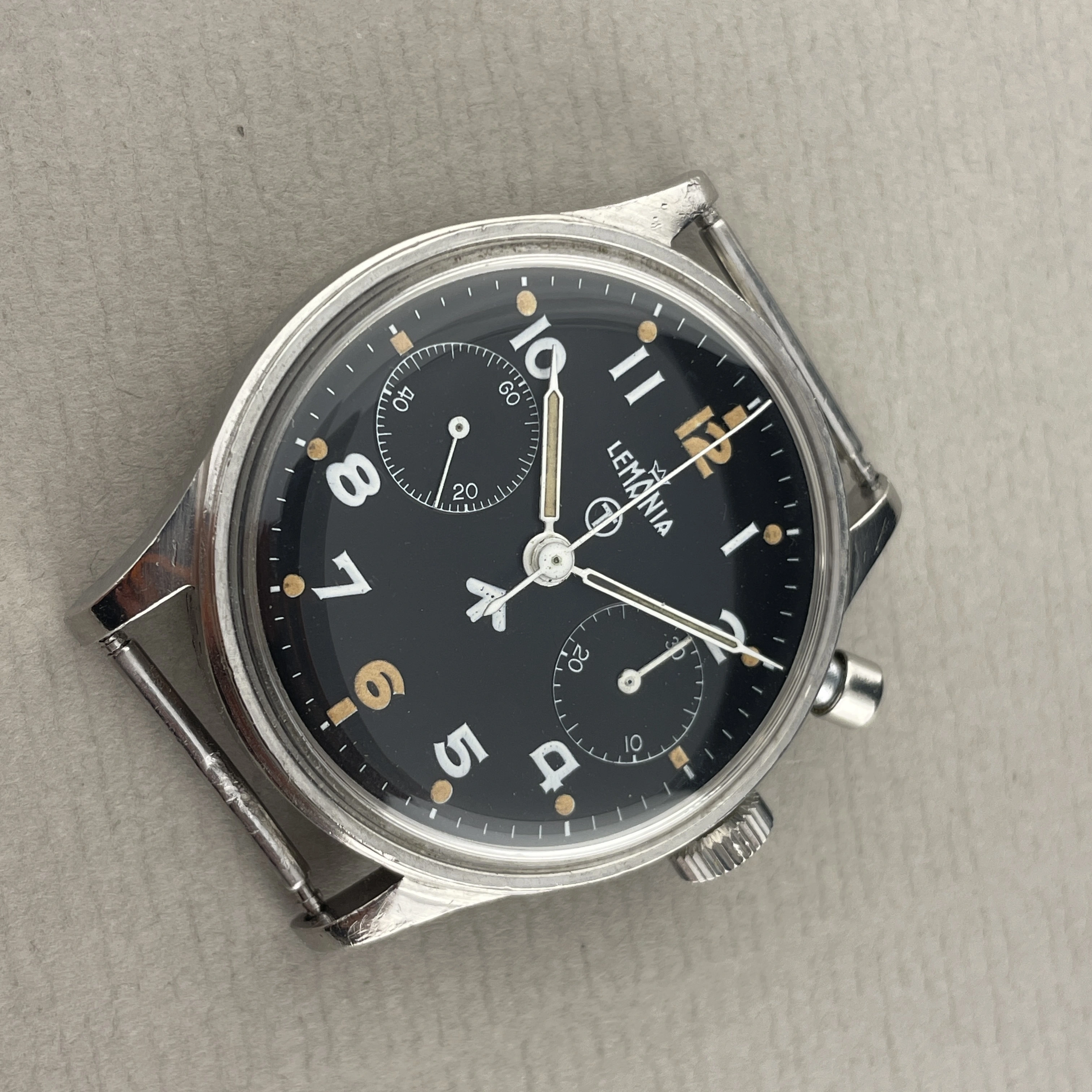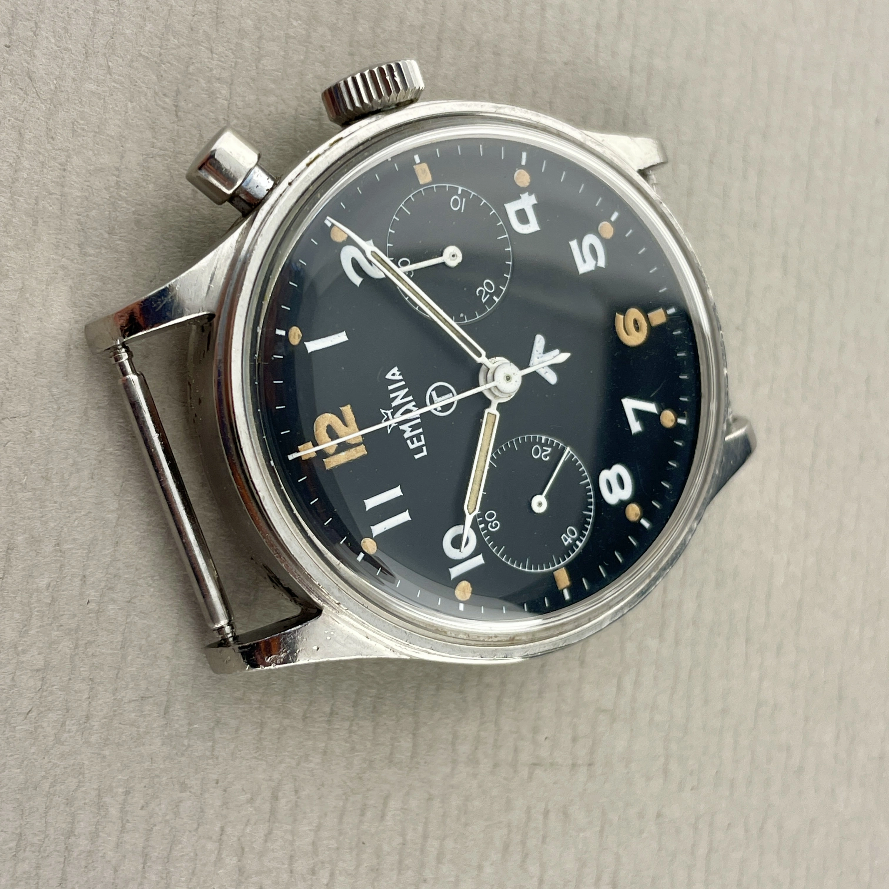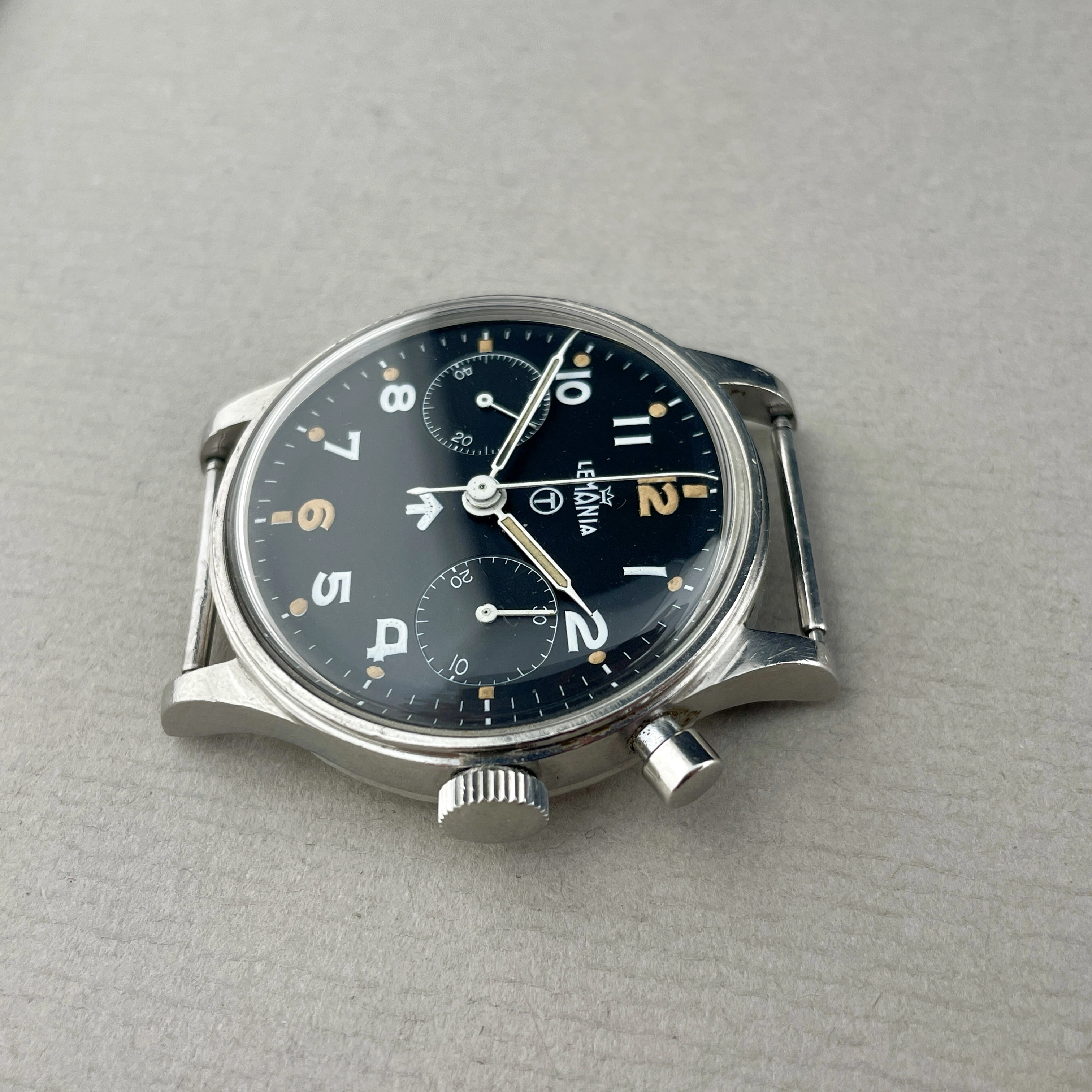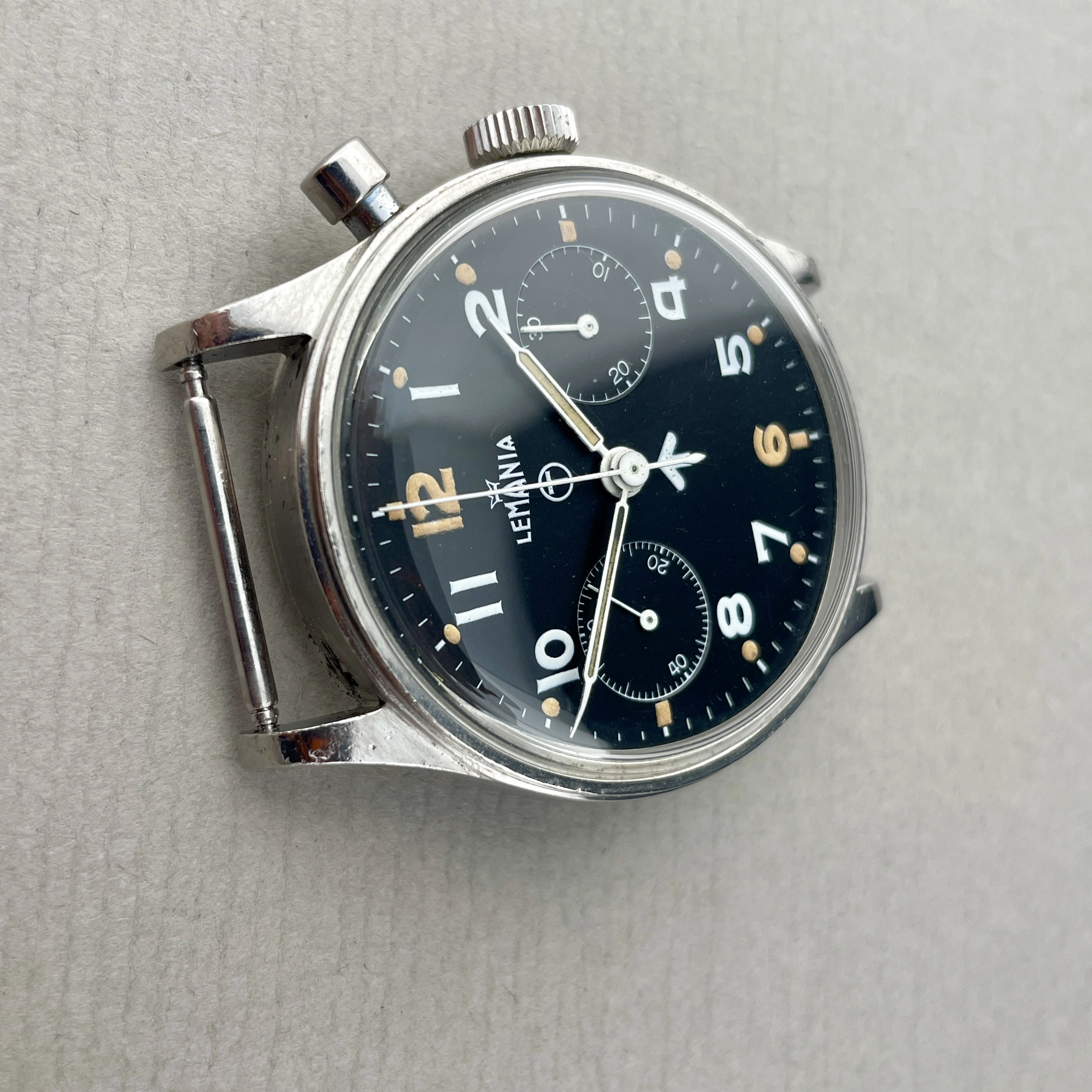 ·A spectacular vintage Lemania Single/Mono-Pusher Chronograph, Military Royal Navy Issued Wrist Watch in excellent condition. Lemania single pusher chronographs were issued to British military servicemen between 1945 and 1976. This particular example is a Royal Navy issue, identified by its model reference number, 0552/920-3305.