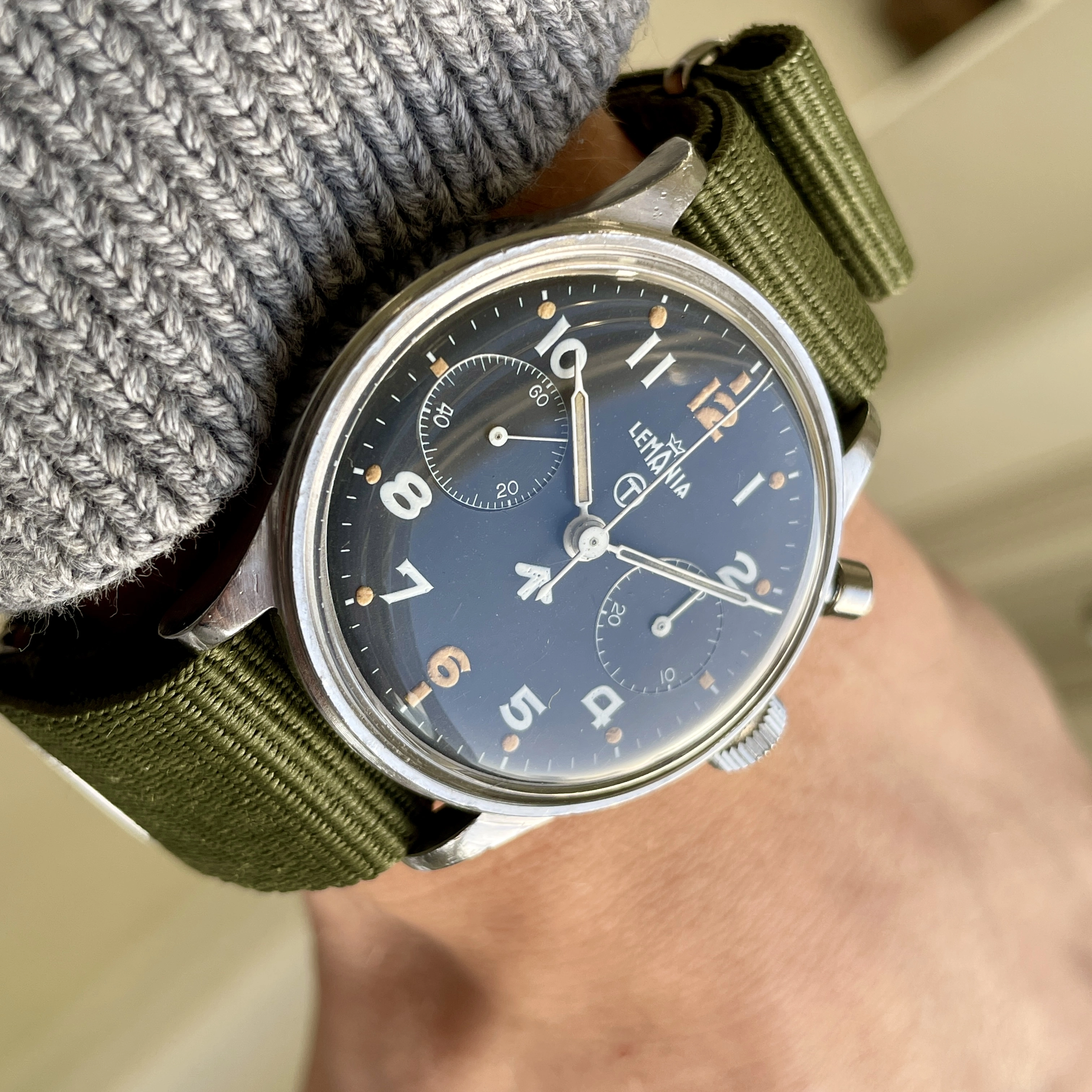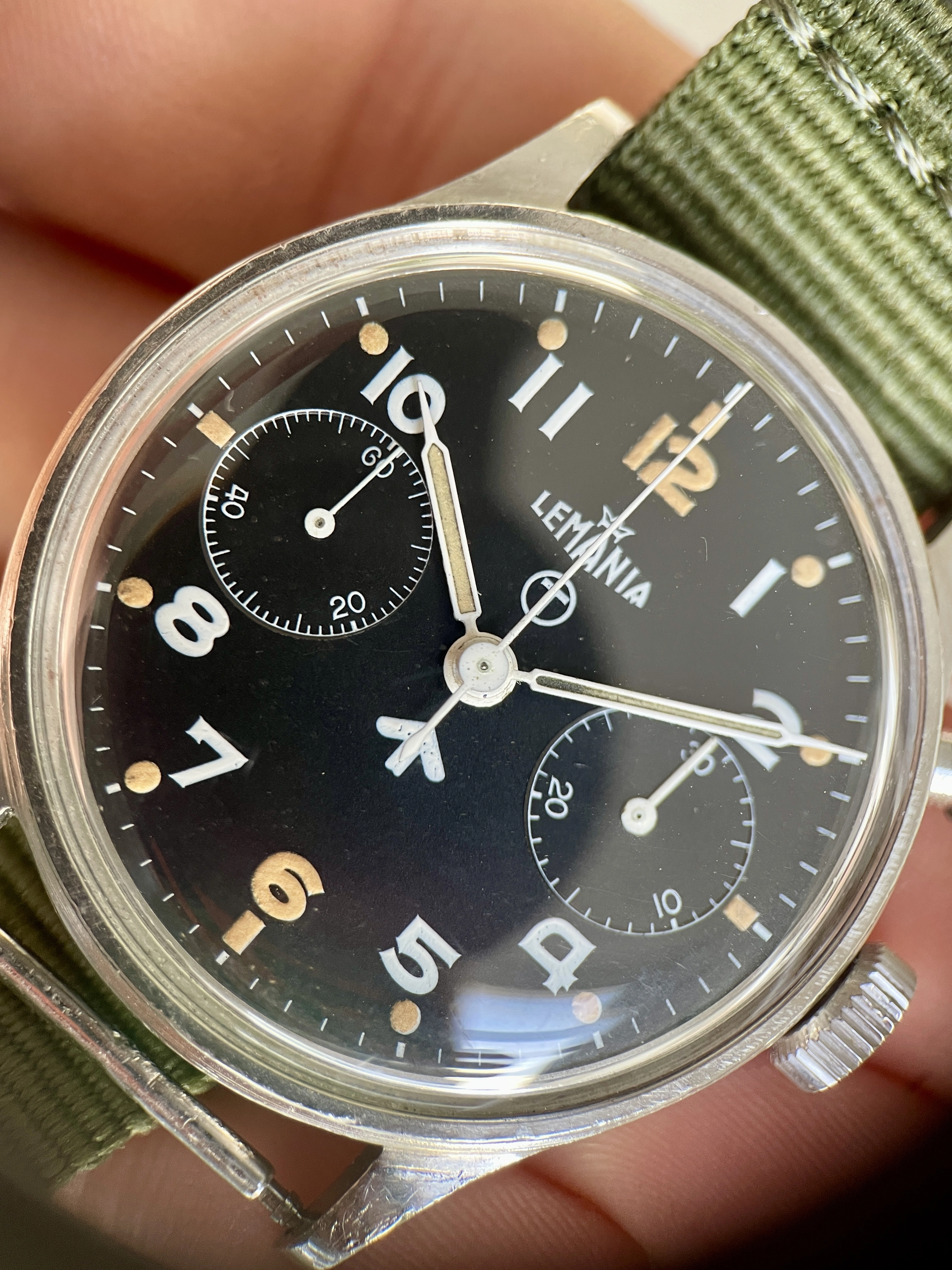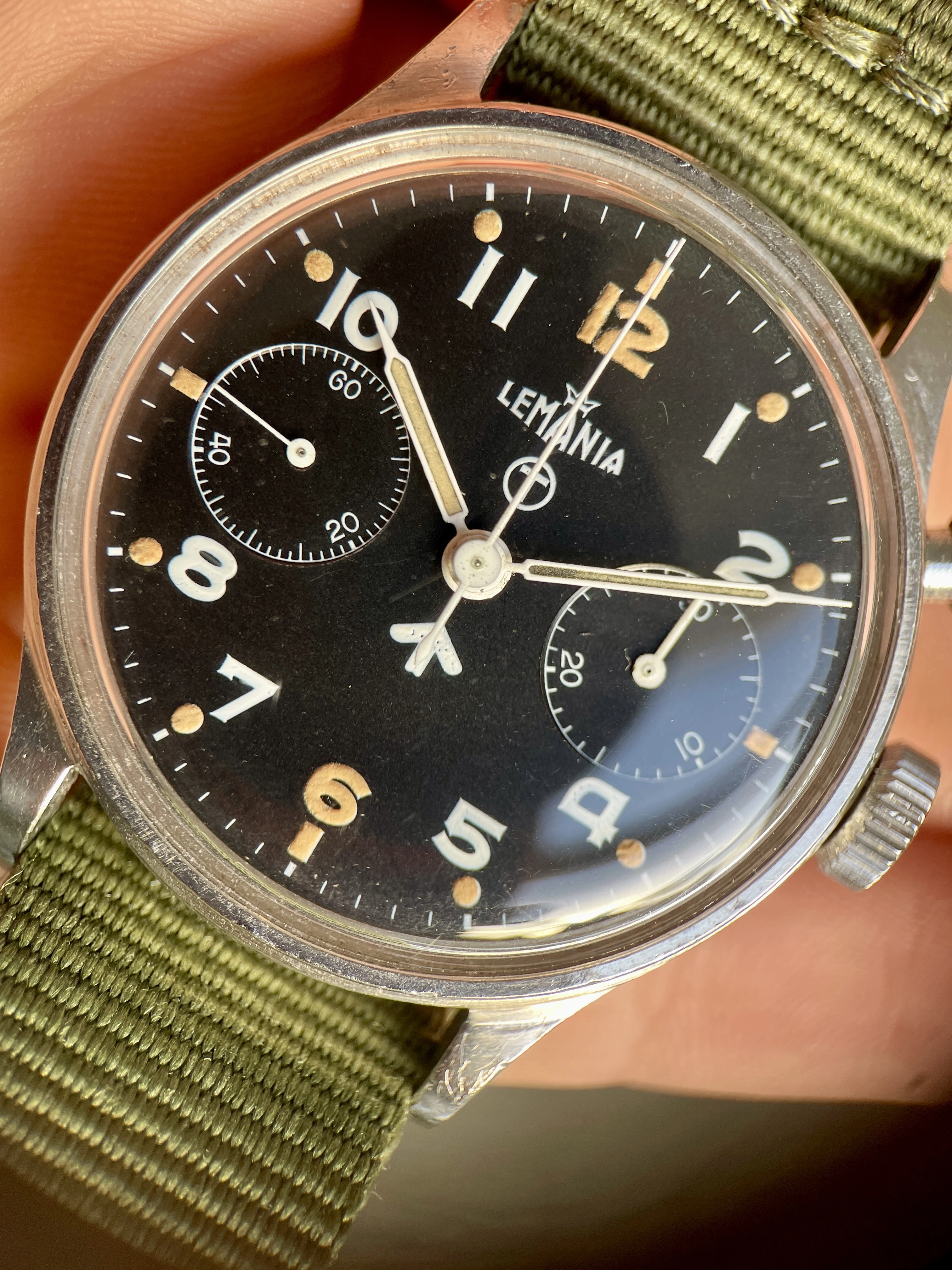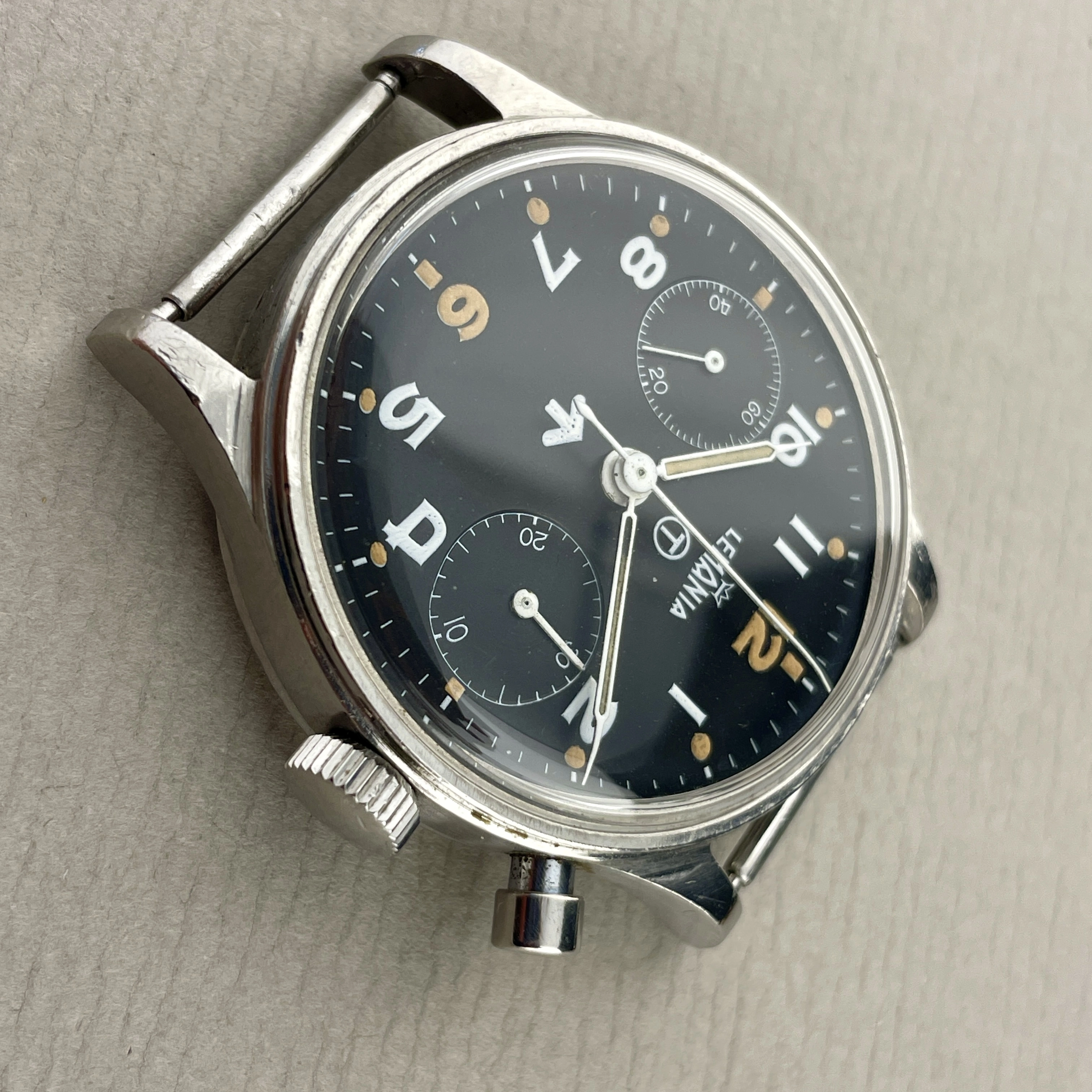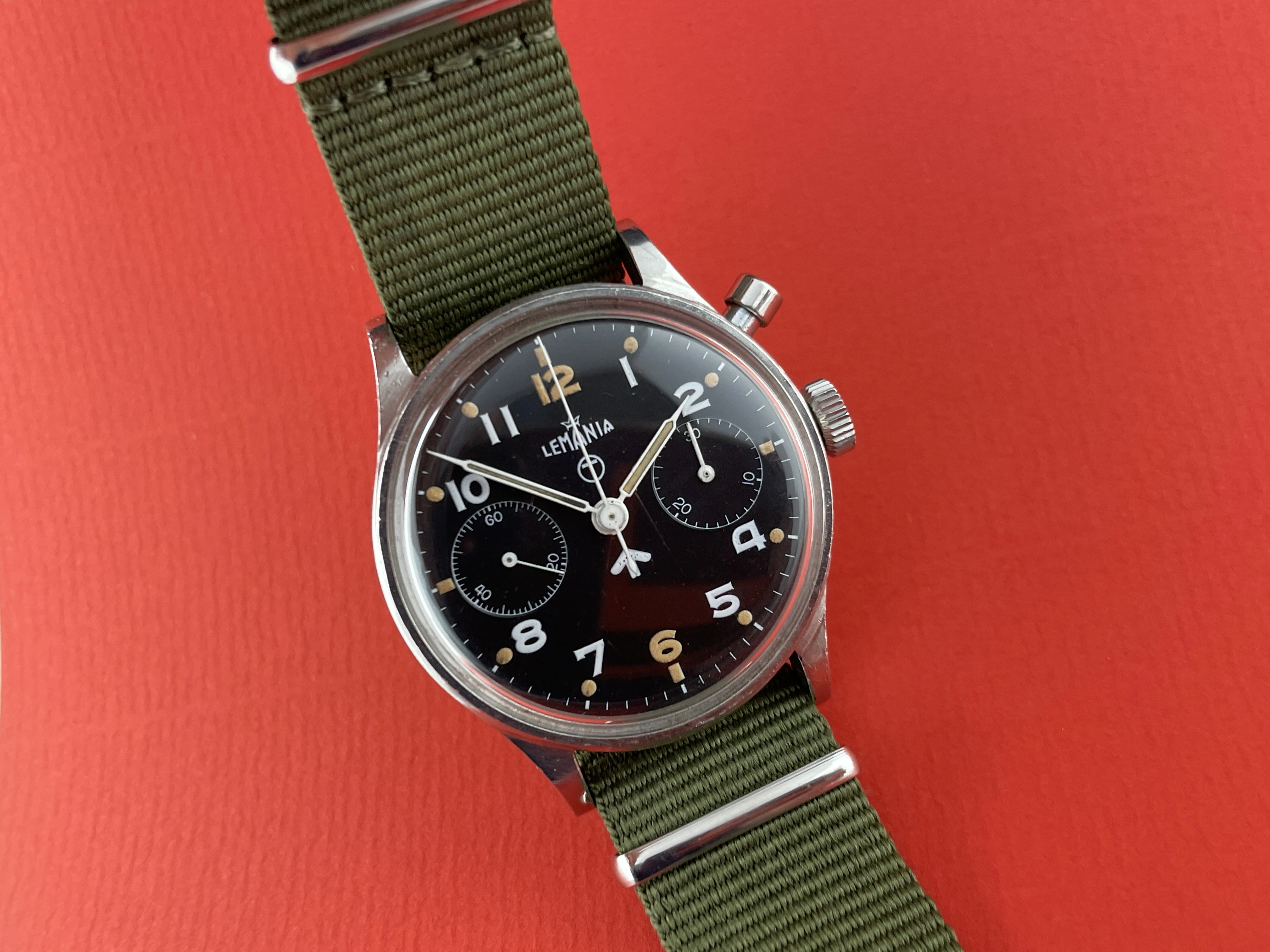 ·A spectacular vintage Lemania Single/Mono-Pusher Chronograph, Military Royal Navy Issued Wrist Watch in excellent condition. Lemania single pusher chronographs were issued to British military servicemen between 1945 and 1976. This particular example is a Royal Navy issue, identified by its model reference number, 0552/920-3305.